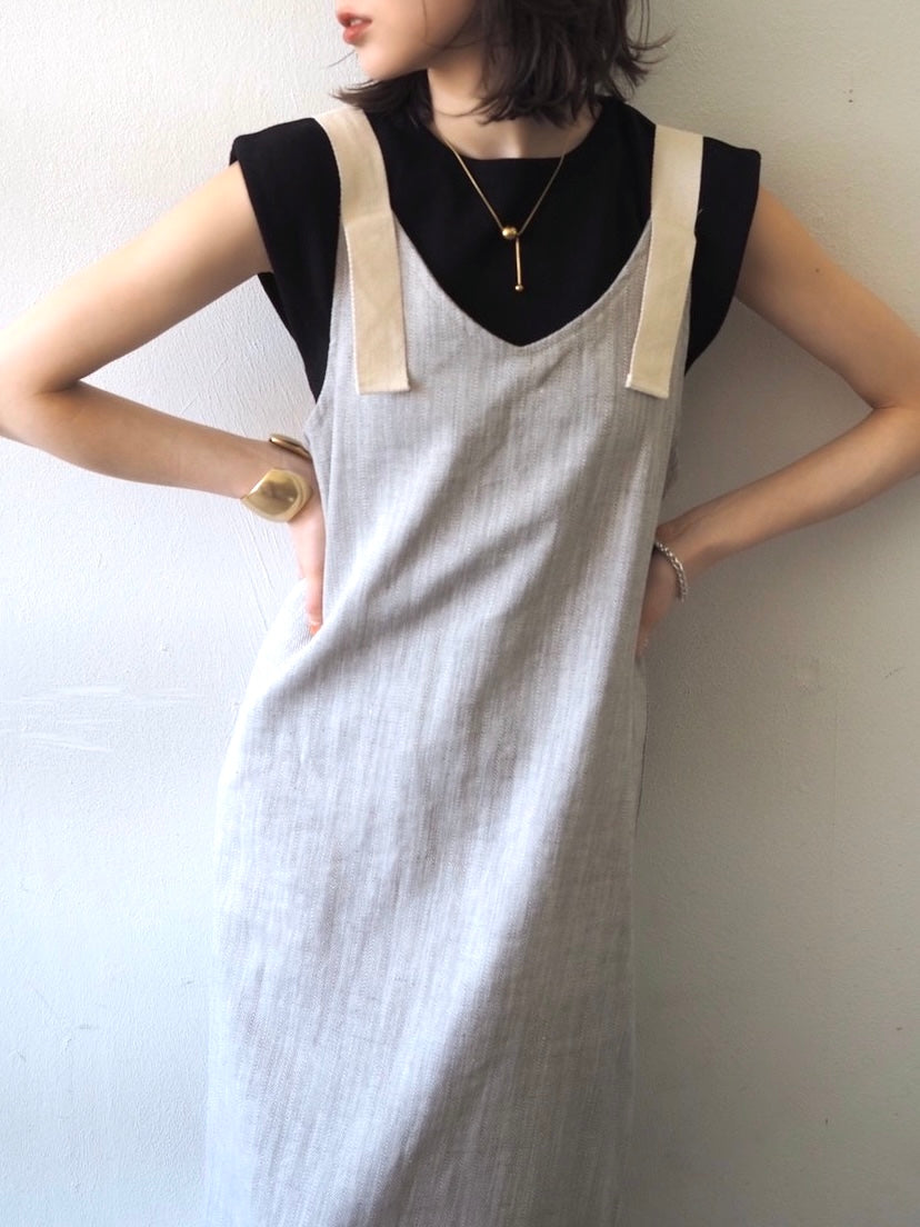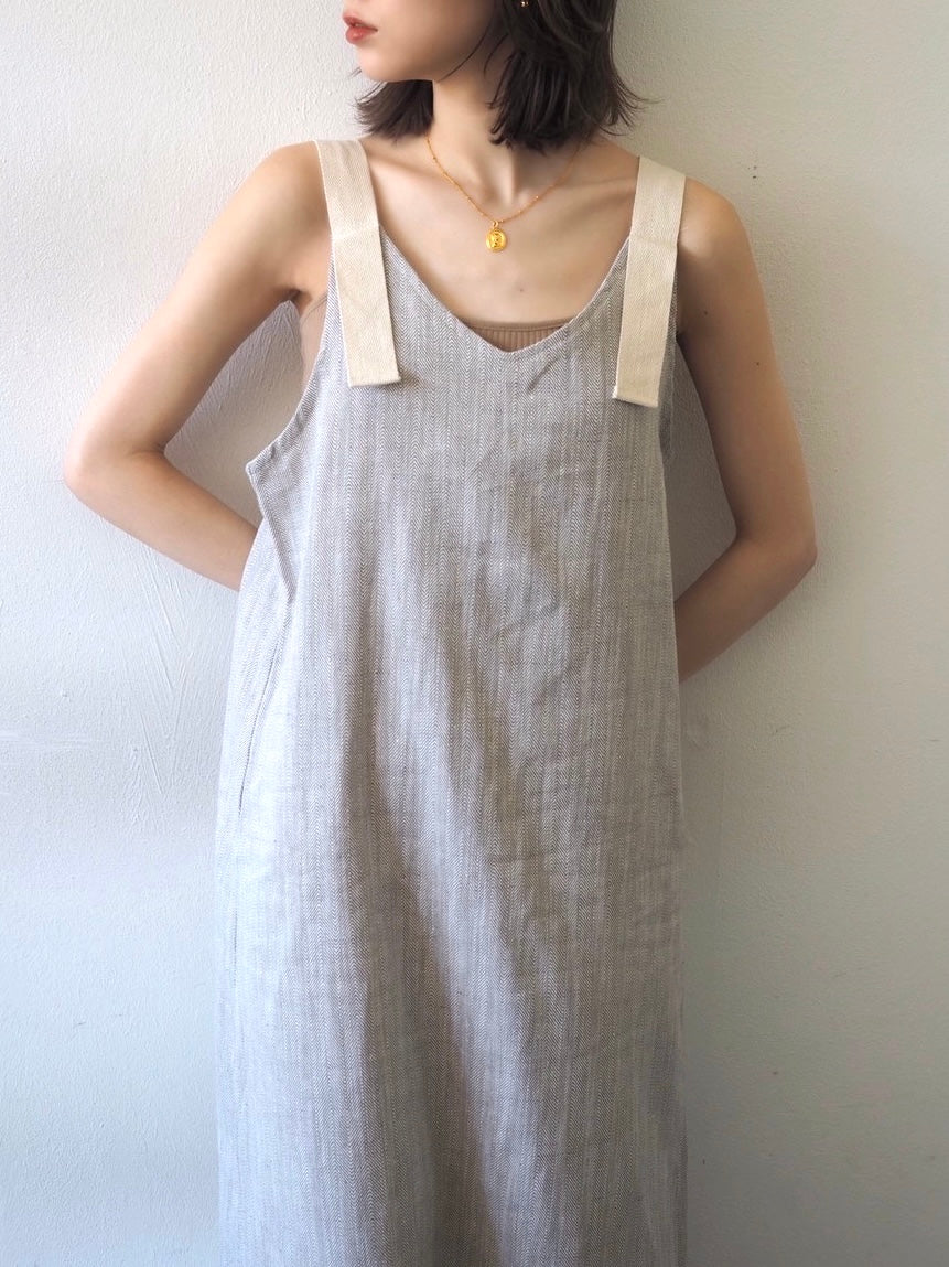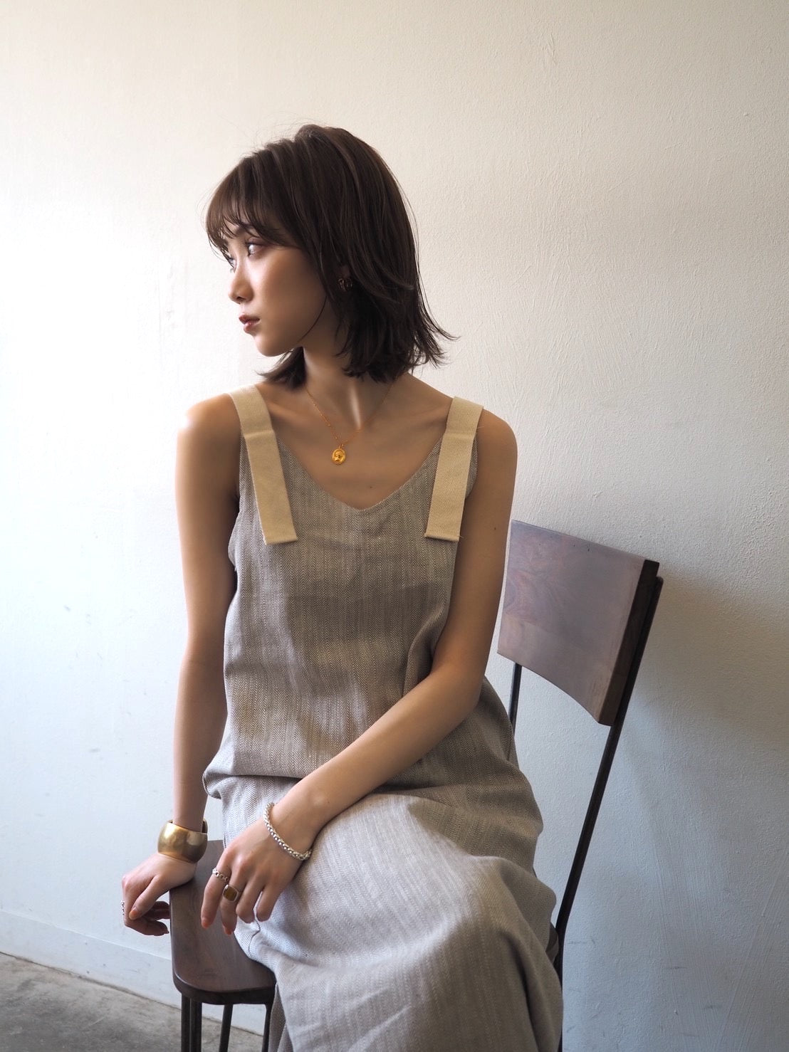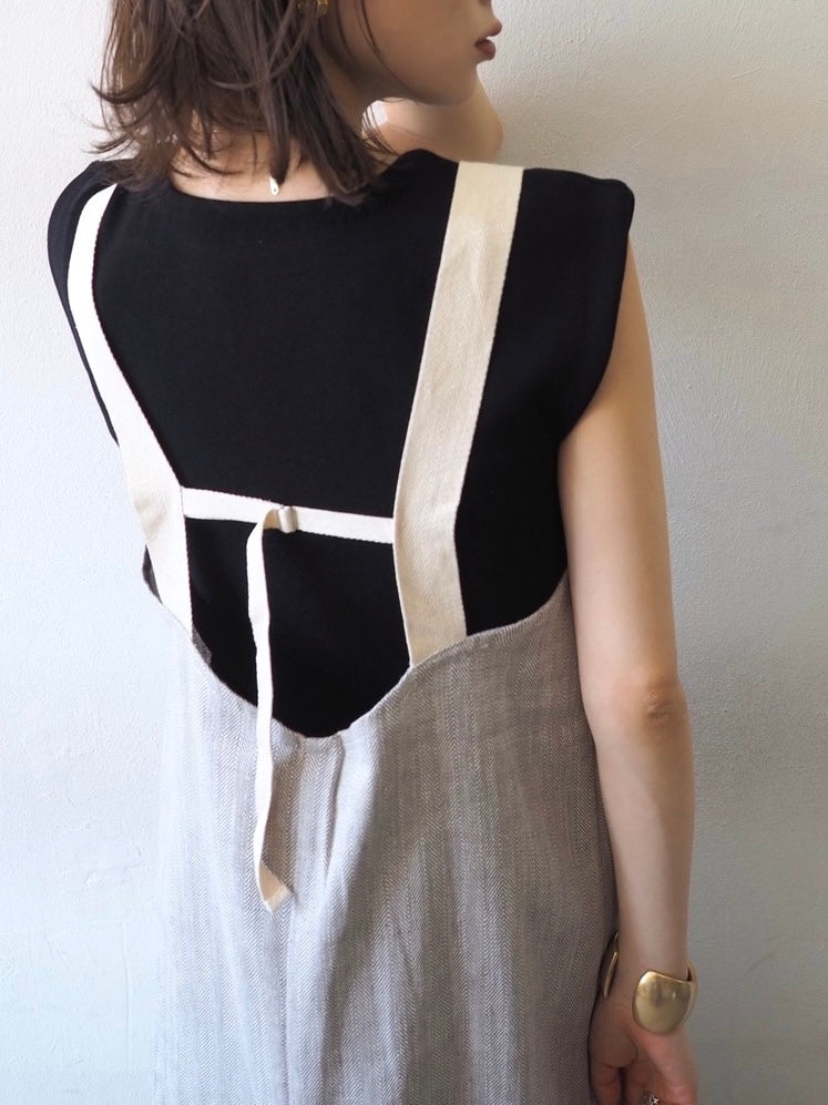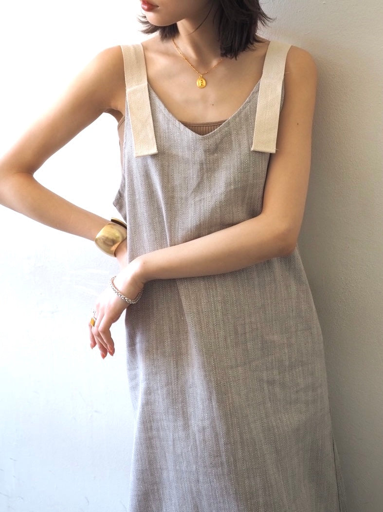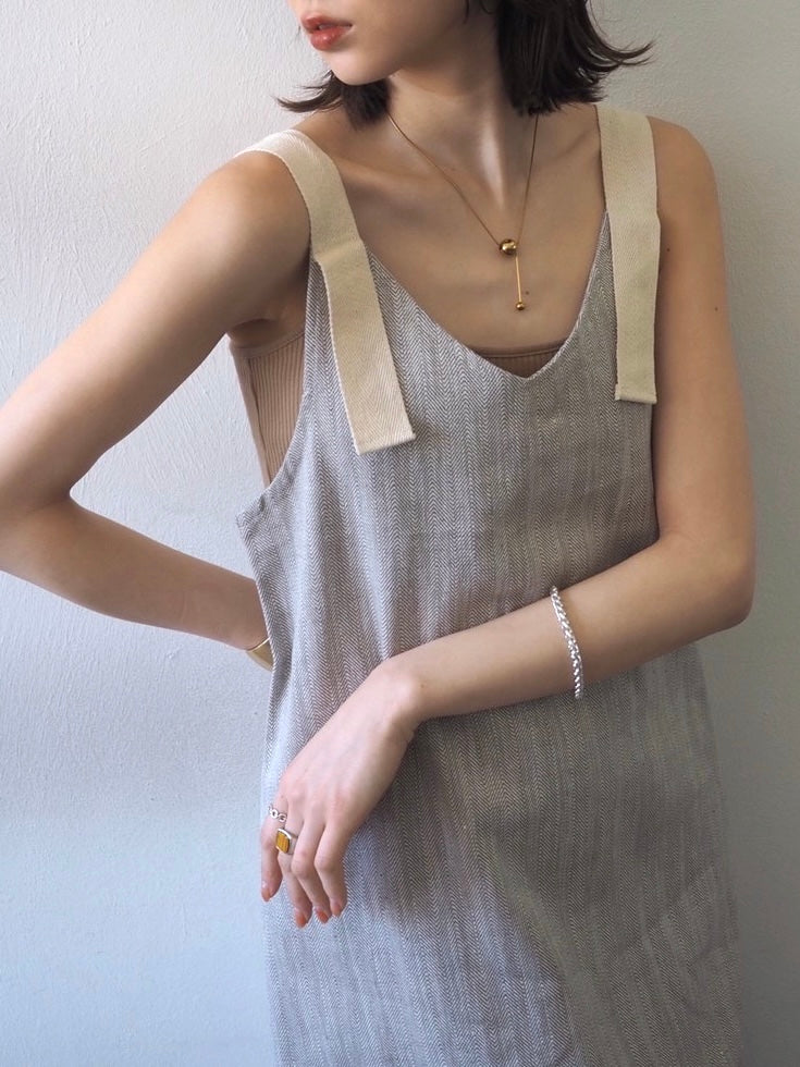 人字紋吊帶背心洋裝的肩帶採用不同材質設計。顏色對比營造出鮮明的對比,讓你穿起來很時尚。背面款式有一個調節器,因此您可以調整尺寸。讓腰部看起來俐落的剪裁也是一個重點。此單品採用柔和的喇叭形輪廓,增添女性氣質。