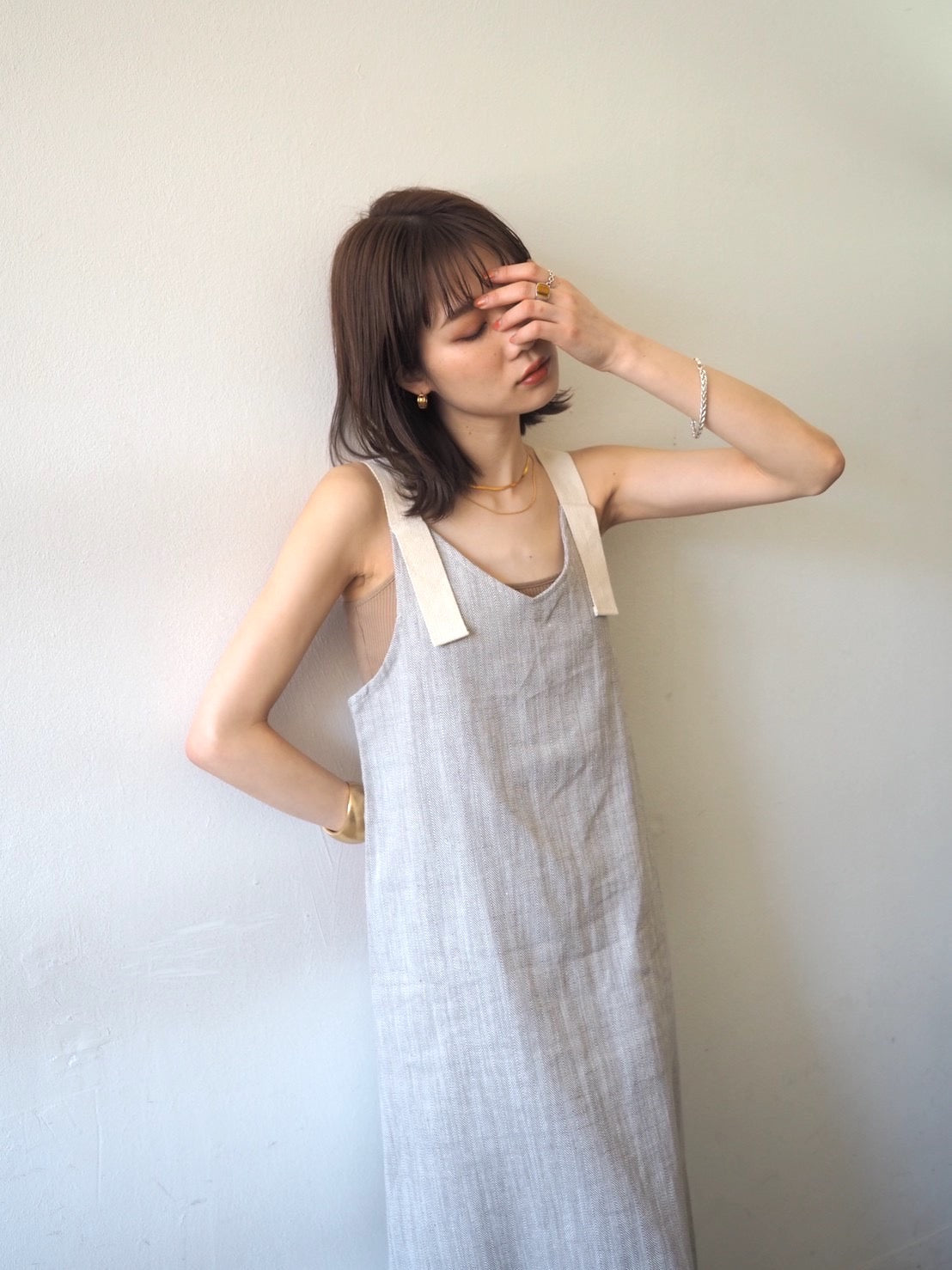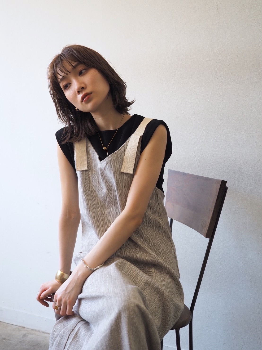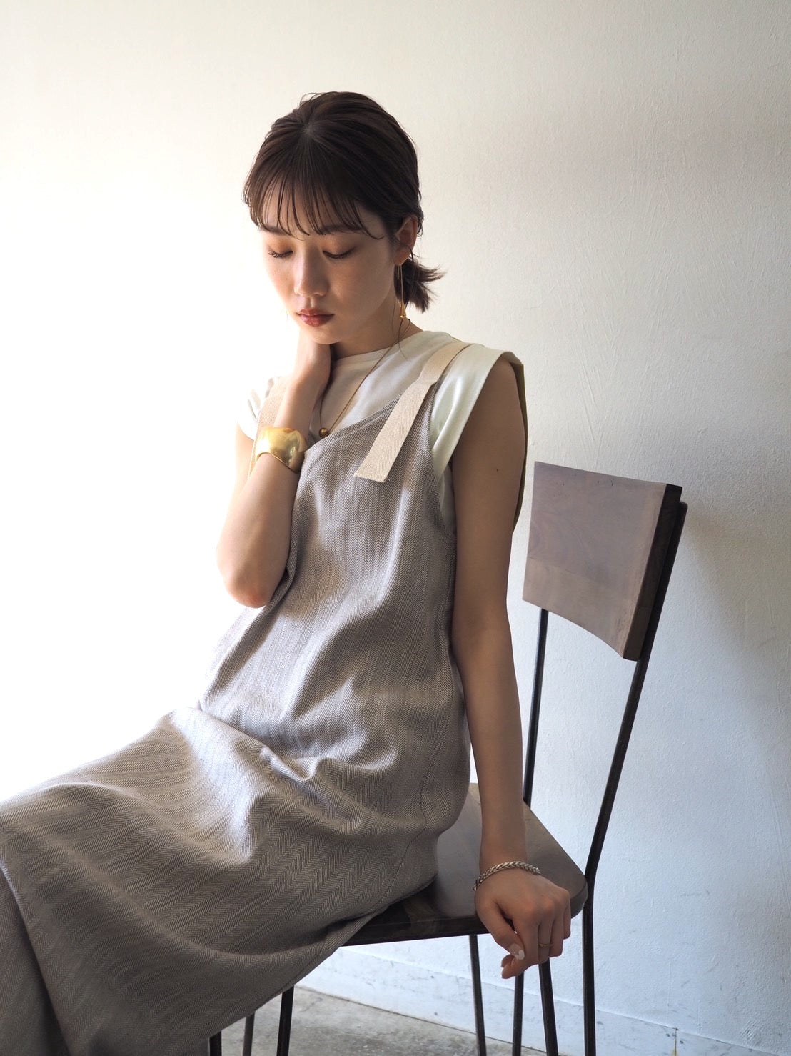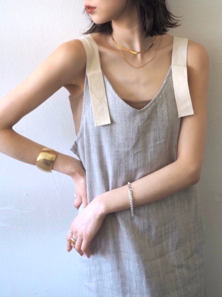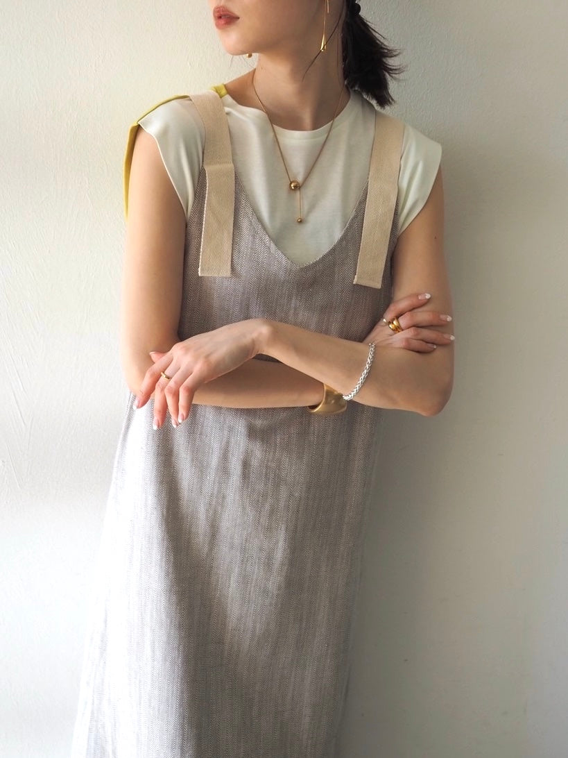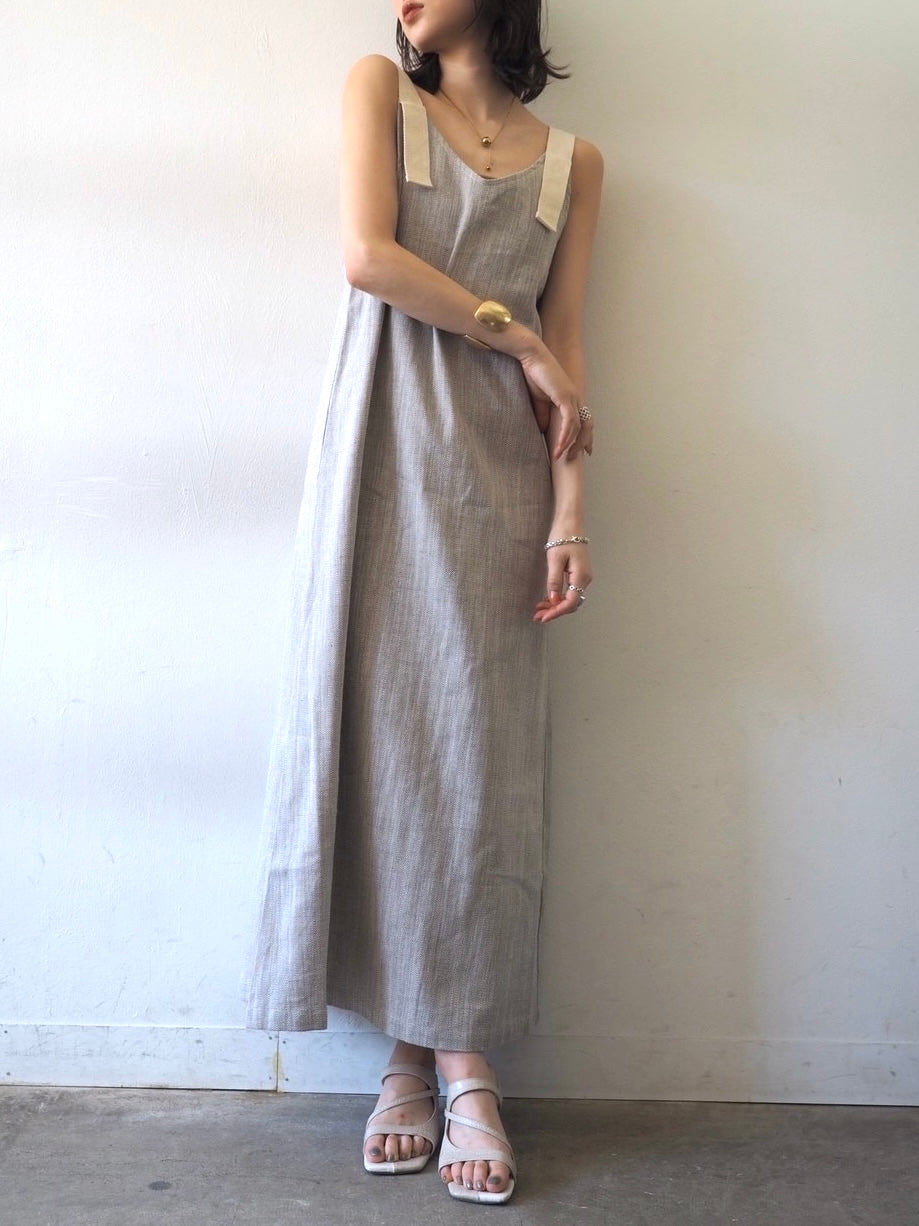 人字紋吊帶背心洋裝的肩帶採用不同材質設計。顏色對比營造出鮮明的對比,讓你穿起來很時尚。背面款式有一個調節器,因此您可以調整尺寸。讓腰部看起來俐落的剪裁也是一個重點。此單品採用柔和的喇叭形輪廓,增添女性氣質。