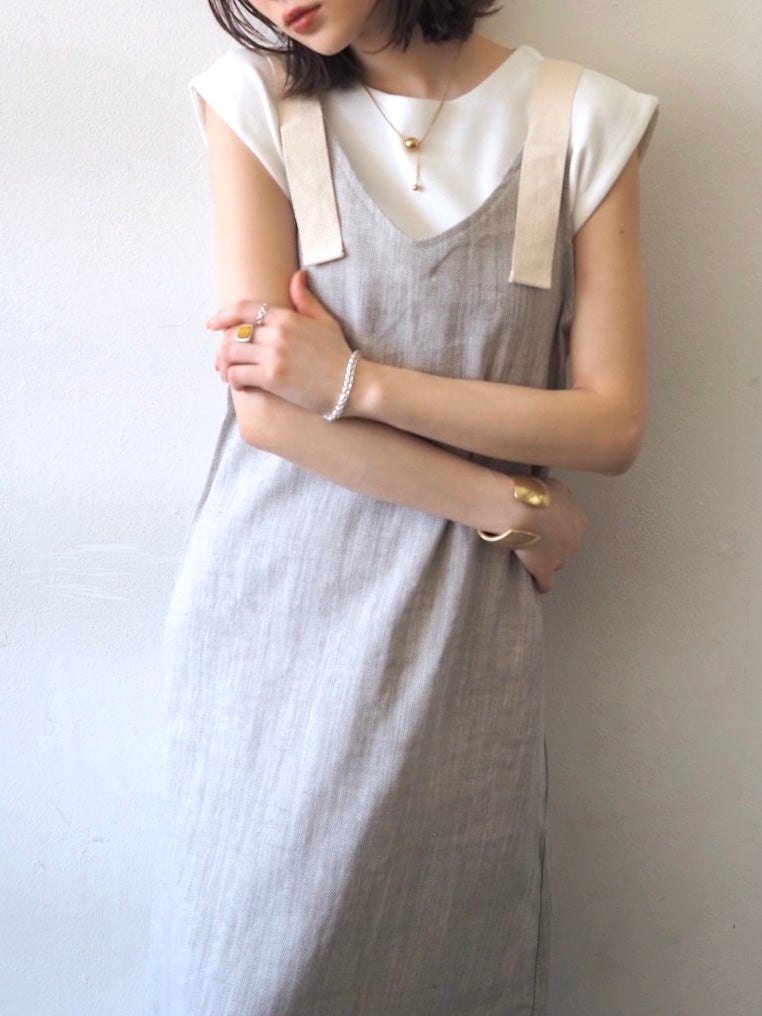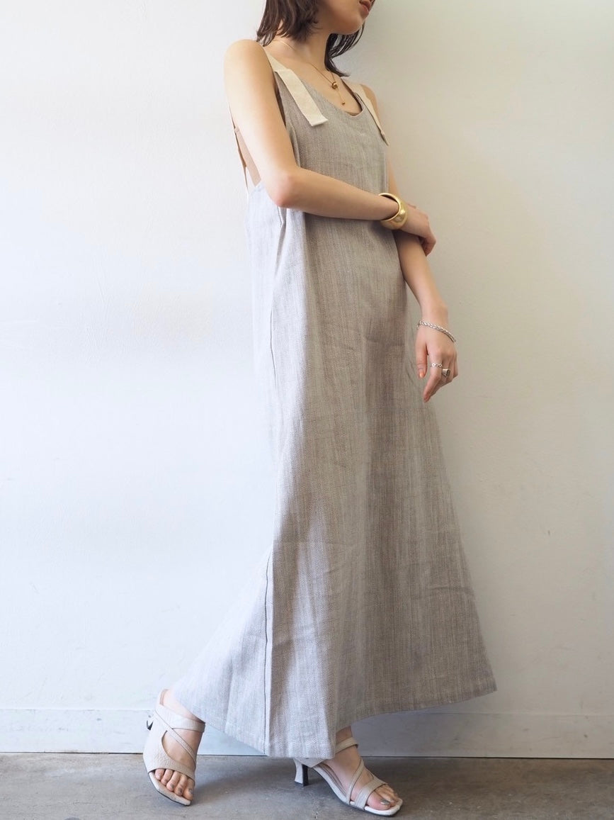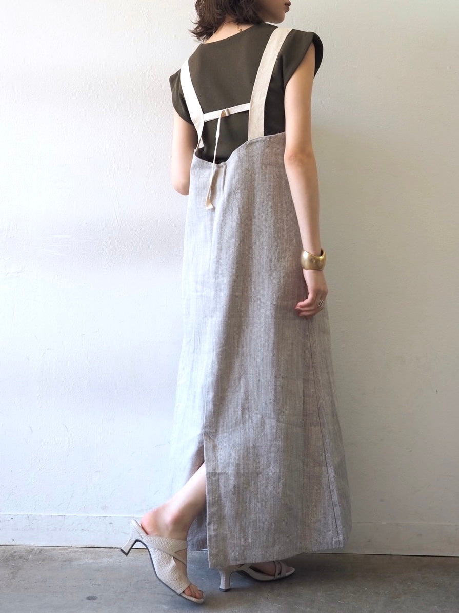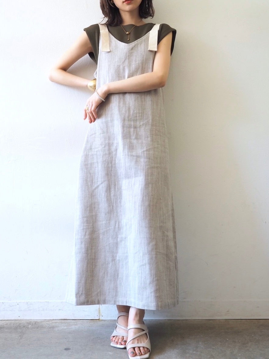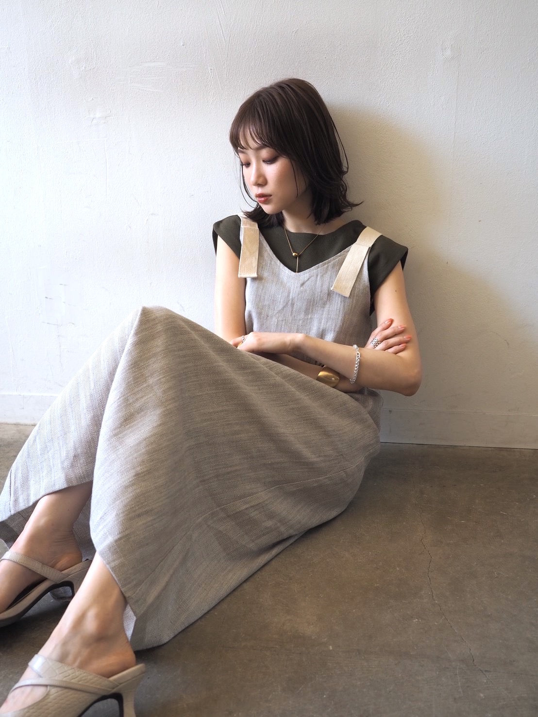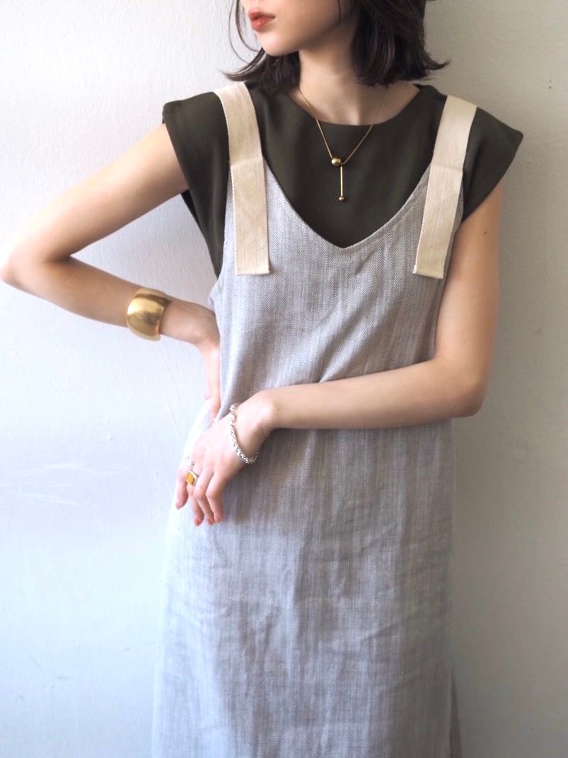 人字紋吊帶背心洋裝的肩帶採用不同材質設計。顏色對比營造出鮮明的對比,讓你穿起來很時尚。背面款式有一個調節器,因此您可以調整尺寸。讓腰部看起來俐落的剪裁也是一個重點。此單品採用柔和的喇叭形輪廓,增添女性氣質。