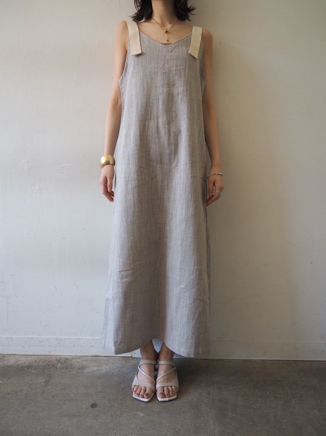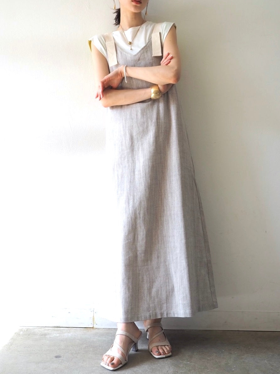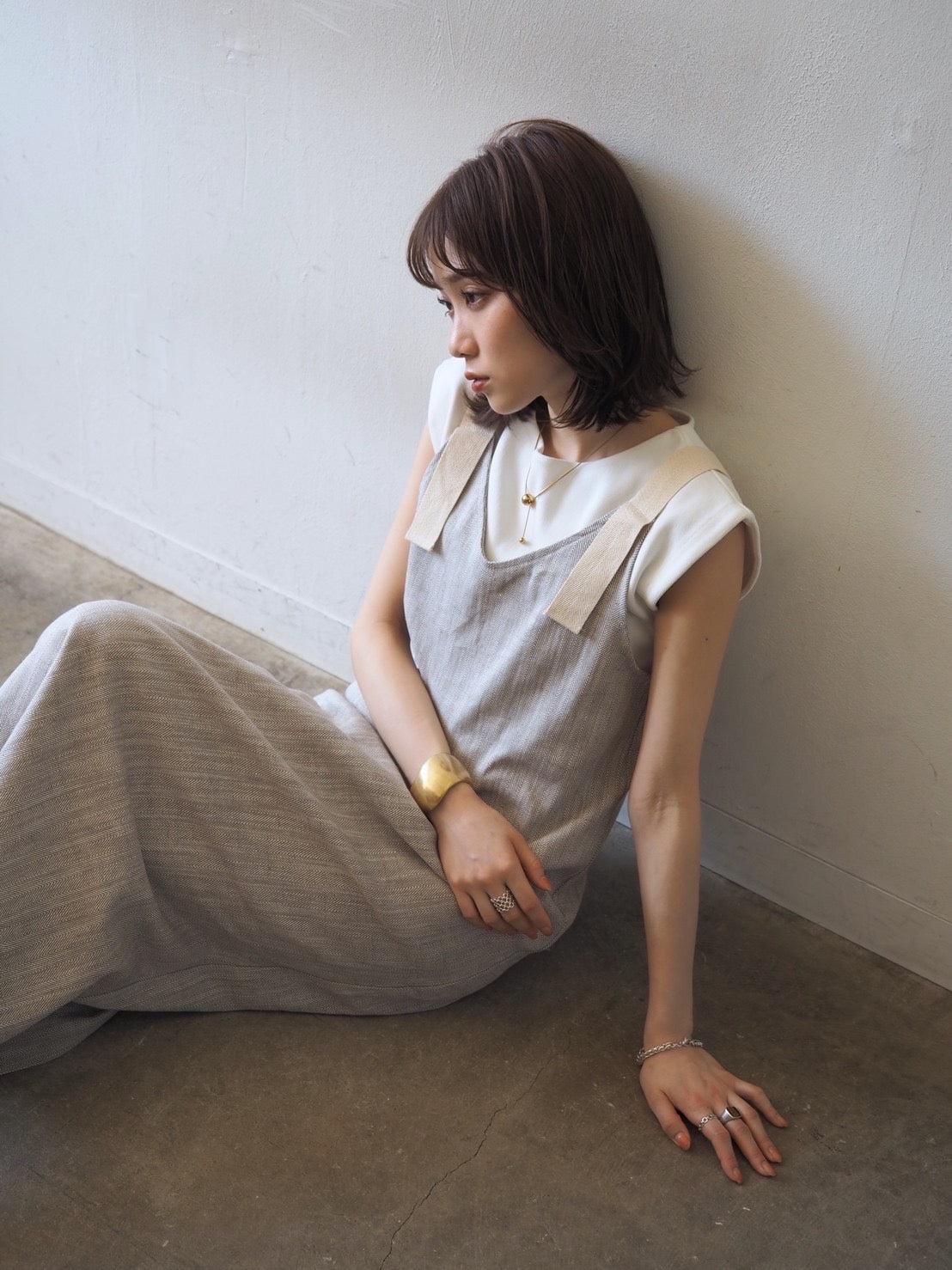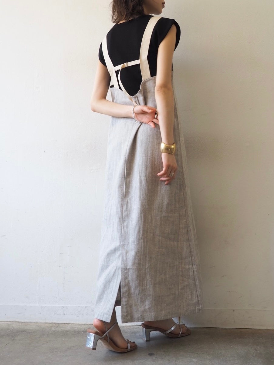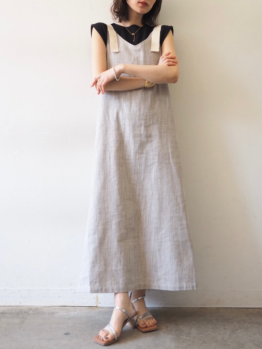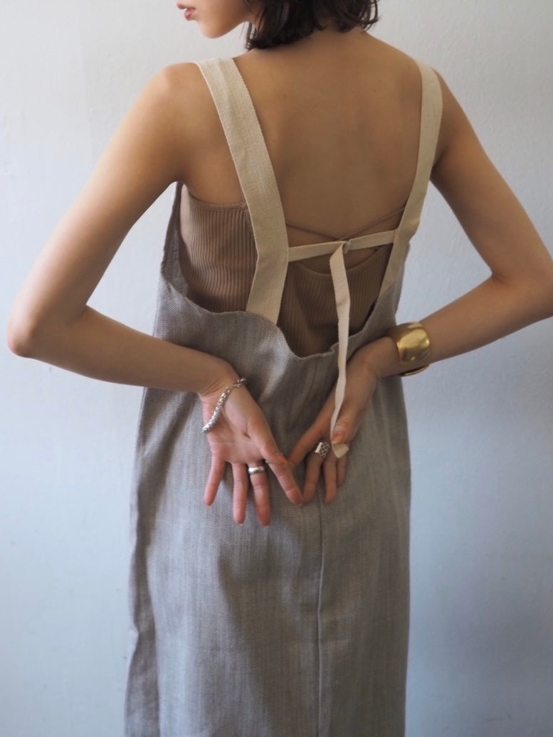 人字紋吊帶背心洋裝的肩帶採用不同材質設計。顏色對比營造出鮮明的對比,讓你穿起來很時尚。背面款式有一個調節器,因此您可以調整尺寸。讓腰部看起來俐落的剪裁也是一個重點。此單品採用柔和的喇叭形輪廓,增添女性氣質。
