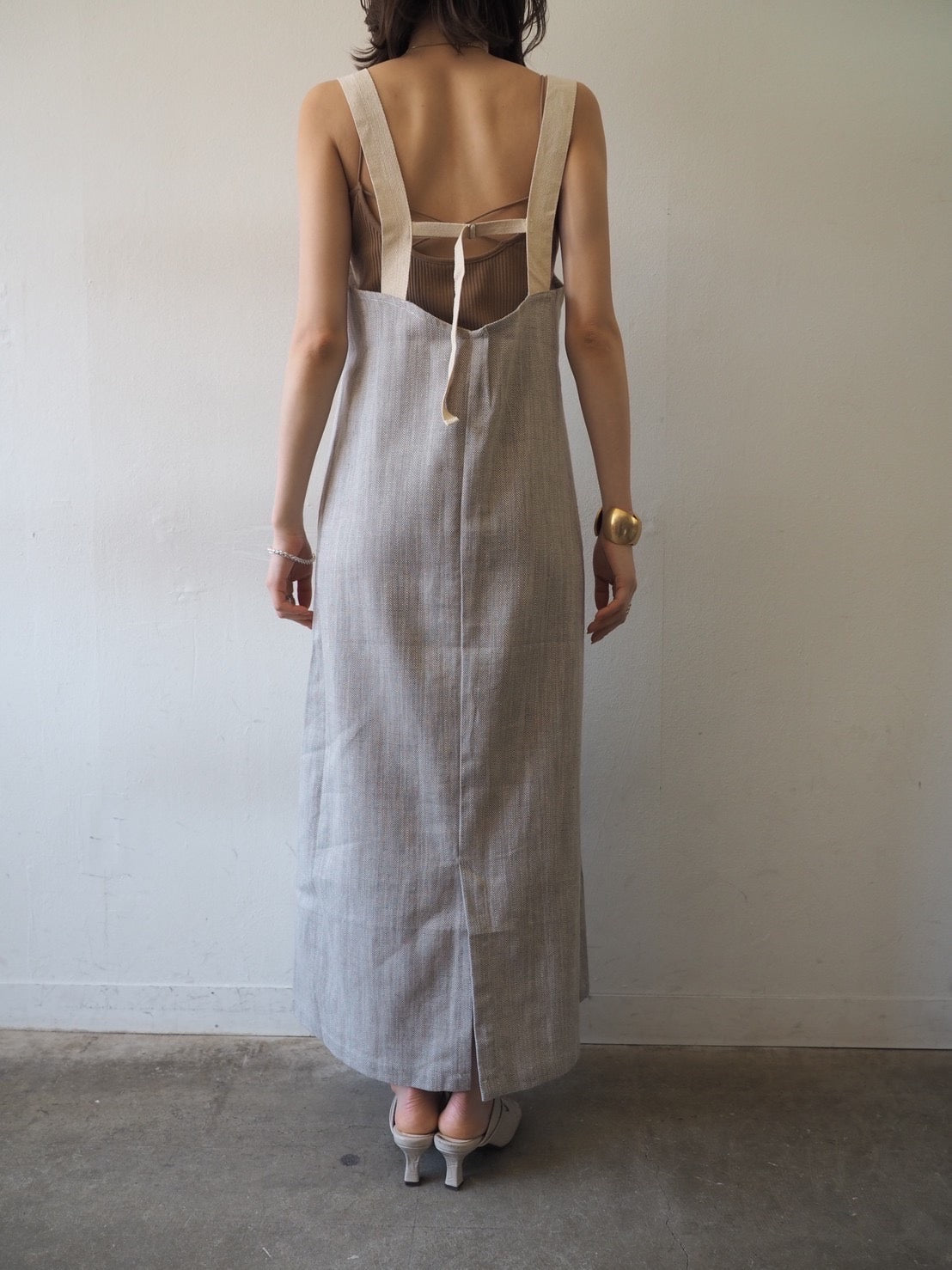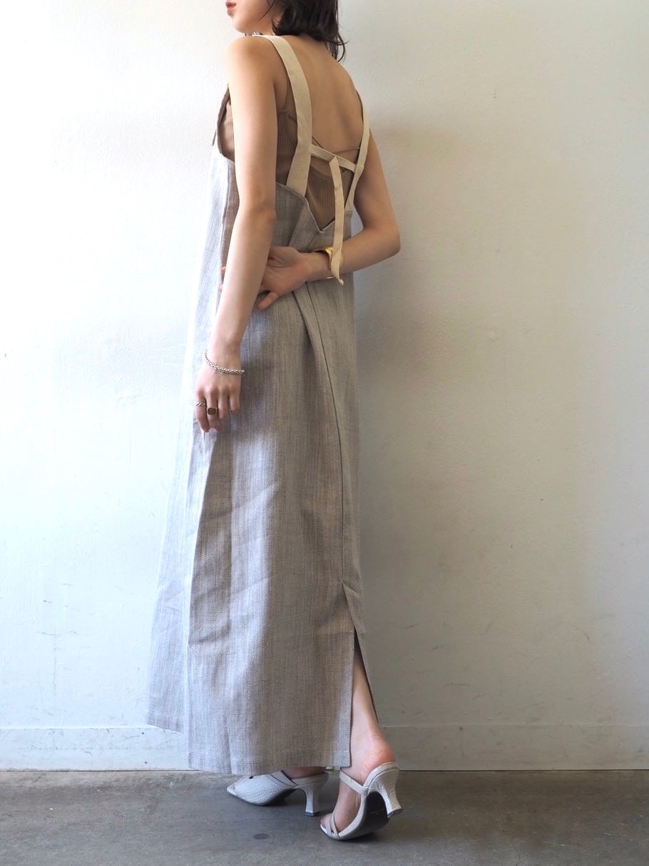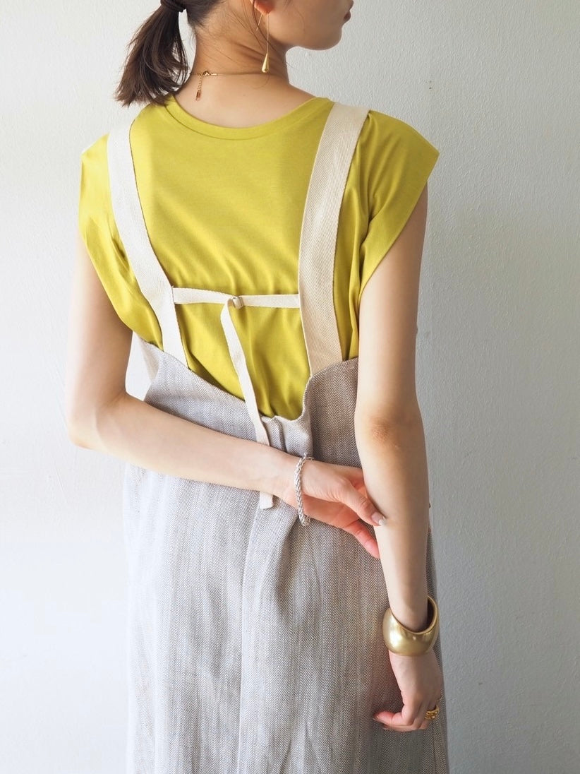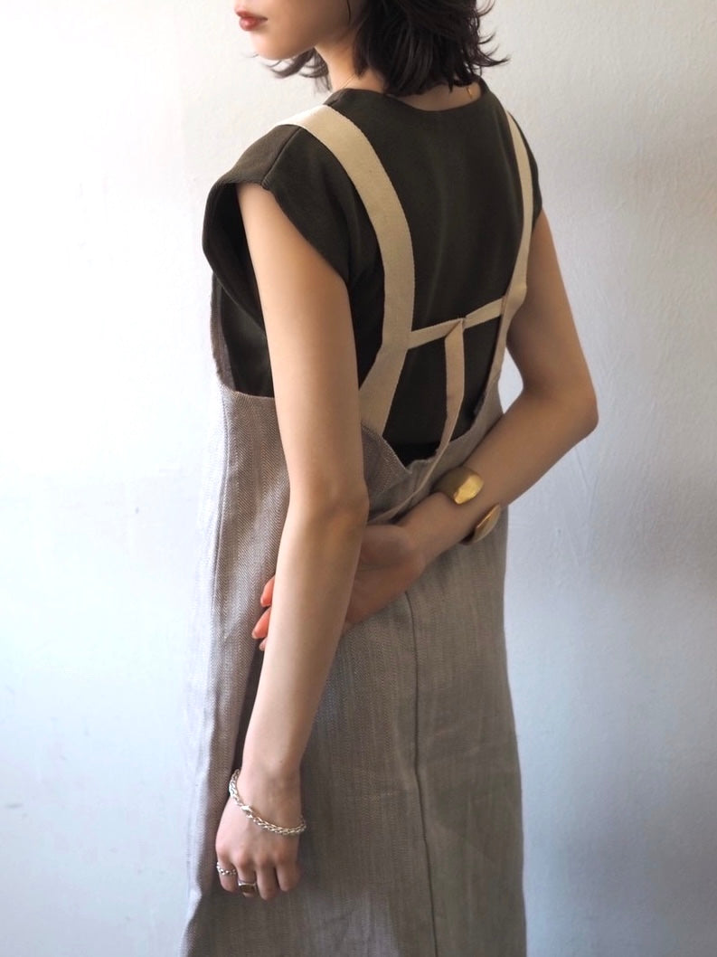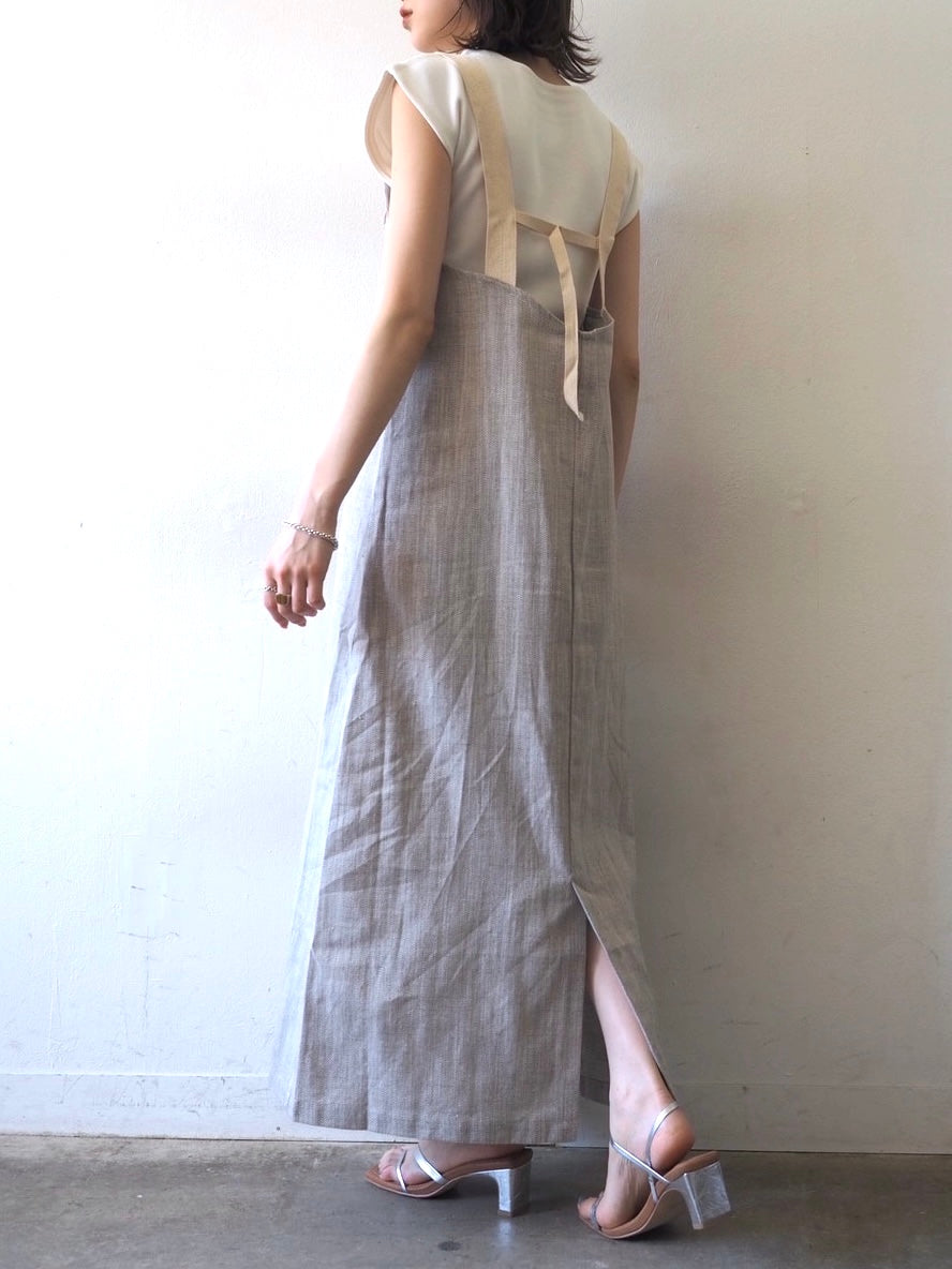 人字紋吊帶背心洋裝的肩帶採用不同材質設計。顏色對比營造出鮮明的對比,讓你穿起來很時尚。背面款式有一個調節器,因此您可以調整尺寸。讓腰部看起來俐落的剪裁也是一個重點。此單品採用柔和的喇叭形輪廓,增添女性氣質。