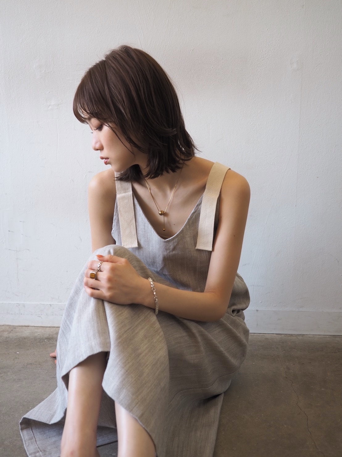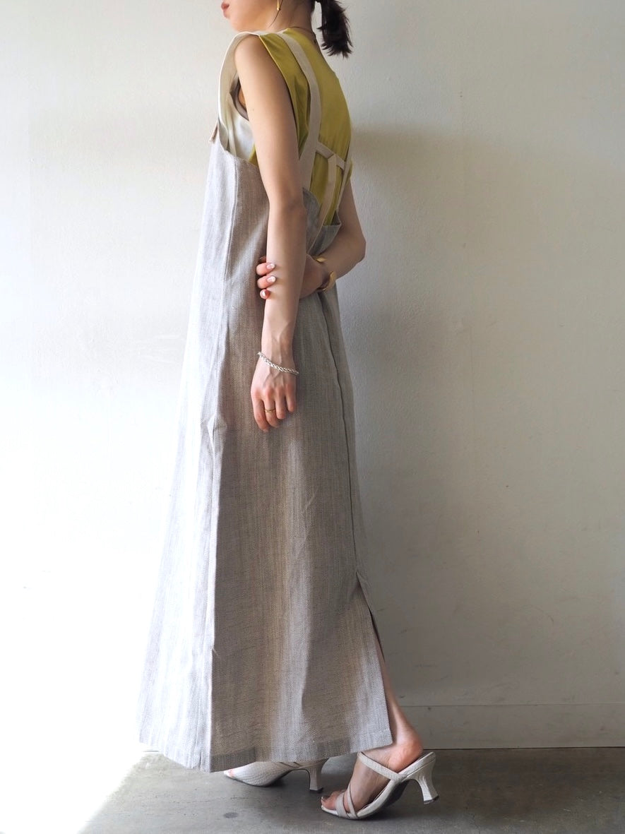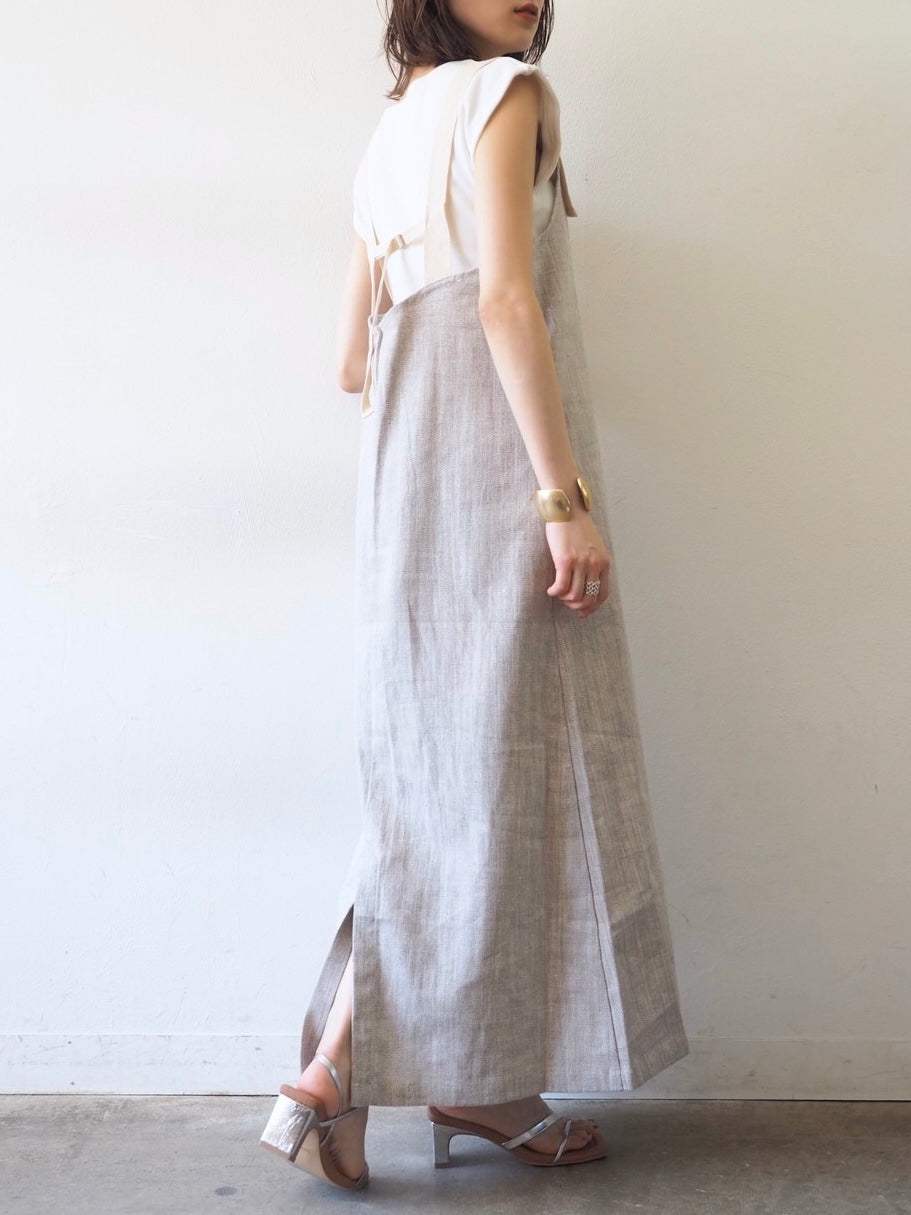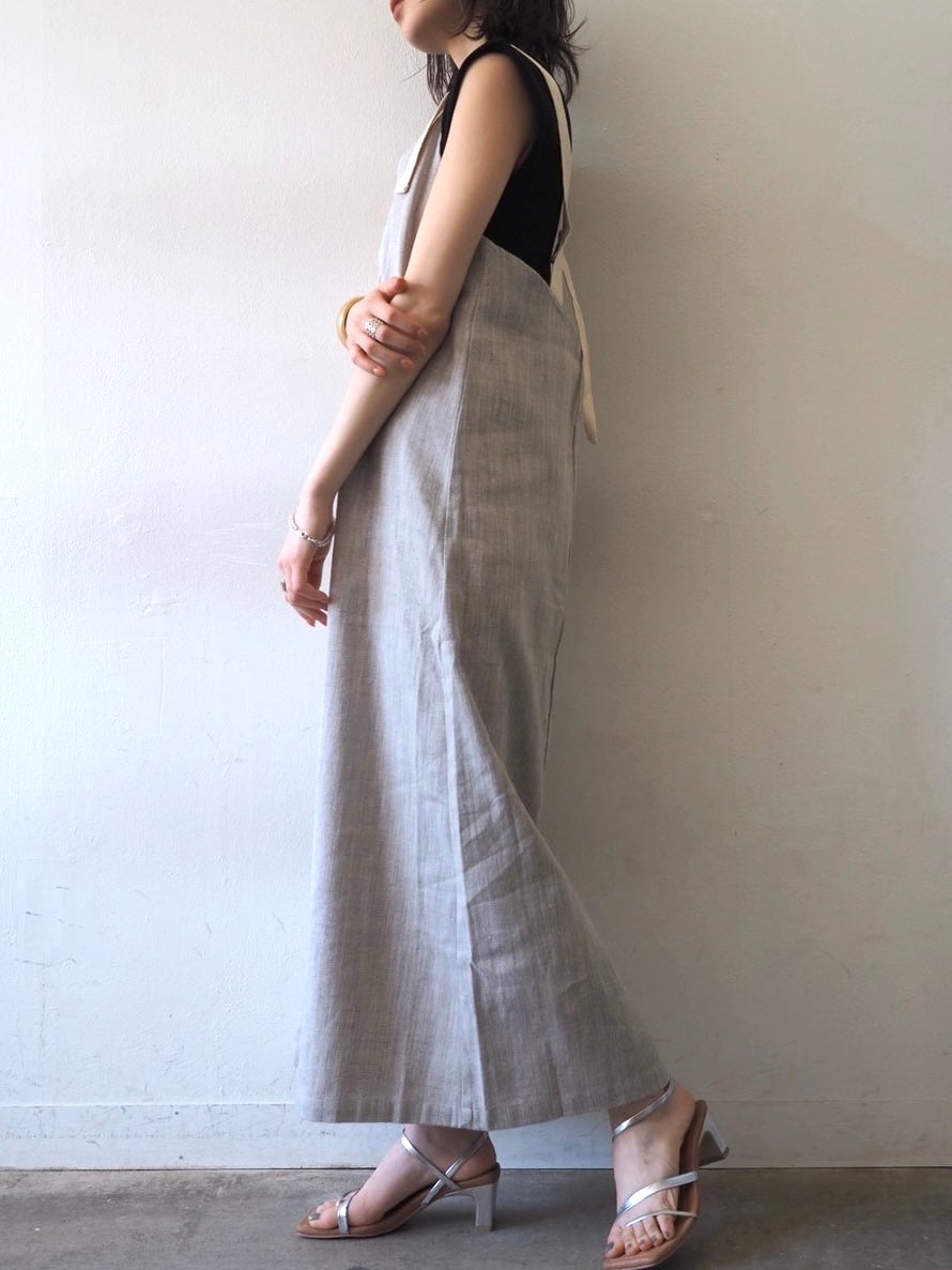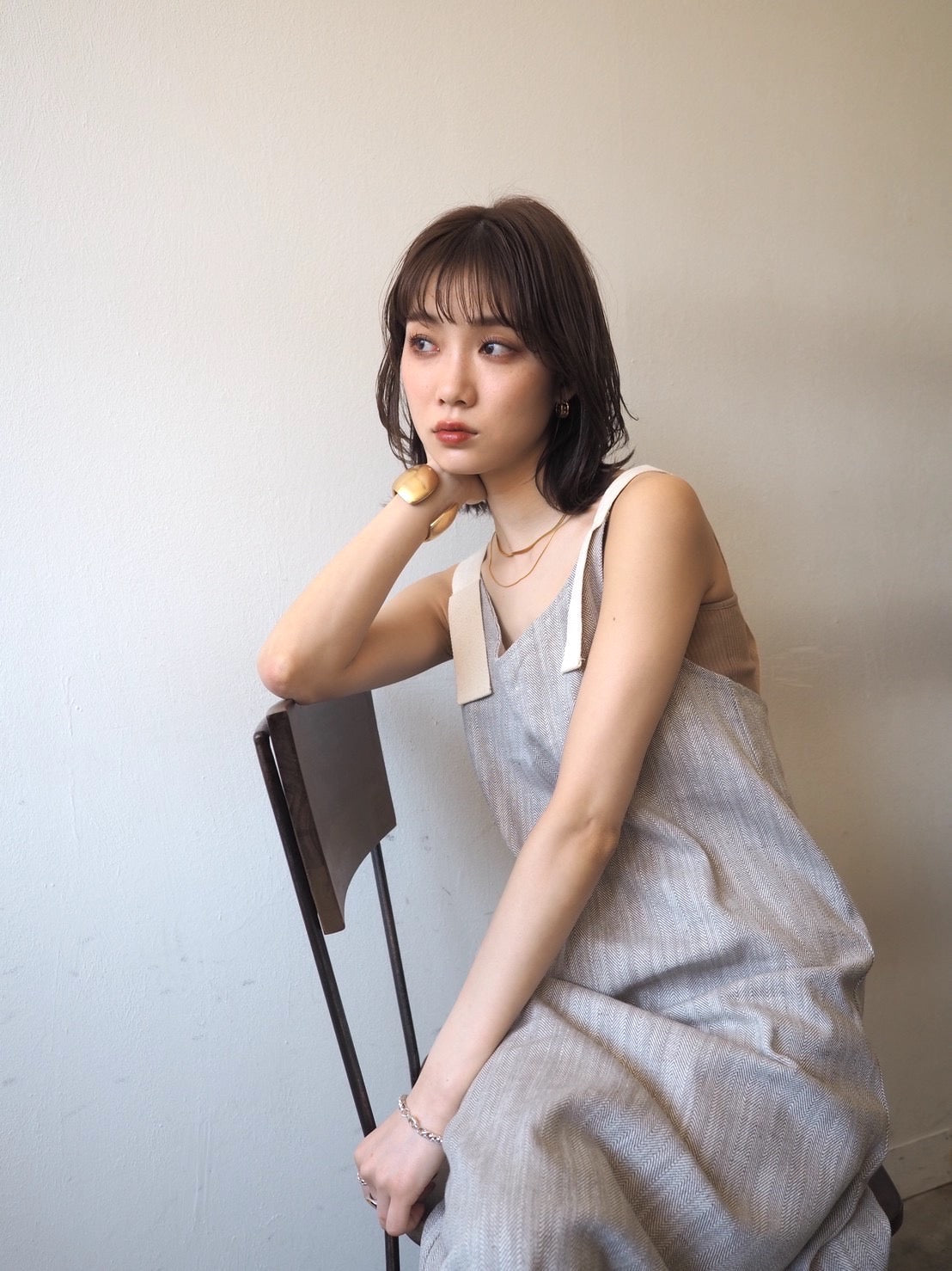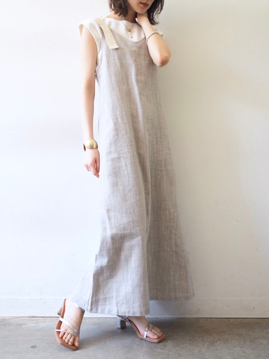 人字紋吊帶背心洋裝的肩帶採用不同材質設計。顏色對比營造出鮮明的對比,讓你穿起來很時尚。背面款式有一個調節器,因此您可以調整尺寸。讓腰部看起來俐落的剪裁也是一個重點。此單品採用柔和的喇叭形輪廓,增添女性氣質。