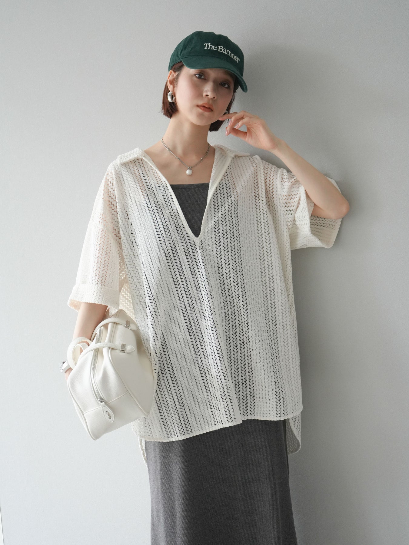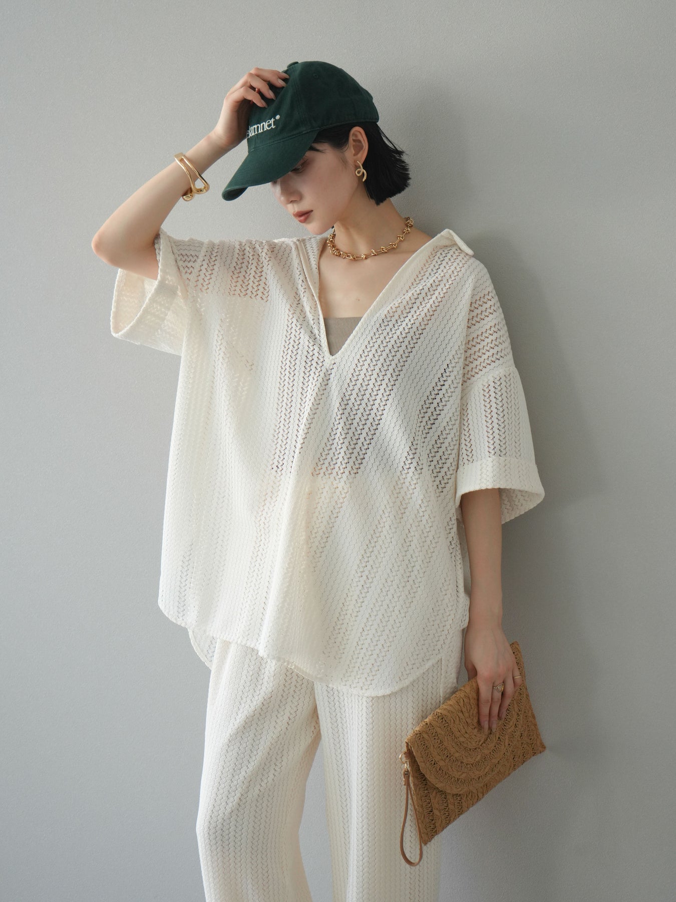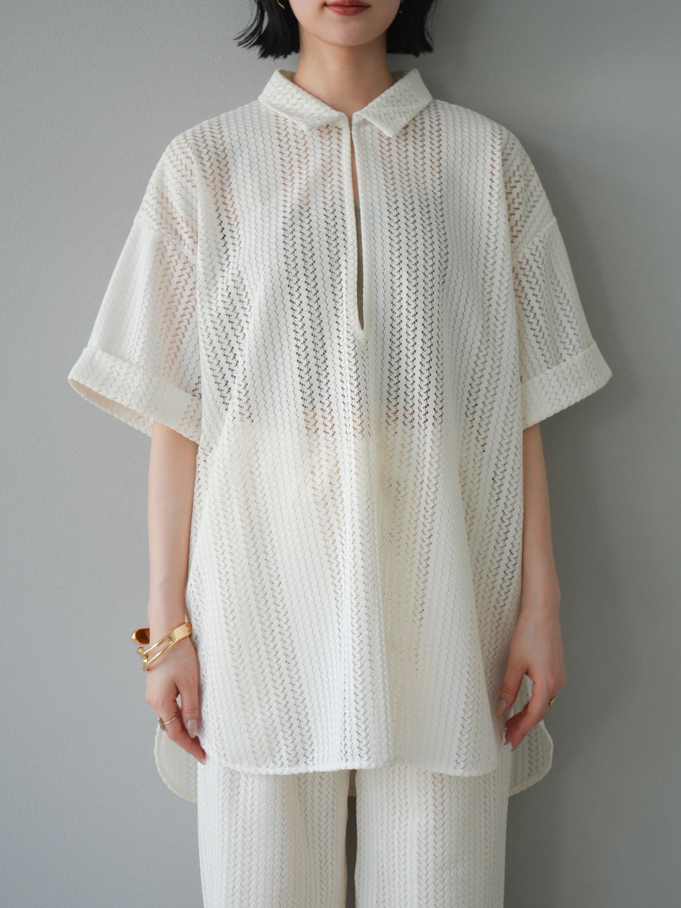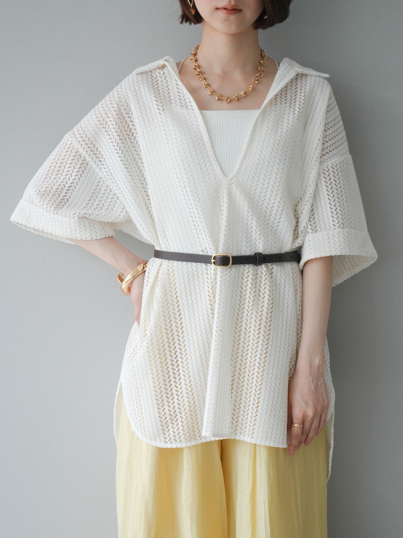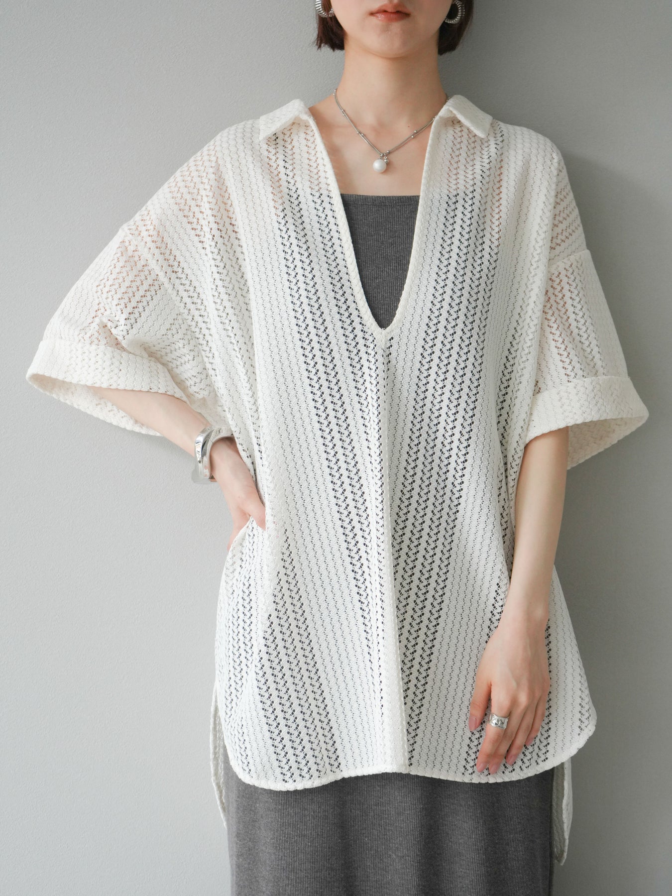 這款兩穿套頭衫採用透氣鏤空蕾絲針織,打造清涼造型。設計百搭,可任意穿搭,拓展了造型選擇。適度寬鬆的輪廓和寬鬆的布料,營造出輕鬆休閒又不失精緻的造型。也建議搭配背心和吊帶背心。 ※除下裝、吊帶背心(內衣)以外的商品均為標準品,不含內衣。