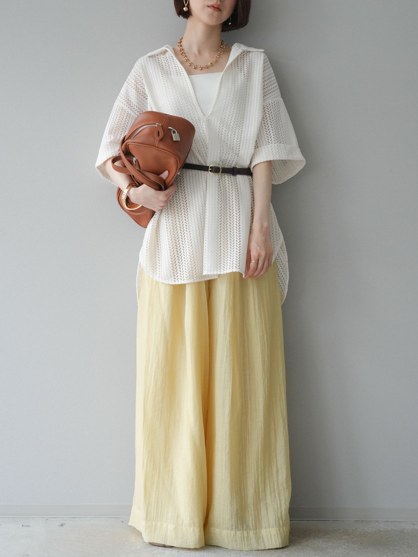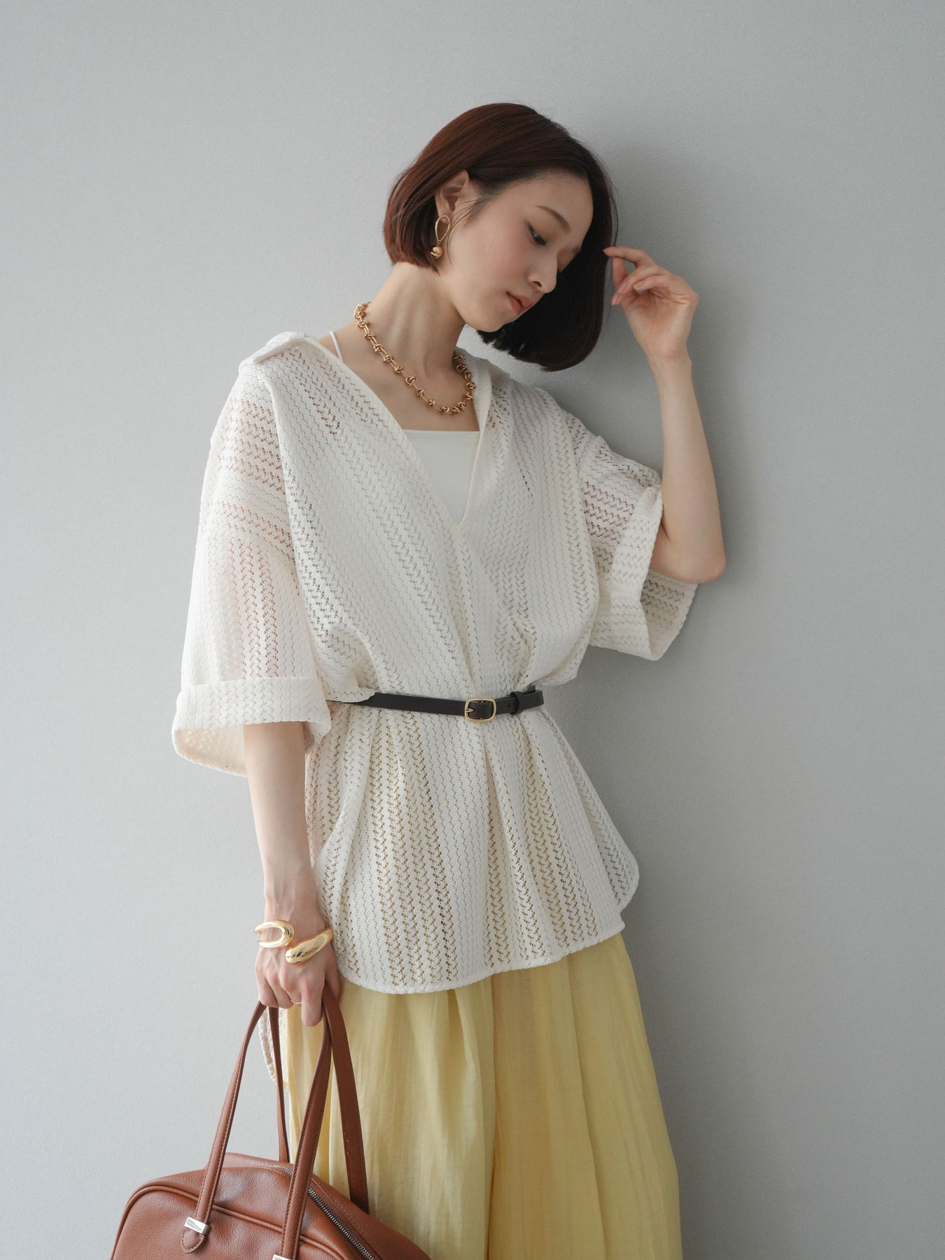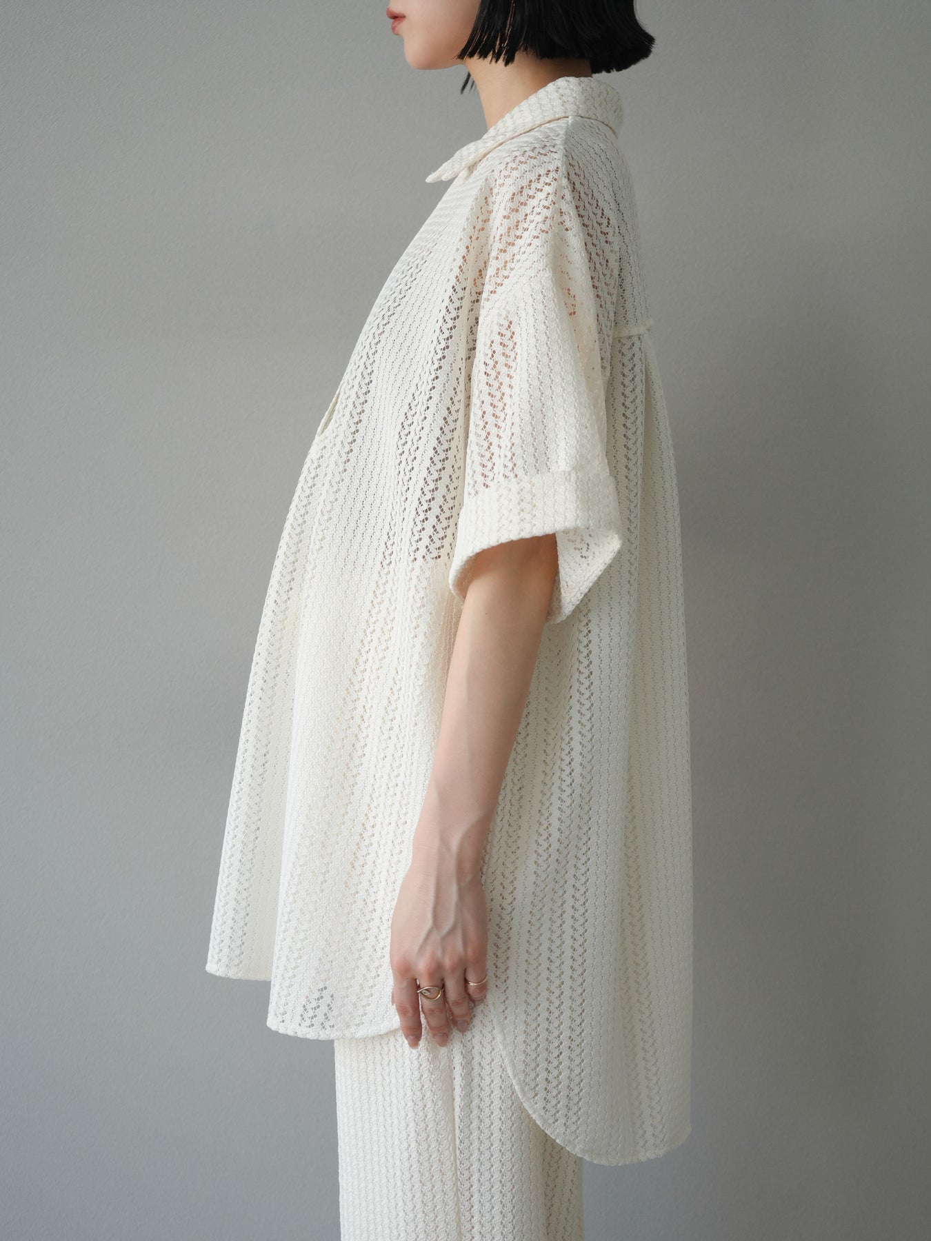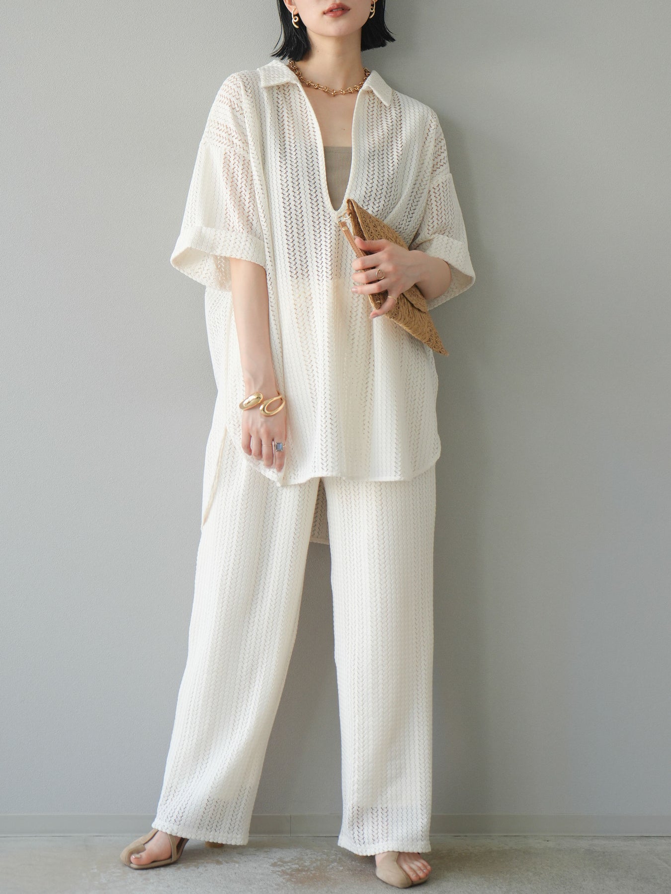 這款兩穿套頭衫採用透氣鏤空蕾絲針織,打造清涼造型。設計百搭,可任意穿搭,拓展了造型選擇。適度寬鬆的輪廓和寬鬆的布料,營造出輕鬆休閒又不失精緻的造型。也建議搭配背心和吊帶背心。 ※除下裝、吊帶背心(內衣)以外的商品均為標準品,不含內衣。