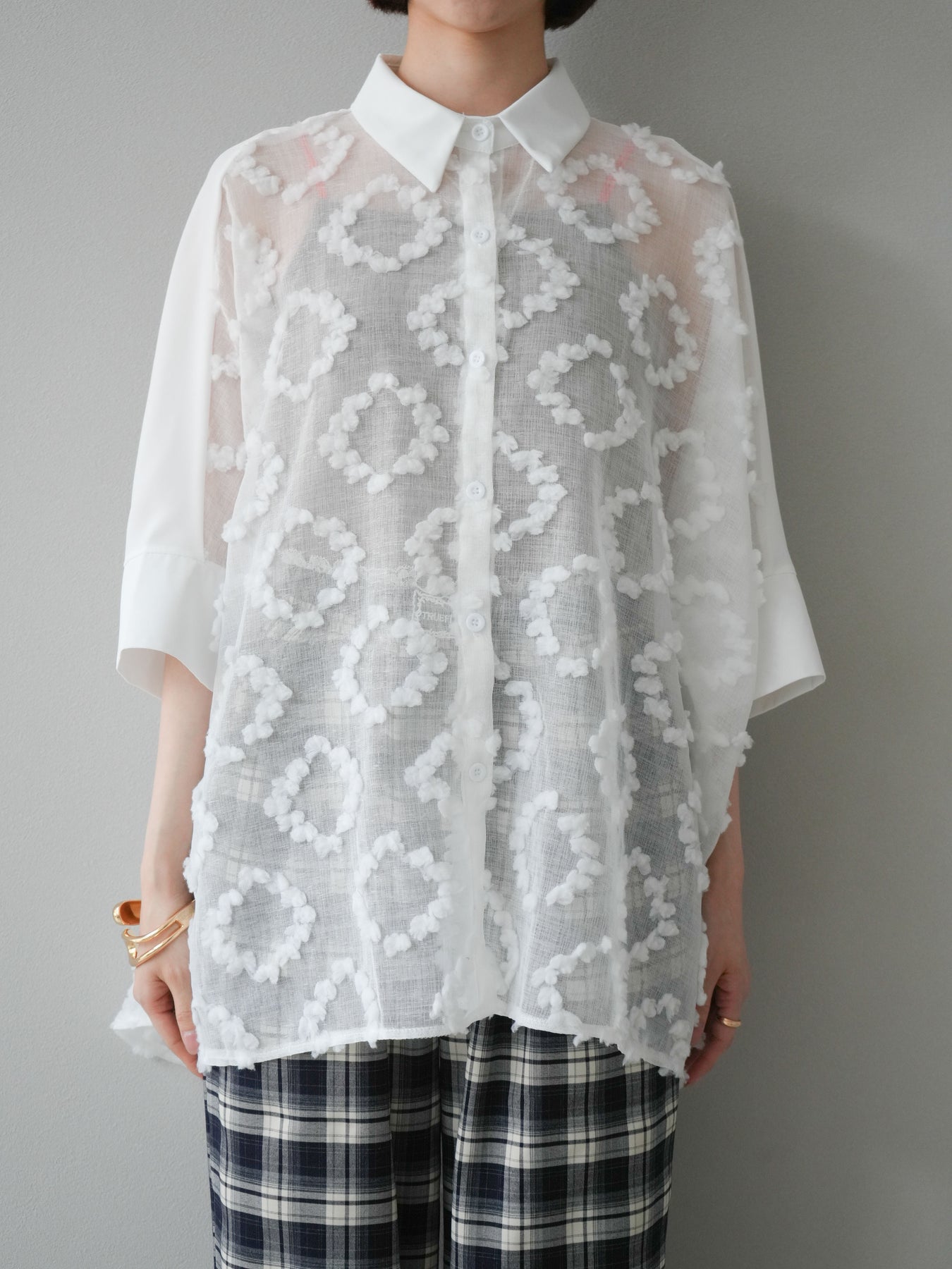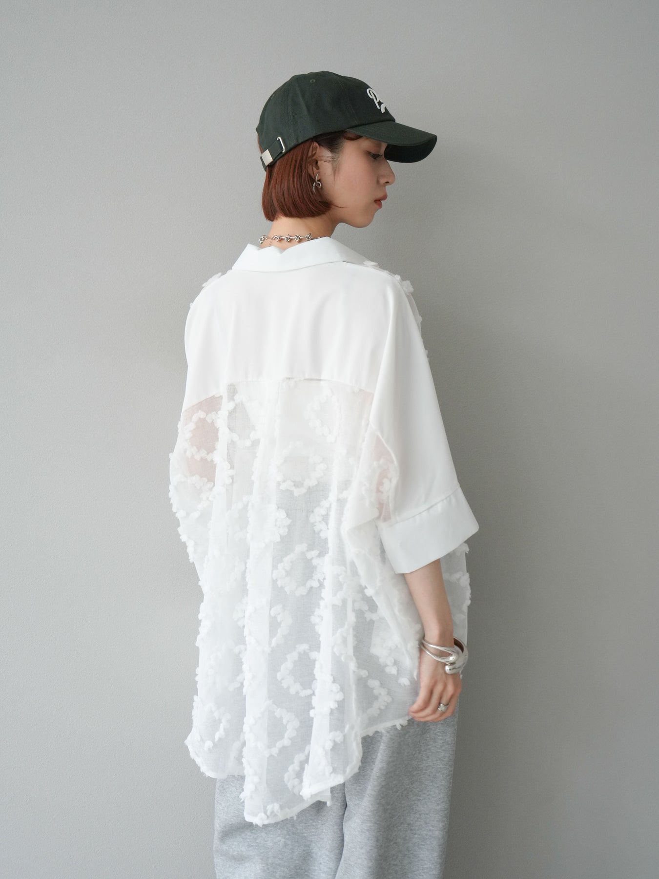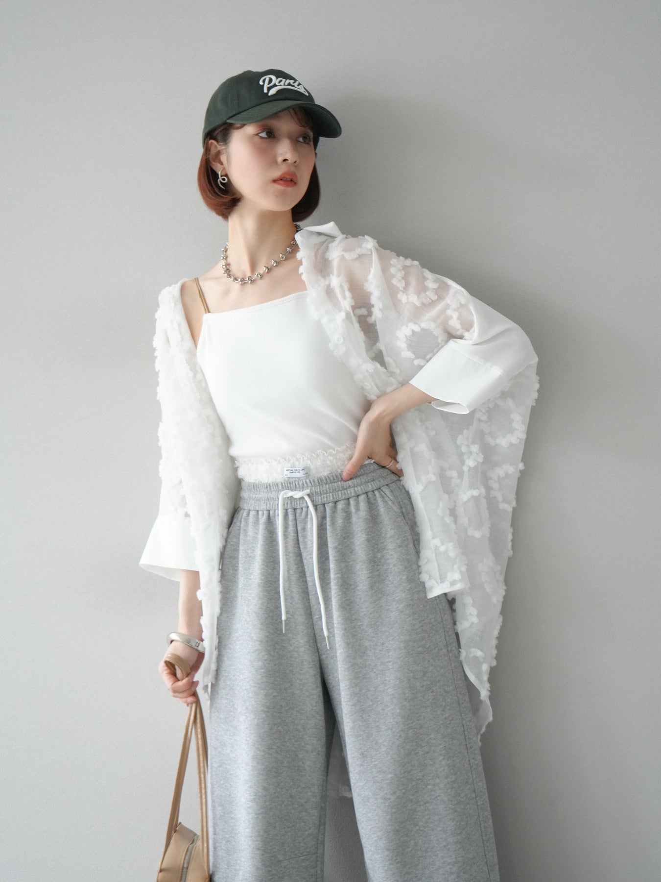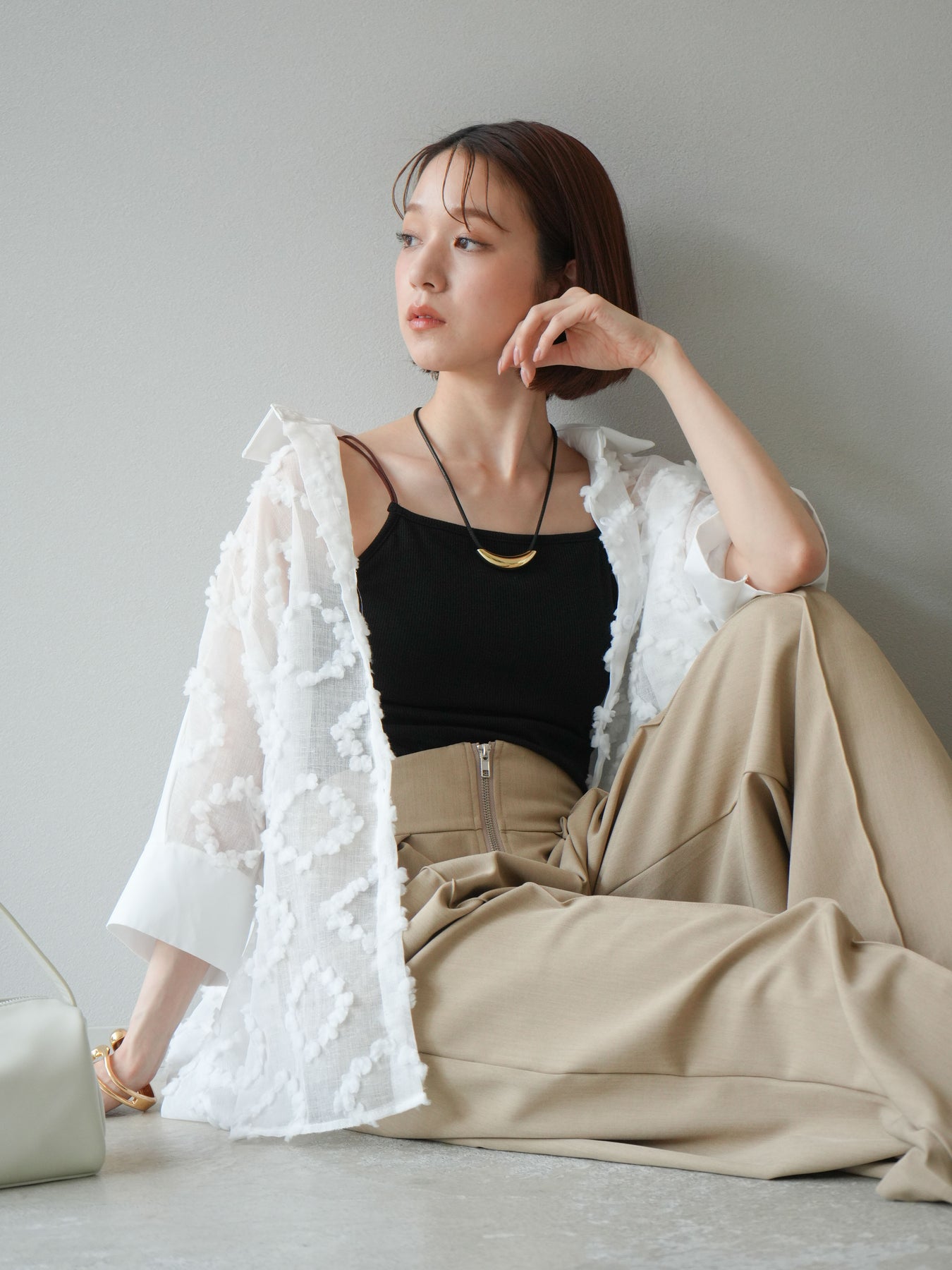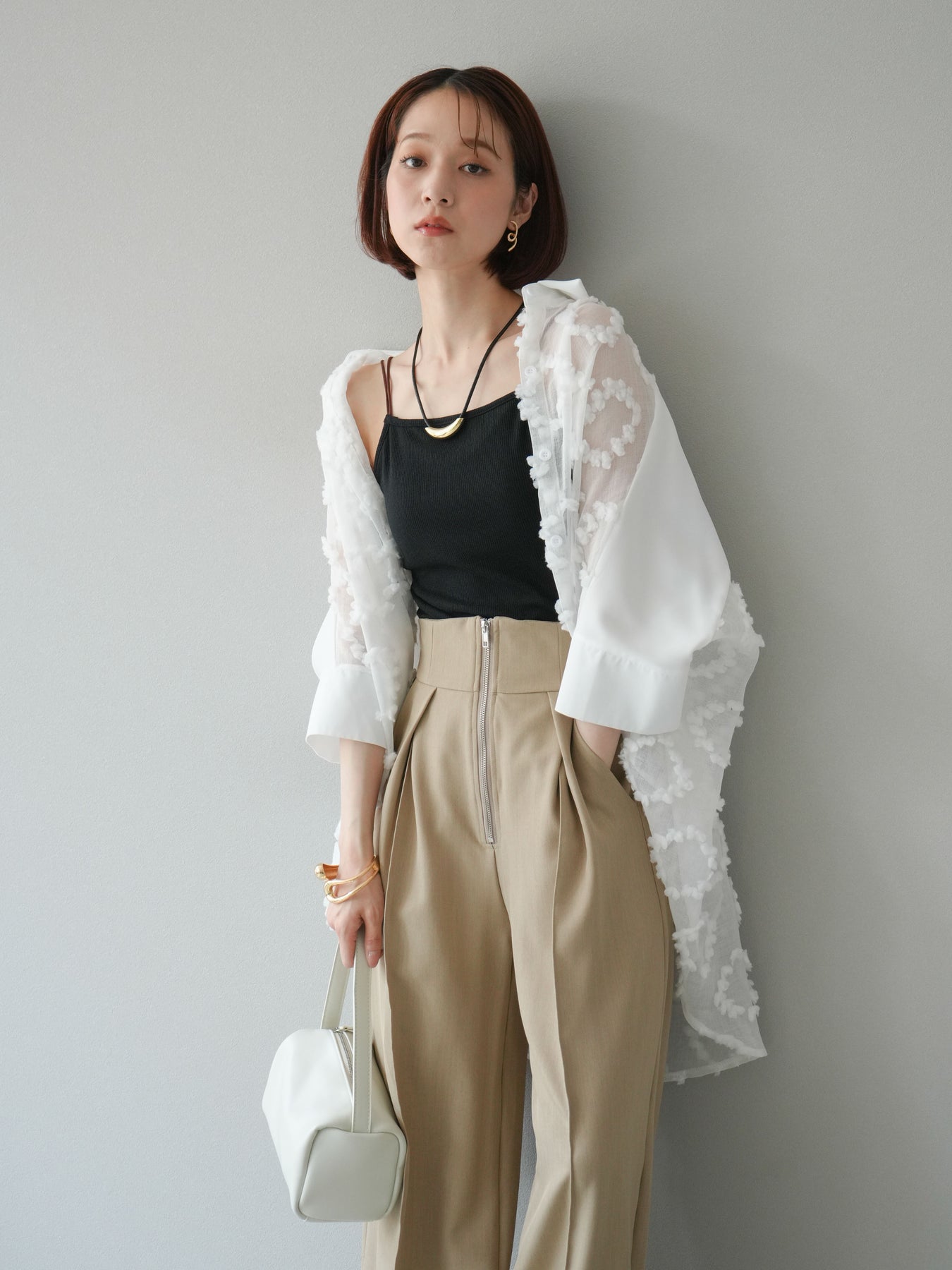這款露肩半身襯衫採用混合材質的透視布料製成。採用透視布料和立體花朵刺繡,簡約優雅。前襟配有紐扣,優雅氣質十足,可搭配從休閒到正式的各種風格。輕盈清涼的設計非常適合春夏季節的搭配。 *除下裝和吊帶背心(內衣)外,所有商品均包含在內,不包含內衣。