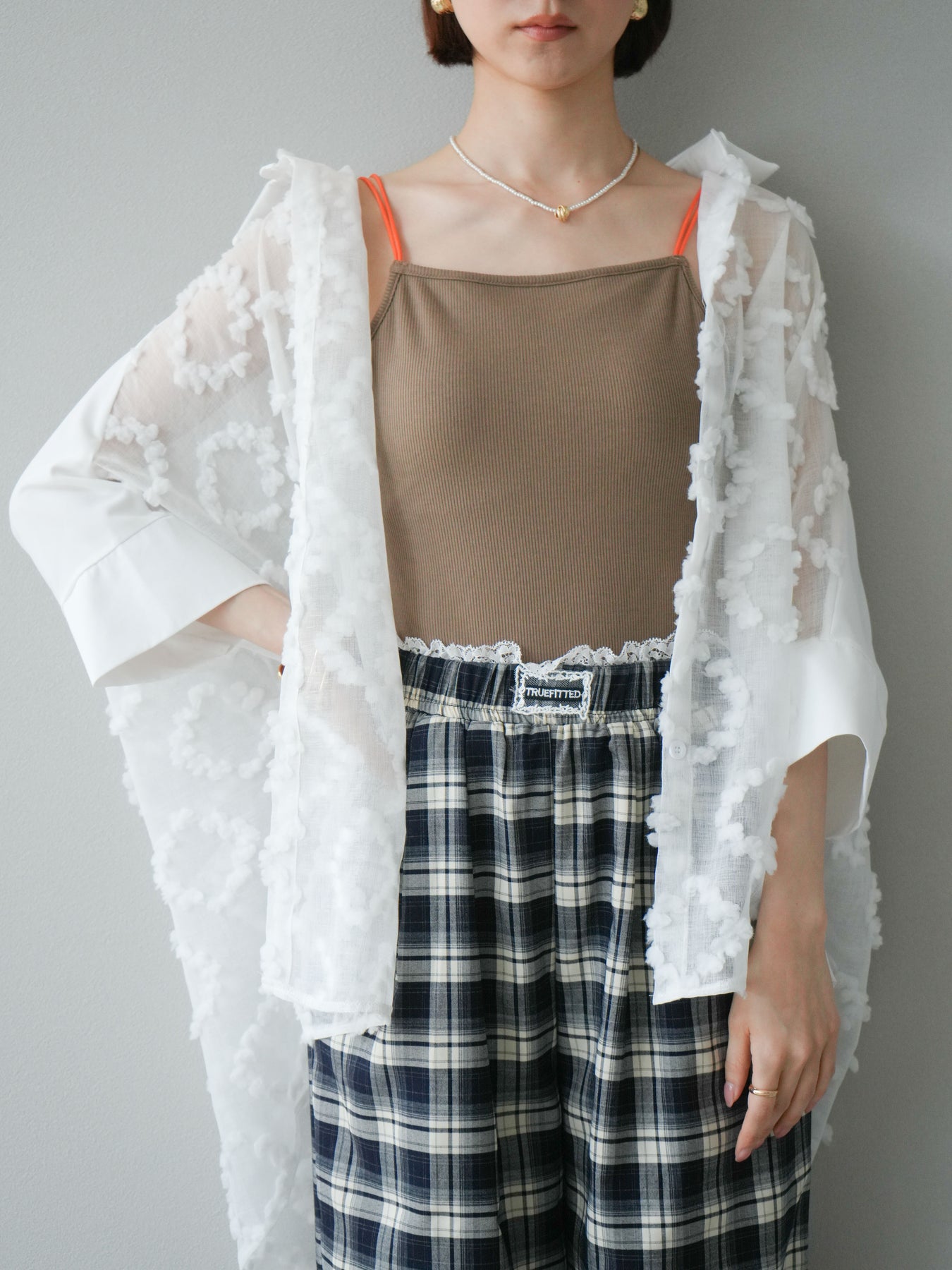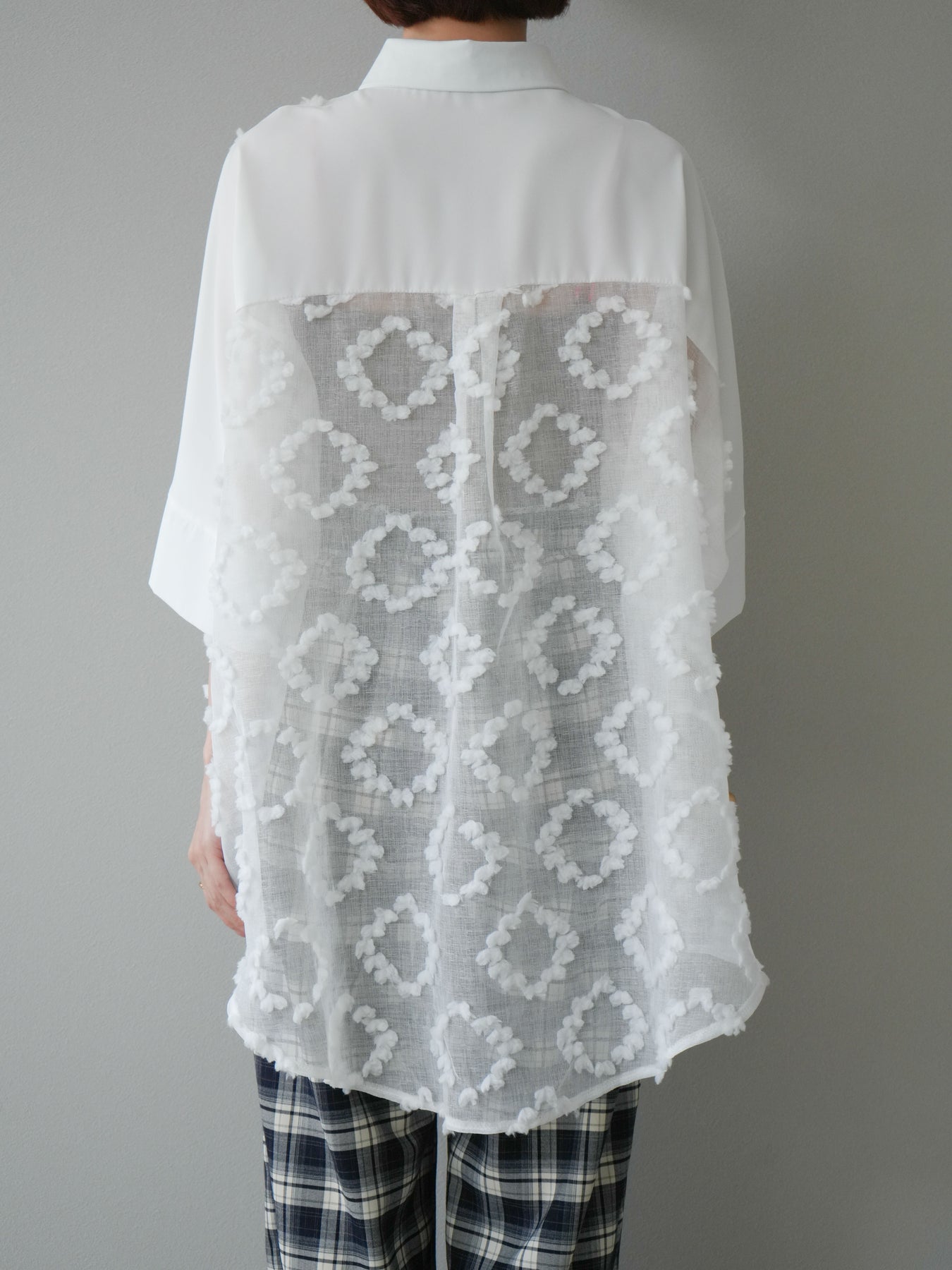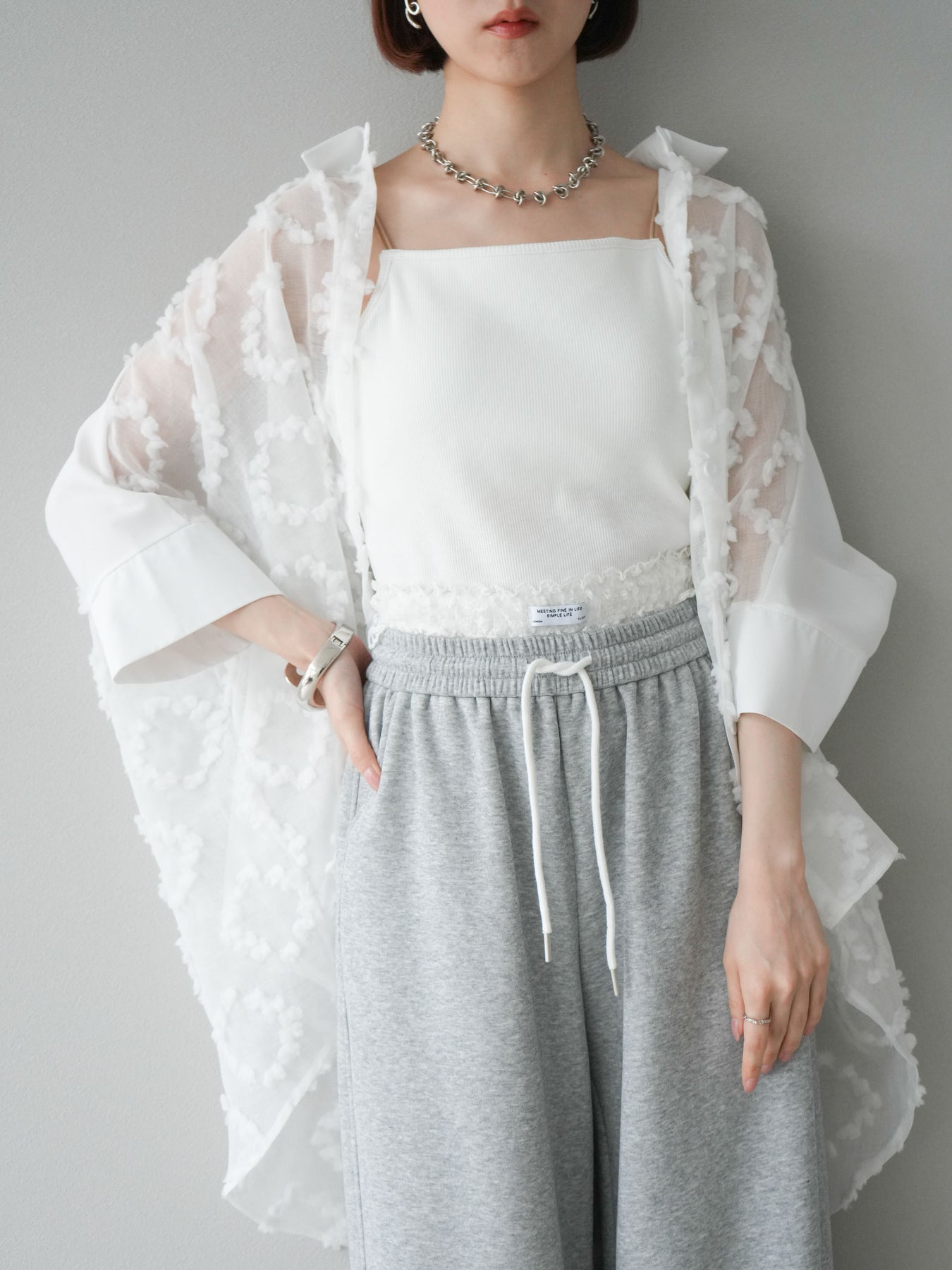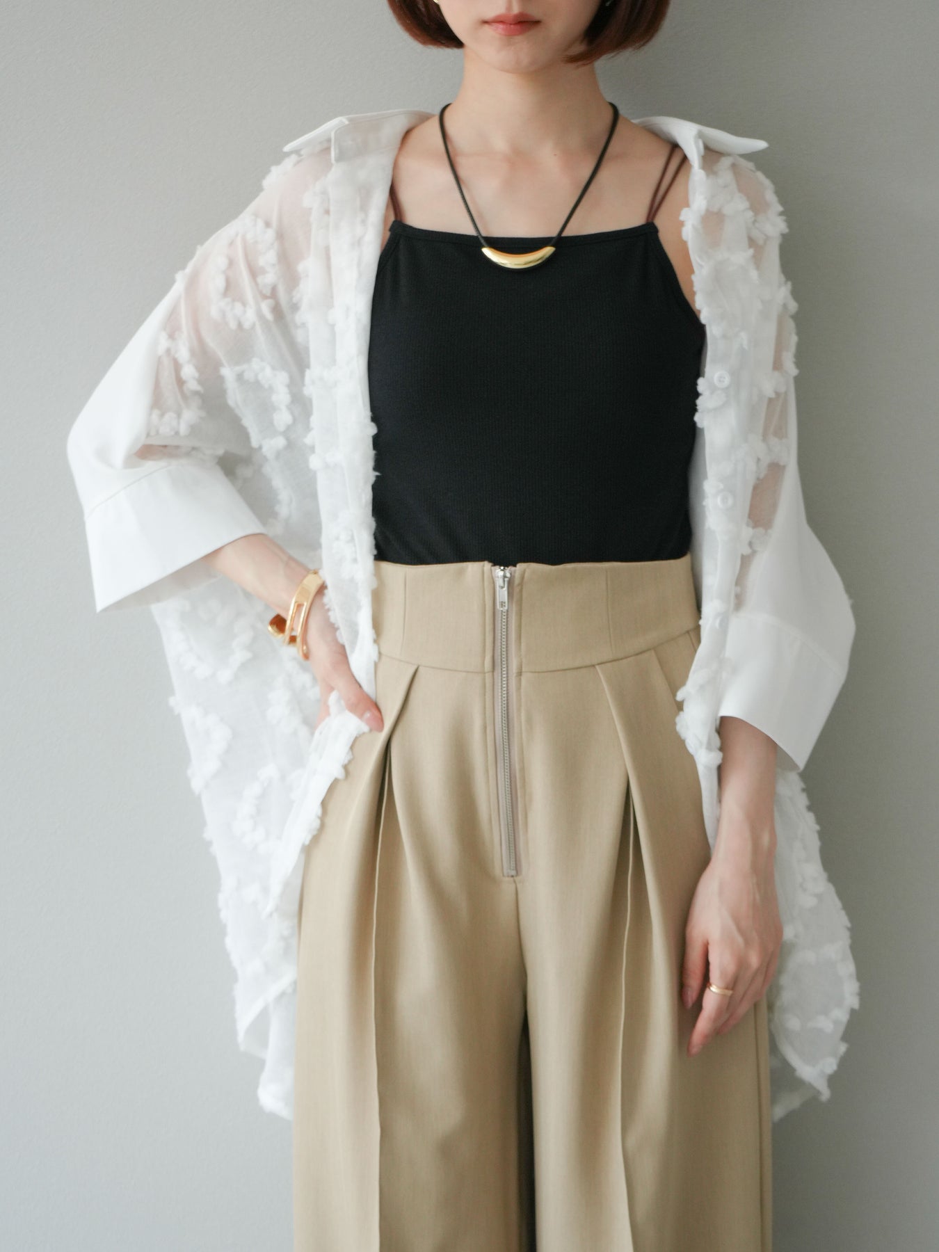 這款露肩半身襯衫採用混合材質的透視布料製成。採用透視布料和立體花朵刺繡,簡約優雅。前襟配有紐扣,優雅氣質十足,可搭配從休閒到正式的各種風格。輕盈清涼的設計非常適合春夏季節的搭配。 *除下裝和吊帶背心(內衣)外,所有商品均包含在內,不包含內衣。