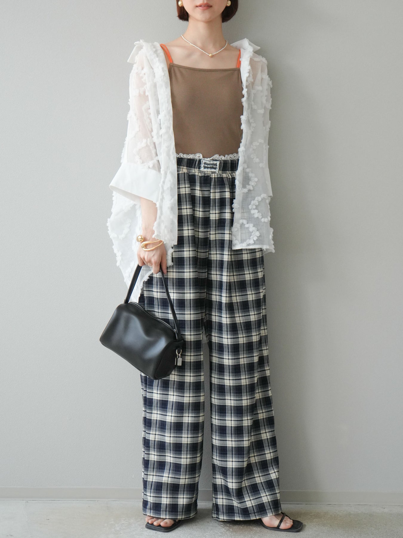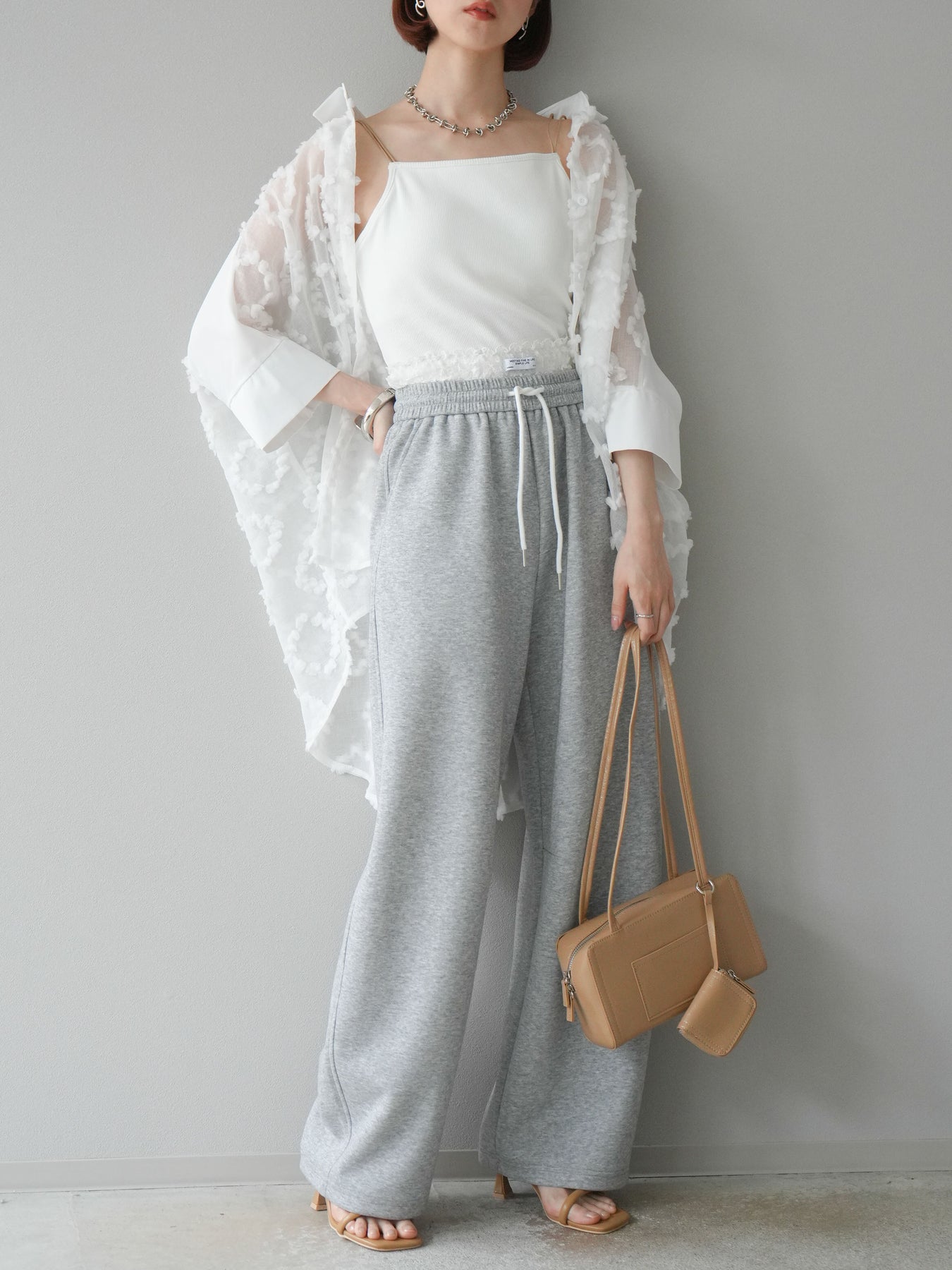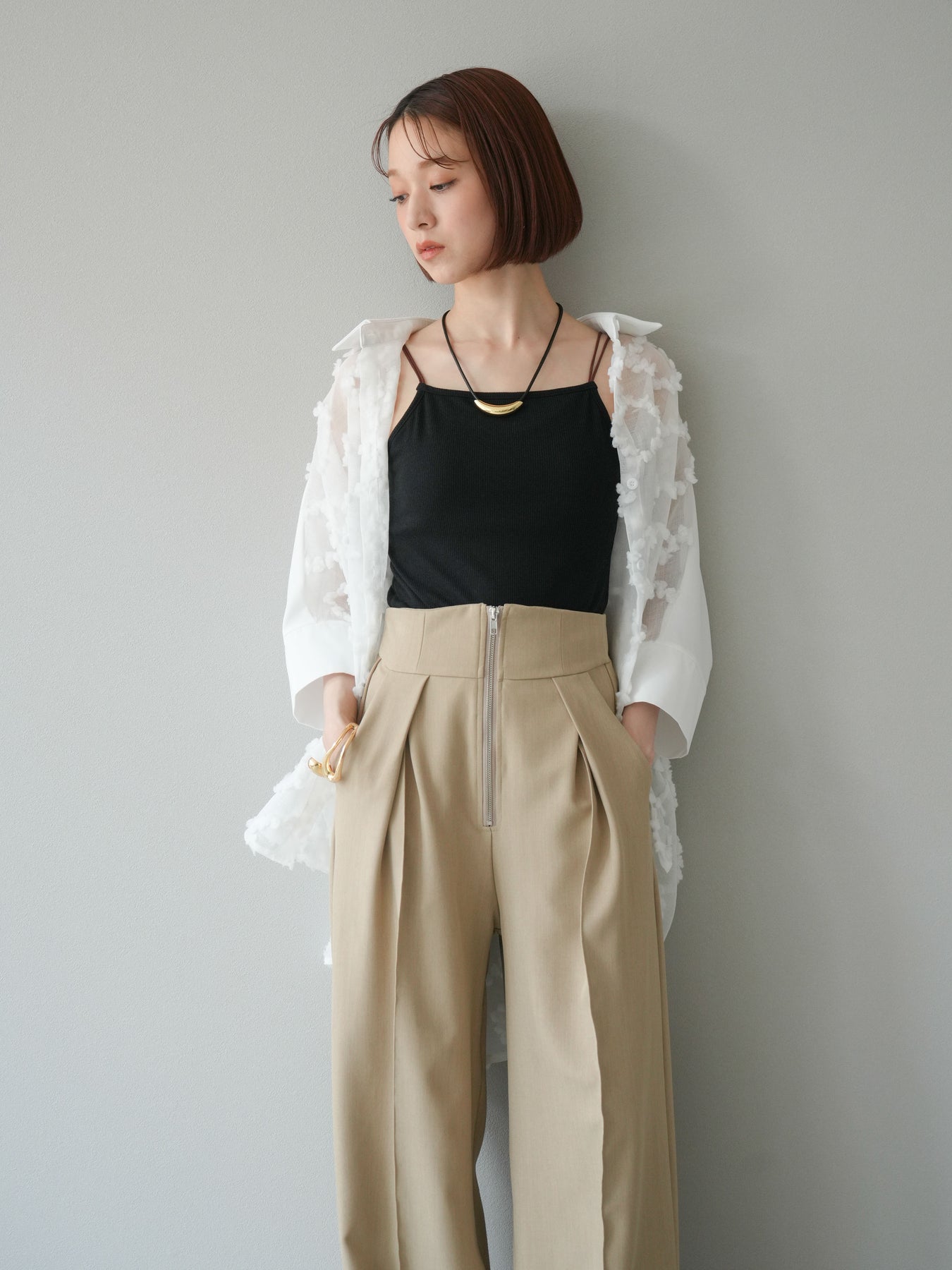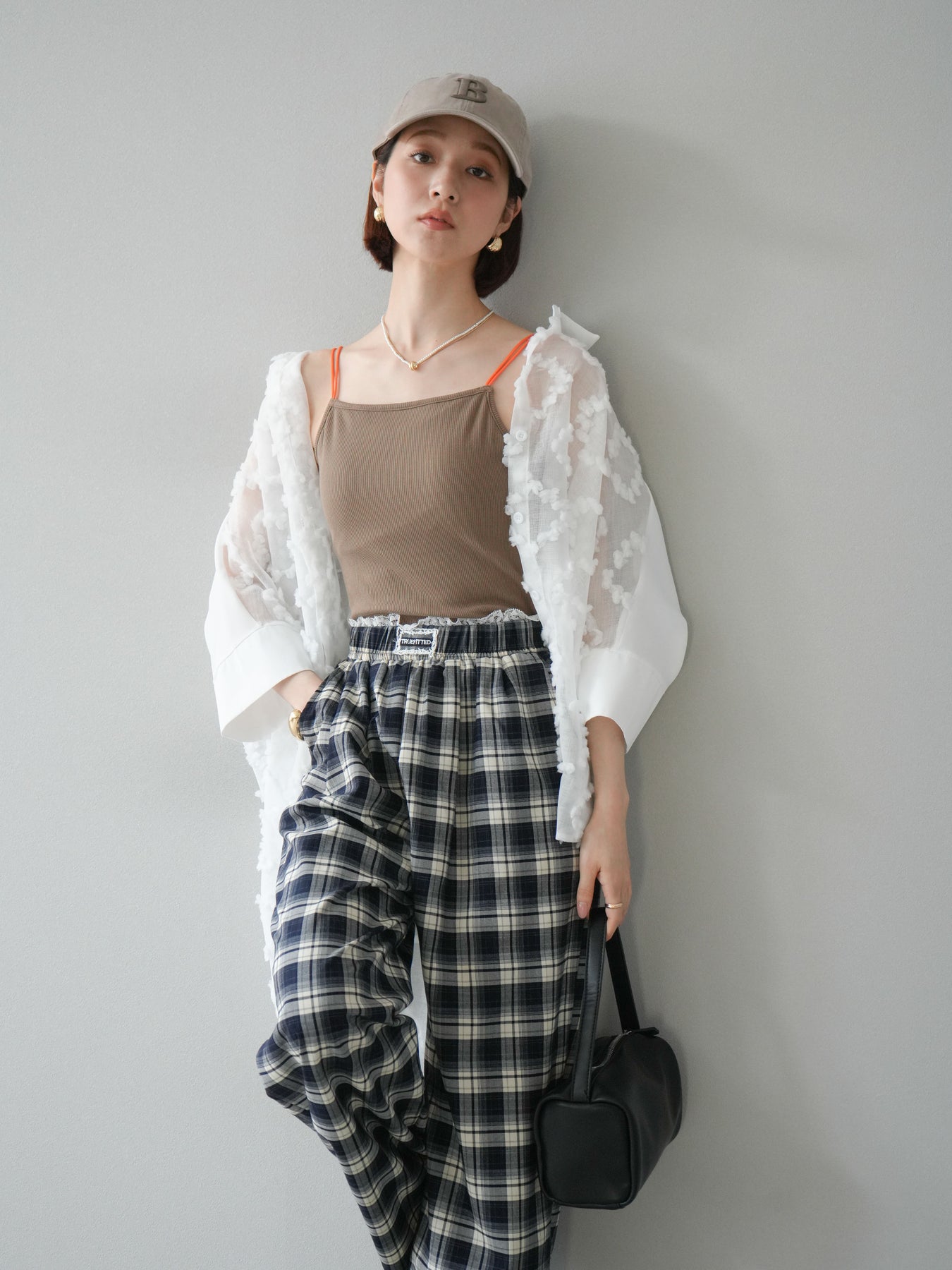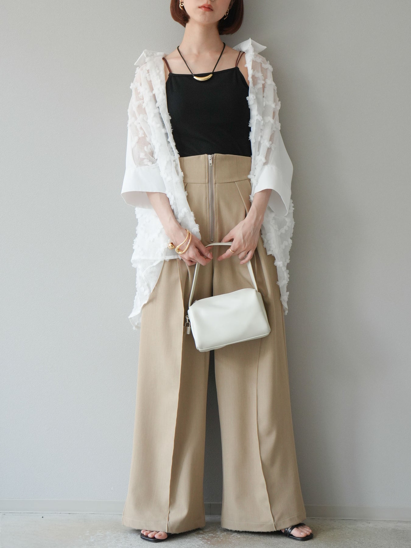 這款露肩半身襯衫採用混合材質的透視布料製成。採用透視布料和立體花朵刺繡,簡約優雅。前襟配有紐扣,優雅氣質十足,可搭配從休閒到正式的各種風格。輕盈清涼的設計非常適合春夏季節的搭配。 *除下裝和吊帶背心(內衣)外,所有商品均包含在內,不包含內衣。
