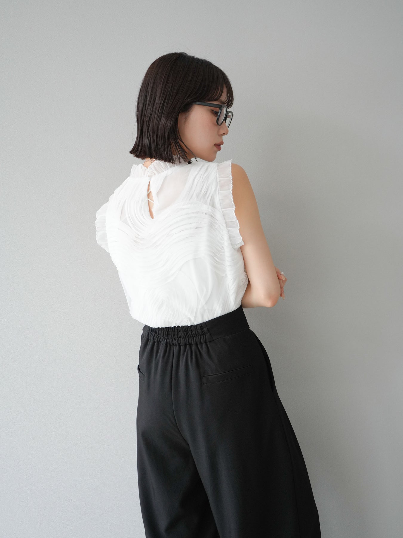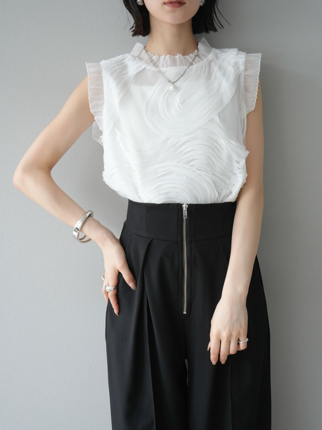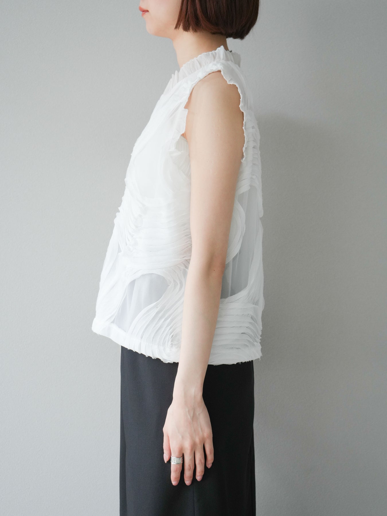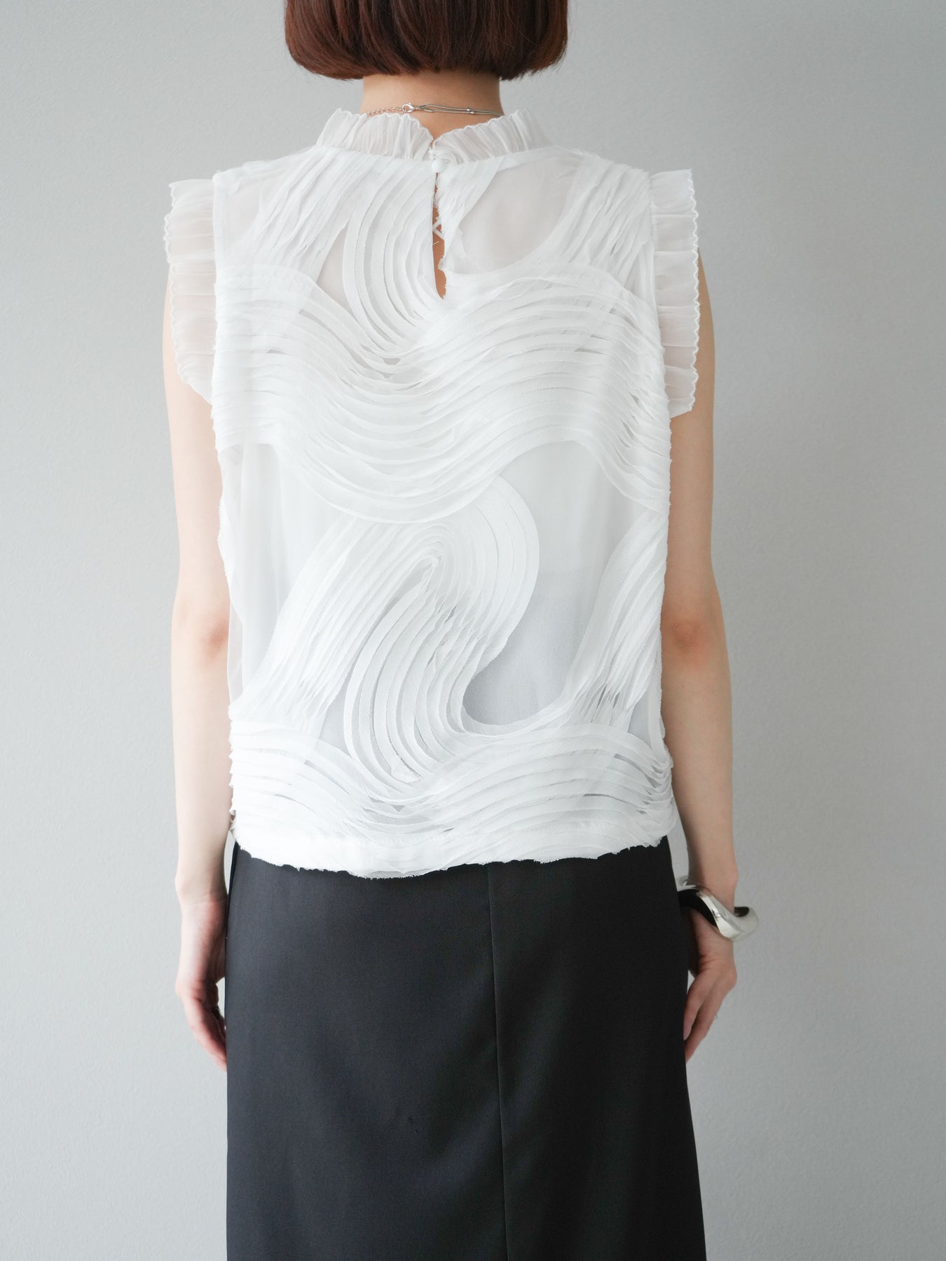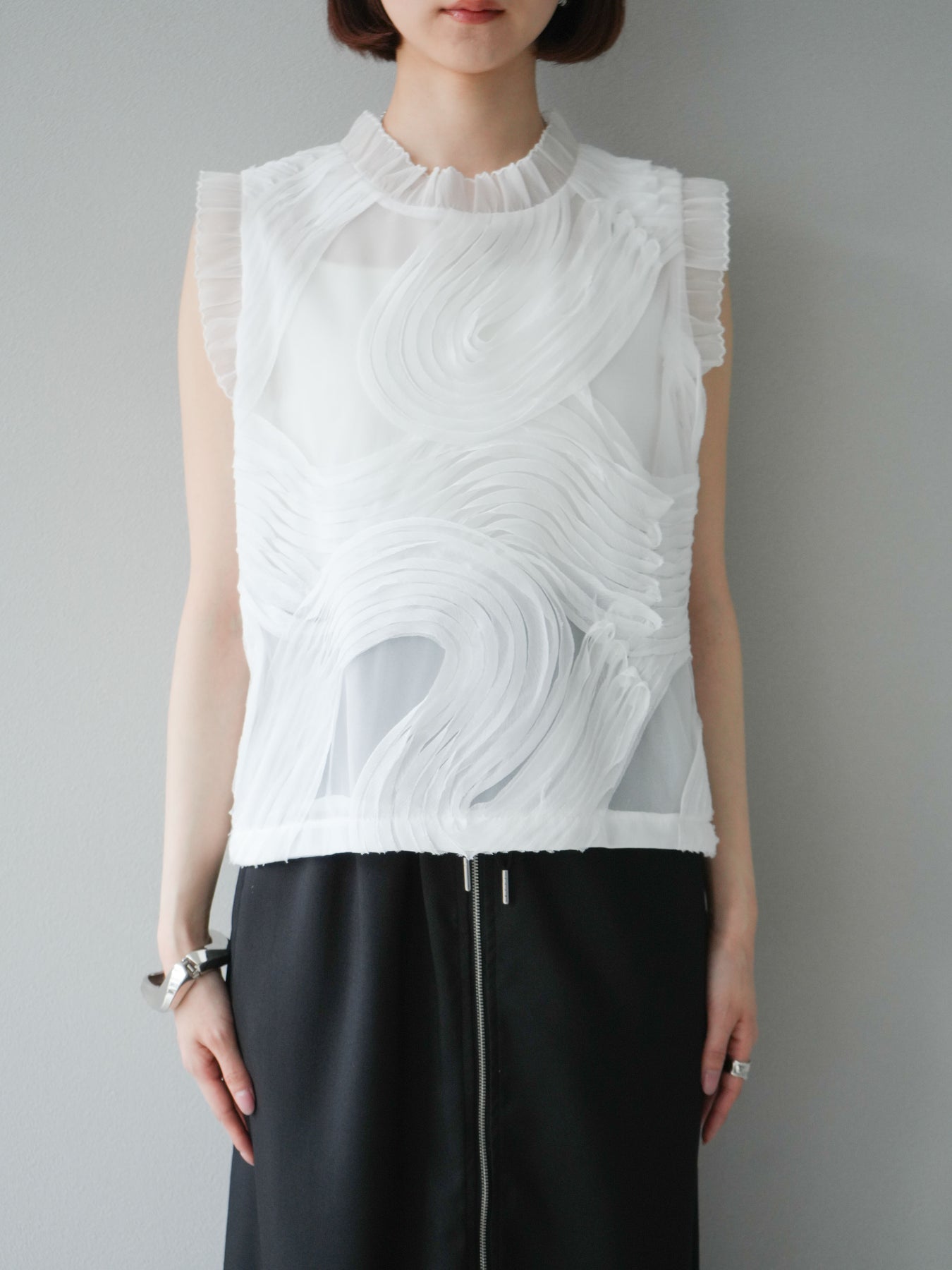 這款無袖上衣採用薄紗製成,飾有獨特的立體提花圖案。柔軟的薄紗襯托出您的女性氣質,並隨著您的移動而塑造優美的輪廓。褶邊和精緻的設計賦予它優雅迷人的氣質,非常適合出席特殊場合。這件單品簡約迷人。 ※除下裝、吊帶背心(內衣)以外的商品均為標準品,不含內衣。
