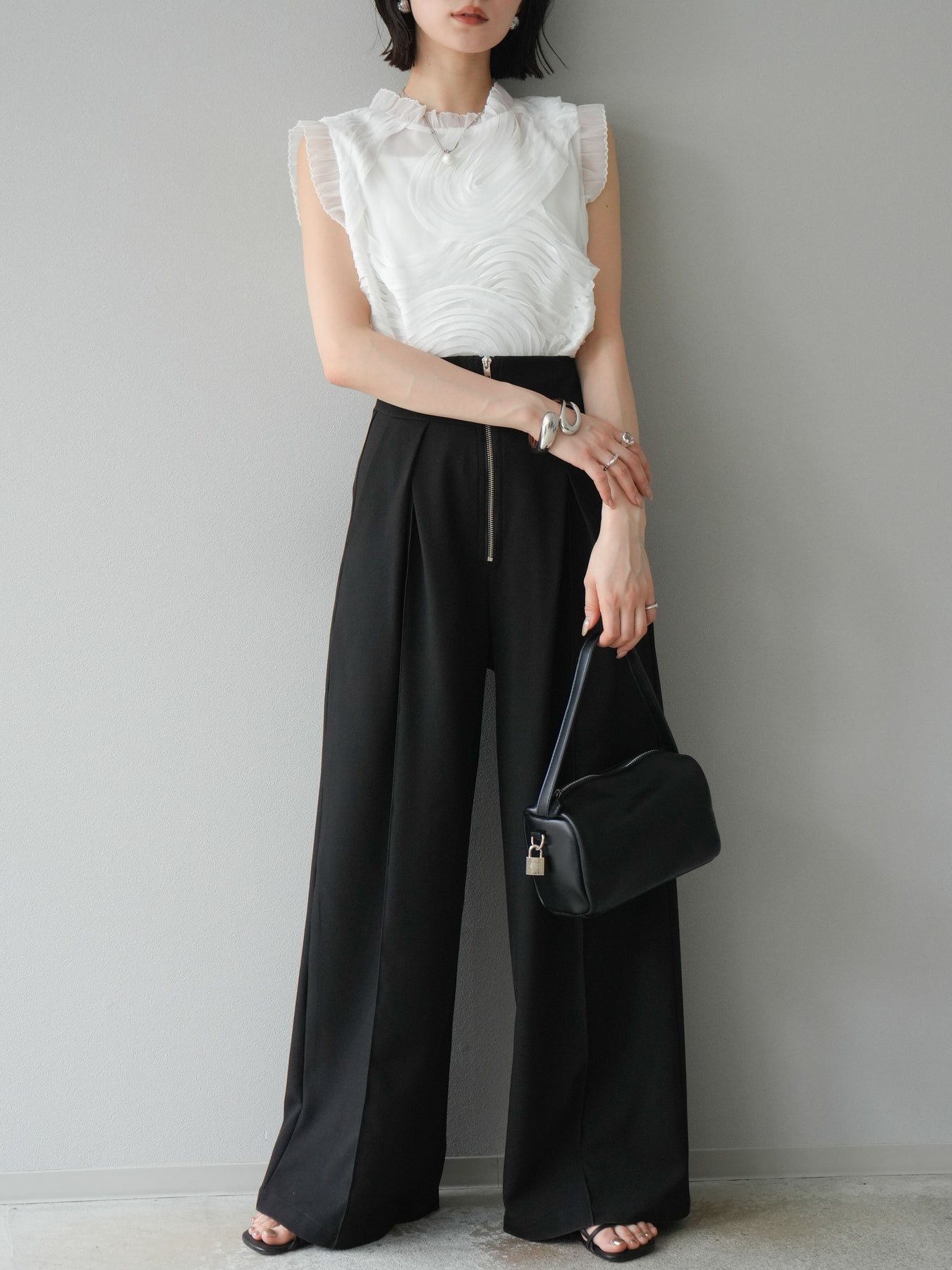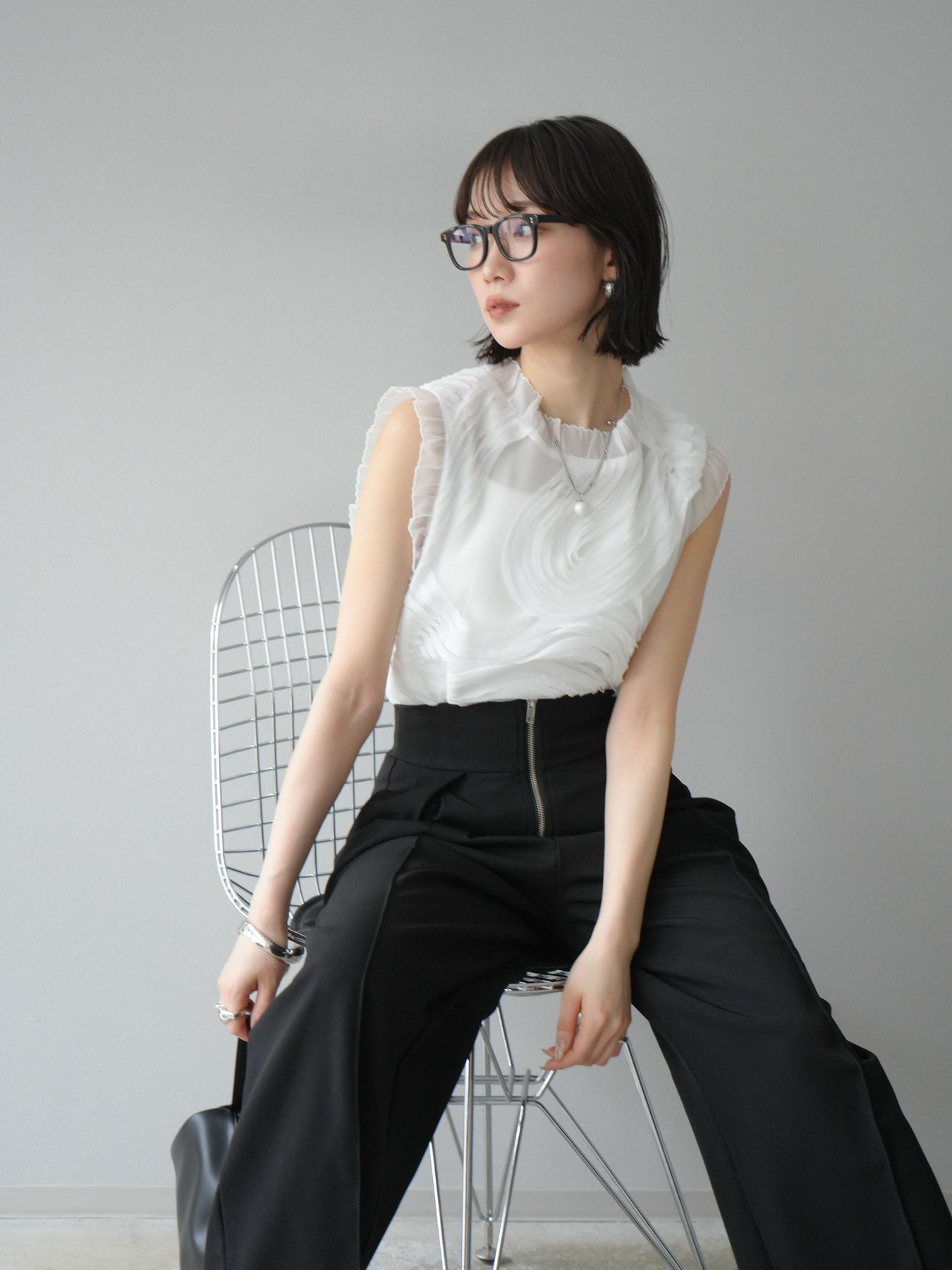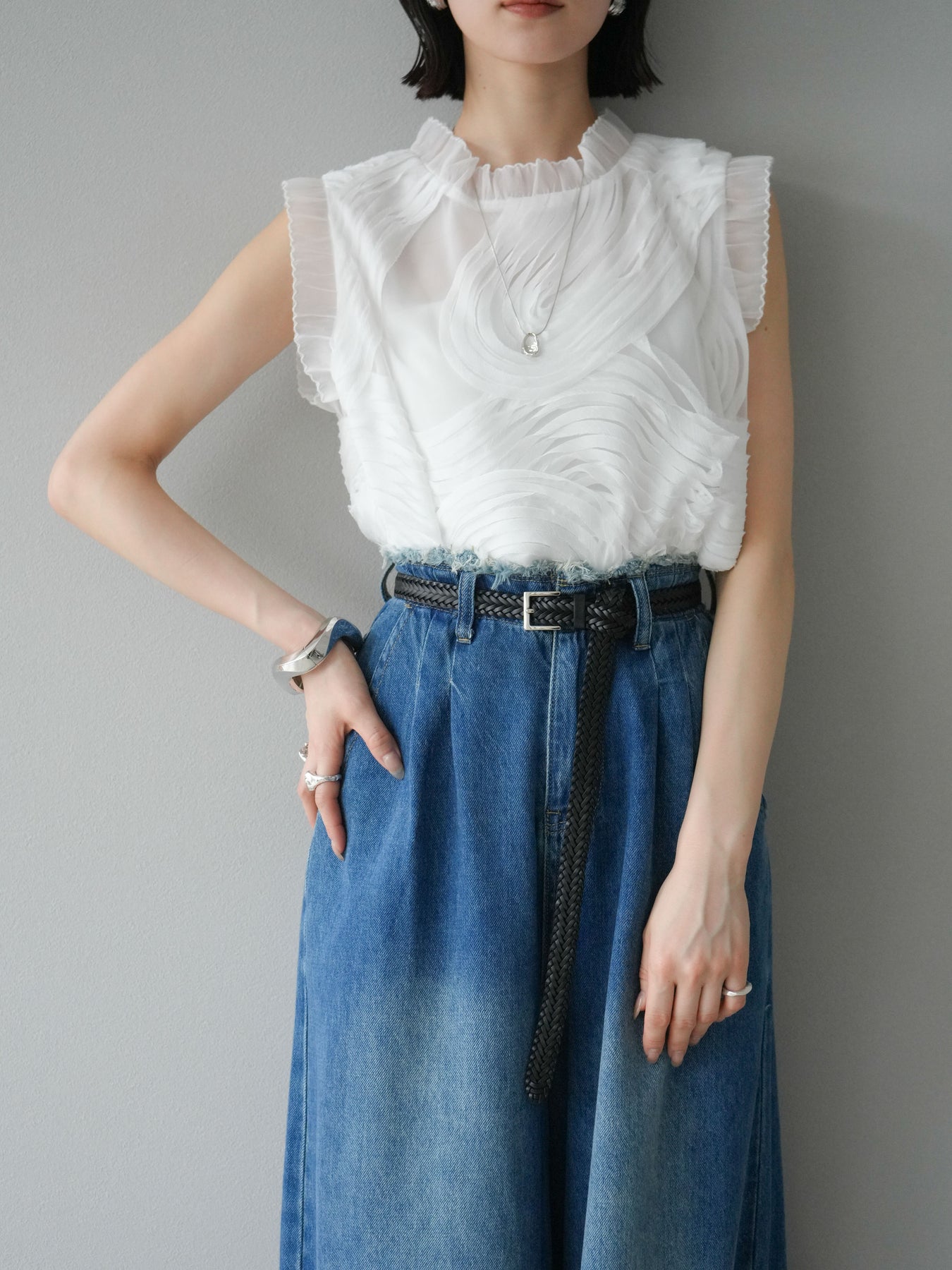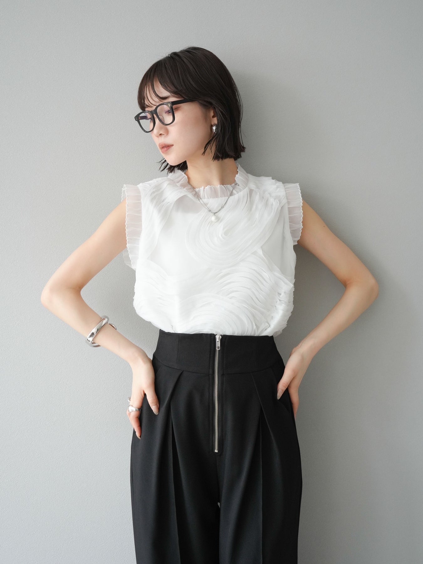這款無袖上衣採用薄紗製成,飾有獨特的立體提花圖案。柔軟的薄紗襯托出您的女性氣質,並隨著您的移動而塑造優美的輪廓。褶邊和精緻的設計賦予它優雅迷人的氣質,非常適合出席特殊場合。這件單品簡約迷人。 ※除下裝、吊帶背心(內衣)以外的商品均為標準品,不含內衣。