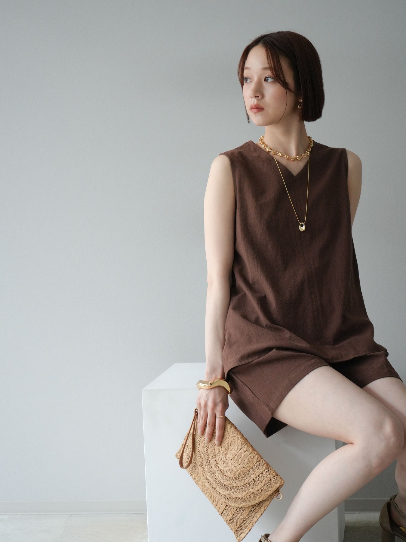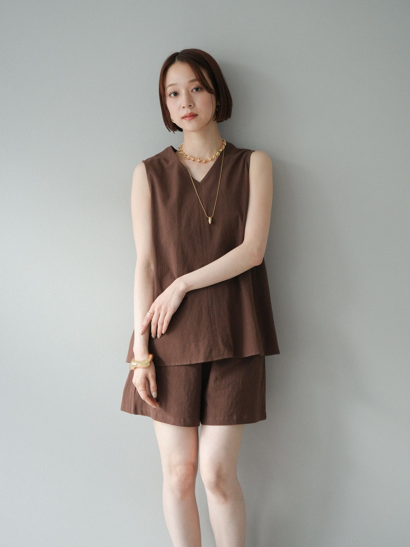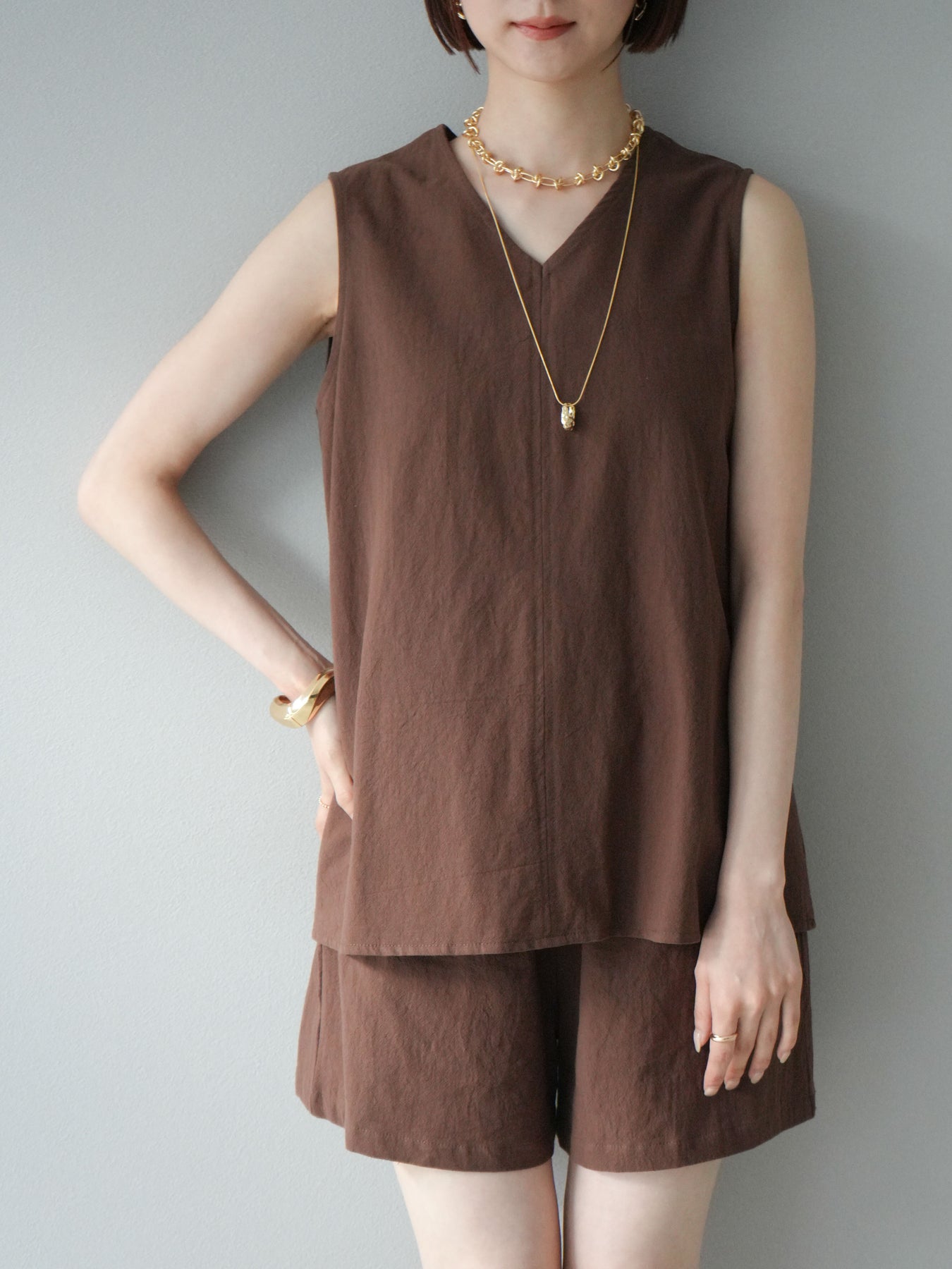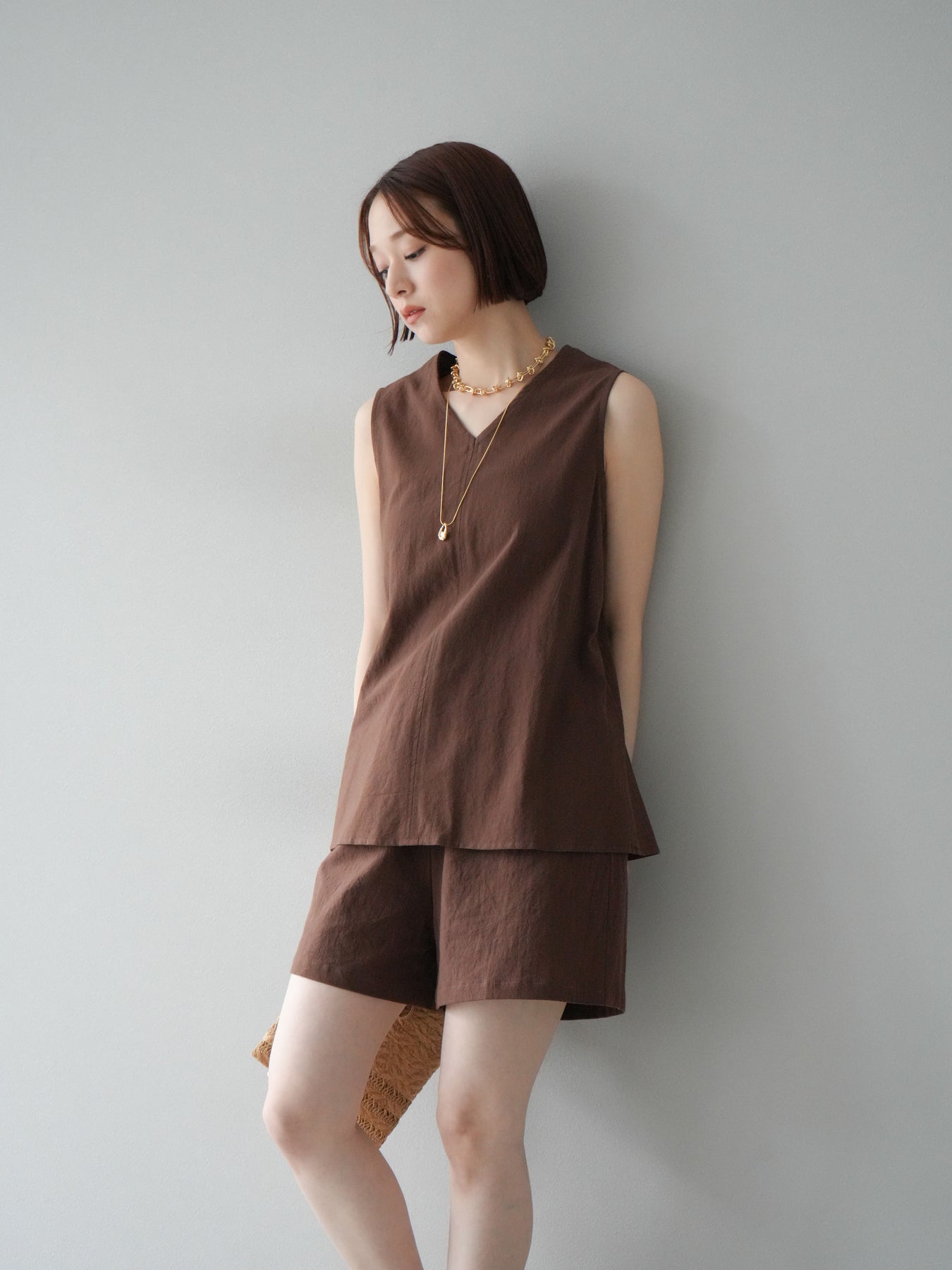 亞麻質地的襯衫和短褲的套裝,散發著夏日的輕盈氣息。襯衫雖然簡潔,但V領的設計讓臉型看起來乾淨俐落,寬鬆的輪廓也讓穿著舒適。短褲採用鬆緊帶設計,方便穿脫,長度也恰到好處,與上衣相得益彰。這件單品既可以當作套裝使用,也可以當作日常單品搭配。 ※除下裝、吊帶背心(內衣)以外的商品均不含內衣。