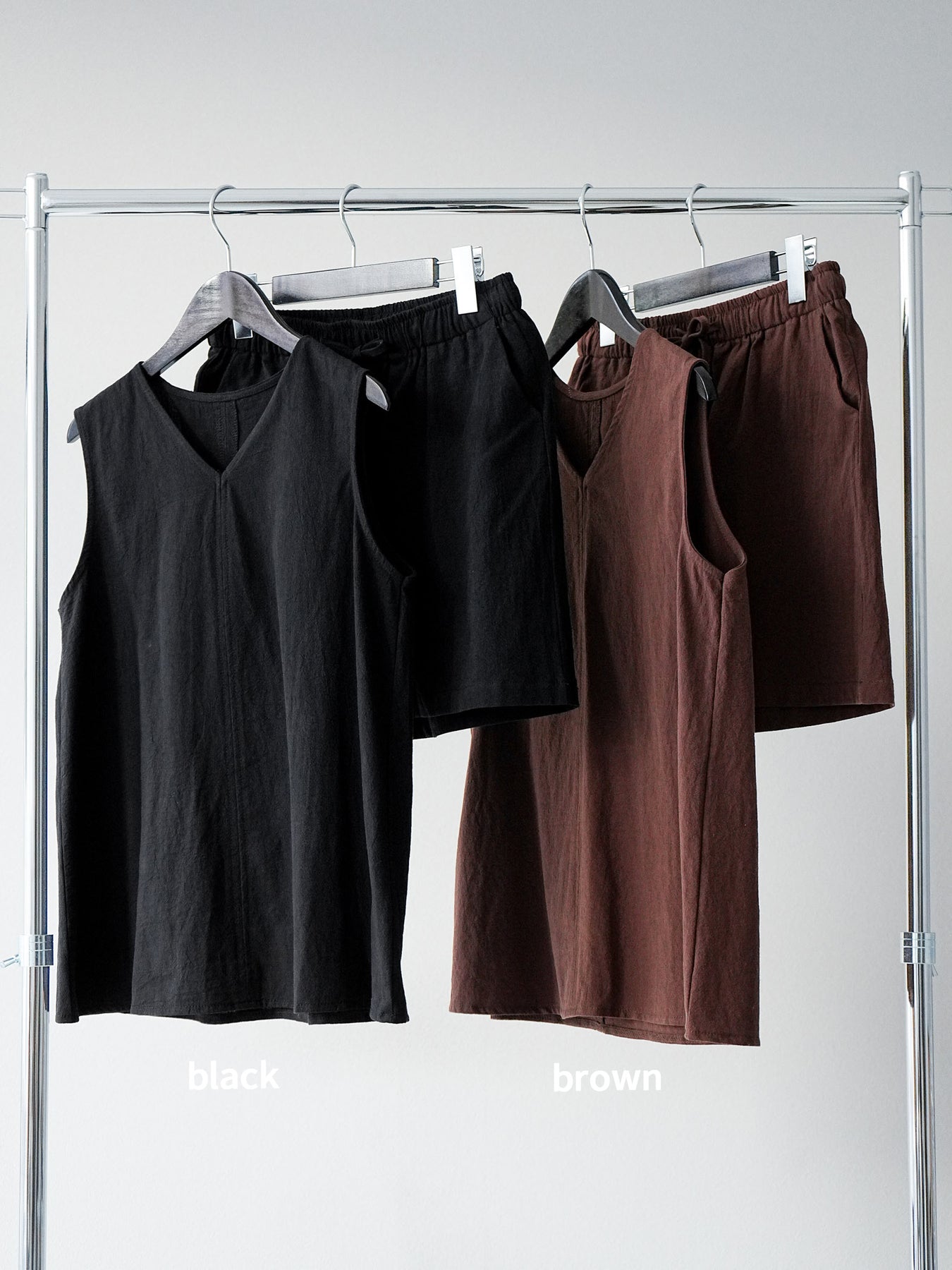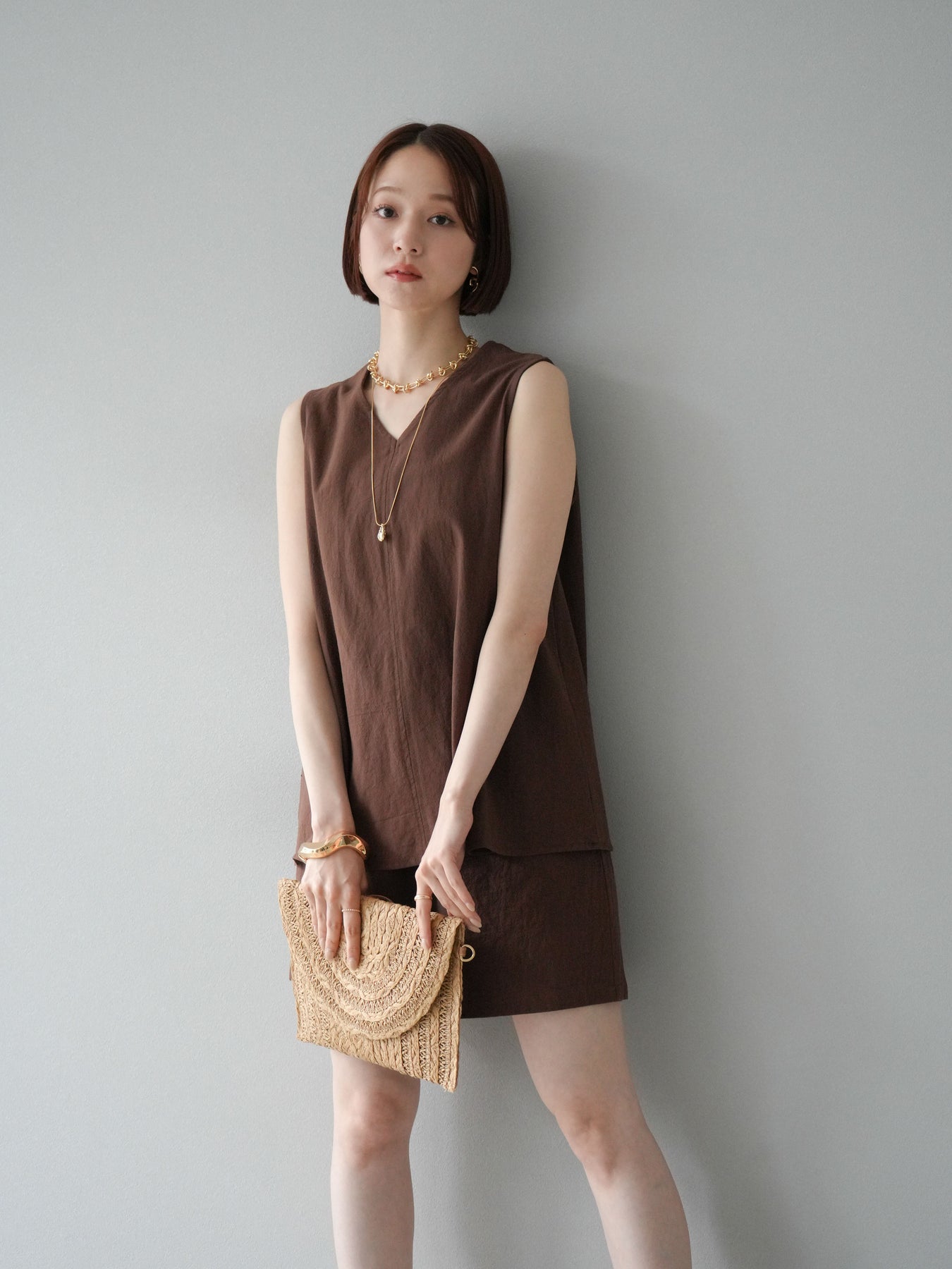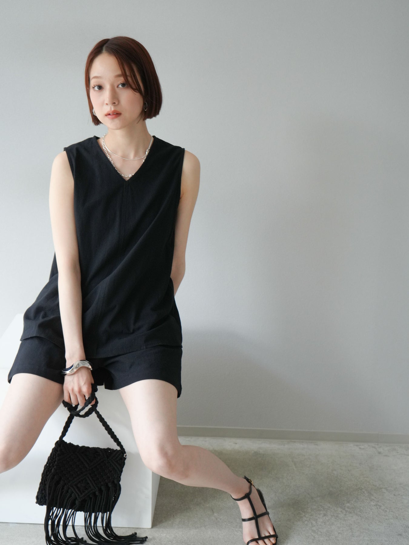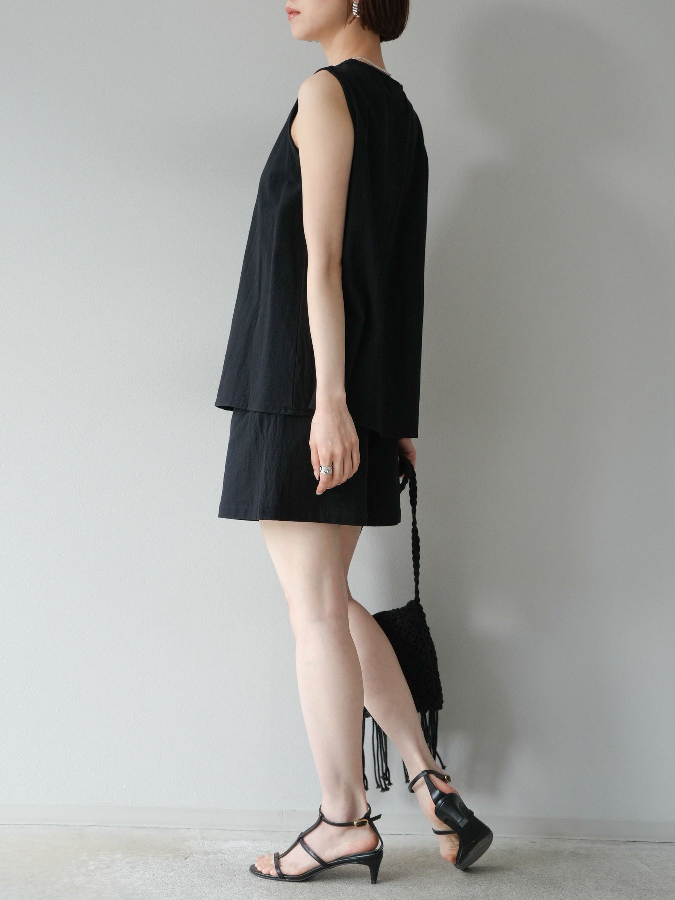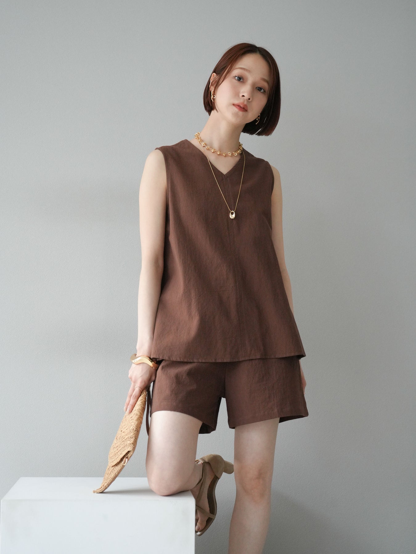 亞麻質地的襯衫和短褲的套裝,散發著夏日的輕盈氣息。襯衫雖然簡潔,但V領的設計讓臉型看起來乾淨俐落,寬鬆的輪廓也讓穿著舒適。短褲採用鬆緊帶設計,方便穿脫,長度也恰到好處,與上衣相得益彰。這件單品既可以當作套裝使用,也可以當作日常單品搭配。 ※除下裝、吊帶背心(內衣)以外的商品均不含內衣。