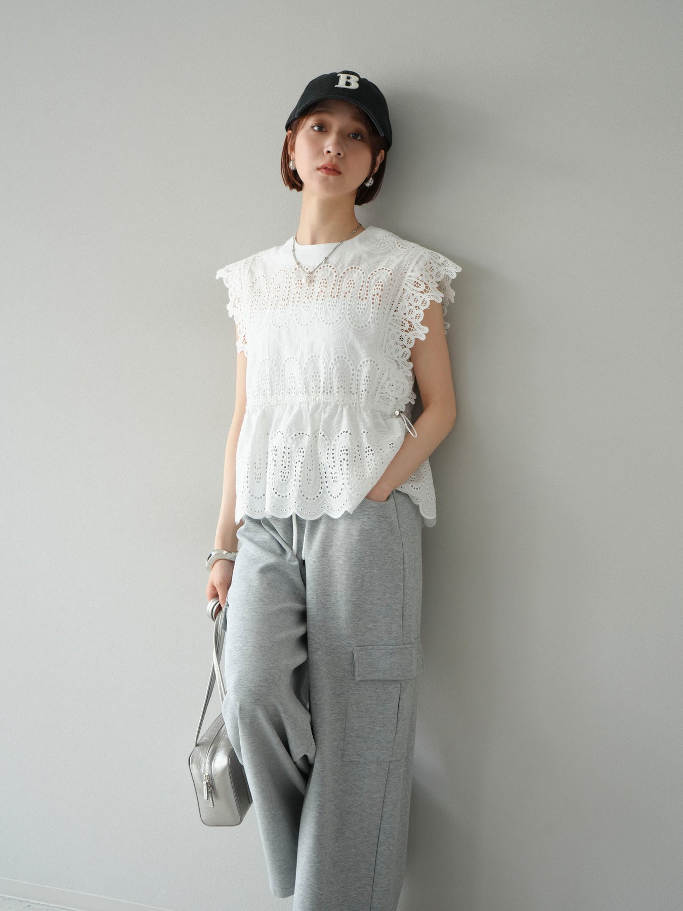 刺繡蕾絲襯衫,華麗的扇貝圖案令人眼前一亮。側邊的立體蕾絲和蝴蝶結細節,展現女性優雅的氣質。搭配牛仔褲和寬褲的休閒搭配,或搭配裙子,展現女性魅力。這是一款存在感十足的單品,即使單獨穿著也能成為焦點。 *除下裝和吊帶背心(內衣)以外的所有商品均不包含內衣。