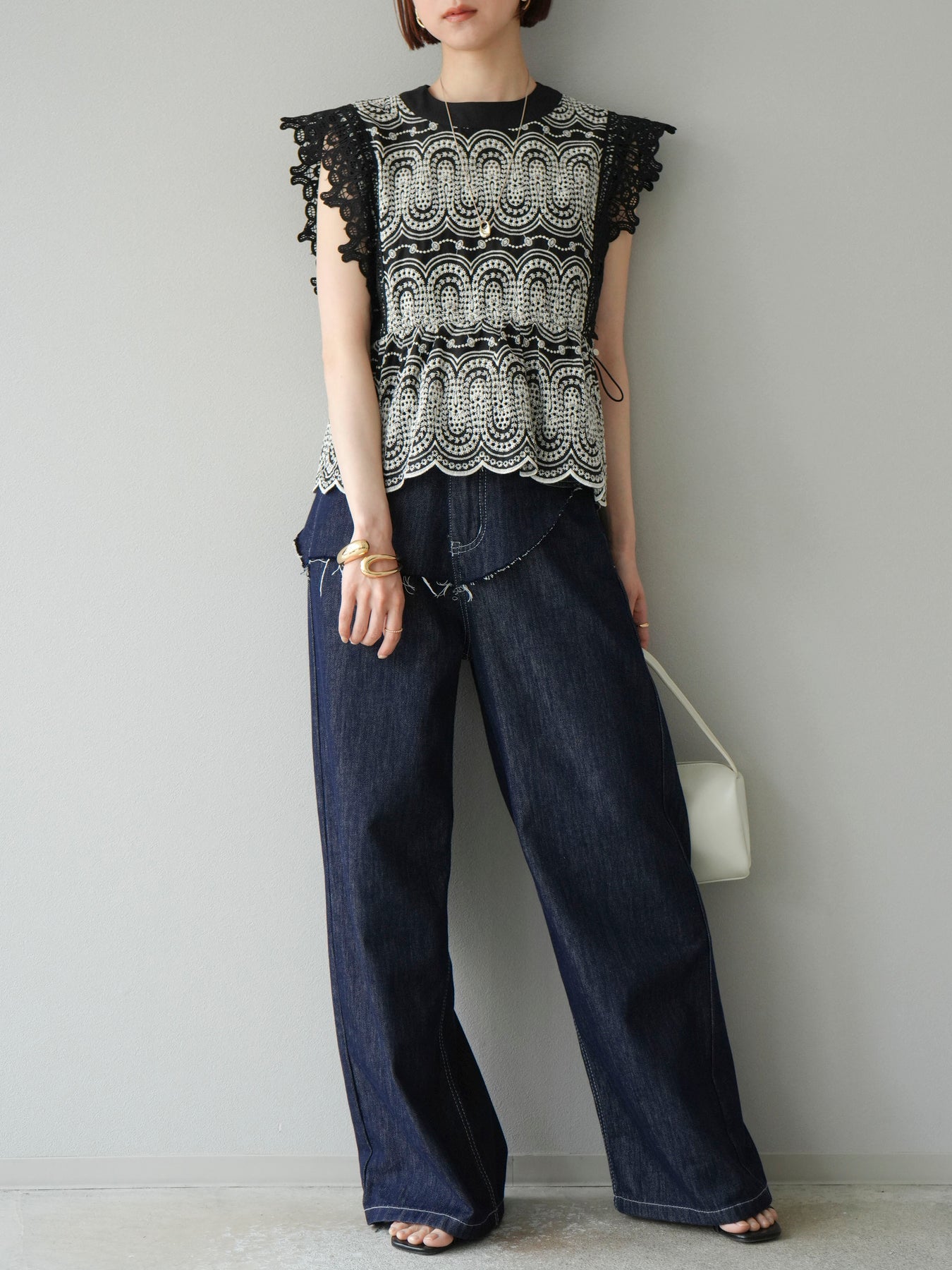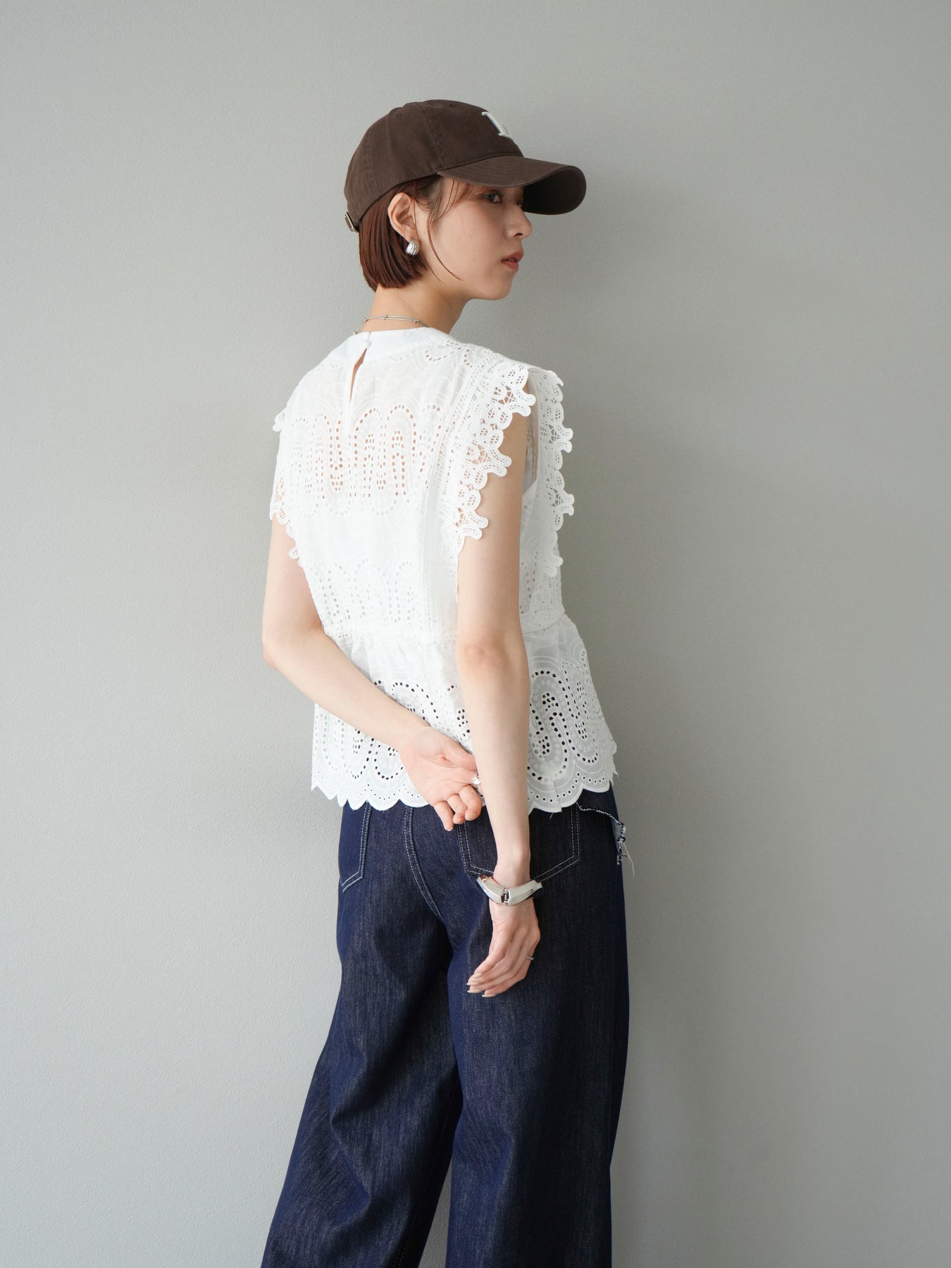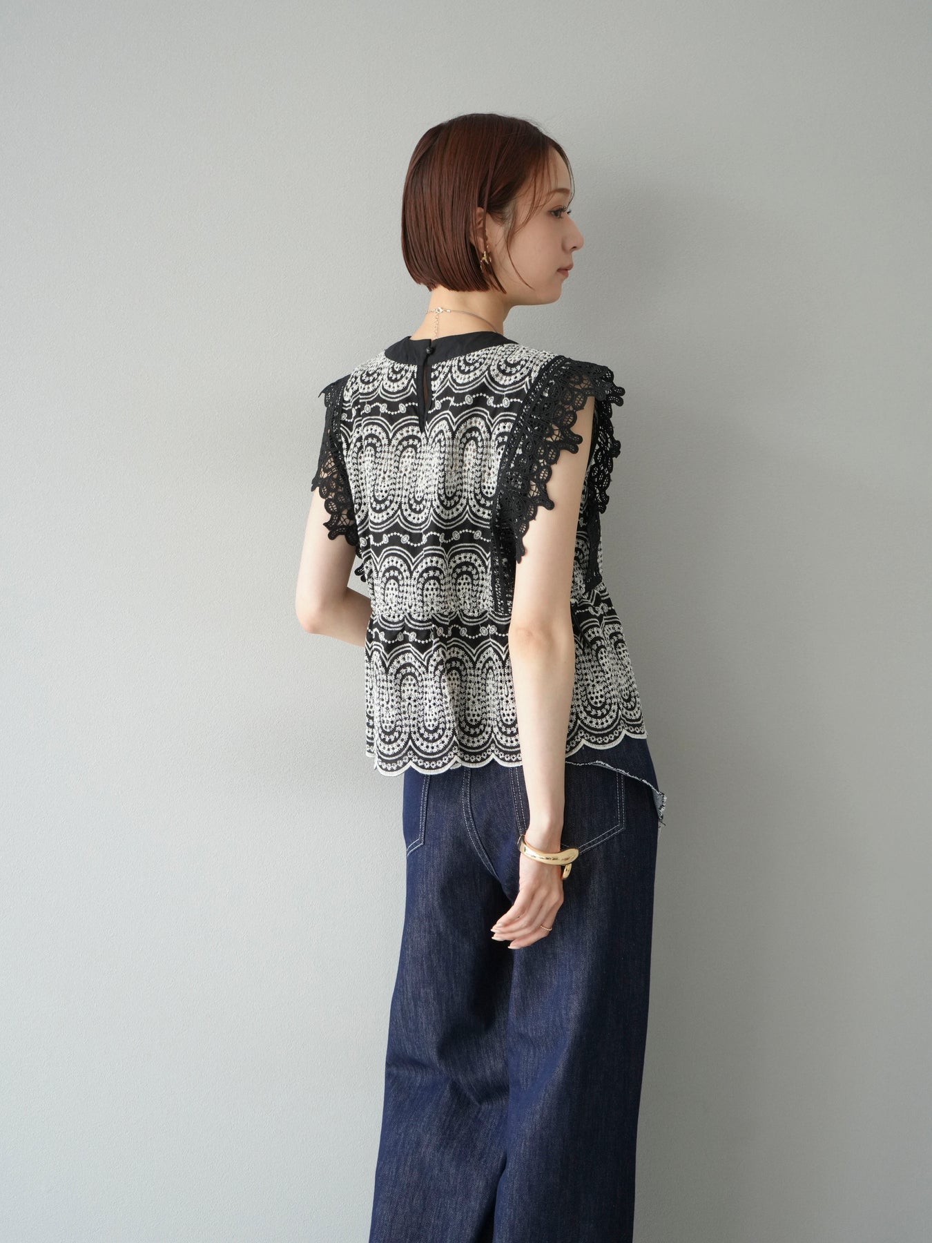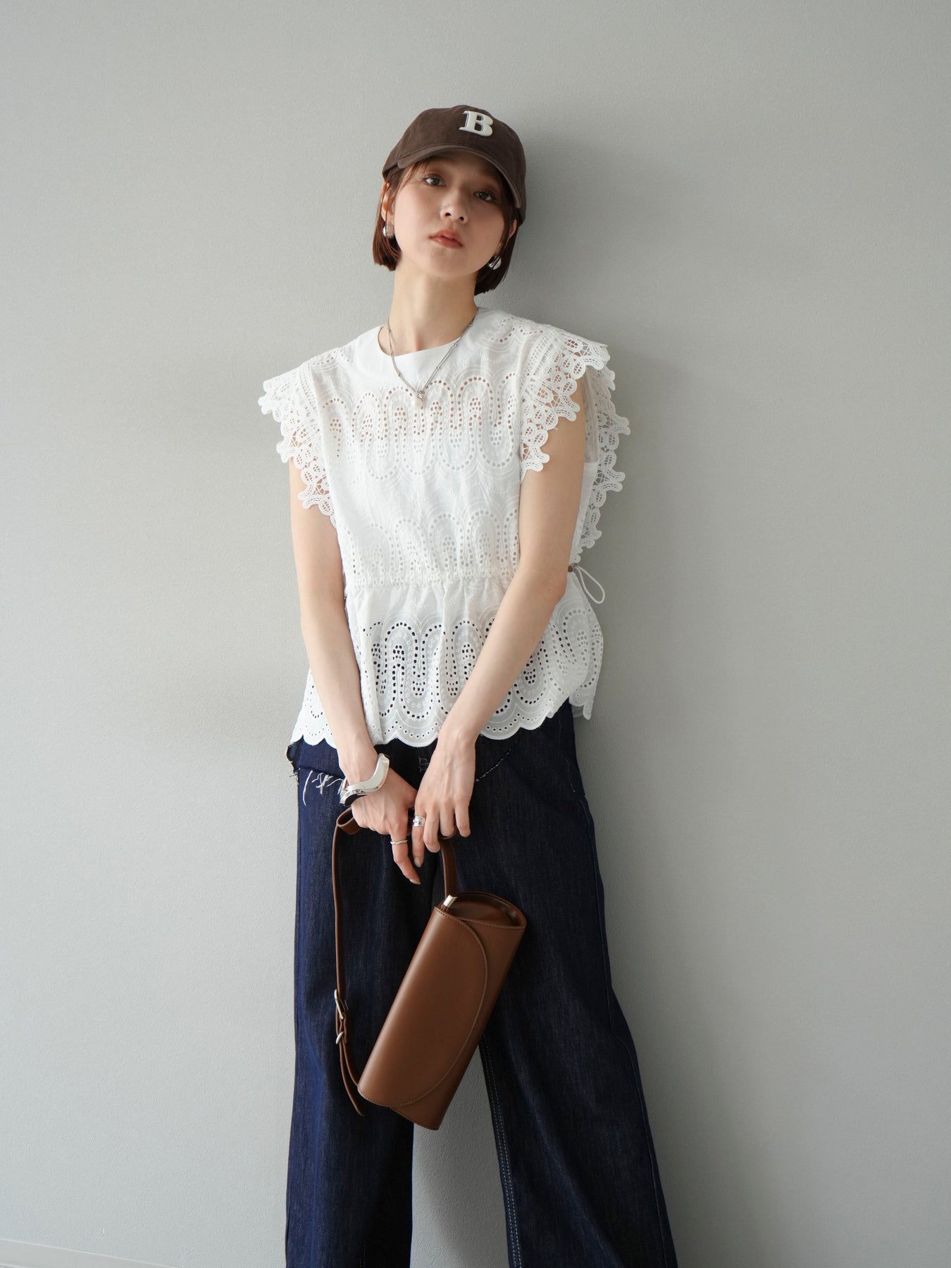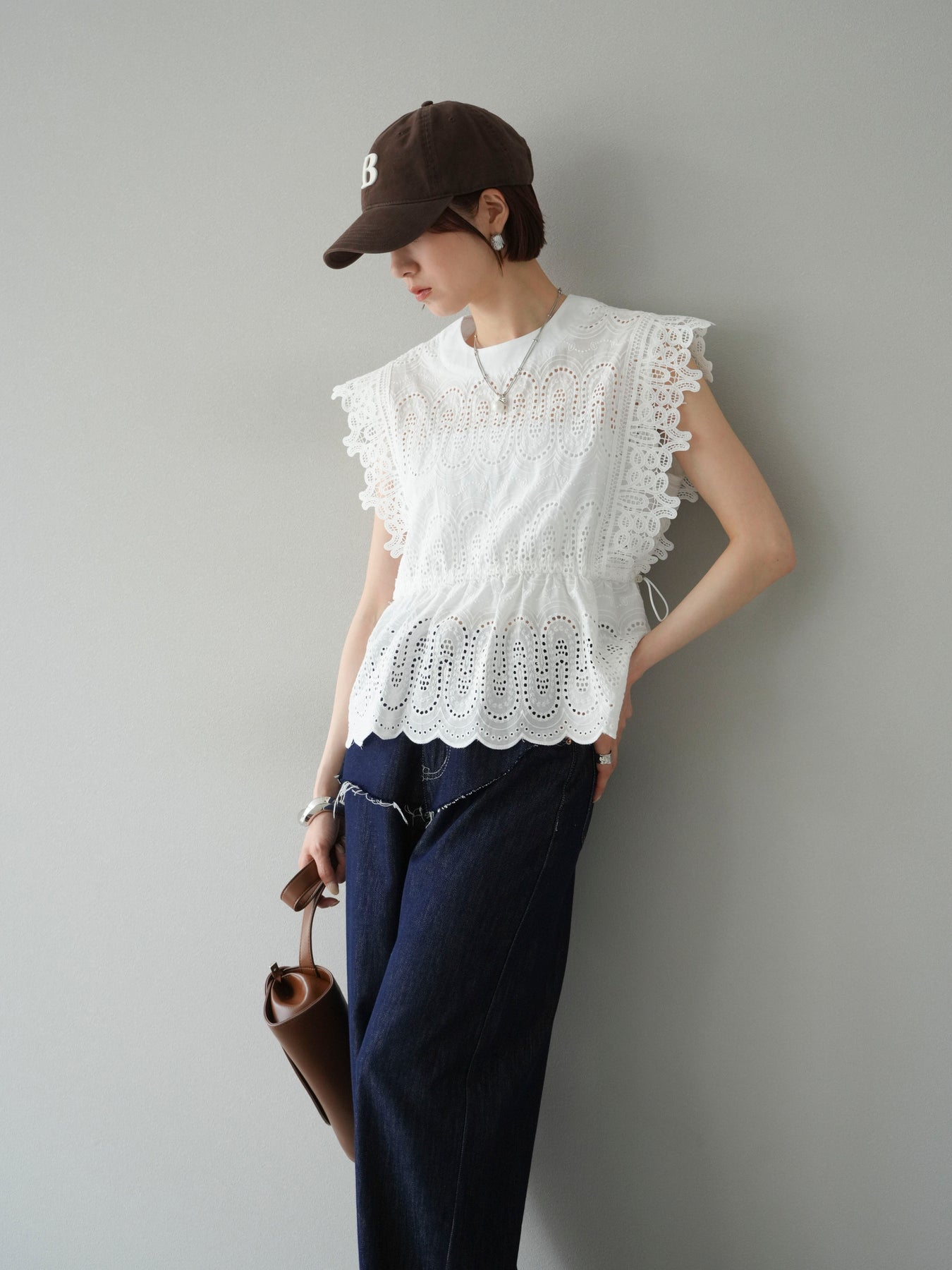 刺繡蕾絲襯衫,華麗的扇貝圖案令人眼前一亮。側邊的立體蕾絲和蝴蝶結細節,展現出女性優雅的氣質。它既可以搭配牛仔褲或寬褲,打造休閒的混搭造型,也可以搭配裙子,展現女性的柔美風格。這是一件極具存在感的單品,單品就能成為全場焦點。 ※除下裝、吊帶背心(內衣)以外的商品均不含內衣。