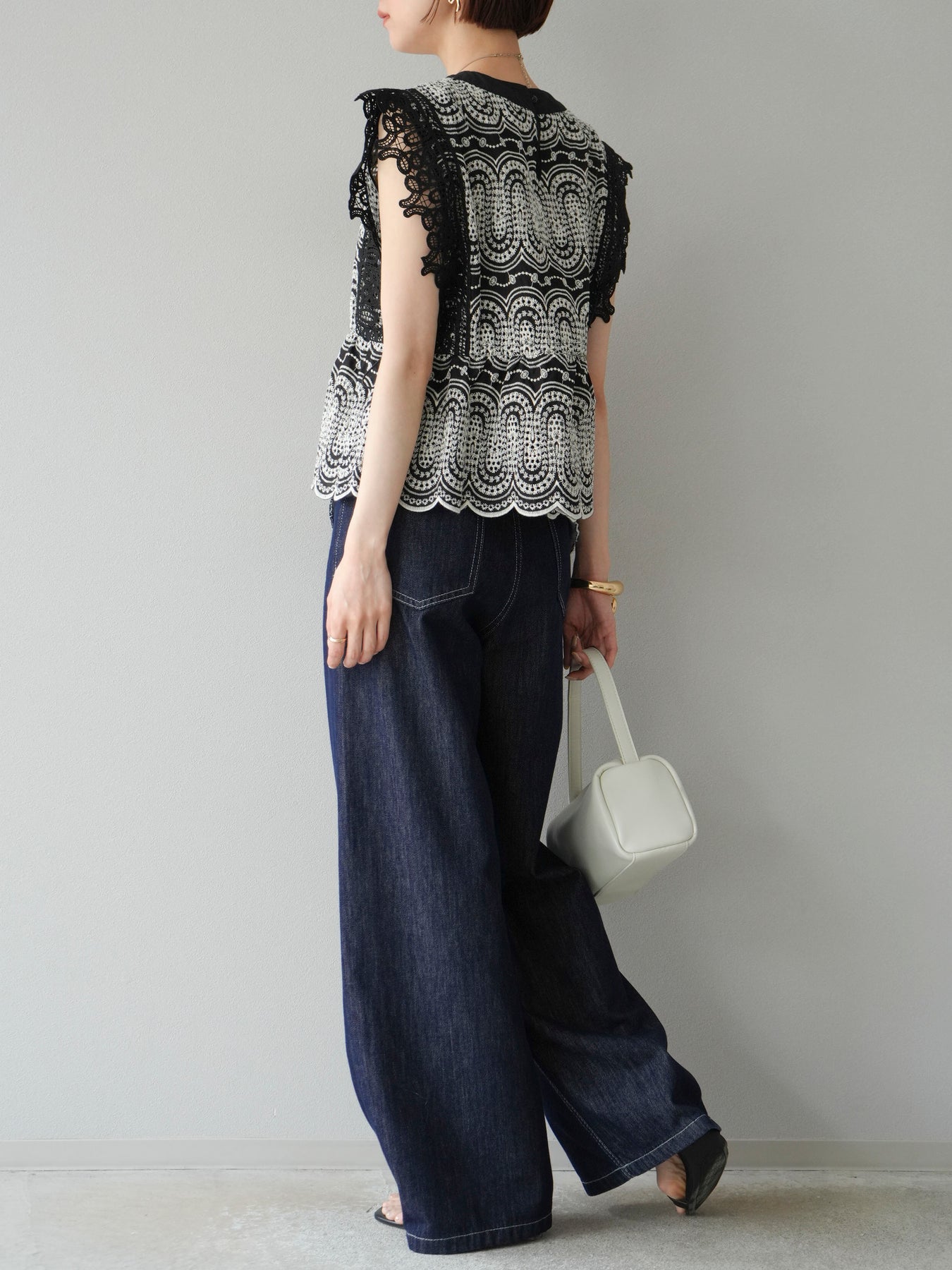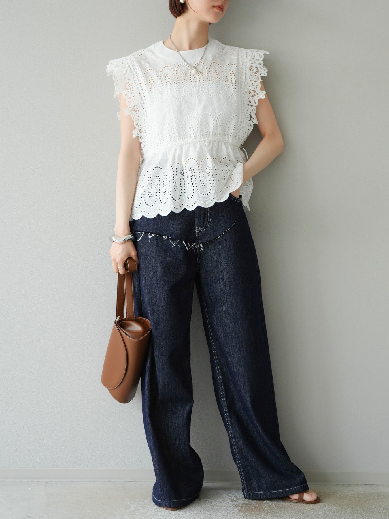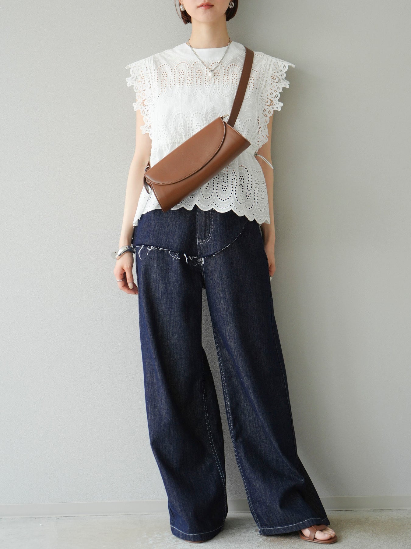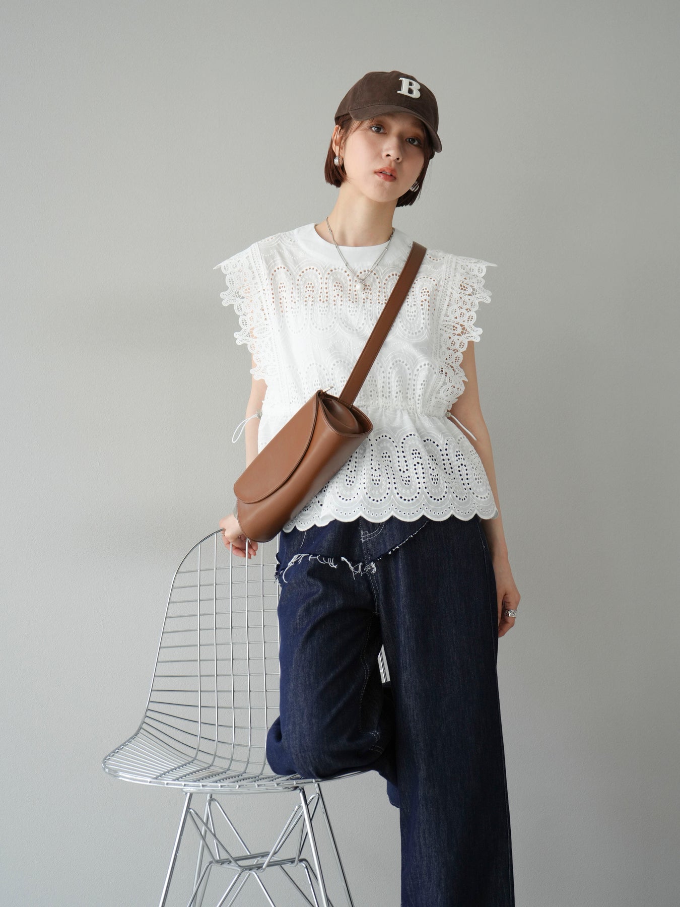 刺繡蕾絲襯衫,華麗的扇貝圖案令人眼前一亮。側邊的立體蕾絲和蝴蝶結細節,展現出女性優雅的氣質。它既可以搭配牛仔褲或寬褲,打造休閒的混搭造型,也可以搭配裙子,展現女性的柔美風格。這是一件極具存在感的單品,單品就能成為全場焦點。 ※除下裝、吊帶背心(內衣)以外的商品均不含內衣。