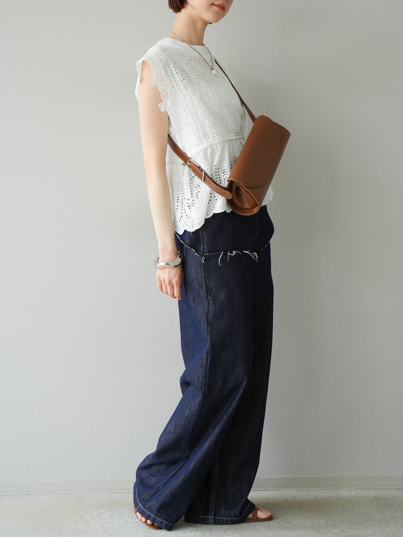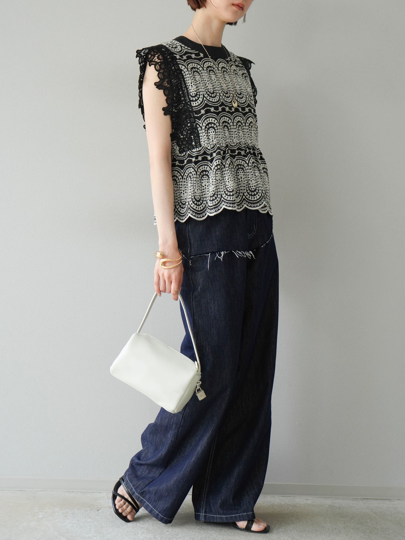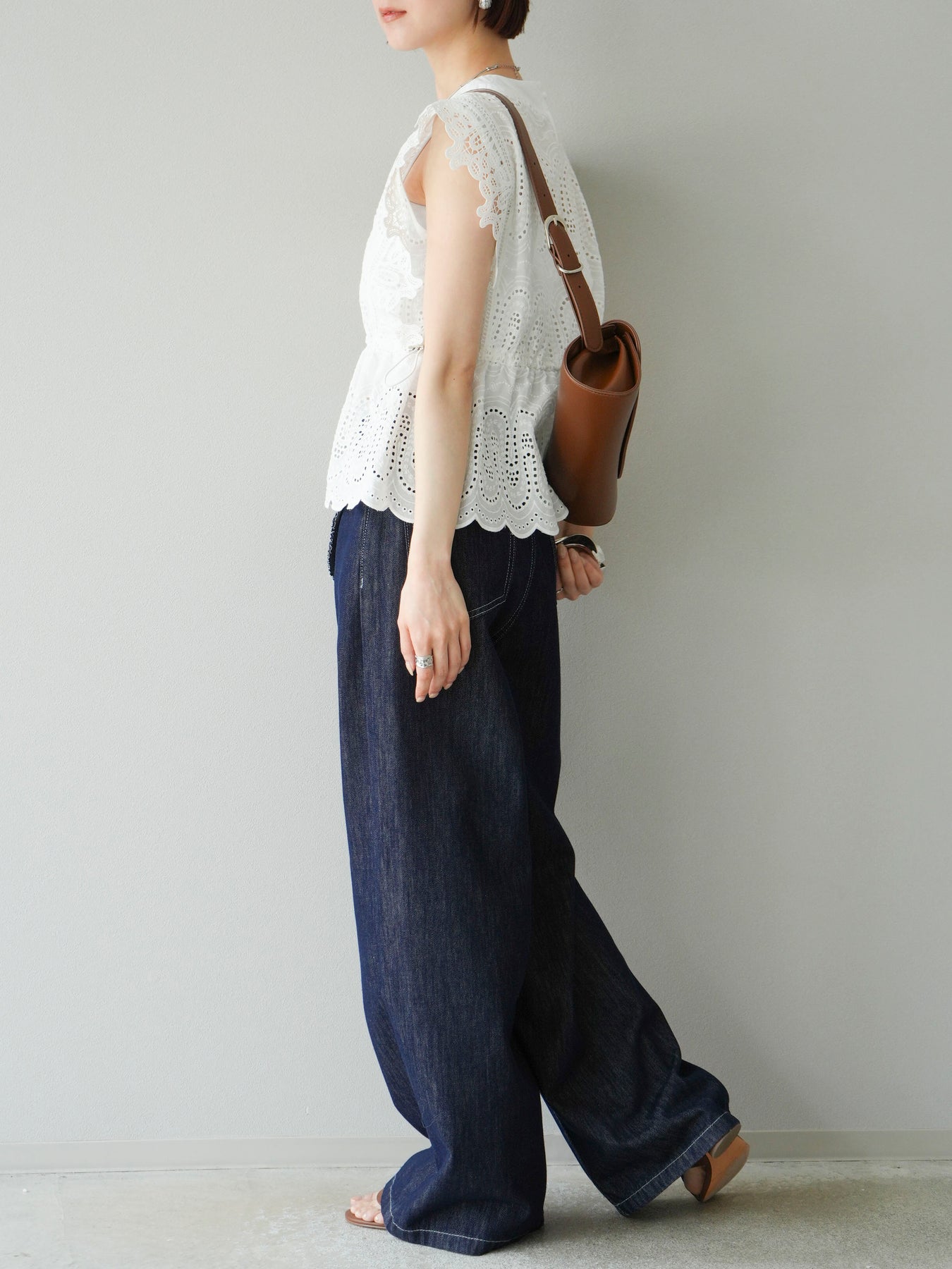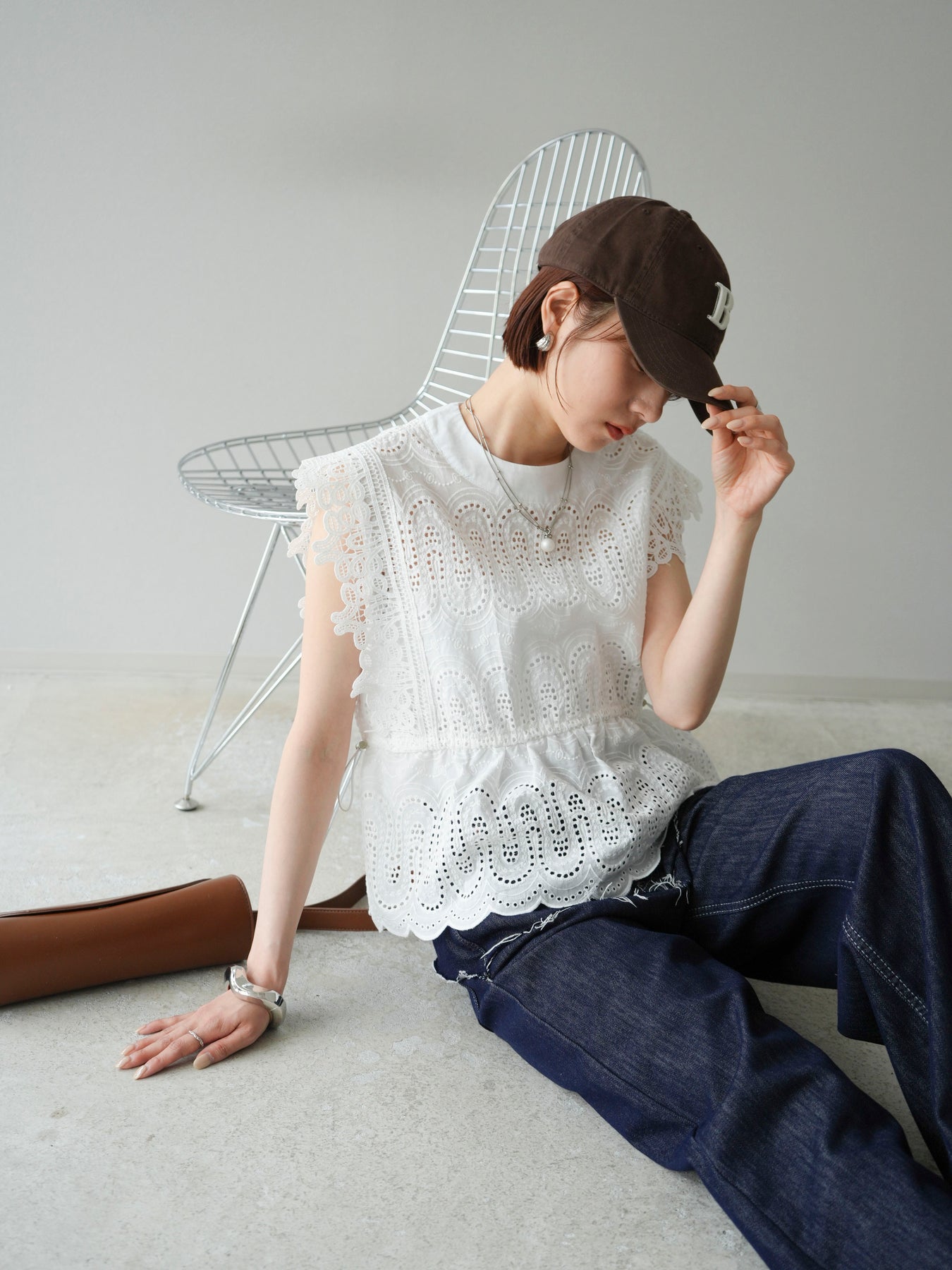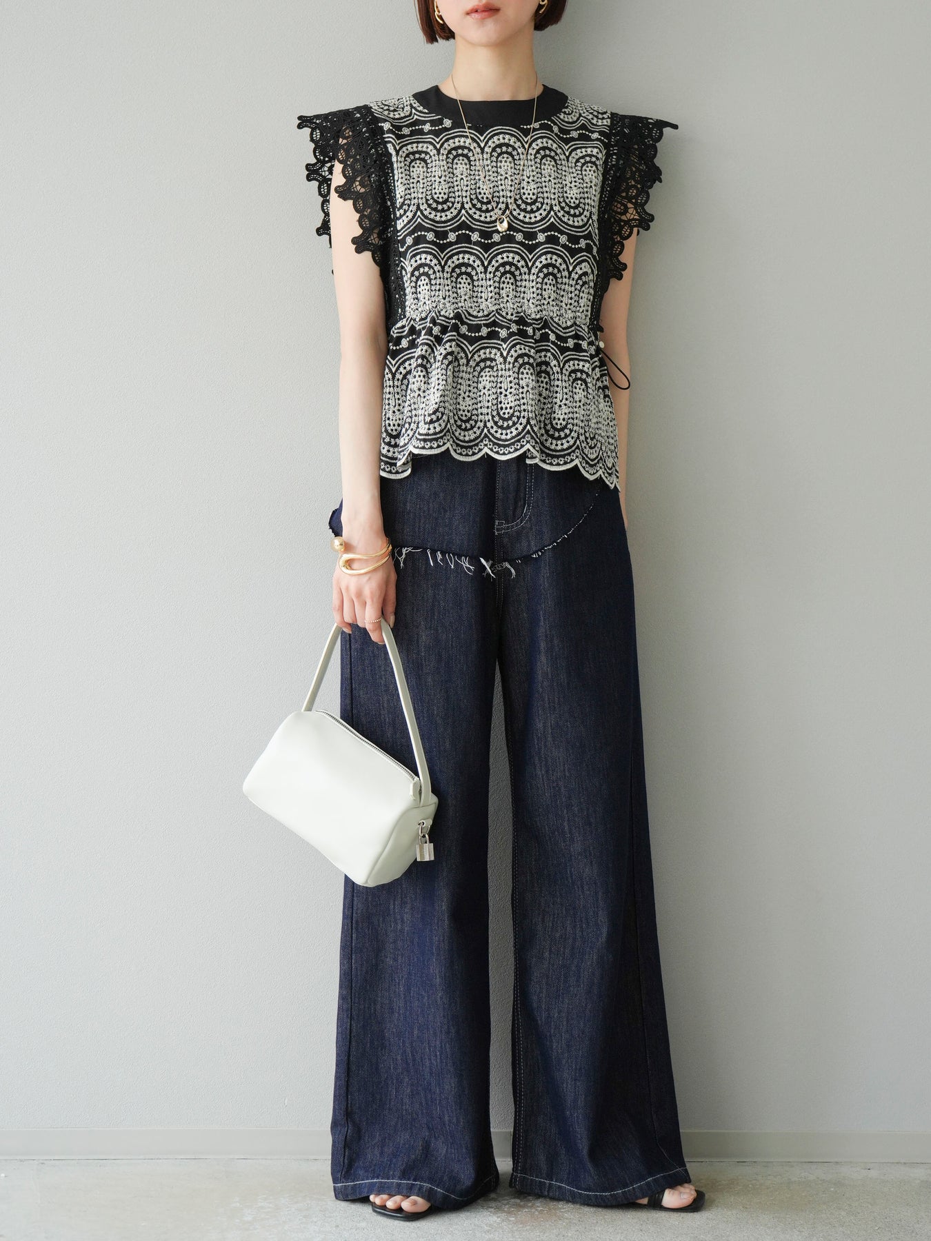 刺繡蕾絲襯衫,華麗的扇貝圖案令人眼前一亮。側邊的立體蕾絲和蝴蝶結細節,展現出女性優雅的氣質。它既可以搭配牛仔褲或寬褲,打造休閒的混搭造型,也可以搭配裙子,展現女性的柔美風格。這是一件極具存在感的單品,單品就能成為全場焦點。 ※除下裝、吊帶背心(內衣)以外的商品均不含內衣。