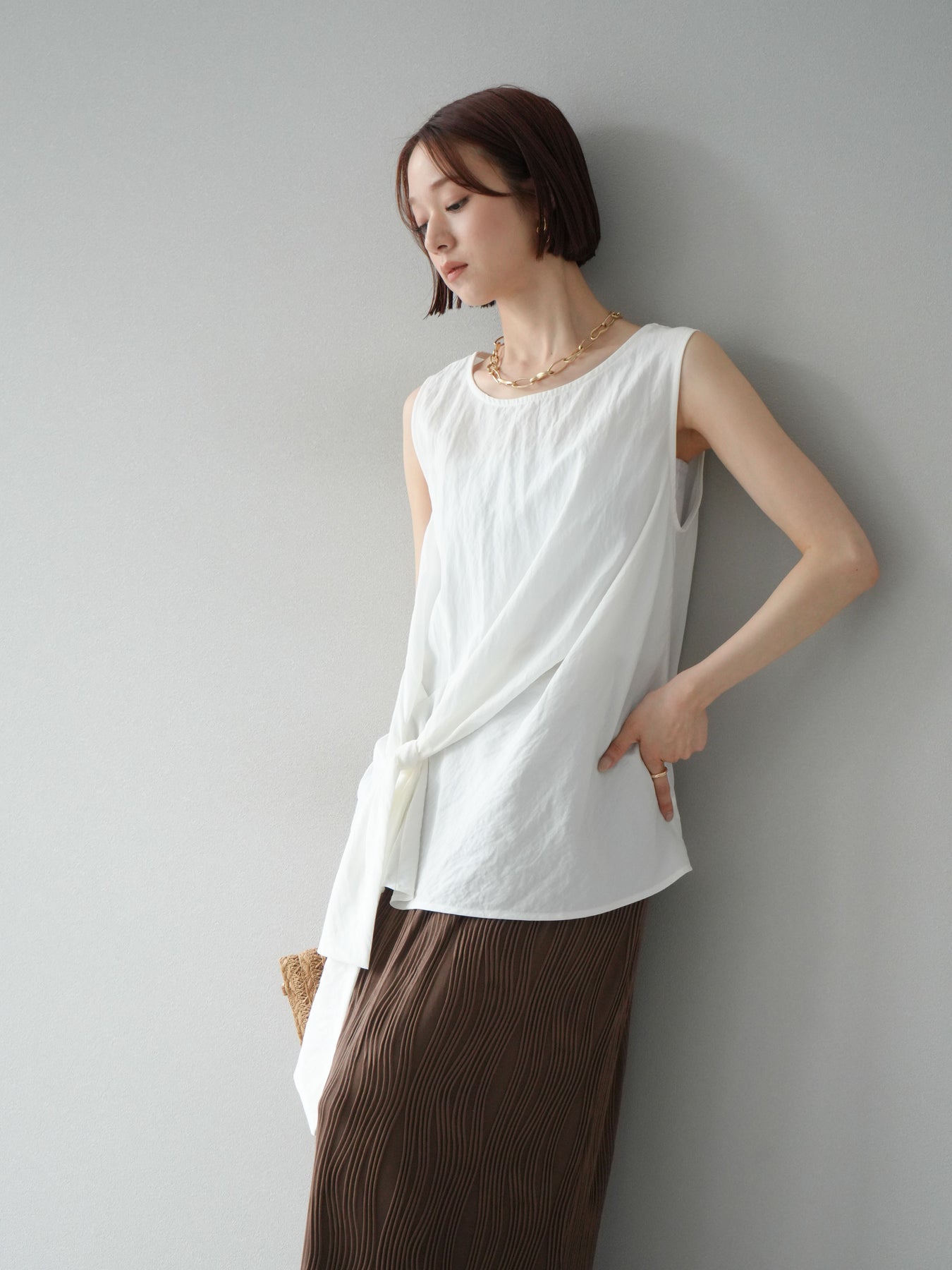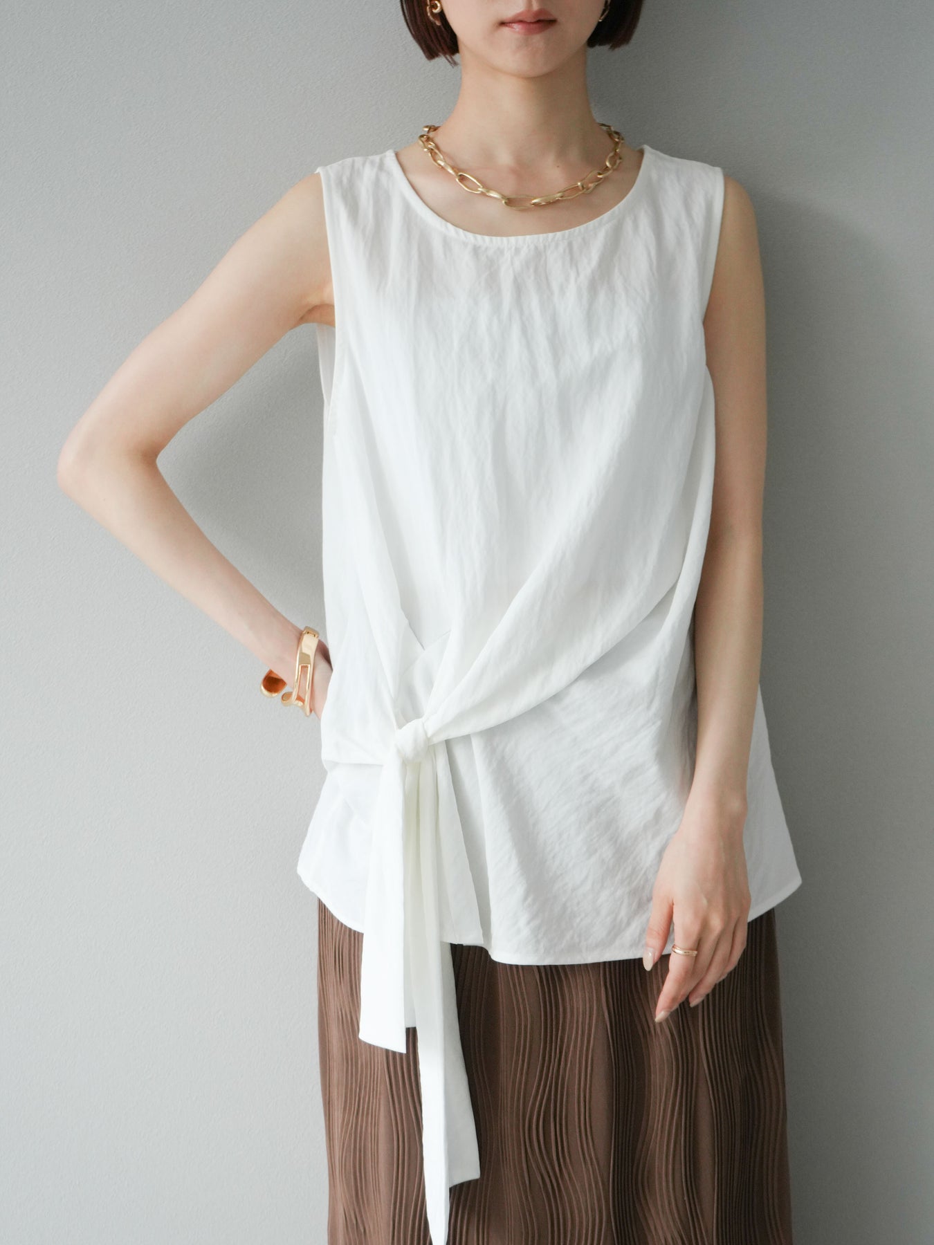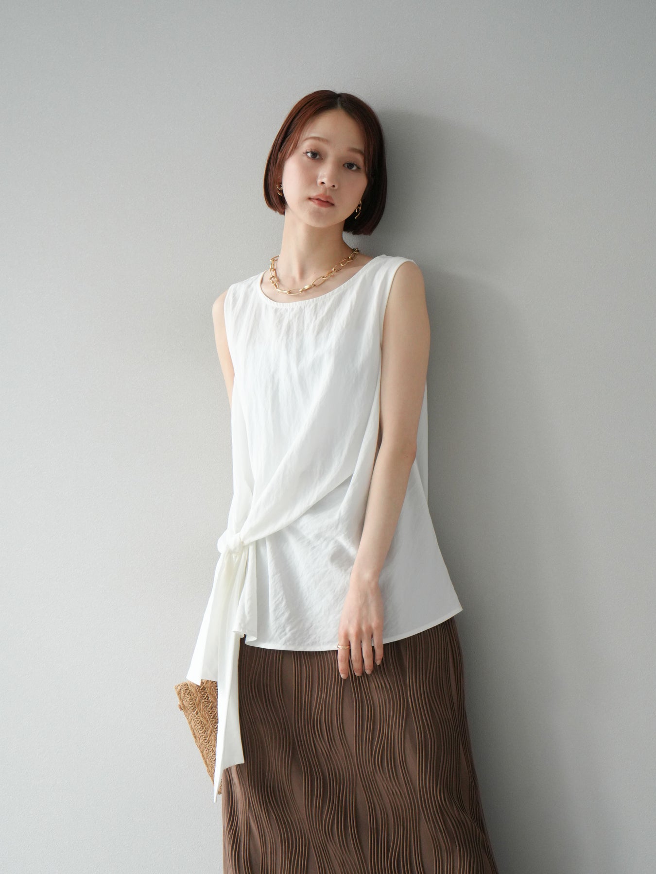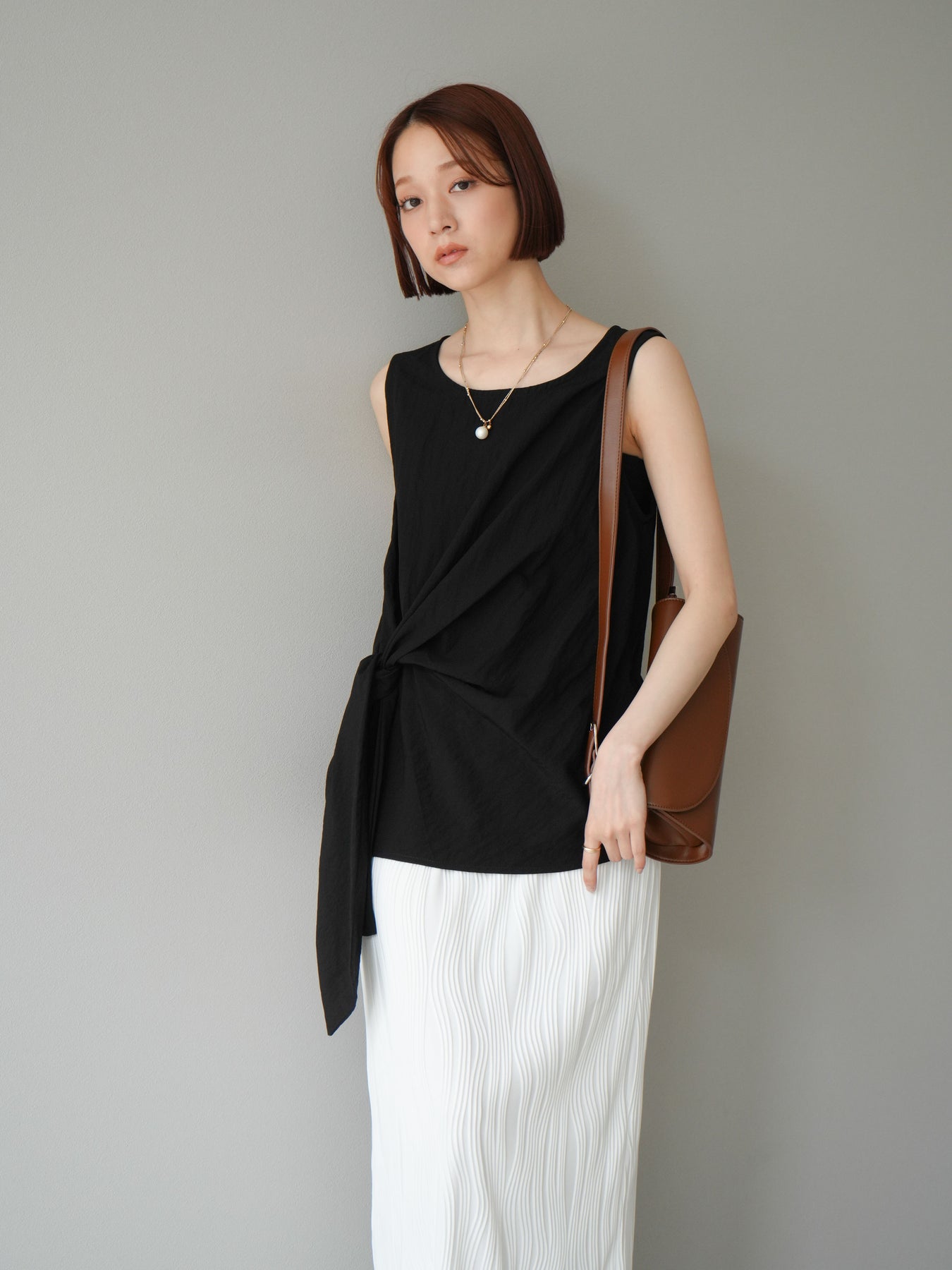 簡約卻不失扭紋的無袖上衣,前襟採用裹身設計。前襟裹身設計格外醒目,自然收緊腰線,打造立體輪廓。輕盈布料觸感柔滑,穿著舒適。精緻的無袖上衣略微遮蓋肩部,兼具優雅與休閒的氣質。無論搭配寬鬆下裝或緊身下裝,都能輕鬆駕馭,是一款百搭單品。 ※除下裝、吊帶背心(內衣)以外的商品均不含內衣。