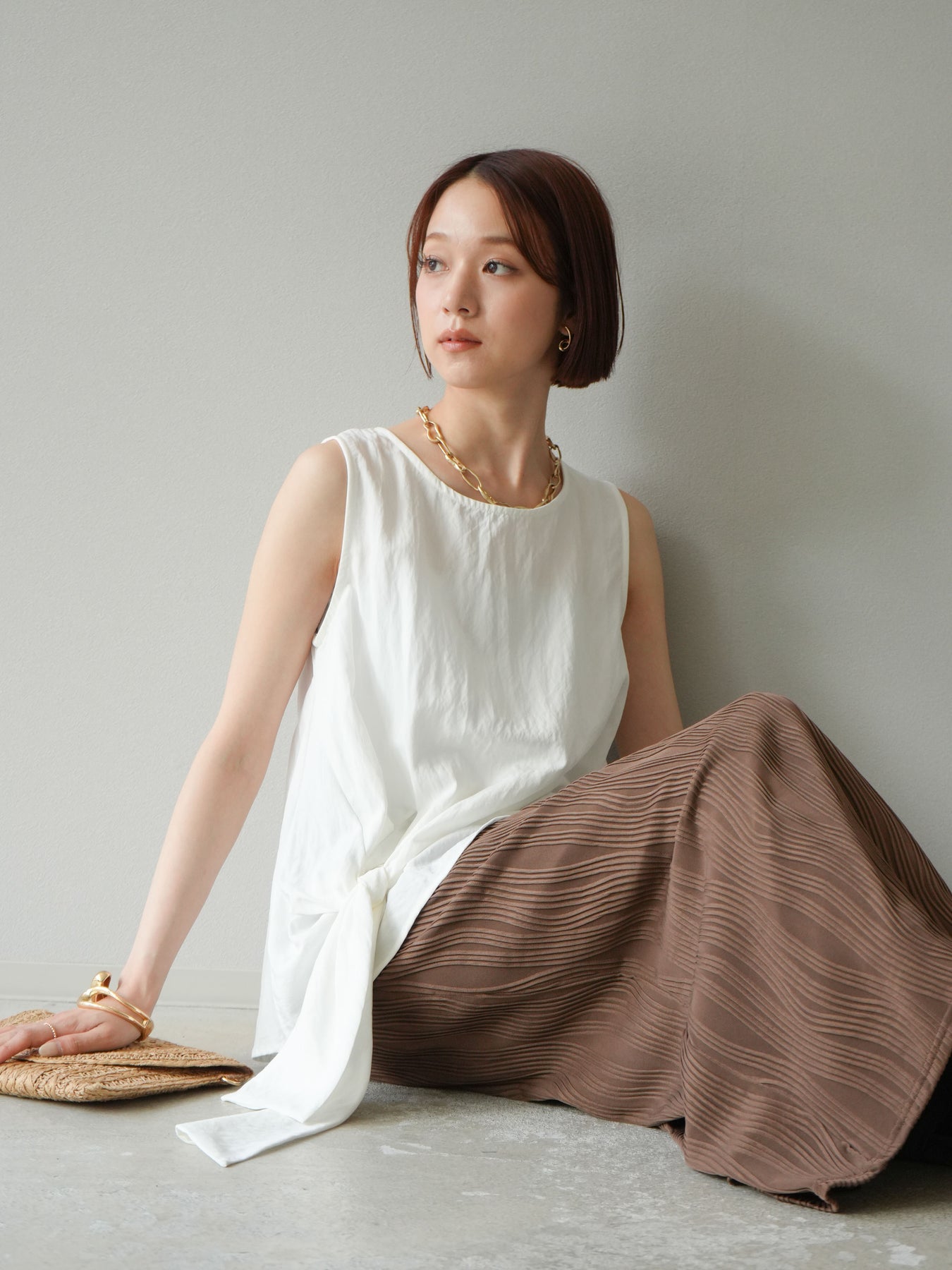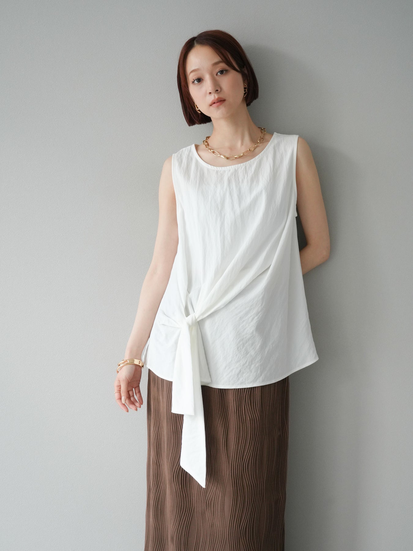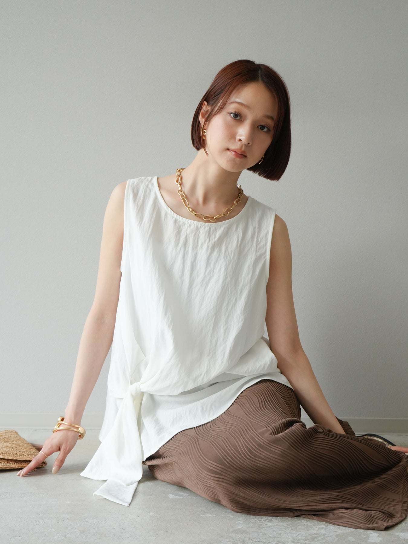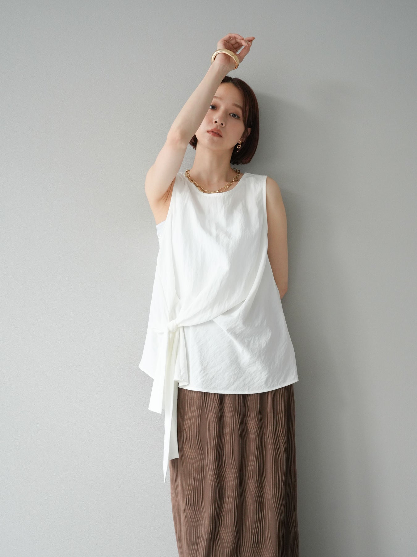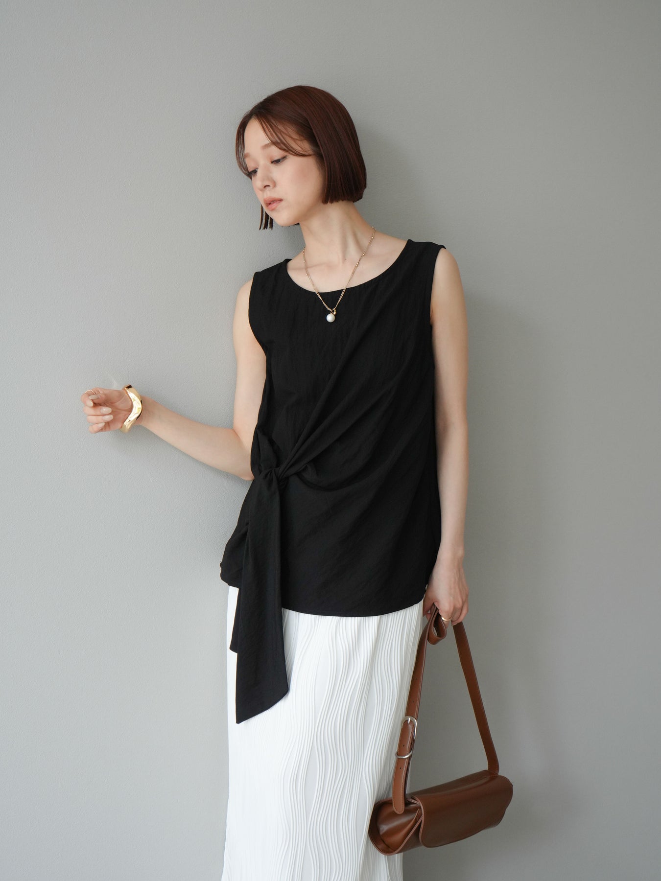 簡約卻不失扭紋的無袖上衣,前襟採用裹身設計。前襟裹身設計格外醒目,自然收緊腰線,打造立體輪廓。輕盈布料觸感柔滑,穿著舒適。精緻的無袖上衣略微遮蓋肩部,兼具優雅與休閒的氣質。無論搭配寬鬆下裝或緊身下裝,都能輕鬆駕馭,是一款百搭單品。 ※除下裝、吊帶背心(內衣)以外的商品均不含內衣。