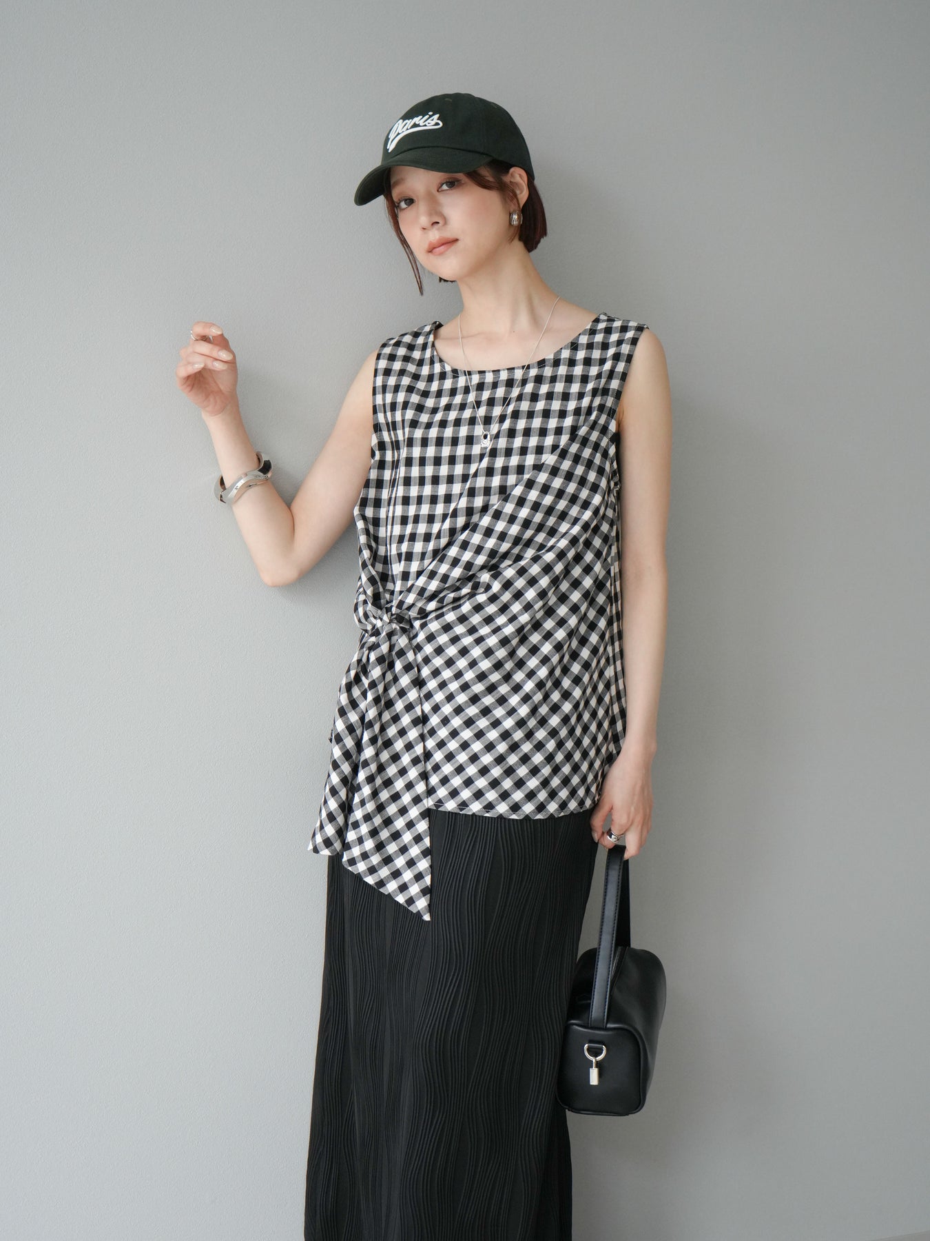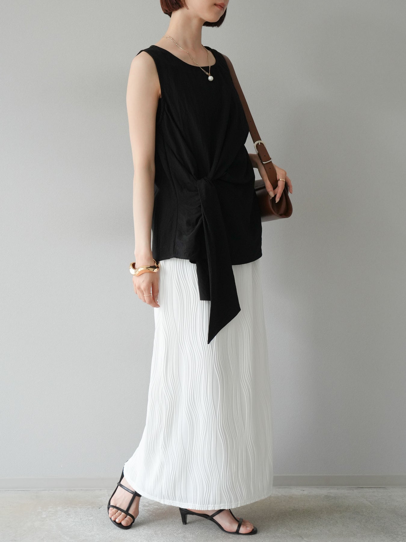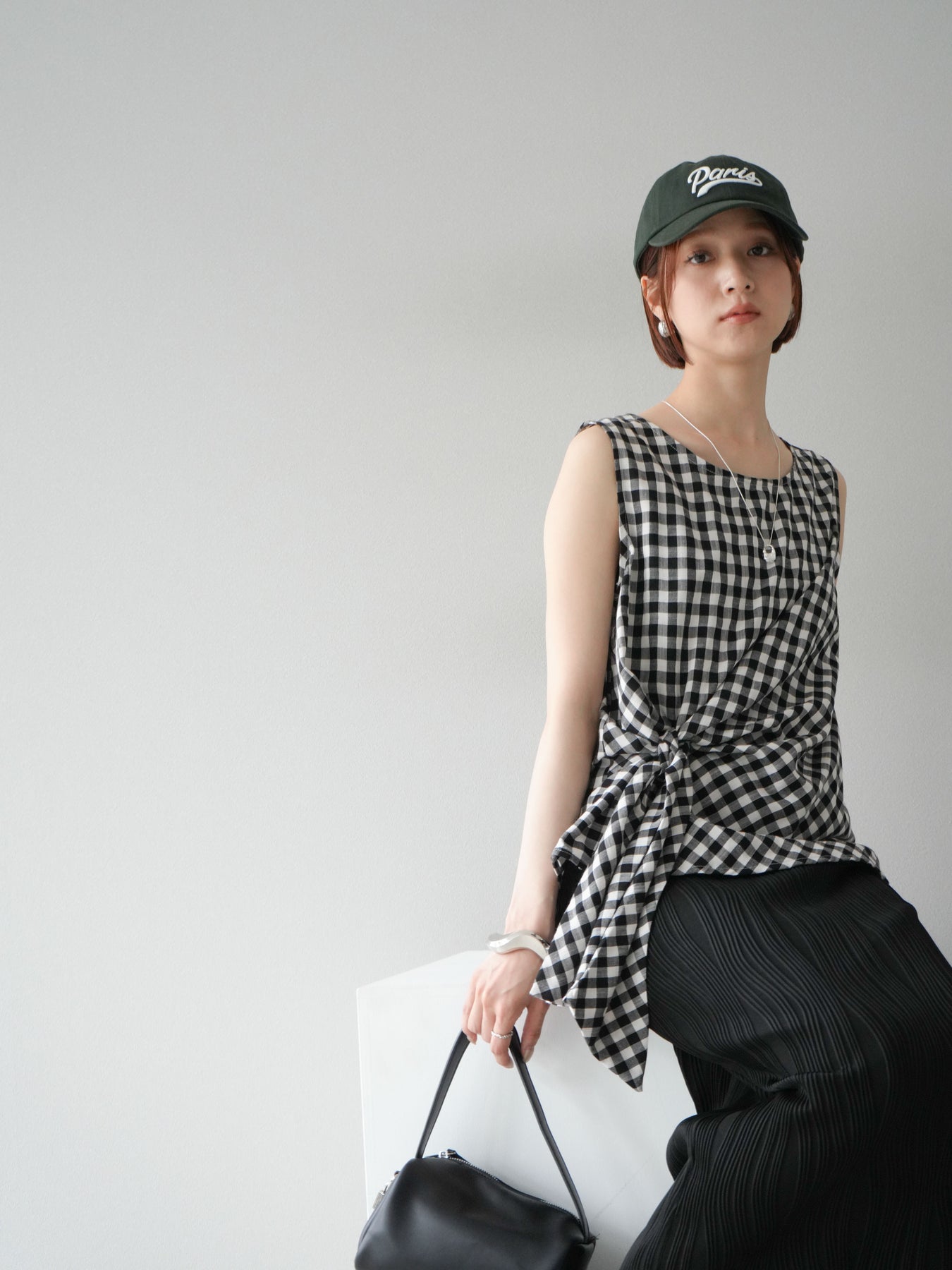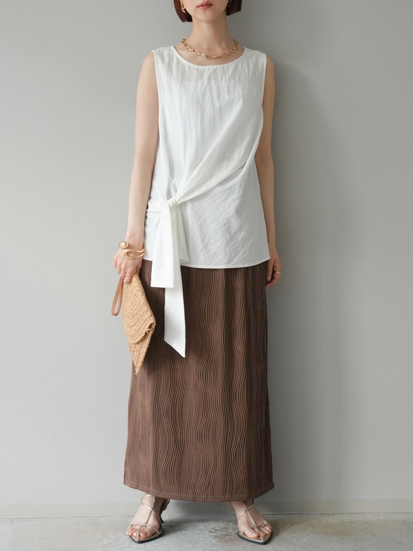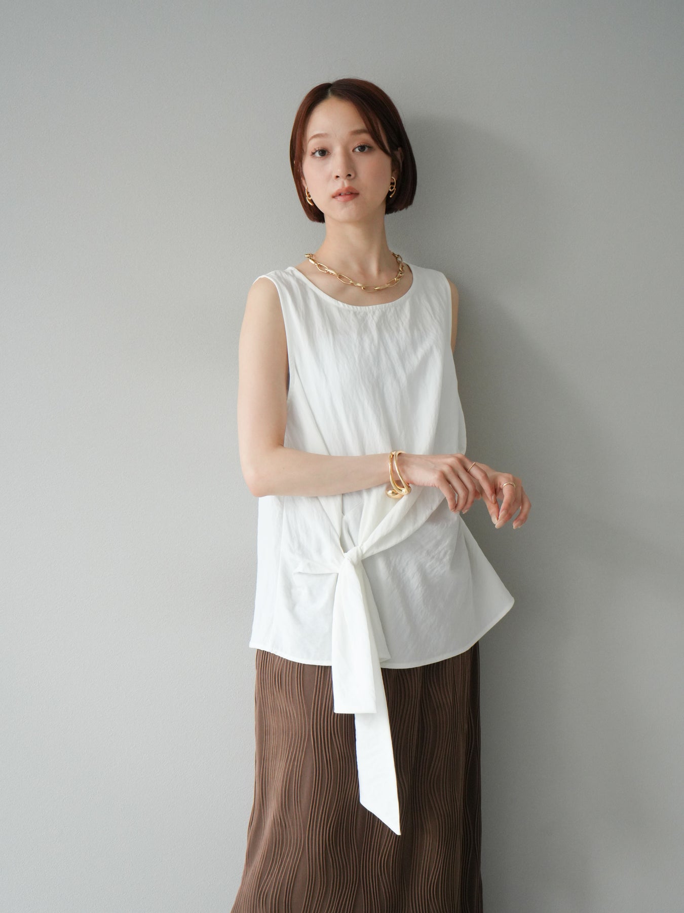 簡約卻不失扭紋的無袖上衣,前襟採用裹身設計。前襟裹身設計格外醒目,自然收緊腰線,打造立體輪廓。輕盈布料觸感柔滑,穿著舒適。精緻的無袖上衣略微遮蓋肩部,兼具優雅與休閒的氣質。無論搭配寬鬆下裝或緊身下裝,都能輕鬆駕馭,是一款百搭單品。 ※除下裝、吊帶背心(內衣)以外的商品均不含內衣。