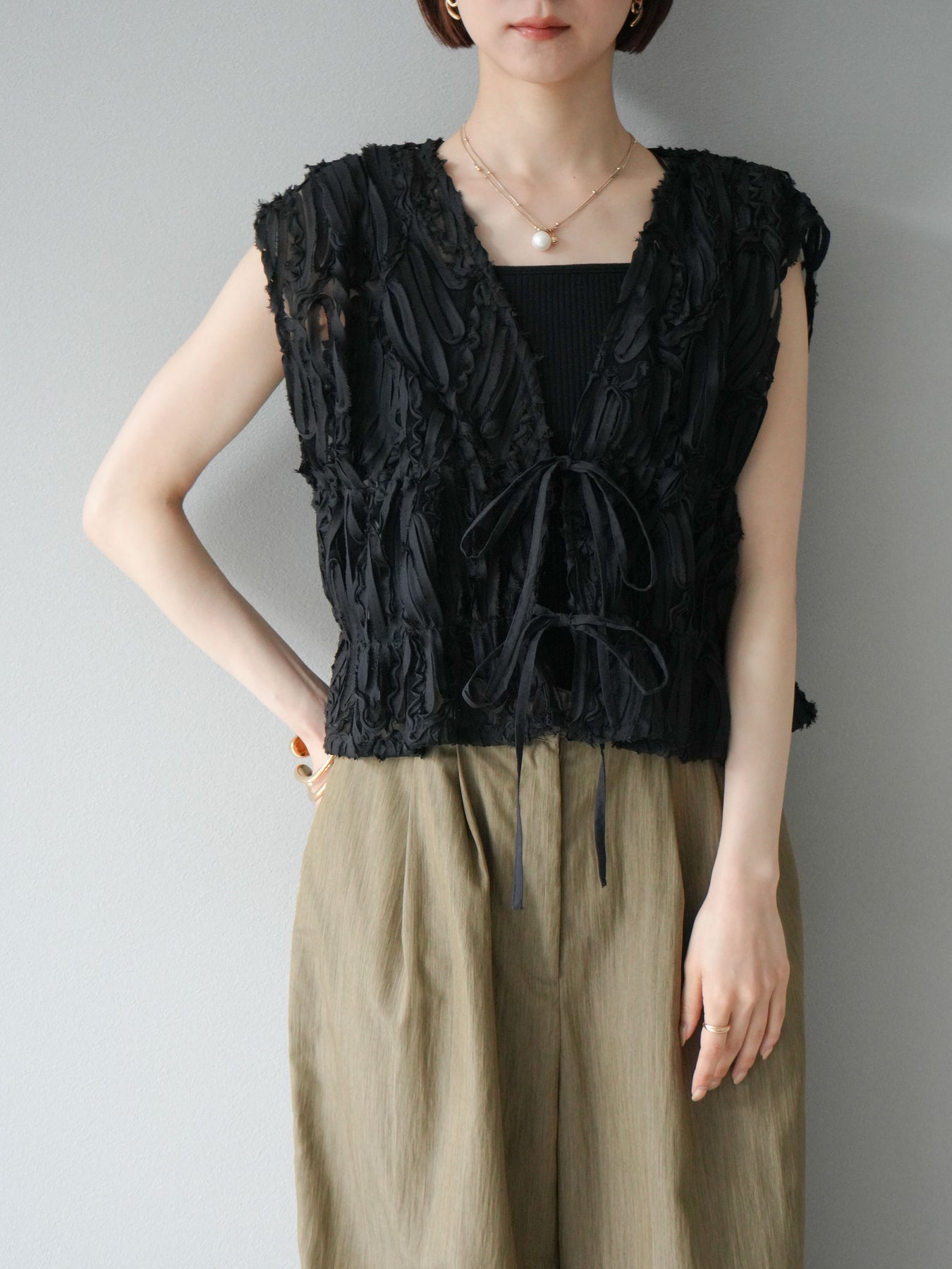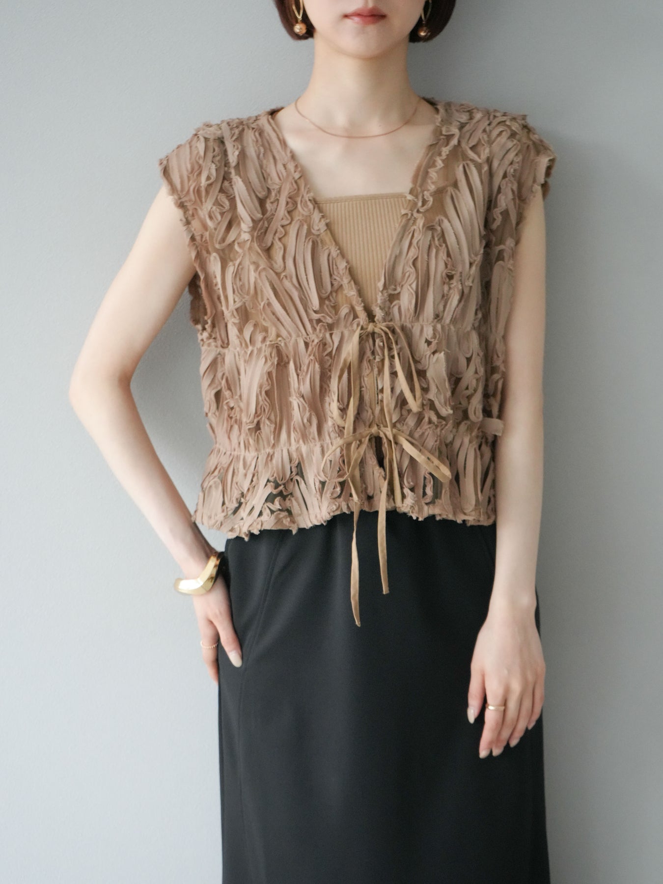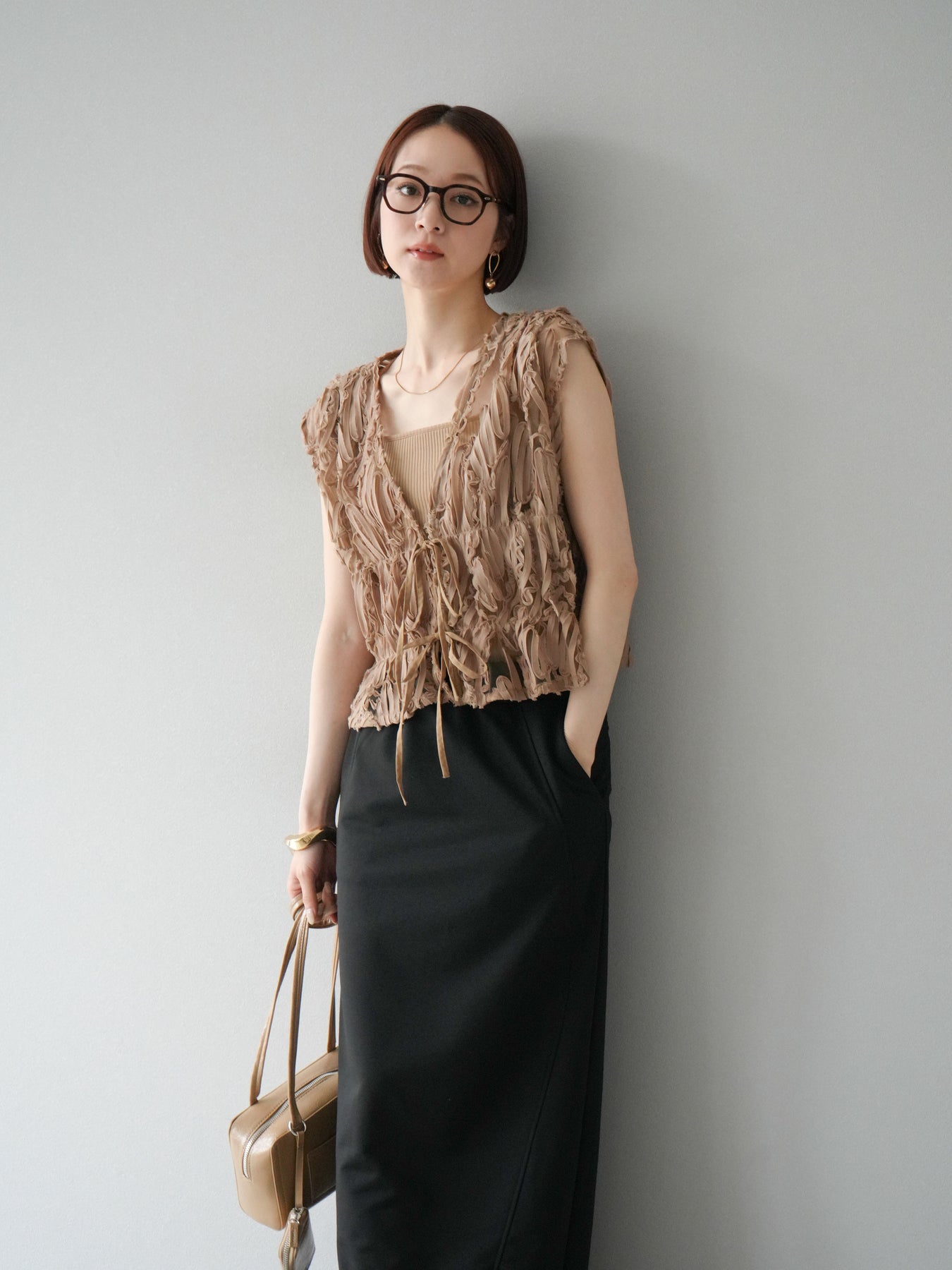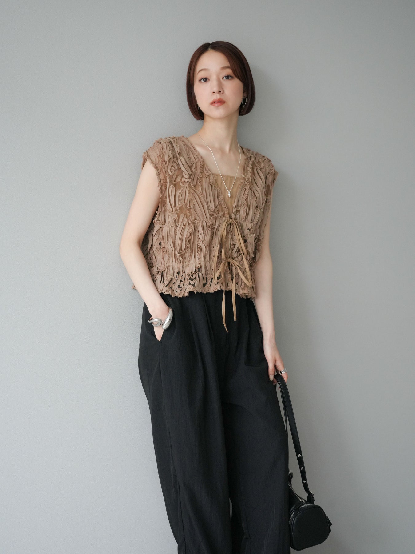 這款上衣採用華麗的提花蕾絲設計,引人注目。立體編織紋路和細膩的透明感,為造型增添一抹女性柔美。正面的蝴蝶結設計,可依繫帶方式變換廓形,百搭百搭。建議搭配吊帶背心或背心上衣。 *除下裝和吊帶背心(內衣)外,其他商品均不含內衣。