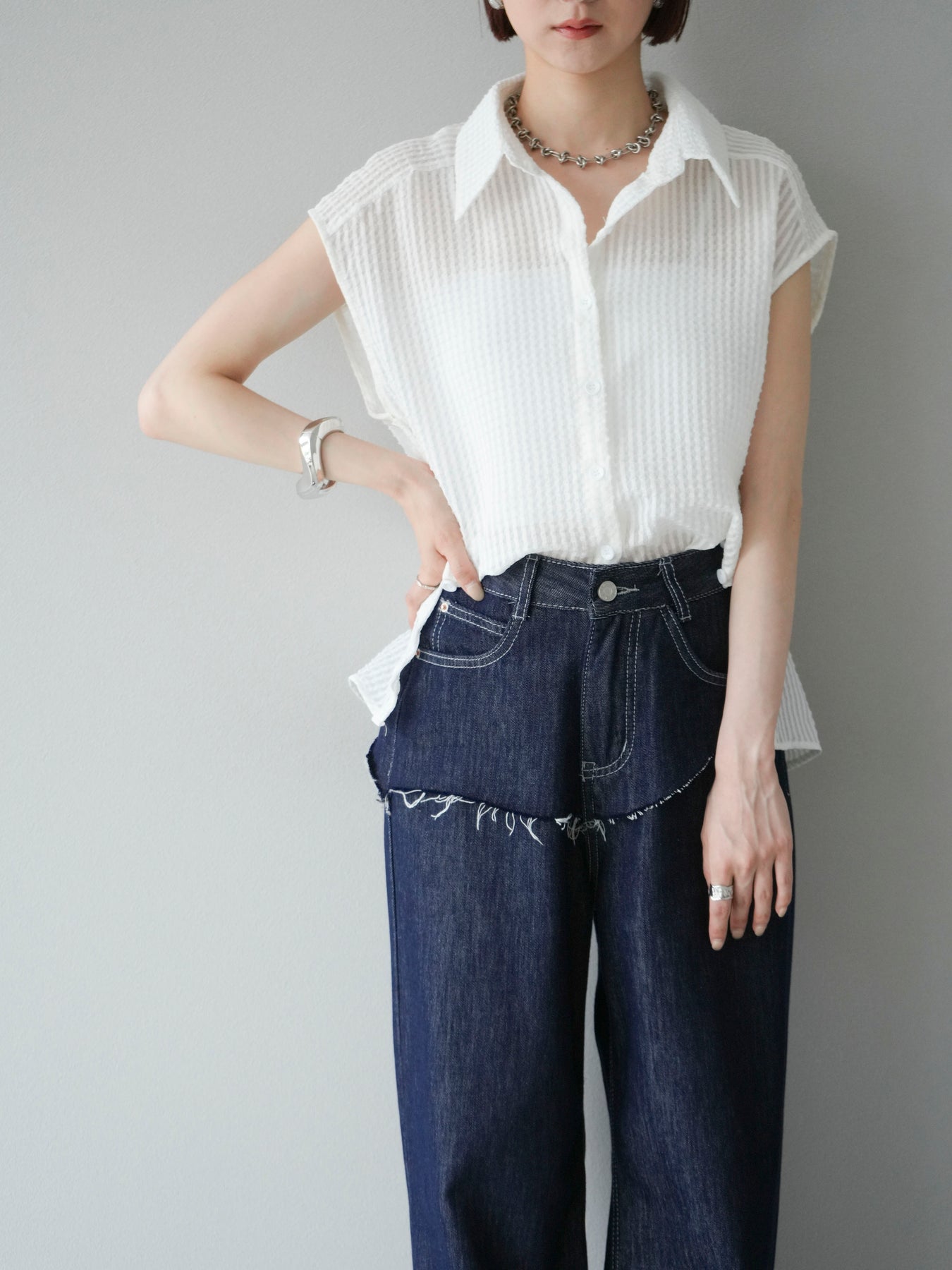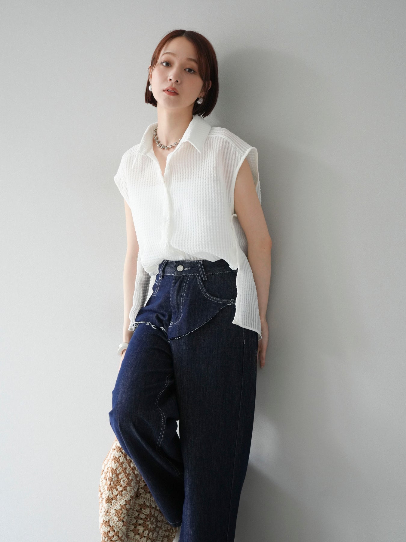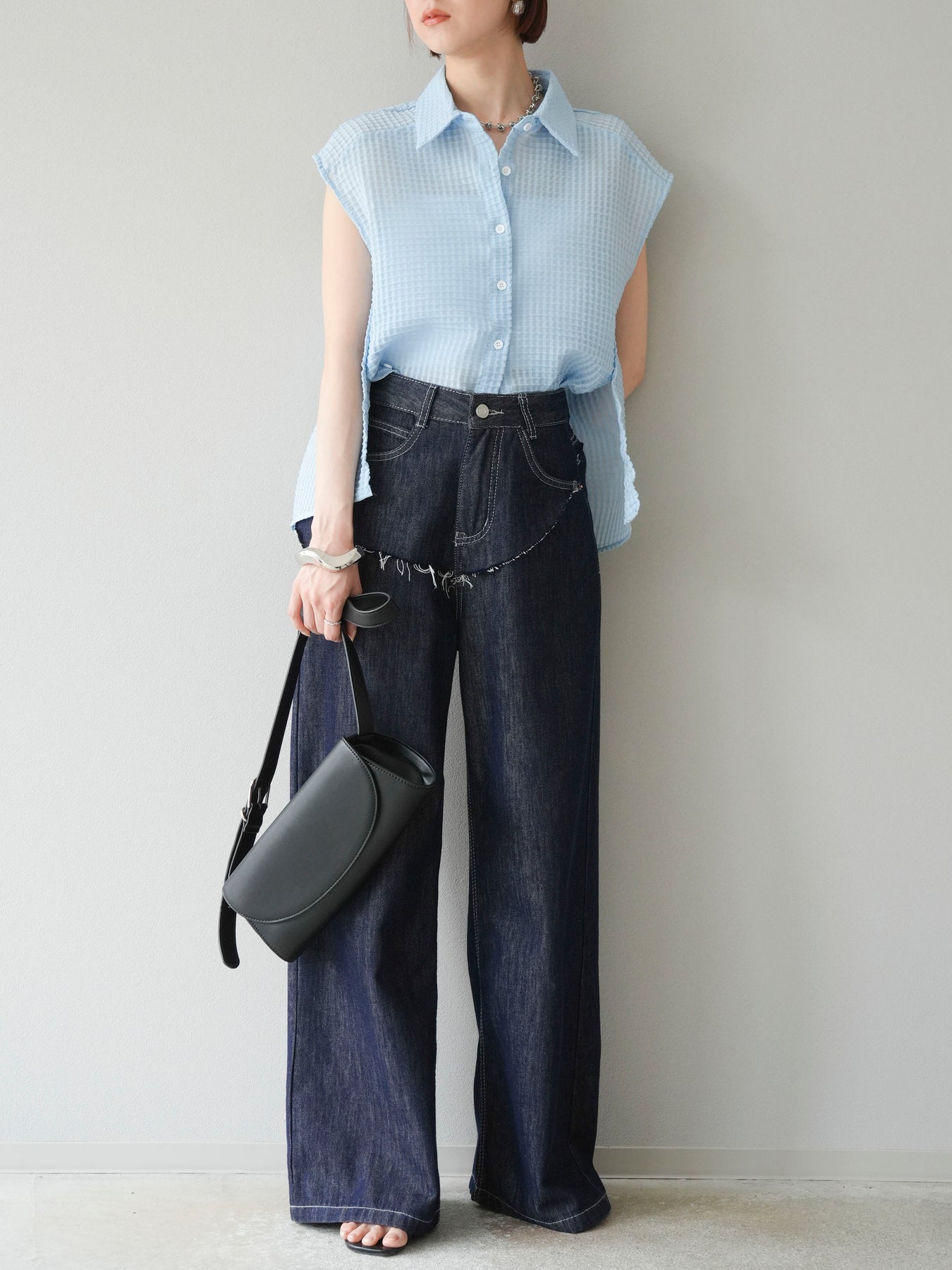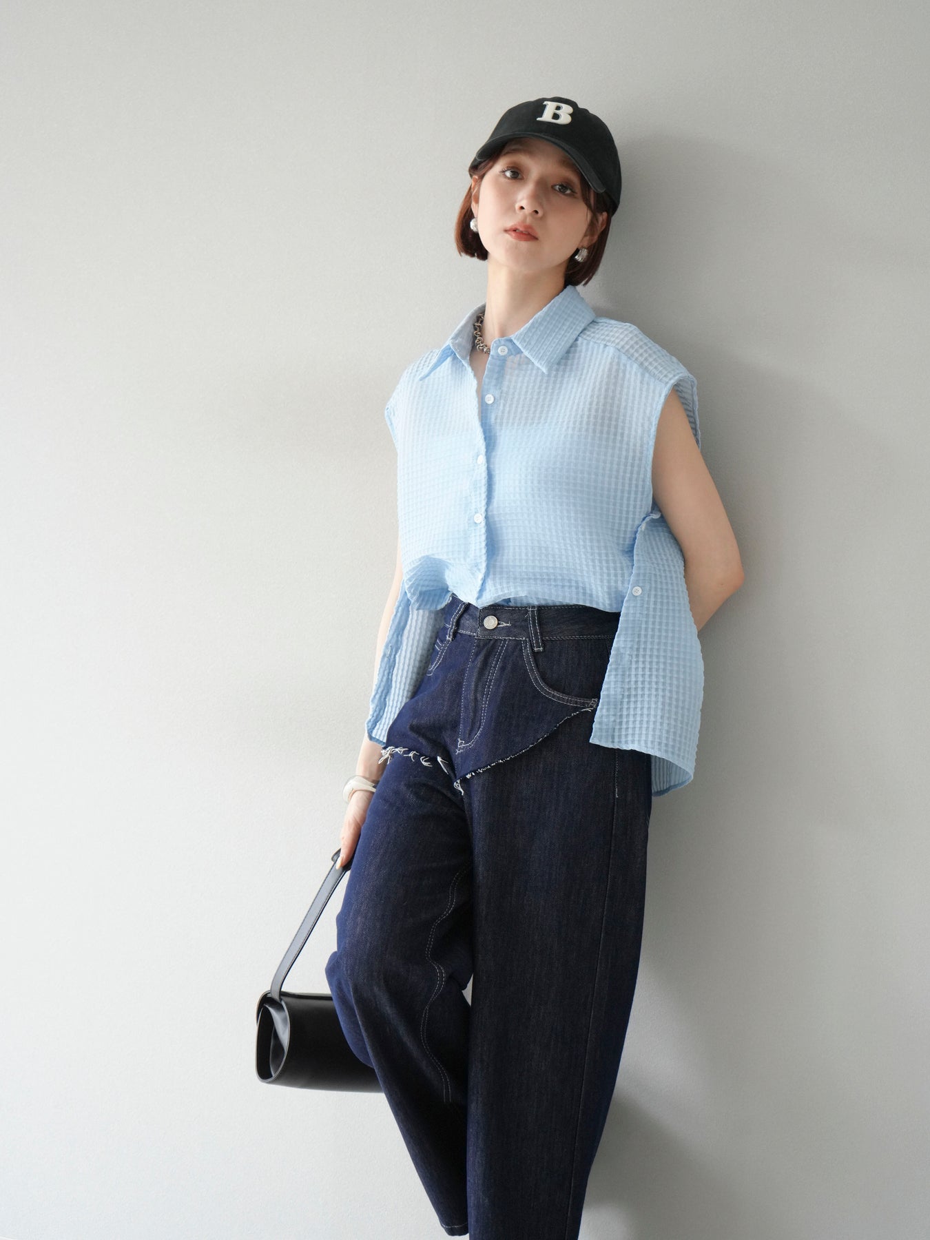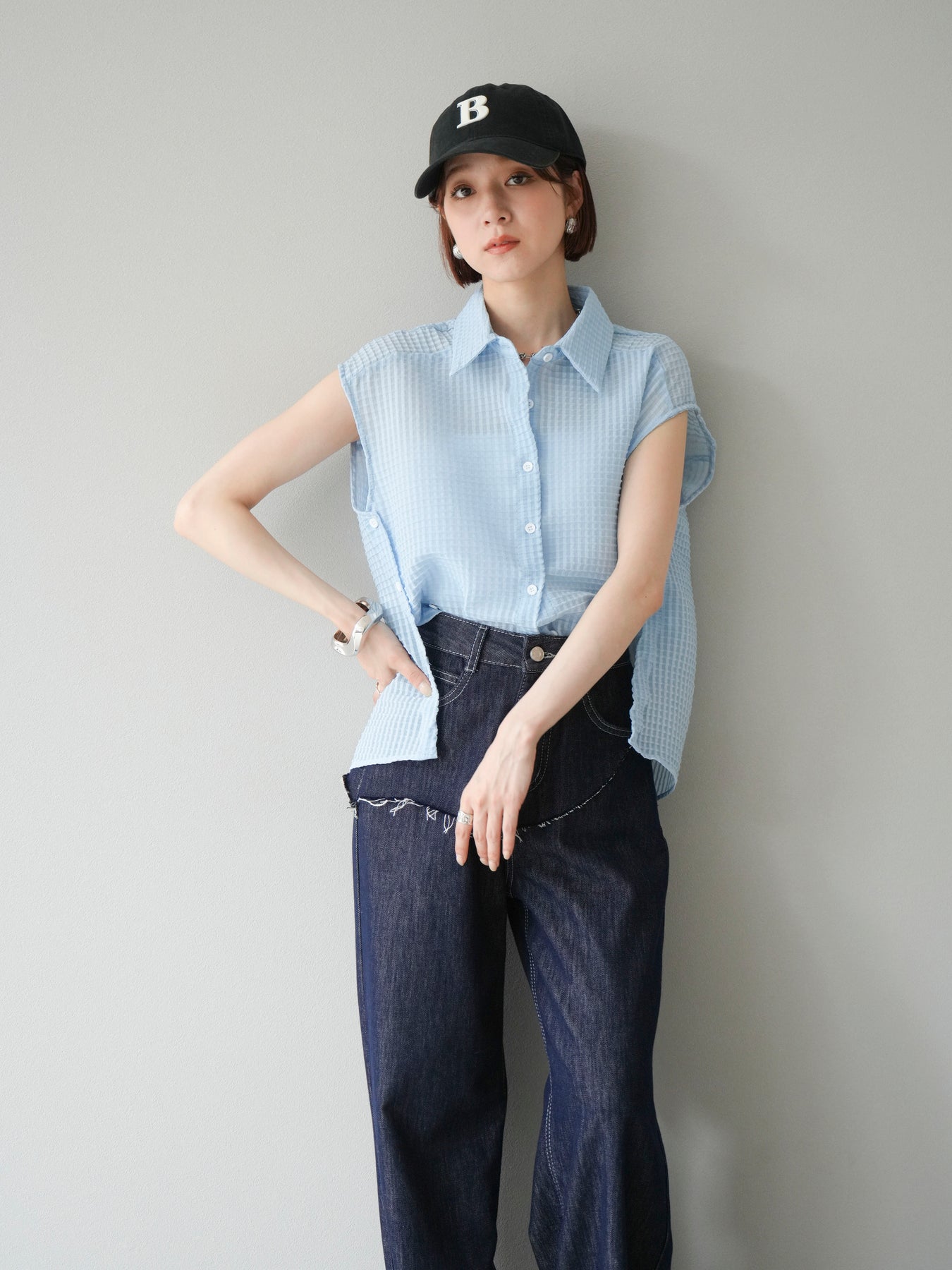 這款透視格紋無袖襯衫,散發清涼夏日氣息。精緻的格紋圖案織入半透明材質,營造出時尚輕盈的造型。側邊飾有精緻的荷葉邊,更添柔美氣質。立領與隱形紐扣設計,賦予其幹練俐落的氣質。它既可單穿,也可內搭背心或夾克。 ※除下裝、吊帶背心(內衣)以外的商品均不含內衣。