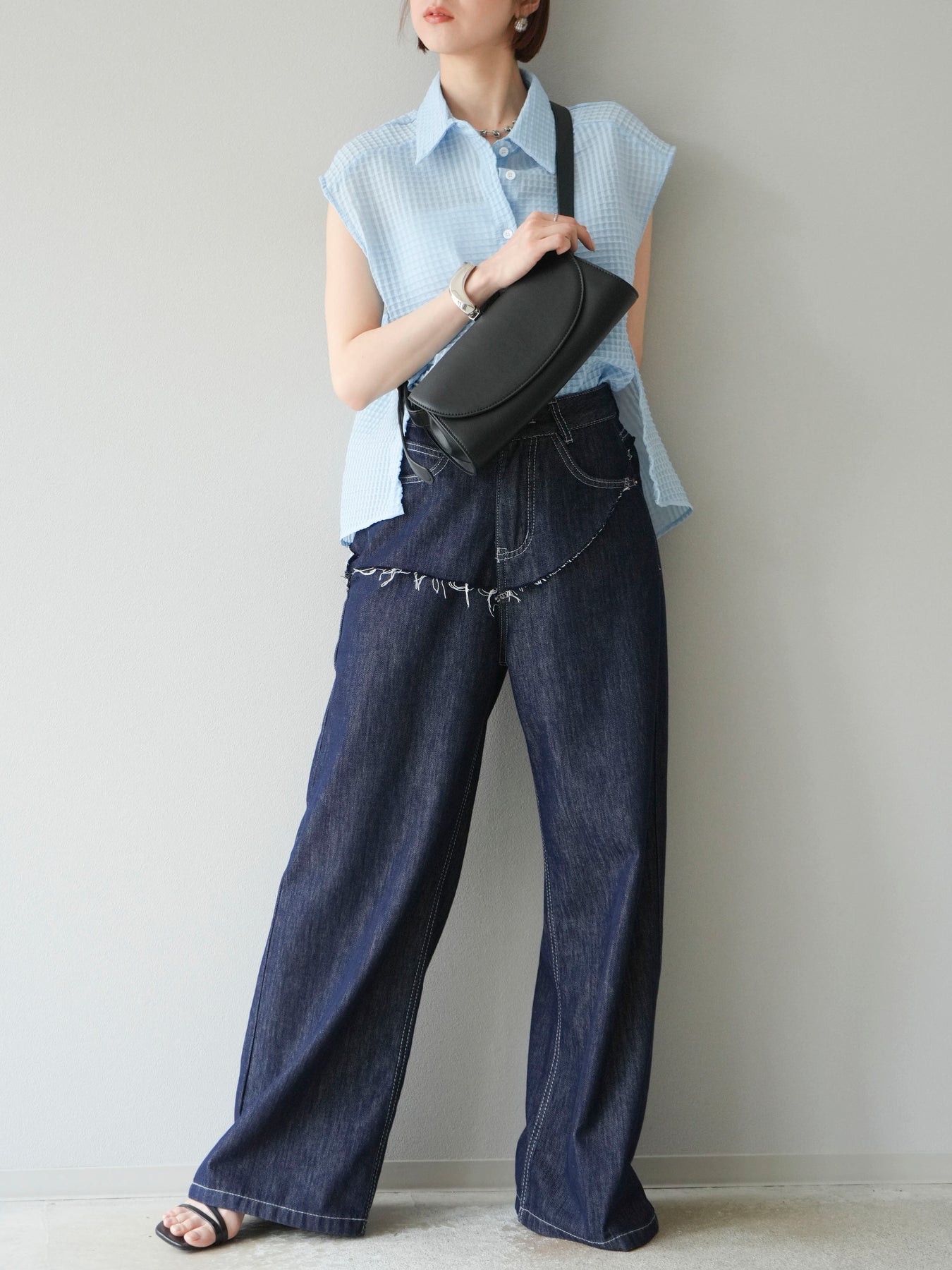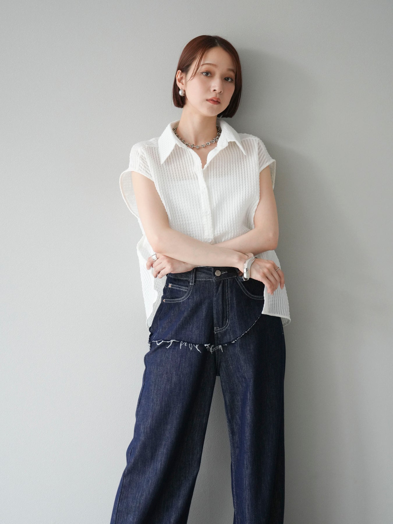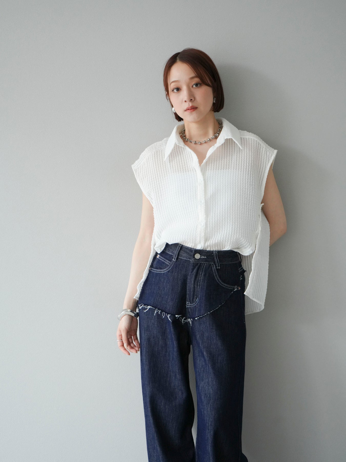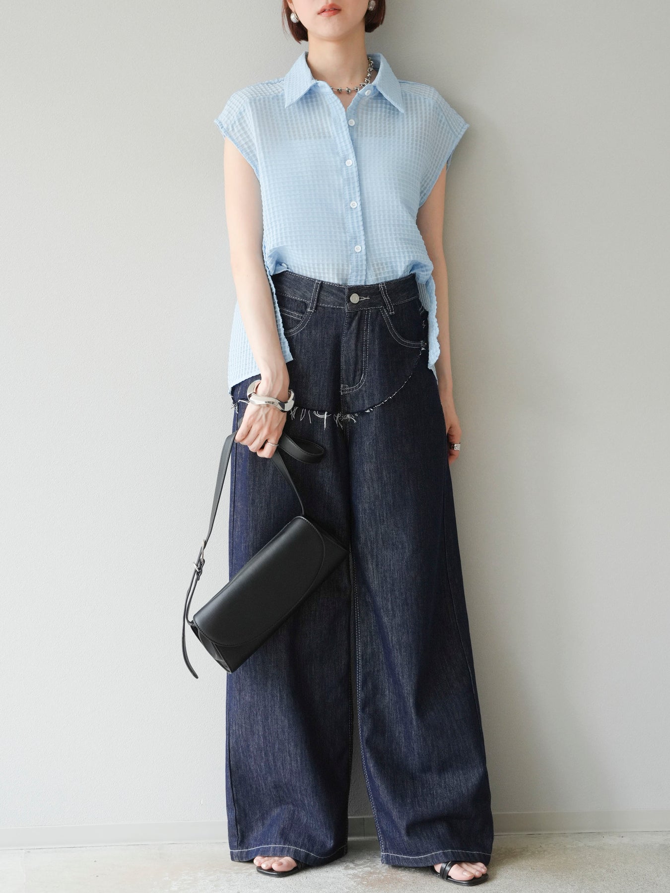 這款透視格紋無袖襯衫,散發清涼夏日氣息。精緻的格紋圖案織入半透明材質,營造出時尚輕盈的造型。側邊飾有精緻的荷葉邊,更添柔美氣質。立領與隱形紐扣設計,賦予其幹練俐落的氣質。它既可單穿,也可內搭背心或夾克。 ※除下裝、吊帶背心(內衣)以外的商品均不含內衣。
