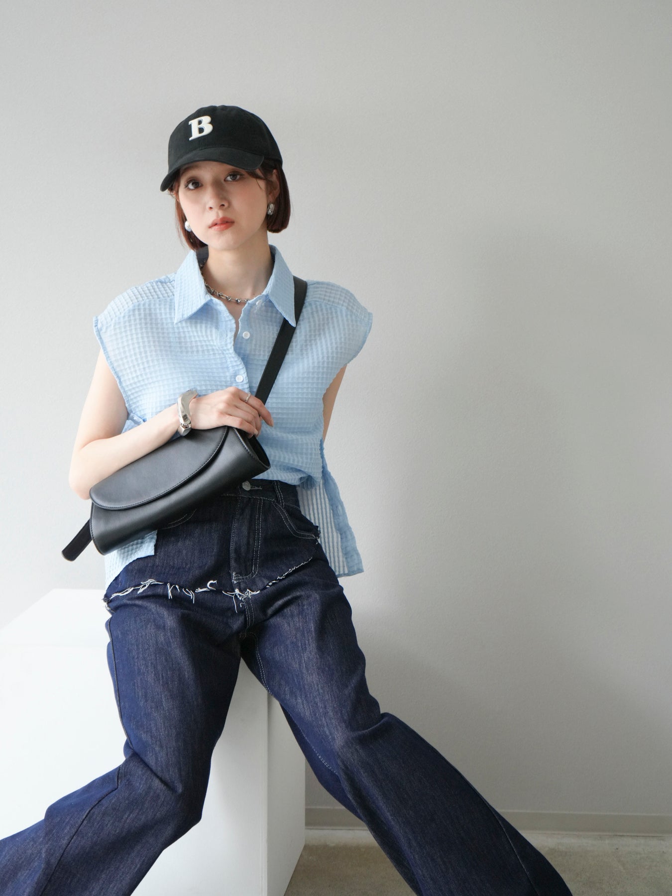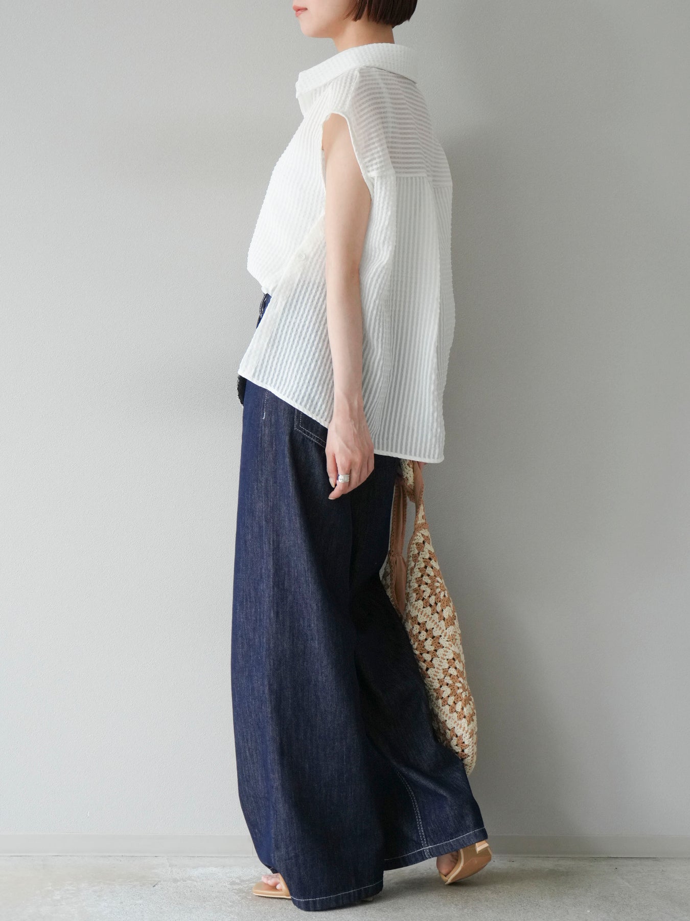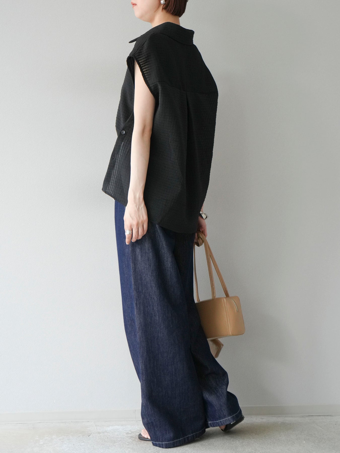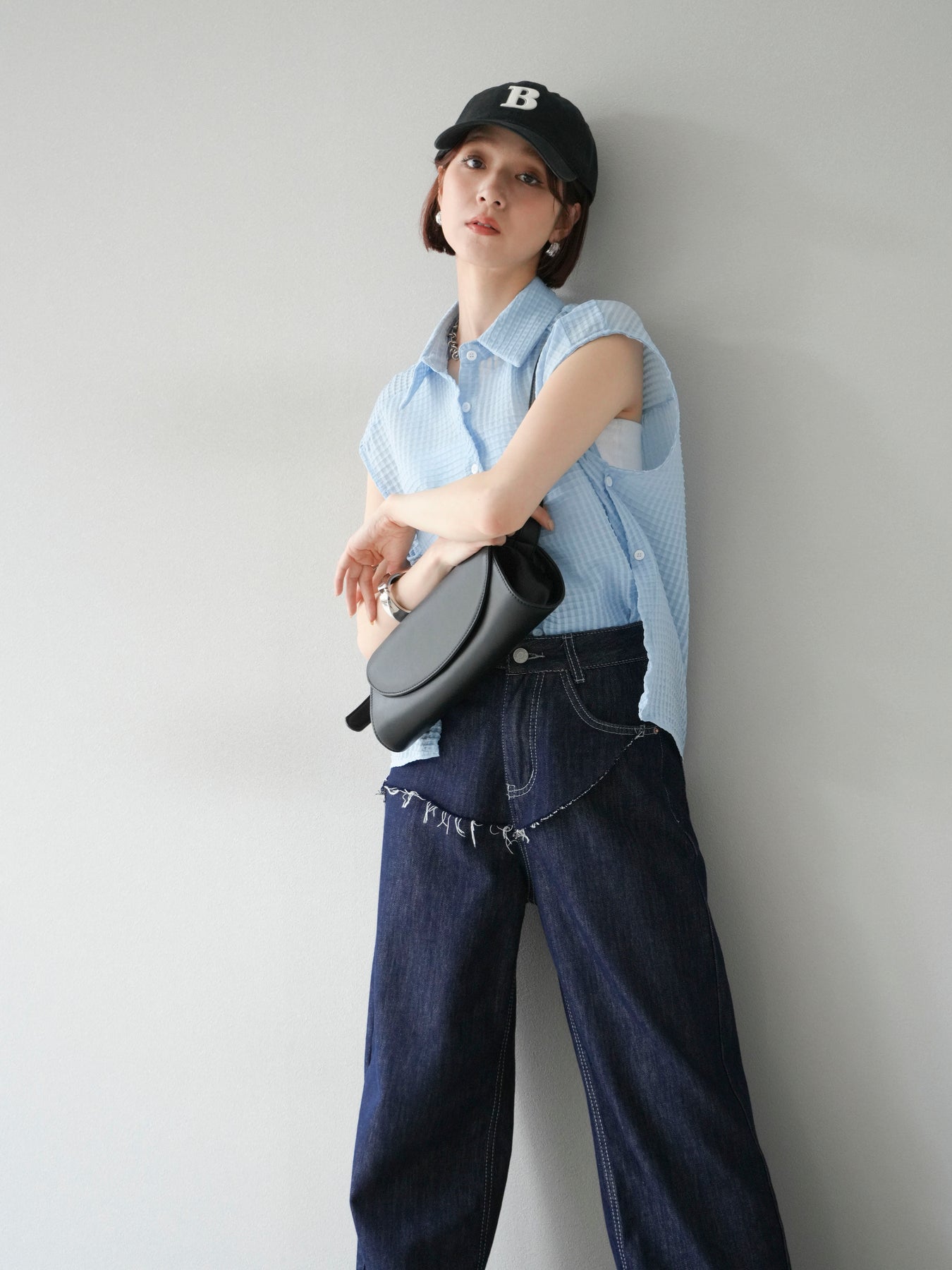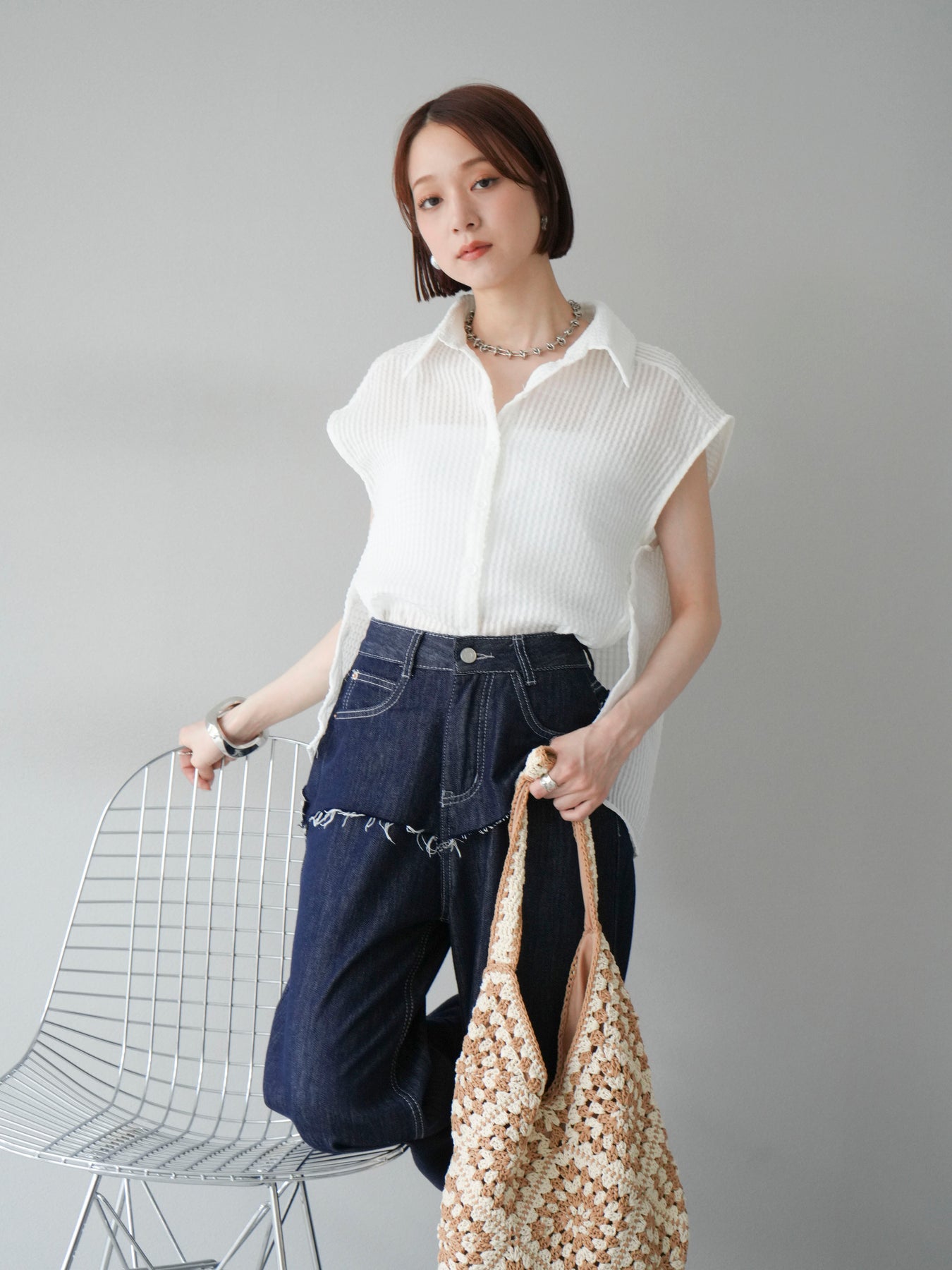 這款透視格紋無袖襯衫,散發清涼夏日氣息。精緻的格紋圖案織入半透明材質,營造出時尚輕盈的造型。側邊飾有精緻的荷葉邊,更添柔美氣質。立領與隱形紐扣設計,賦予其幹練俐落的氣質。它既可單穿,也可內搭背心或夾克。 ※除下裝、吊帶背心(內衣)以外的商品均不含內衣。