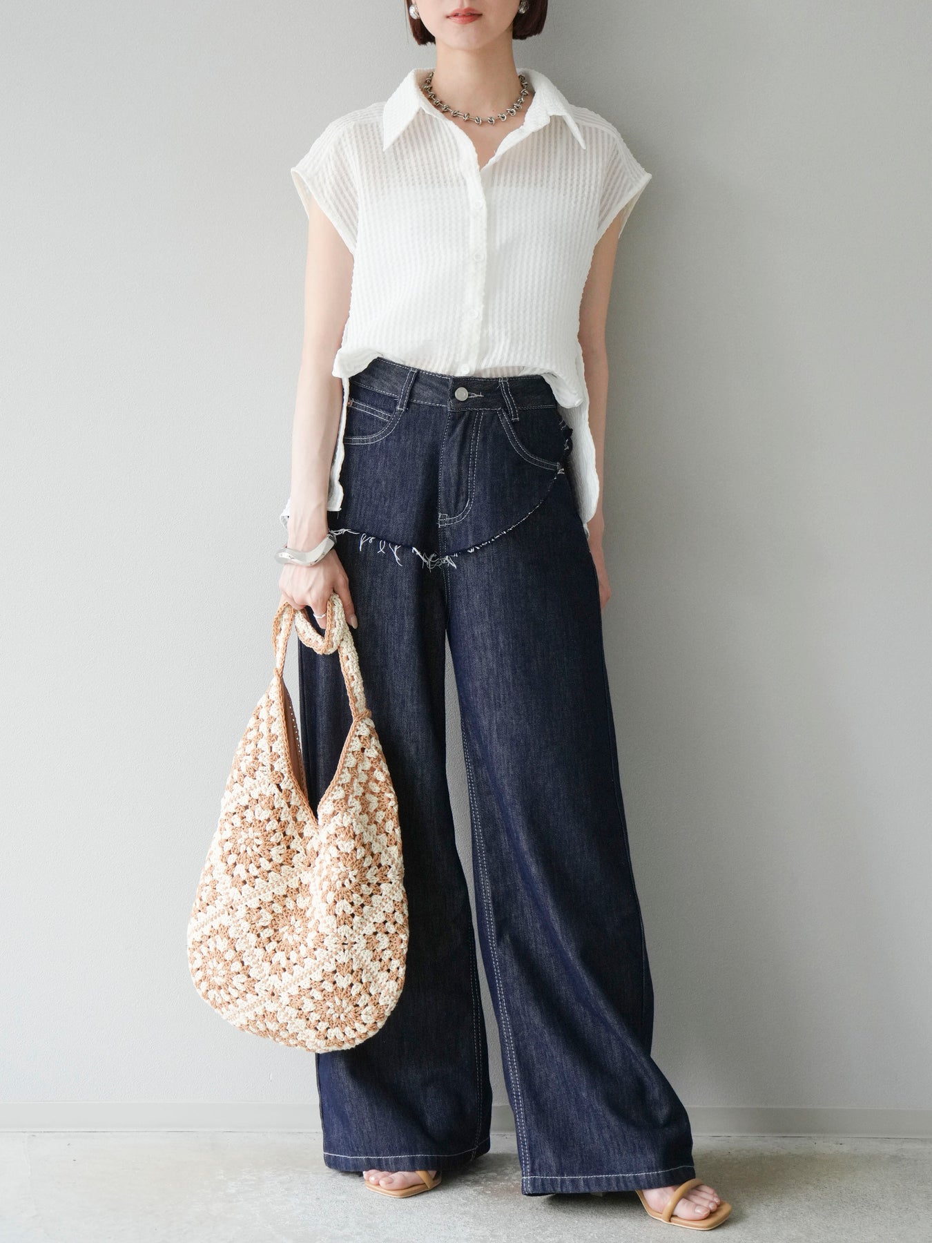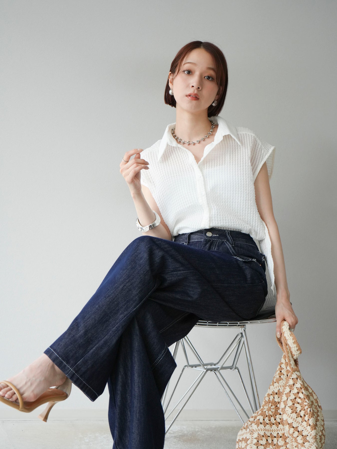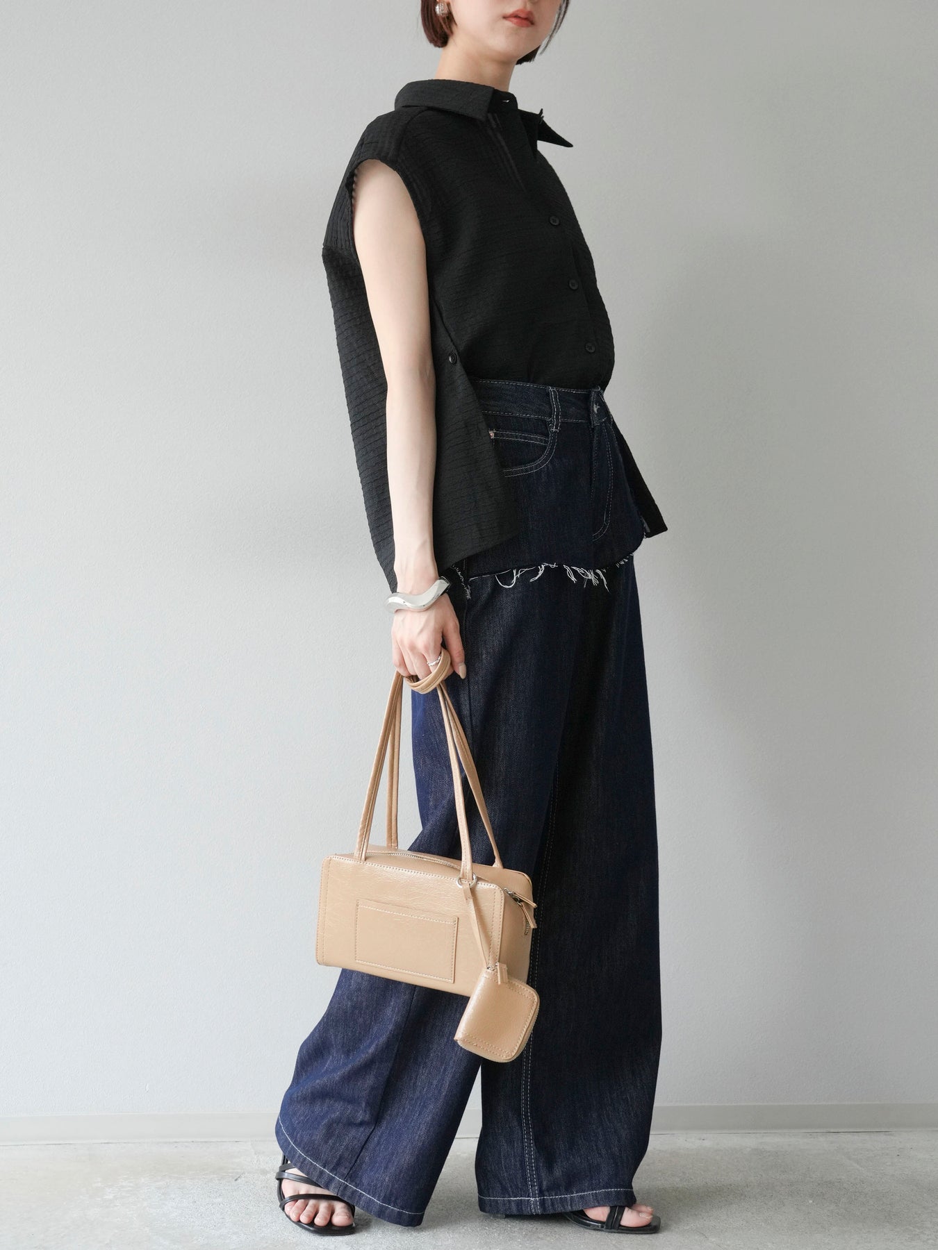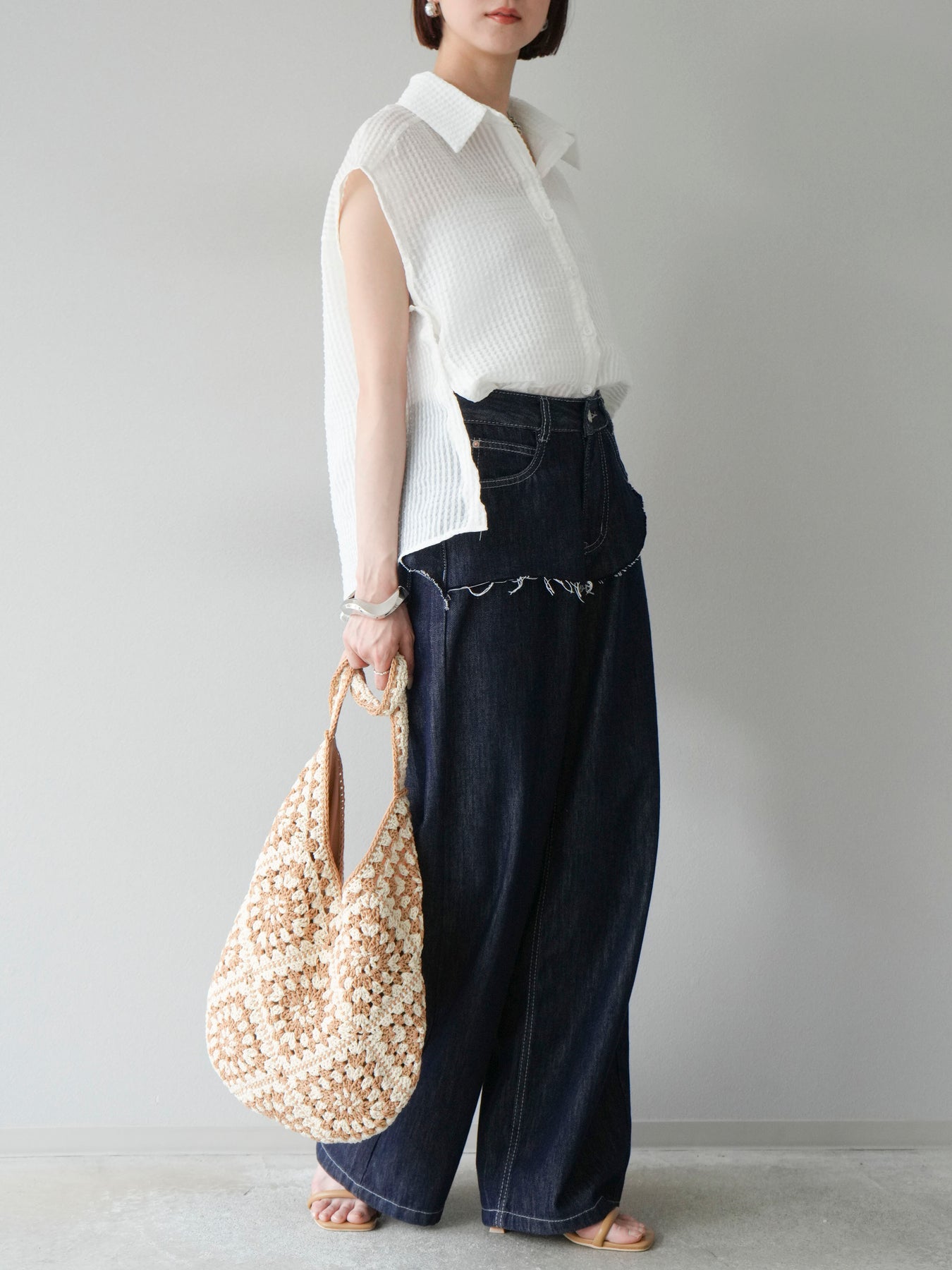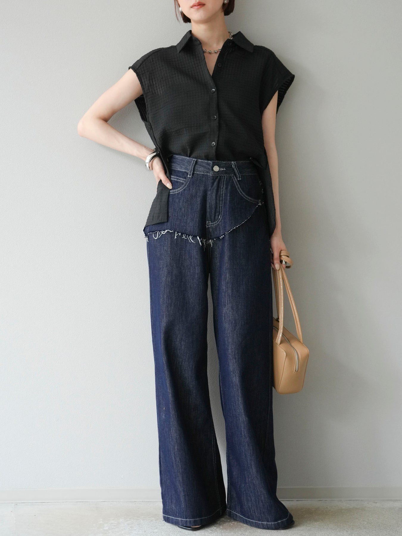 這款透視格紋無袖襯衫,散發清涼夏日氣息。精緻的格紋圖案織入半透明材質,營造出時尚輕盈的造型。側邊飾有精緻的荷葉邊,更添柔美氣質。立領與隱形紐扣設計,賦予其幹練俐落的氣質。它既可單穿,也可內搭背心或夾克。 ※除下裝、吊帶背心(內衣)以外的商品均不含內衣。