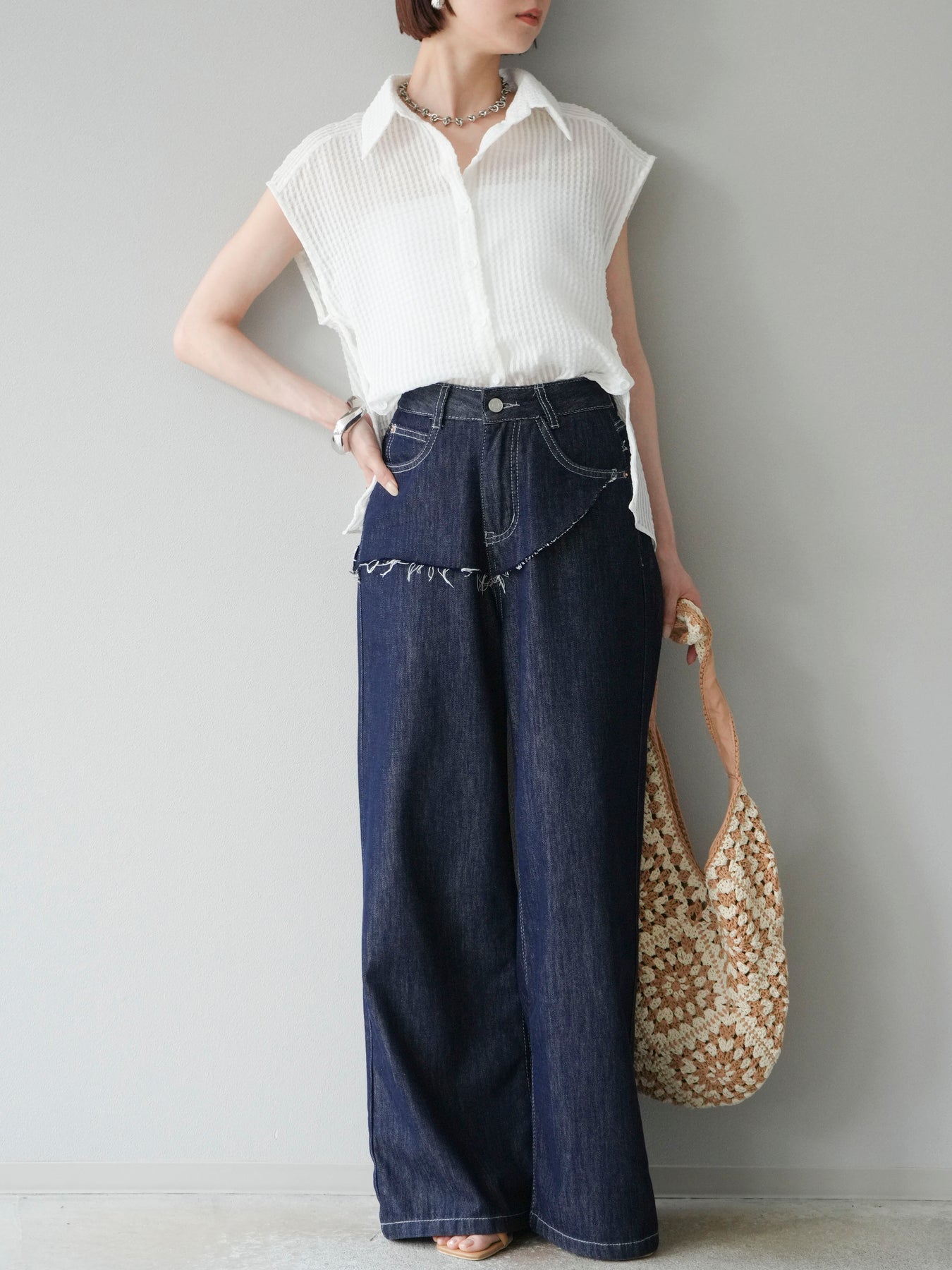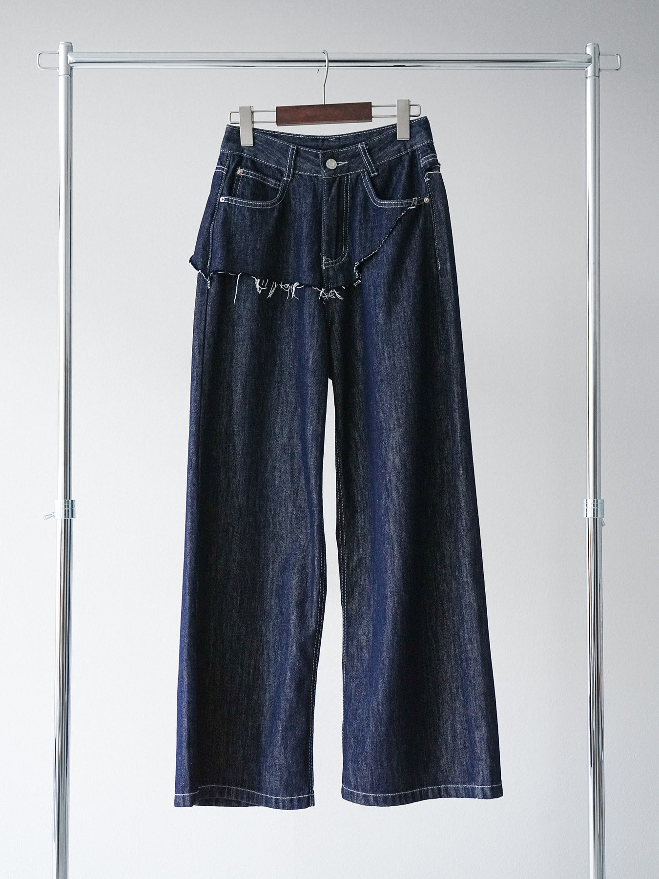 這款牛仔褲前後身採用類似毛邊剪裁的設計細節。輪廓寬大直筒,高腰設計更顯修長雙腿。這款褲子休閒又不失獨特。