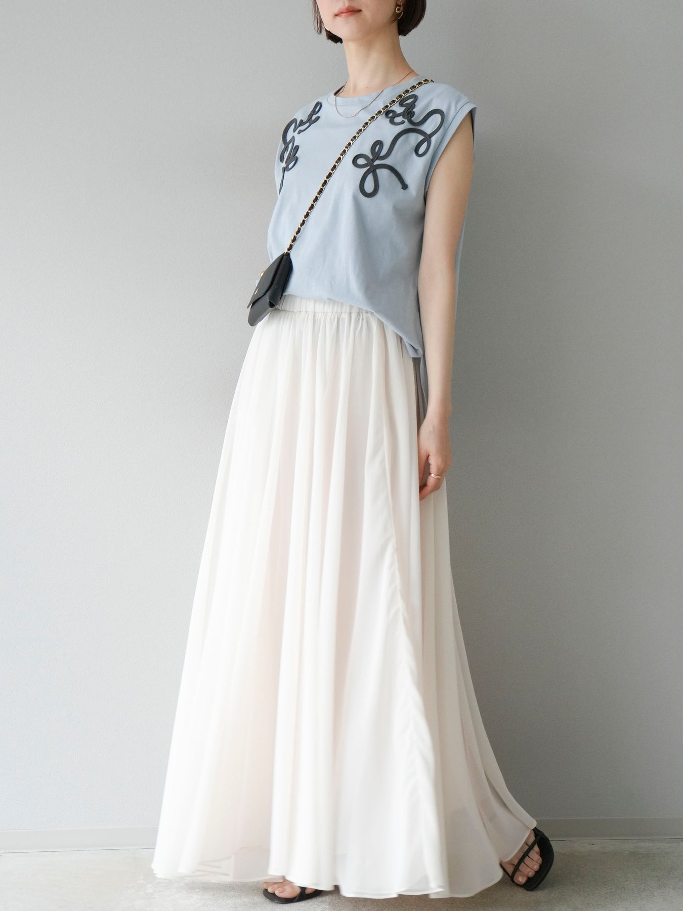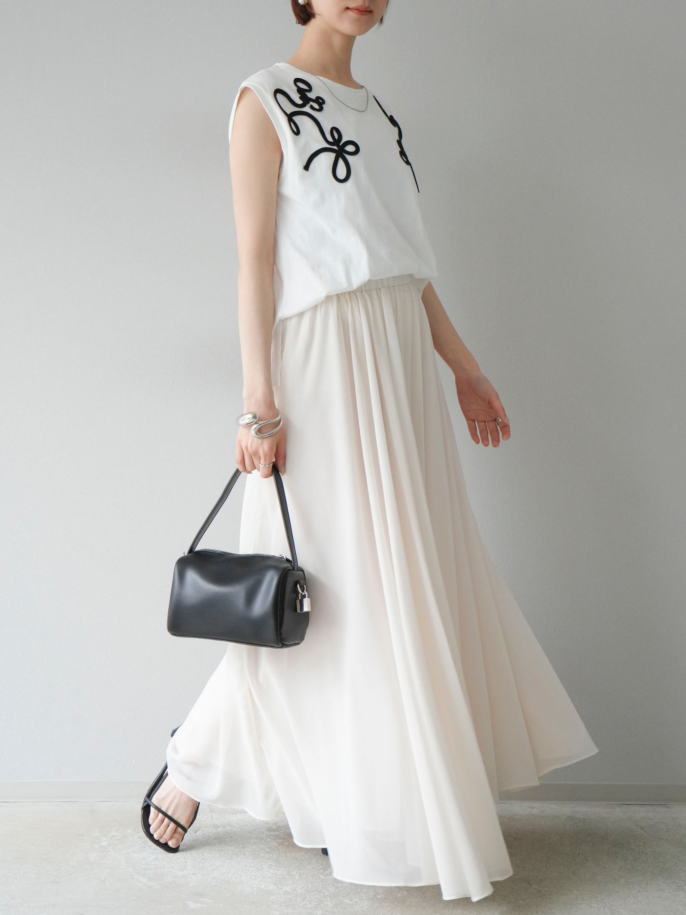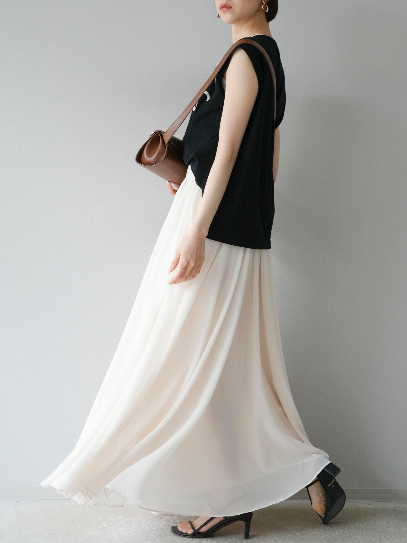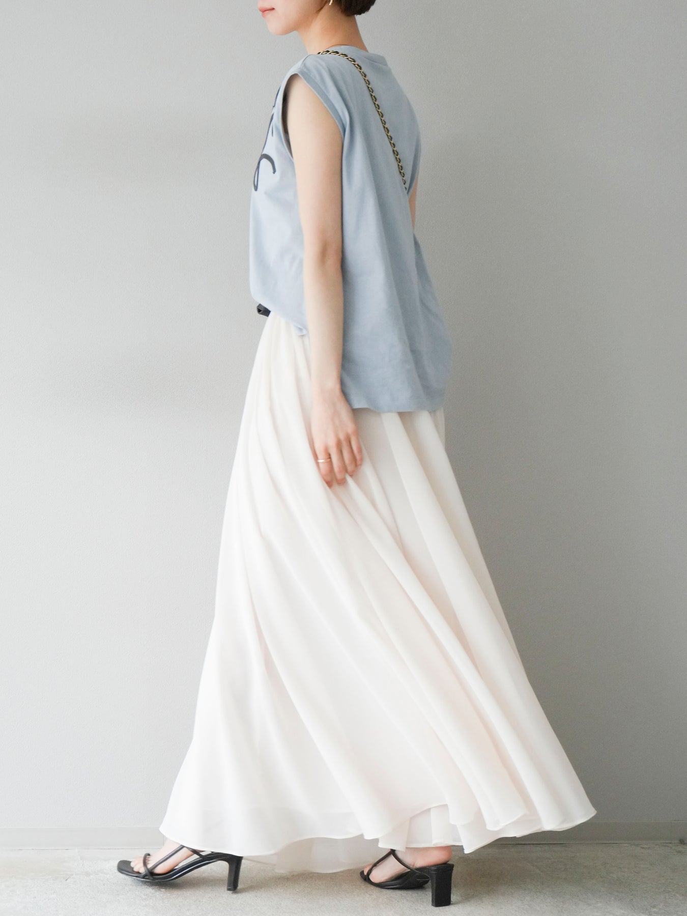 雪紡喇叭裙,質感輕盈飄逸,隨著每個動作輕柔飄揚。大量使用輕盈雪紡布料,步伐輕盈,優雅飄逸。腰部採用全鬆緊設計,穿脫輕鬆自在。適度的透明度提升女性氣質,可搭配任何上衣。可搭配T卹或針織衫,打造休閒造型;也可搭配襯衫,打造職場造型。 ※除下裝、吊帶背心(內衣)以外的商品均不含內衣。