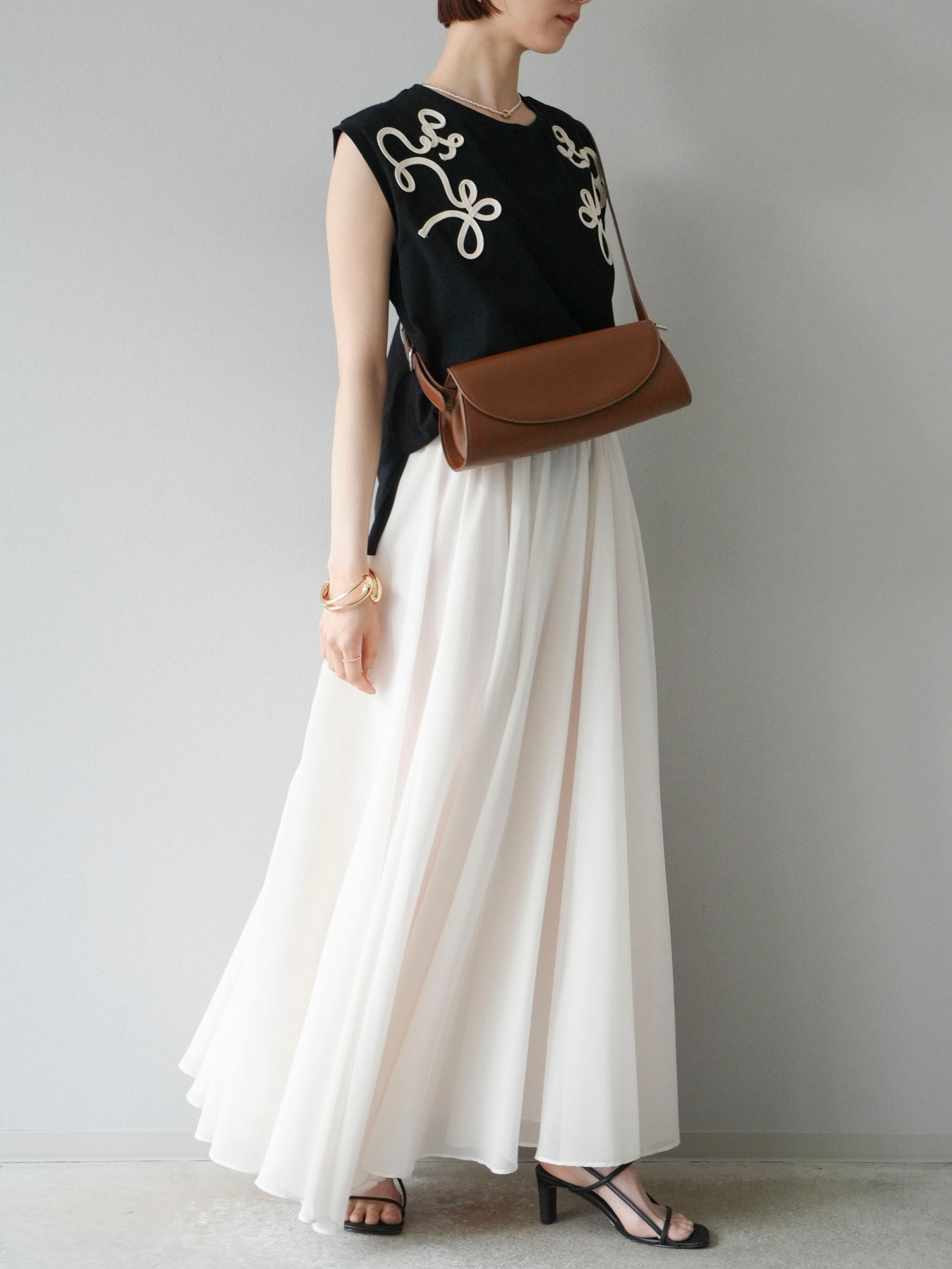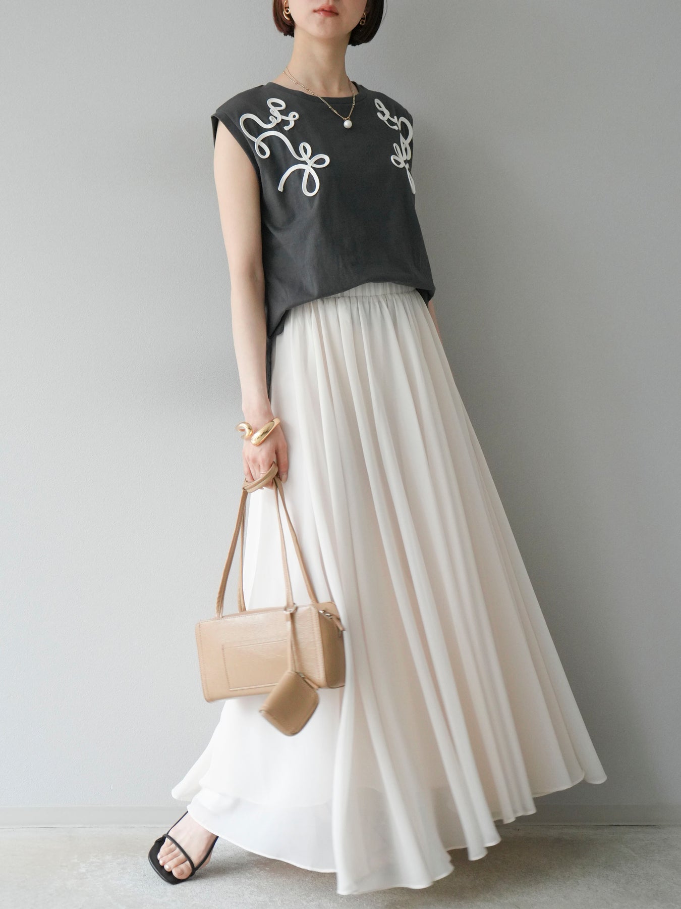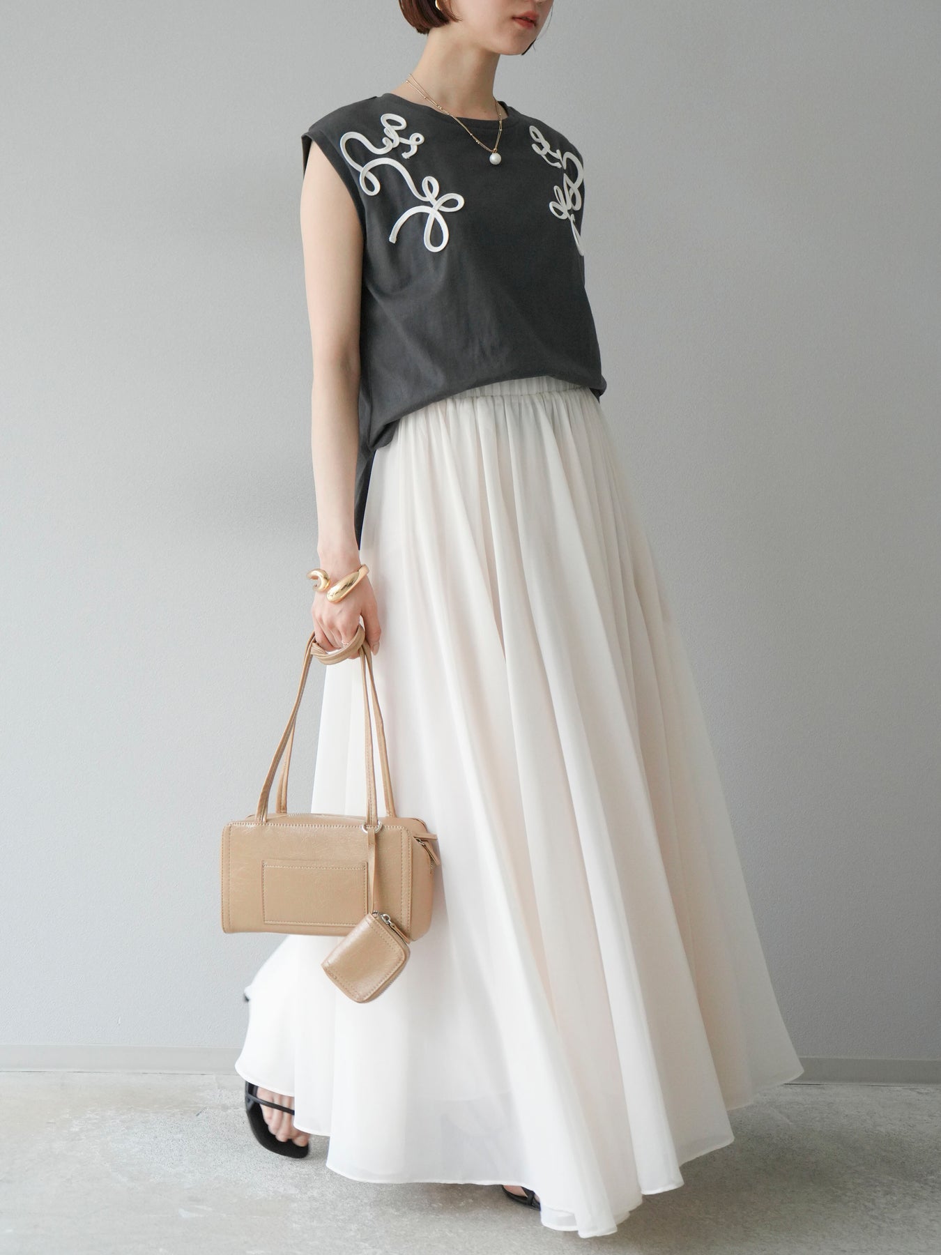 雪紡喇叭裙,質感輕盈飄逸,隨著每個動作輕柔飄揚。大量使用輕盈雪紡布料,步伐輕盈,優雅飄逸。腰部採用全鬆緊設計,穿脫輕鬆自在。適度的透明度提升女性氣質,可搭配任何上衣。可搭配T卹或針織衫,打造休閒造型;也可搭配襯衫,打造職場造型。 ※除下裝、吊帶背心(內衣)以外的商品均不含內衣。