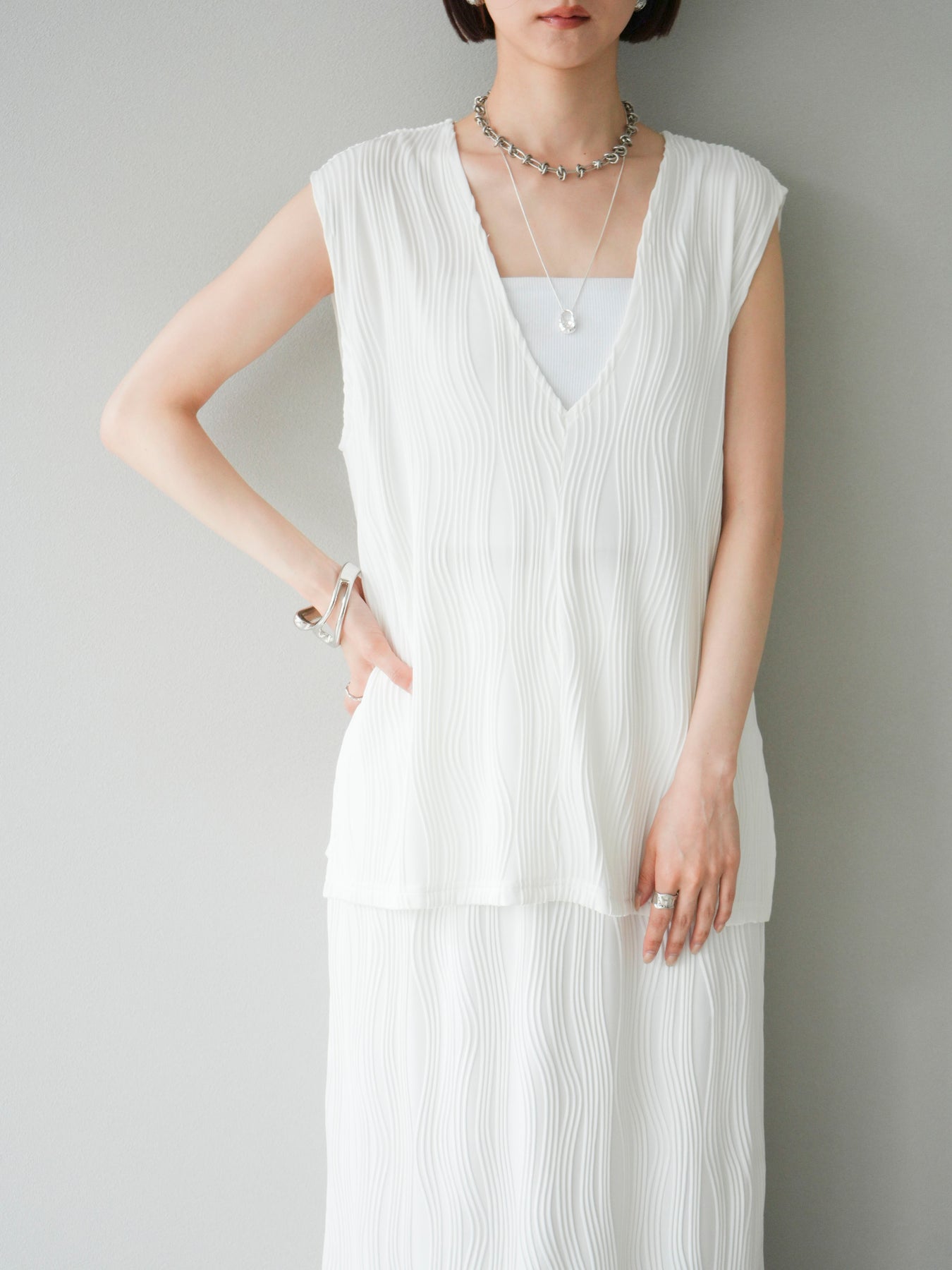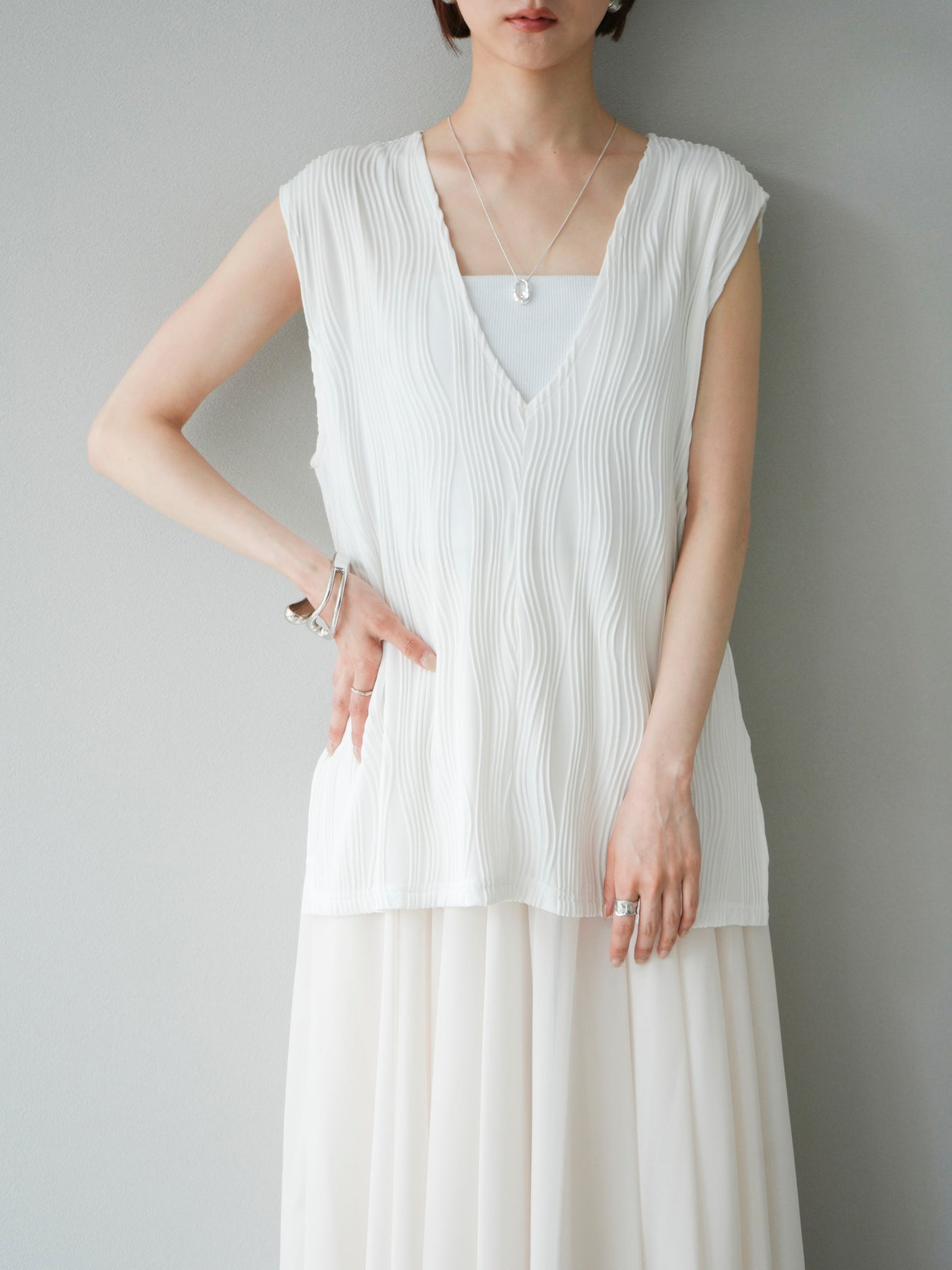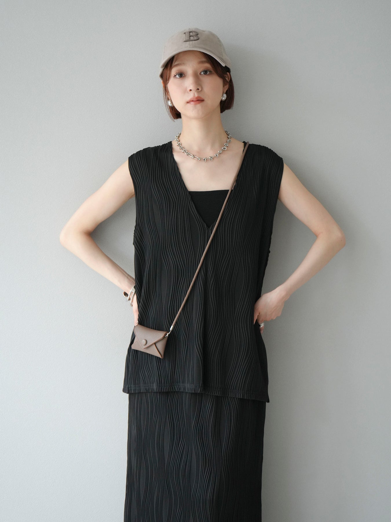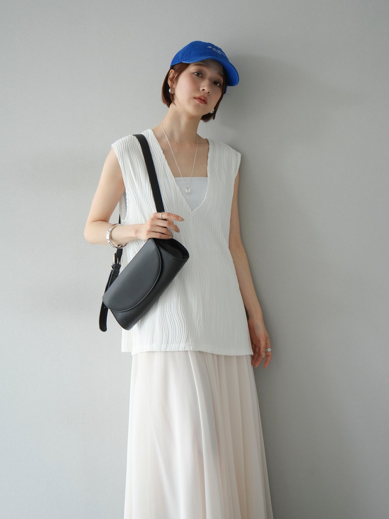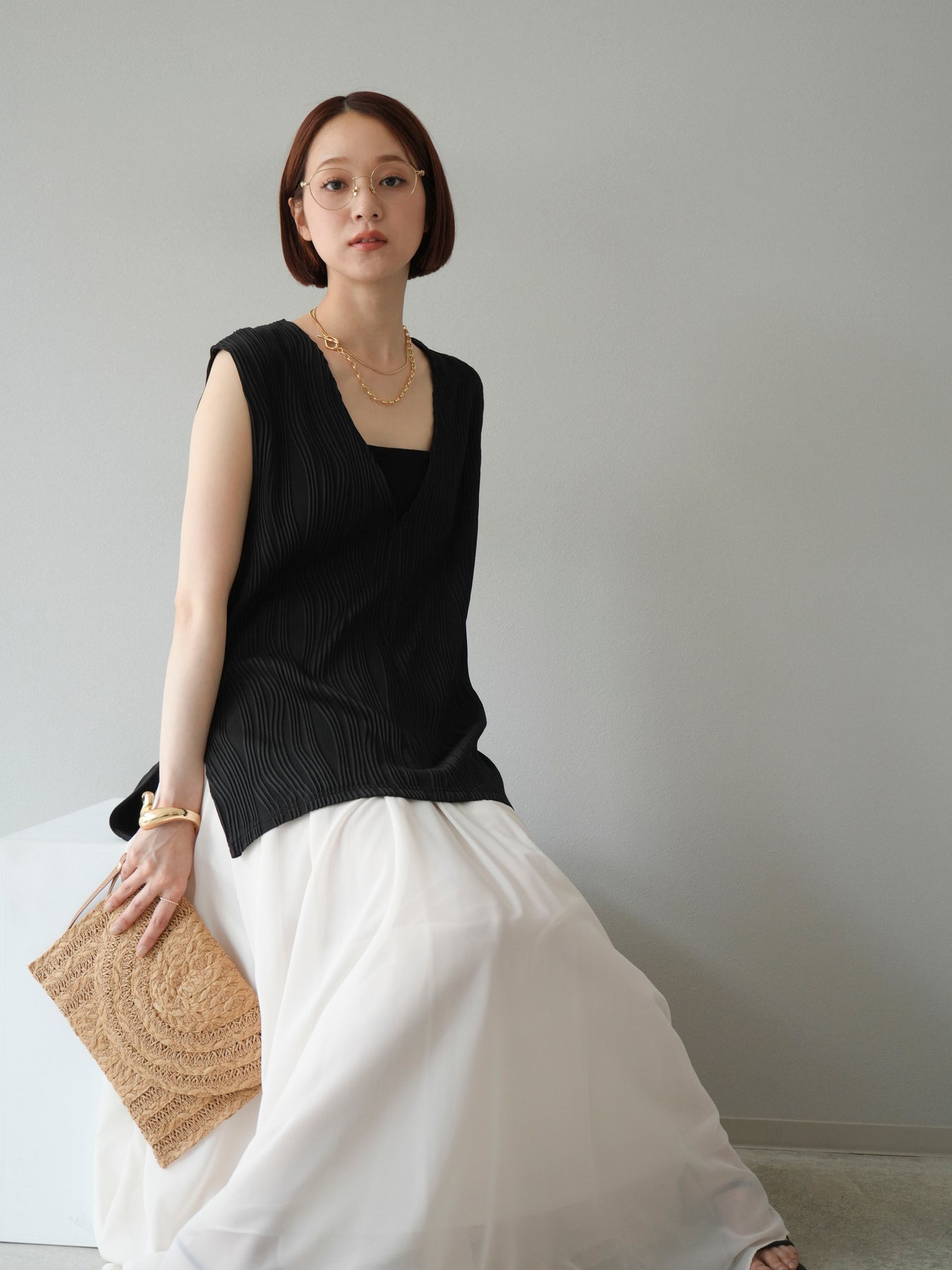 這款V領背心採用富有表現力的波浪滾邊面料,引人注目。深V領設計完美展現肩頸曲線,可內搭穿著。寬鬆的輪廓兼具休閒與現代感。長度恰到好處地遮蓋臀部,完美隱藏身材。搭配同材質的裙子或褲子,打造精緻造型。從日常穿著到特殊場合,這款單品適用範圍廣泛。 ※除下裝、吊帶背心(內衣)以外的商品均不含內衣。