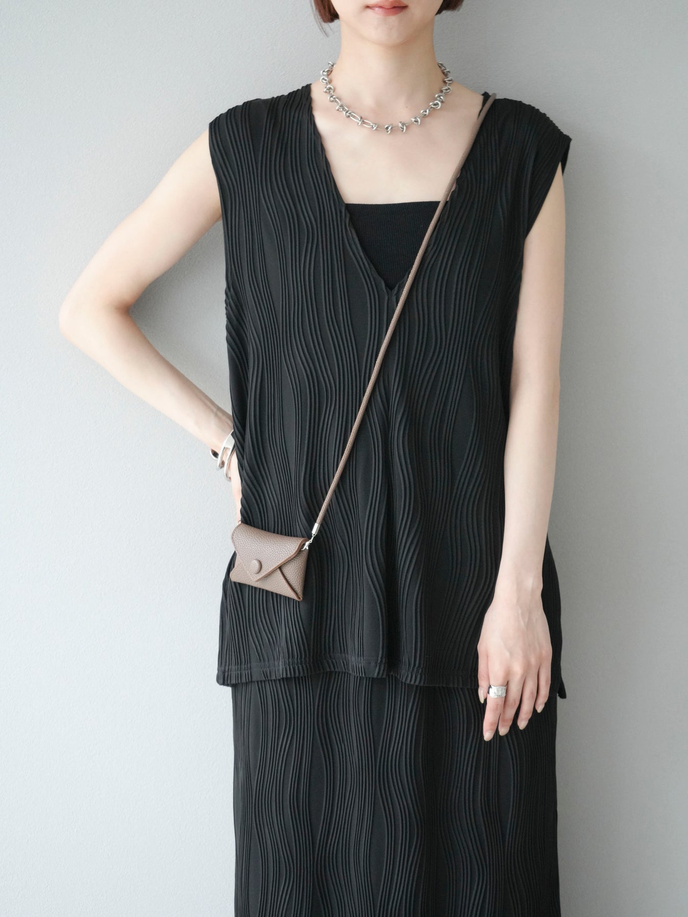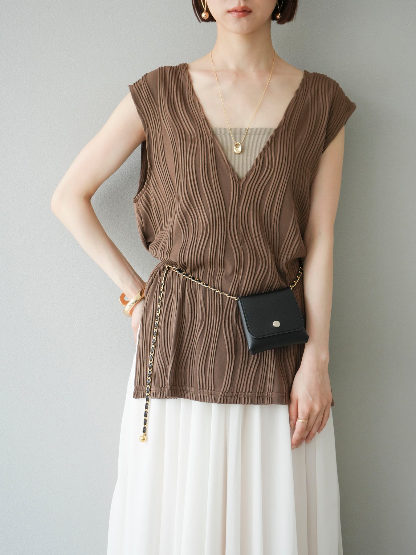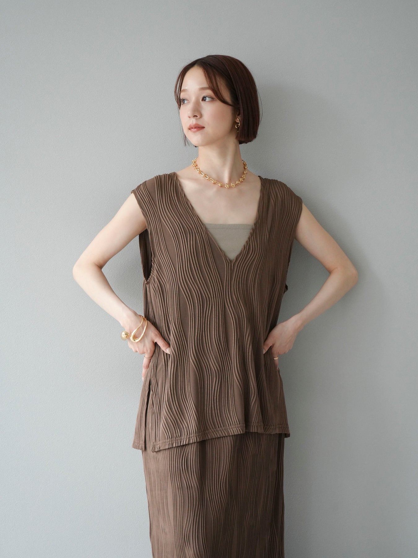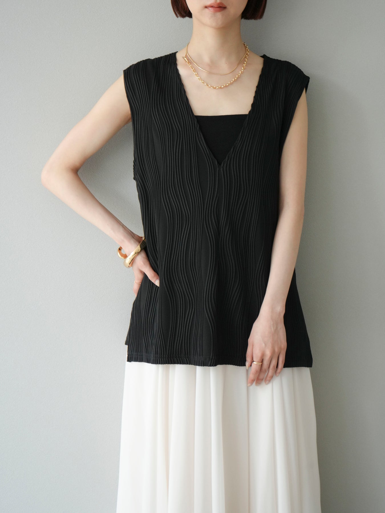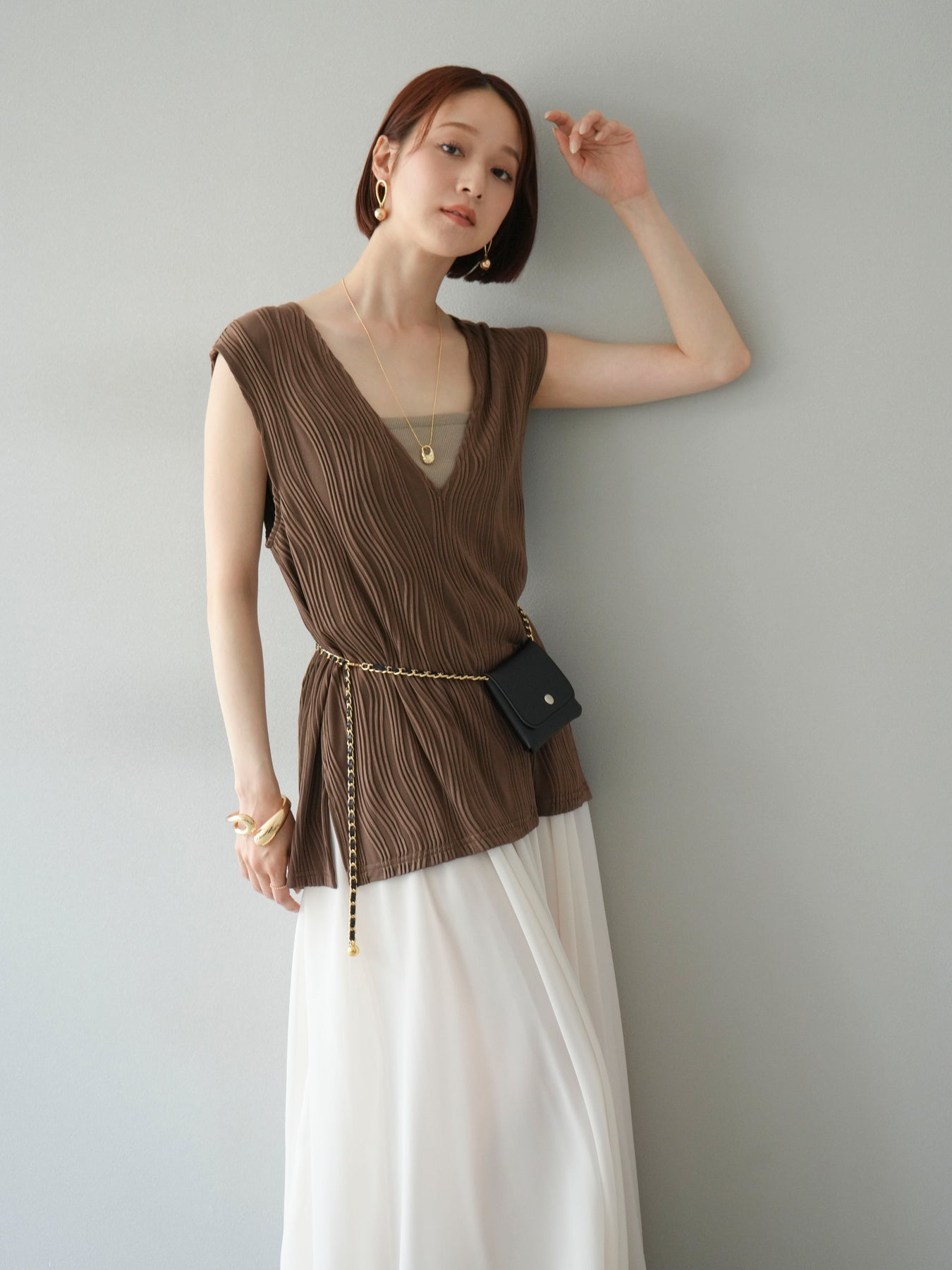 這款V領背心採用富有表現力的波浪滾邊面料,引人注目。深V領設計完美展現肩頸曲線,可內搭穿著。寬鬆的輪廓兼具休閒與現代感。長度恰到好處地遮蓋臀部,完美隱藏身材。搭配同材質的裙子或褲子,打造精緻造型。從日常穿著到特殊場合,這款單品適用範圍廣泛。 ※除下裝、吊帶背心(內衣)以外的商品均不含內衣。