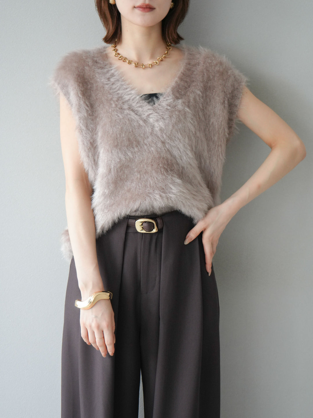 【預購】Lame Shaggy V領針織背心/灰米色