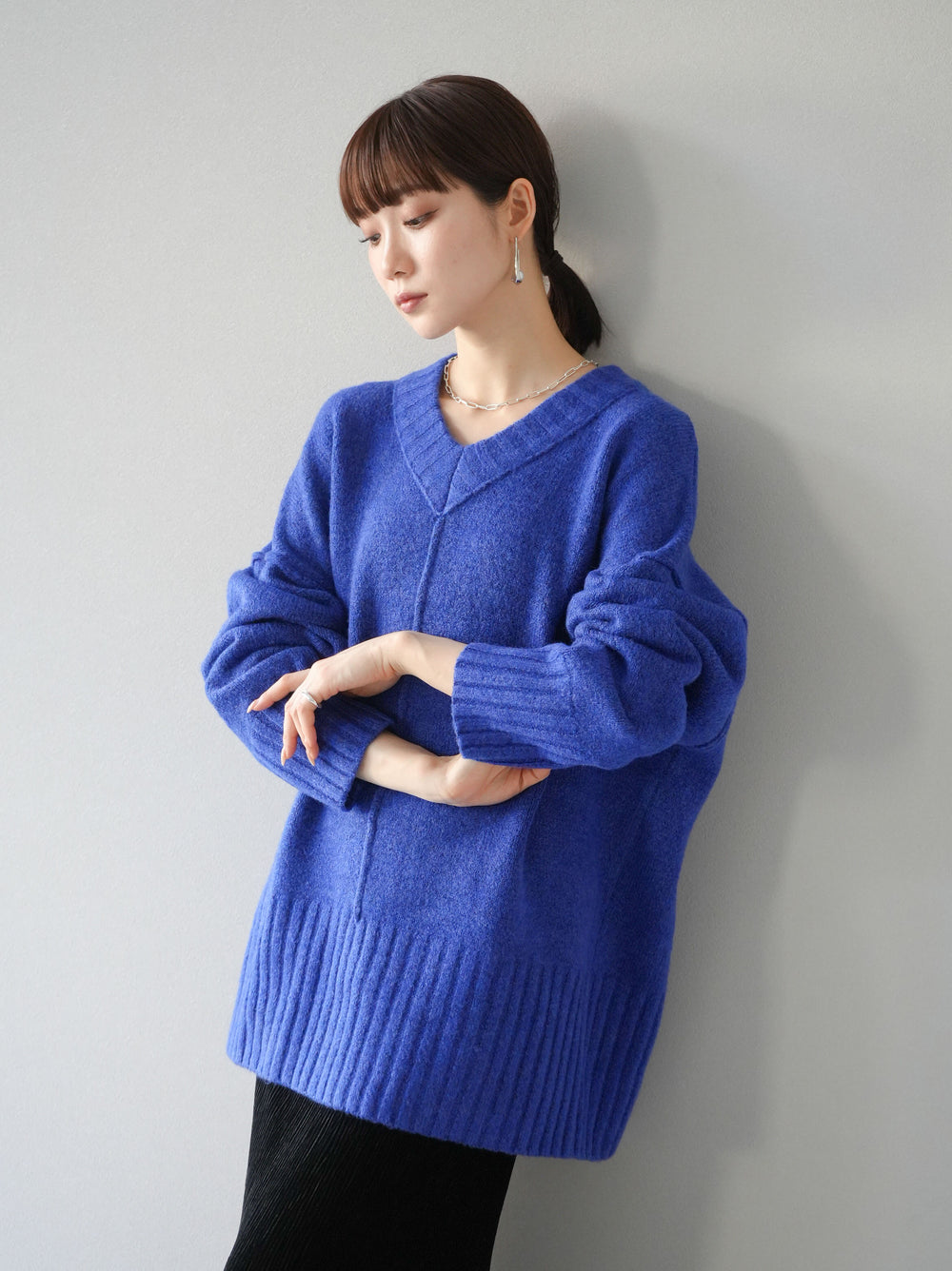 [預訂] 柔軟連接V領針織衫/藍色