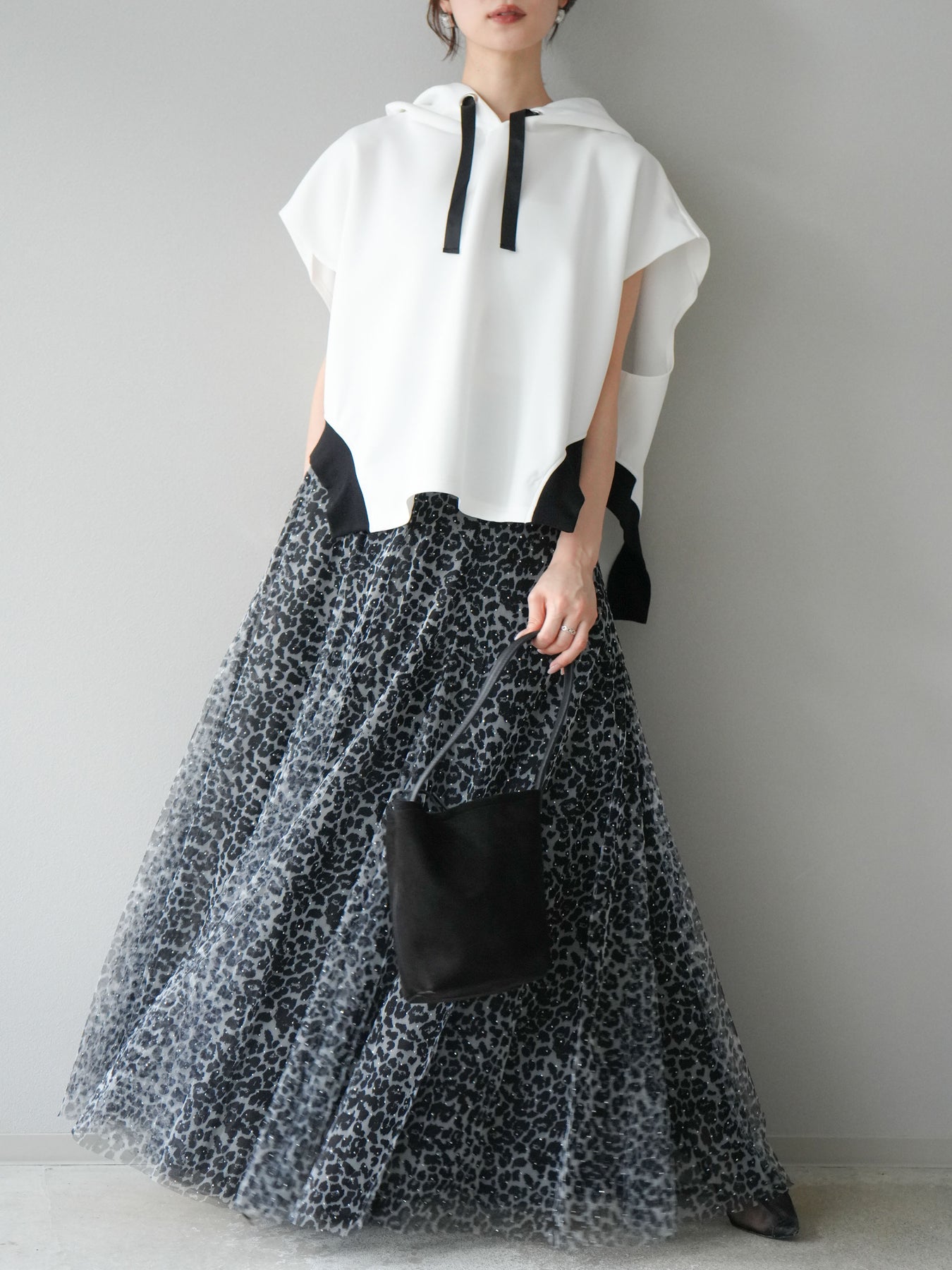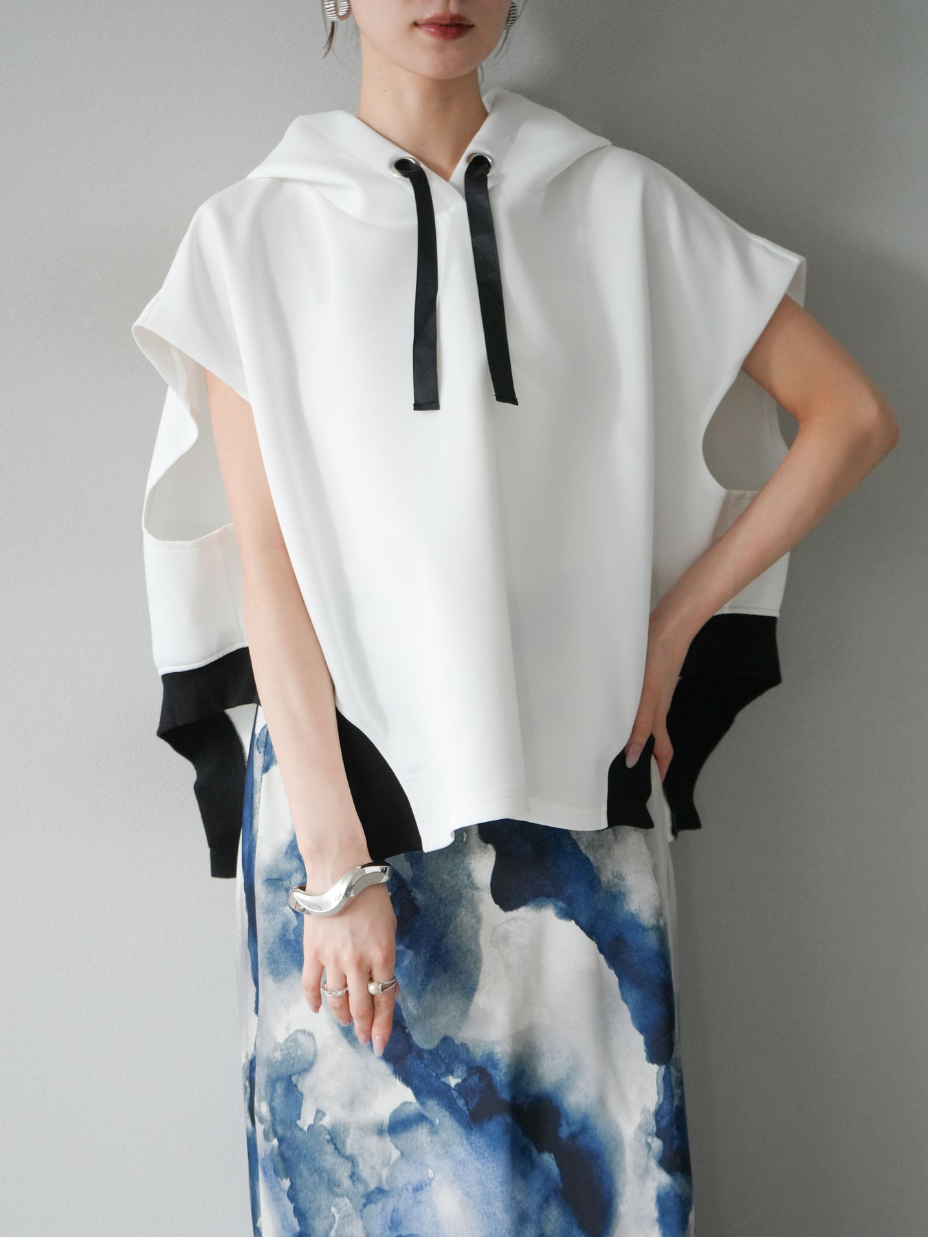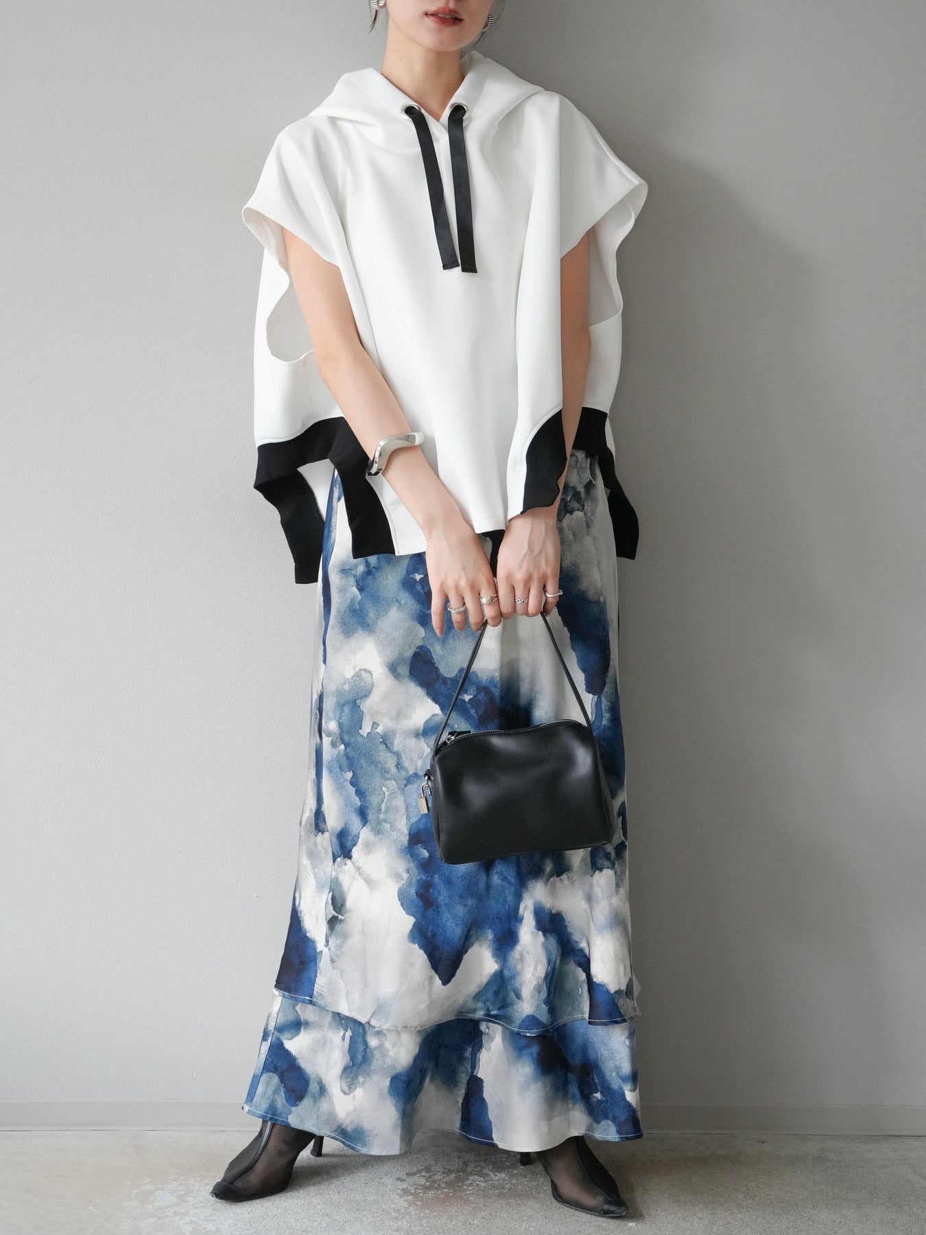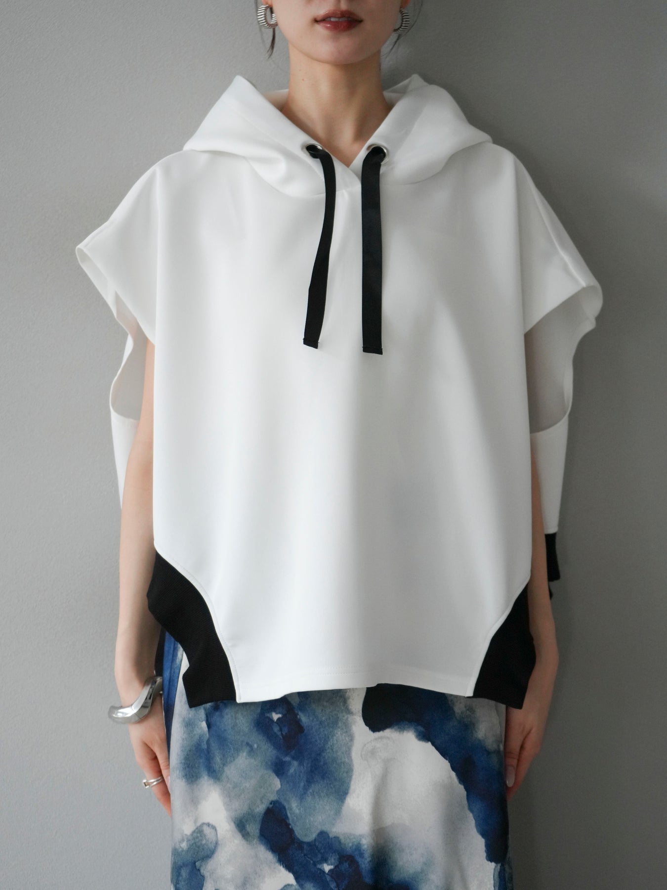 アシンメトリーな裾ラインが印象的なドルマンフーディー。ゆったりとしたシルエットと落ち感のある生地がリラックス感を与えつつ、モードな雰囲気も漂わせます。背面にはZIPを配し、開閉によってスタイリングに変化をつけられるデザイン性の高い一枚。ドロップショルダーとワイドスリーブが抜け感を演出し、カットソーやシャツを合わせたレイヤードスタイルにも好相性。軽やかに羽織れるため、カジュアルからきれいめまで幅広く活躍するアイテムです。 ※ボトムス、キャミソール(インナー)以外の商品は一律でインナーは付属していません。