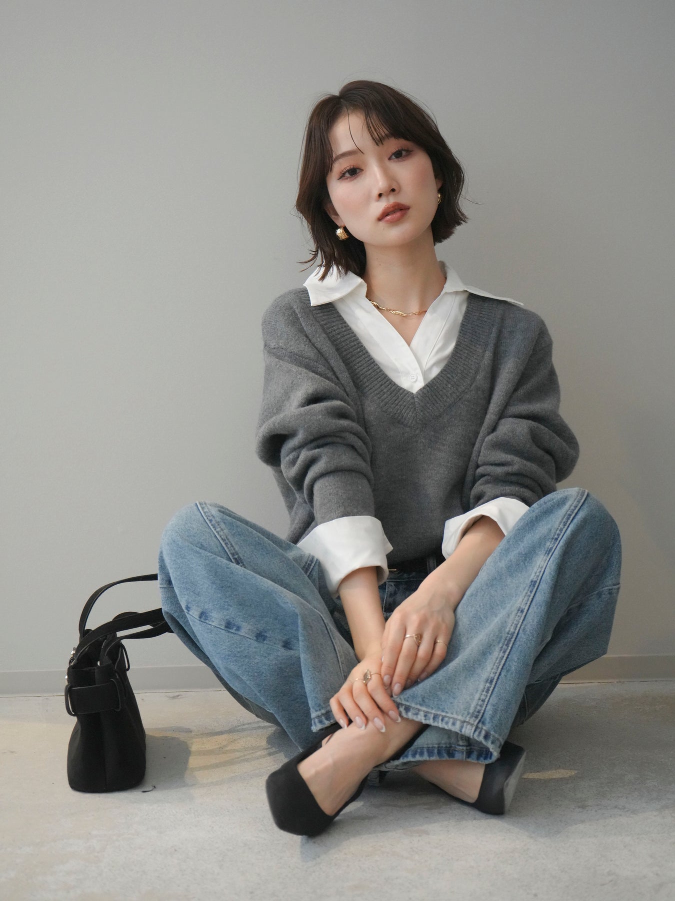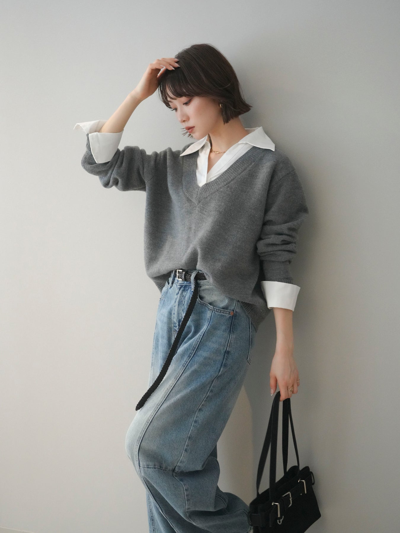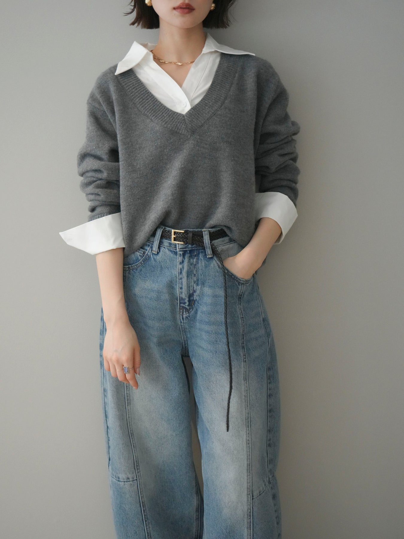 [予約]シャツドッキングVネックニットトップス/gray
