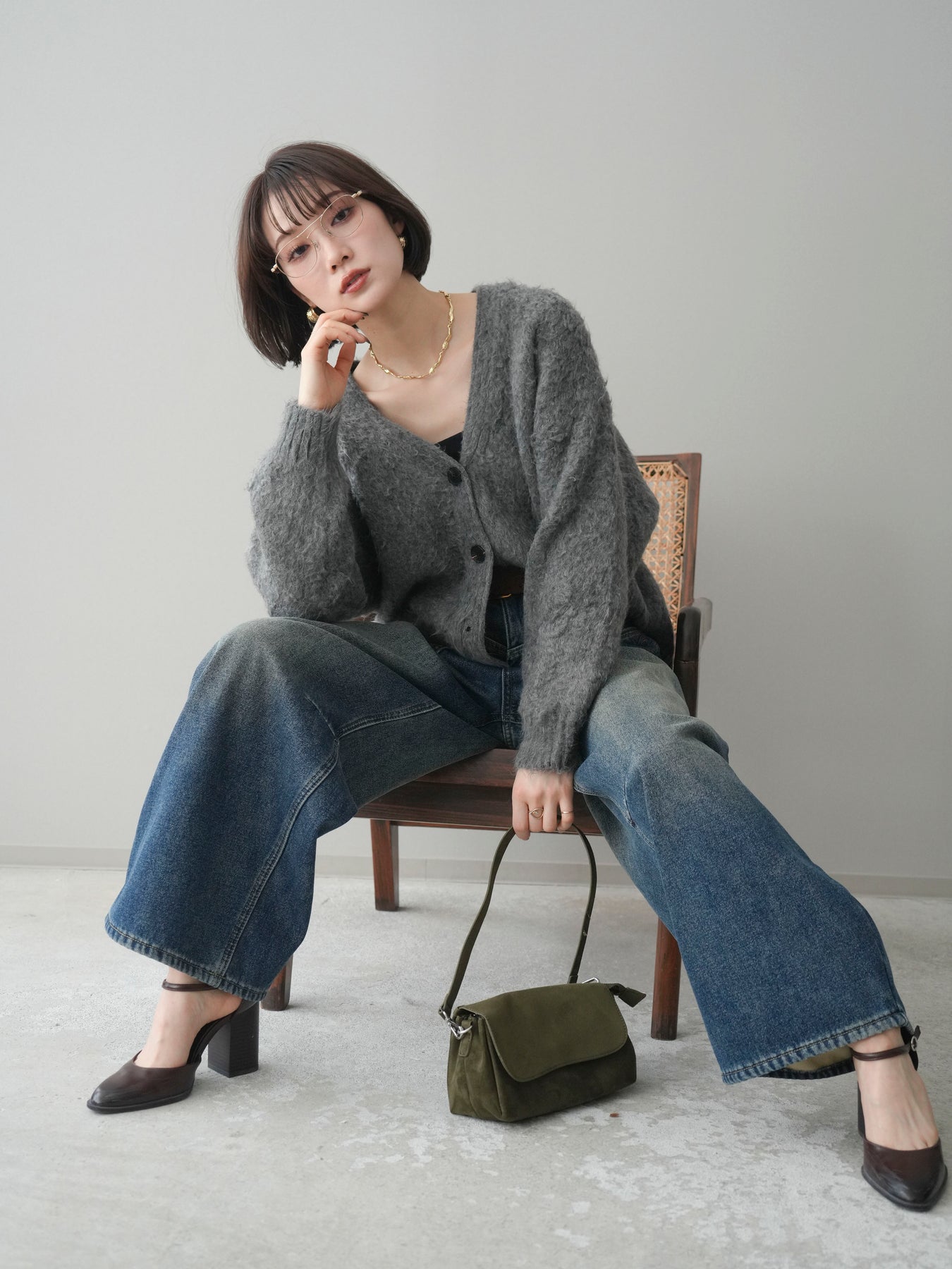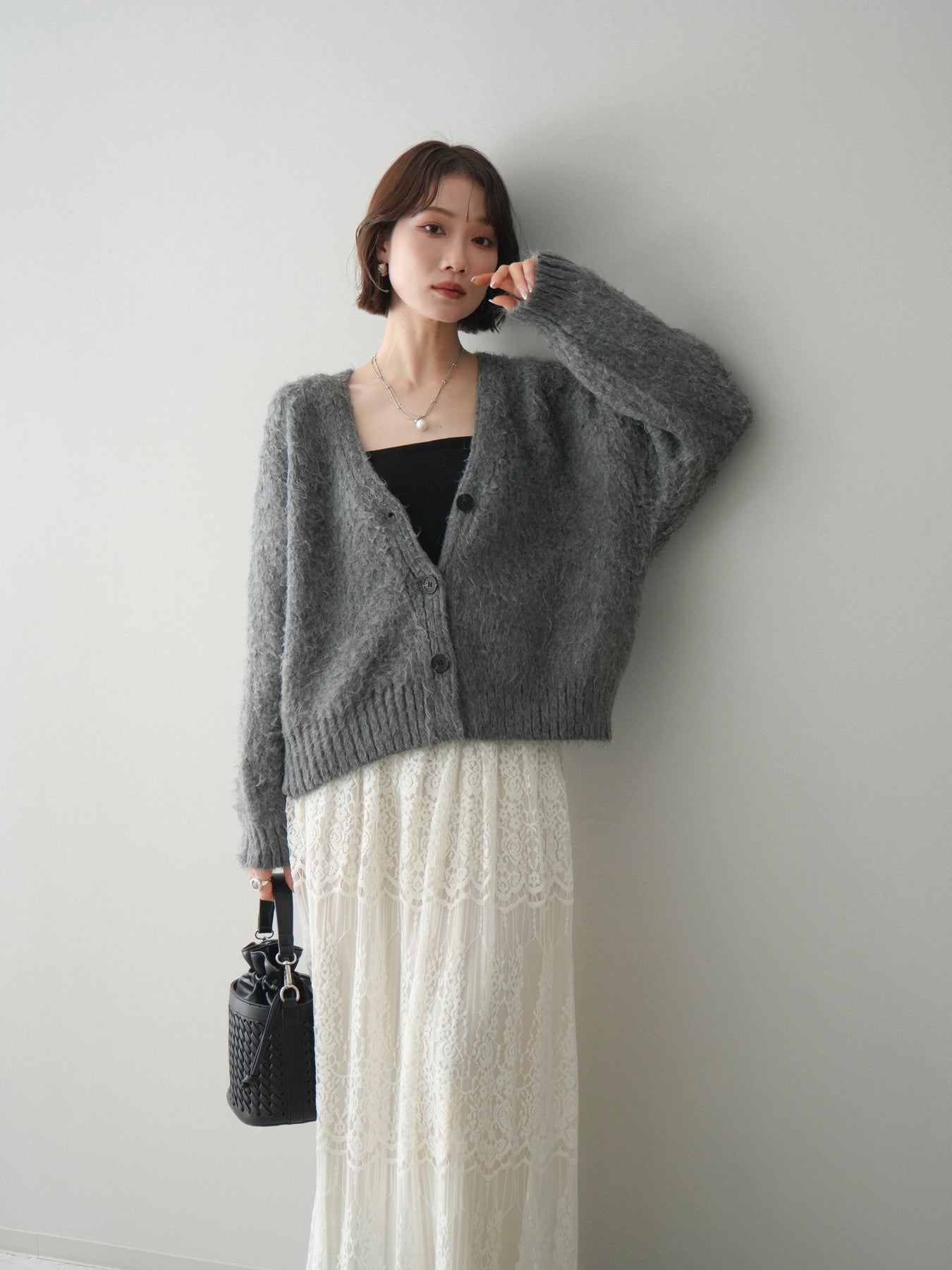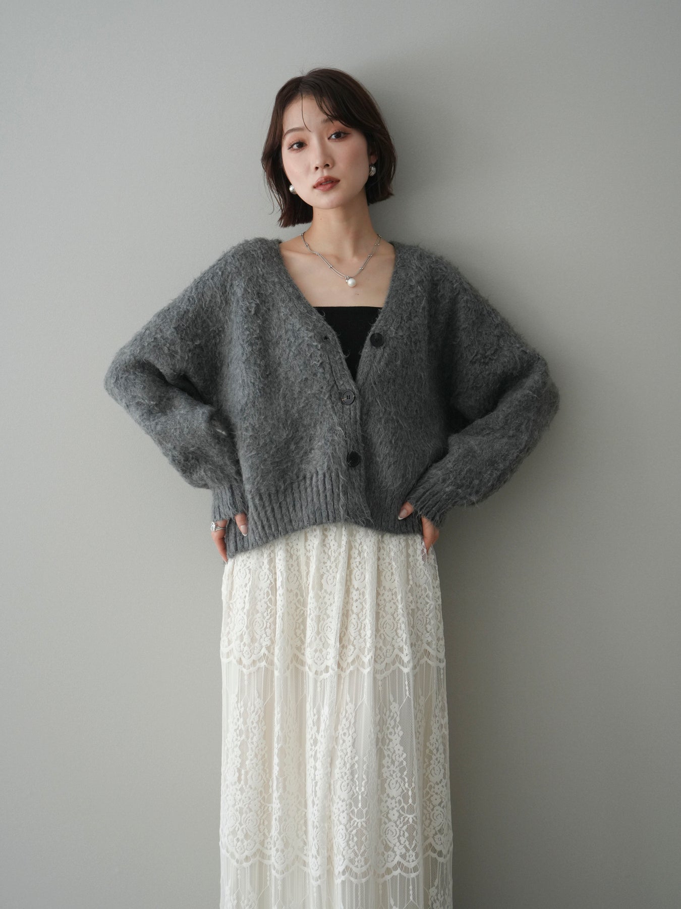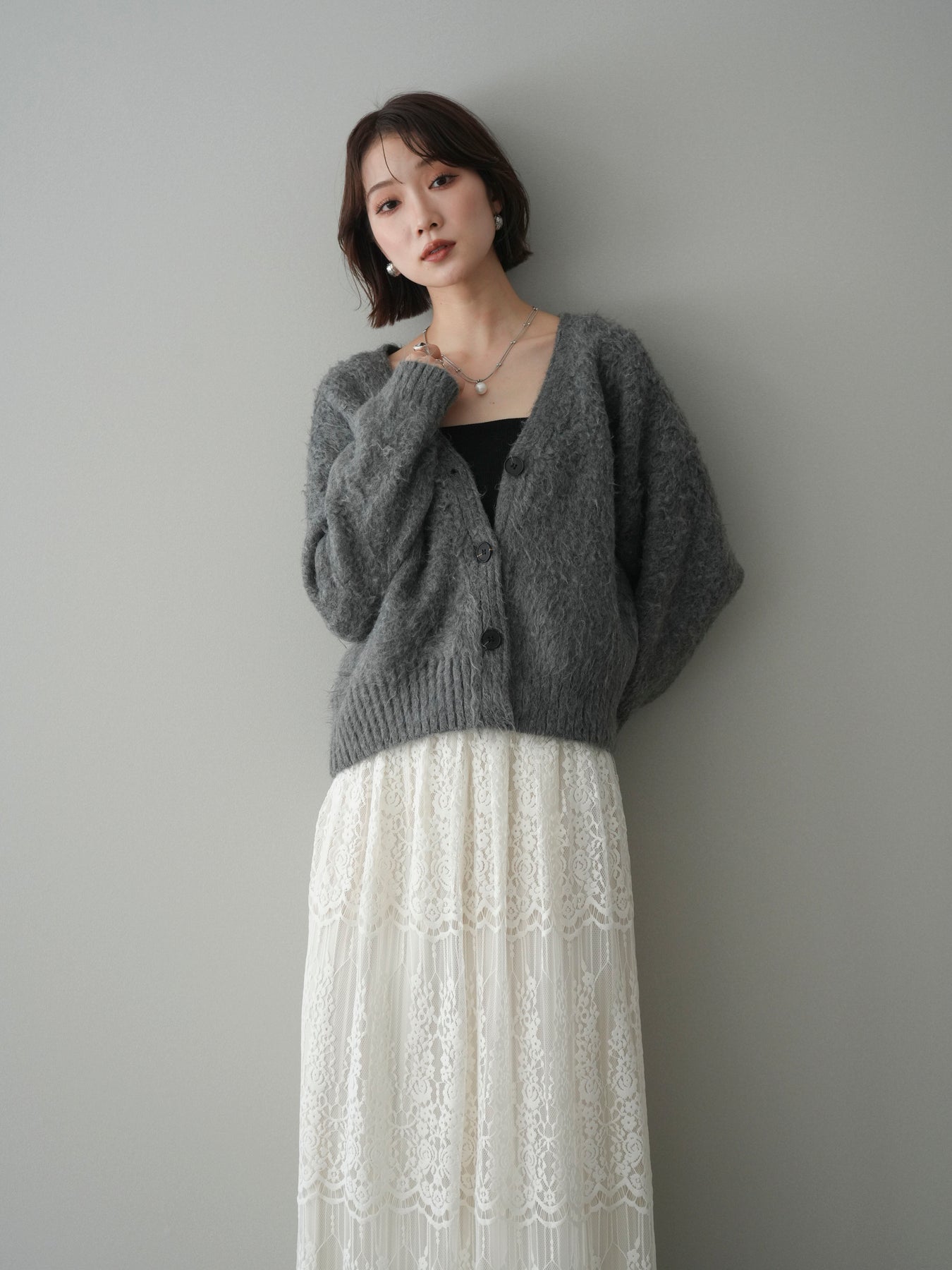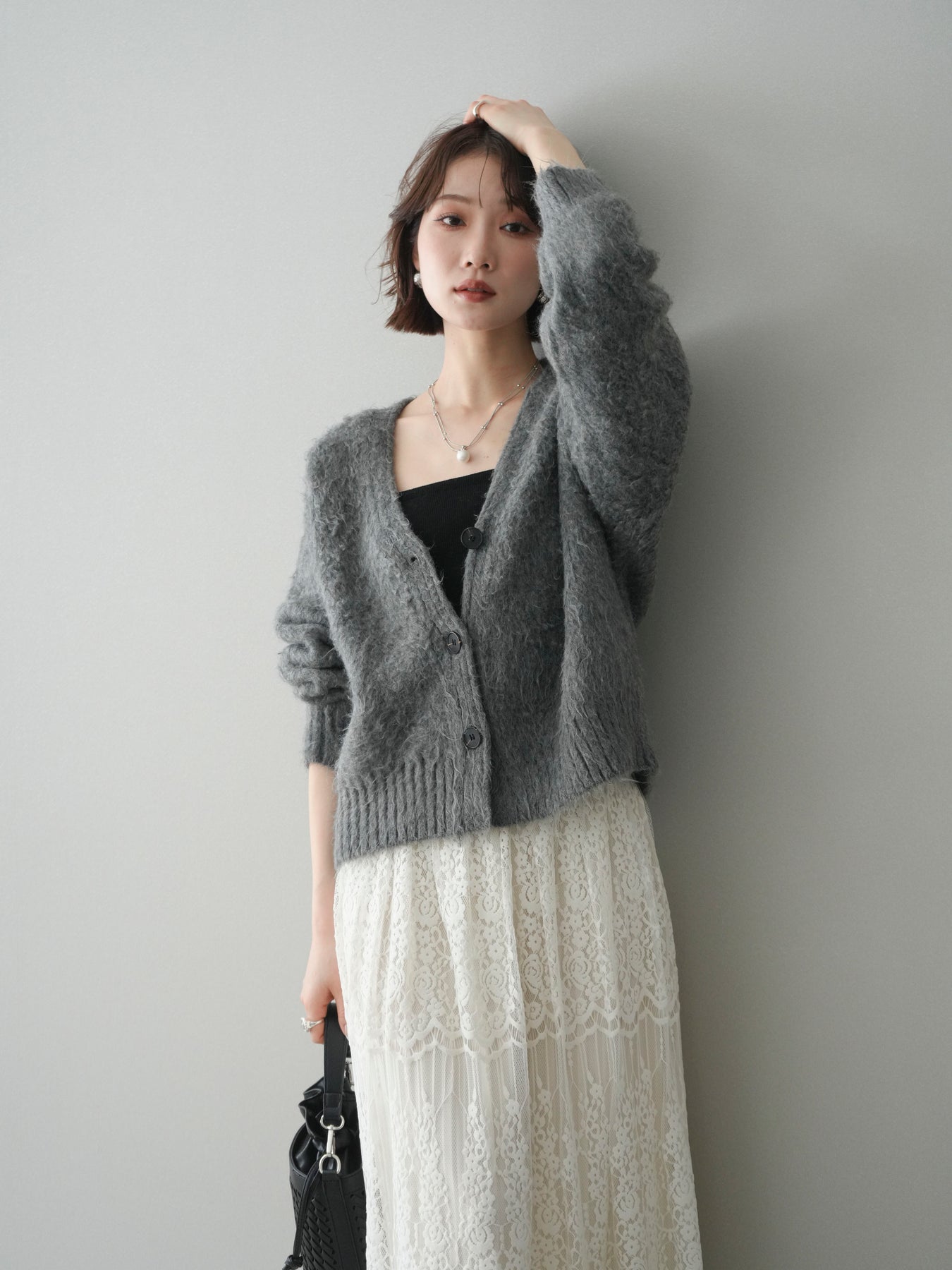 ふんわりとした起毛感が魅力のシャギーニットカーディガン。柔らかな風合いと程よい毛足が、シンプルなスタイリングにも季節感と女性らしいニュアンスをプラスします。ゆとりのあるシルエットで体のラインを拾いにくく、前を留めてトップスとしても、軽く羽織ってもバランス良く着用可能。Vネックデザインが顔まわりをすっきりと見せ、デニムからスカートまで幅広いボトムスと相性良く合わせられる一着です。デイリー使いからお出かけまで活躍します。 ※ボトムス、キャミソール(インナー)以外の商品は一律でインナーは付属していません。
