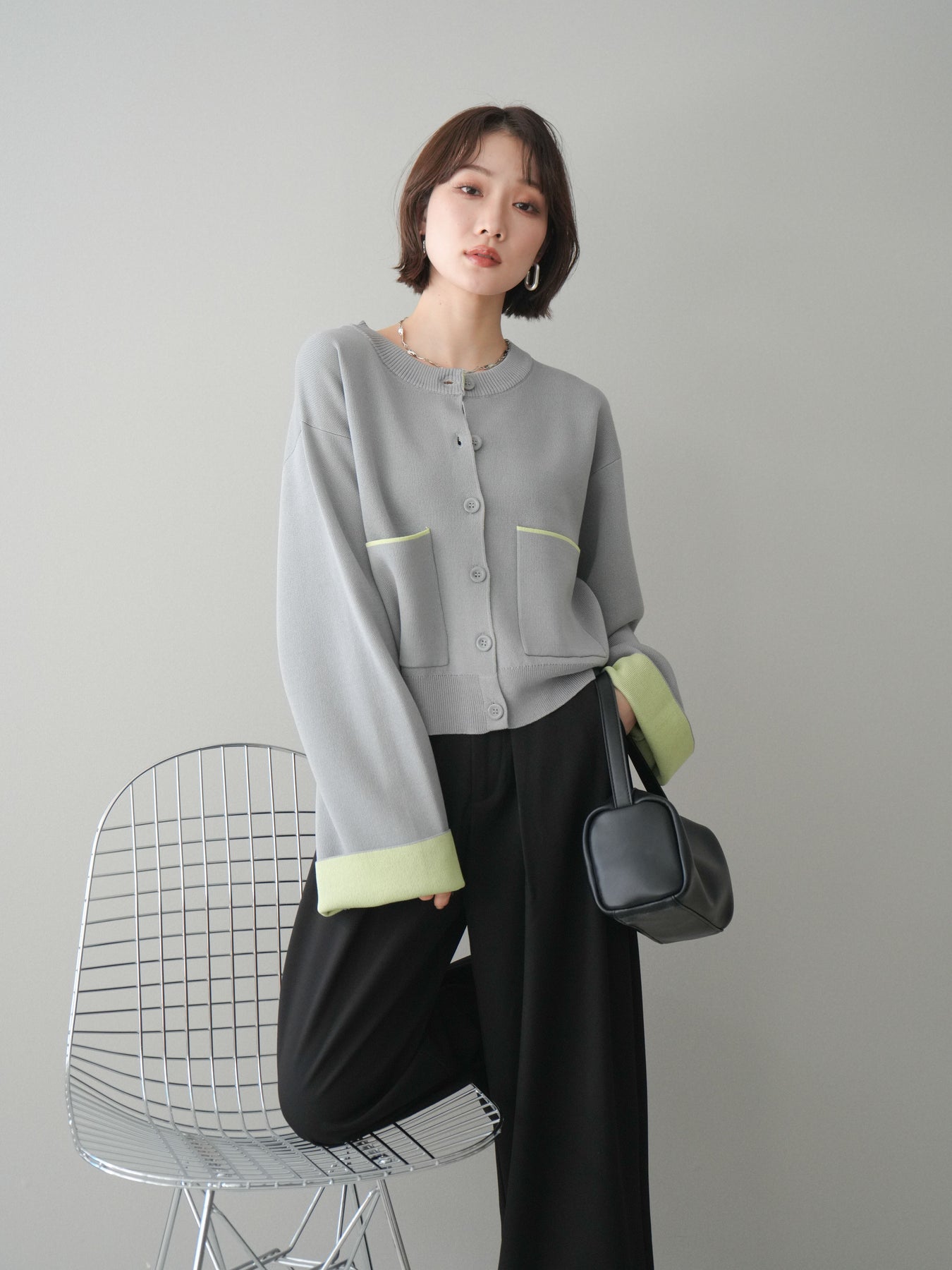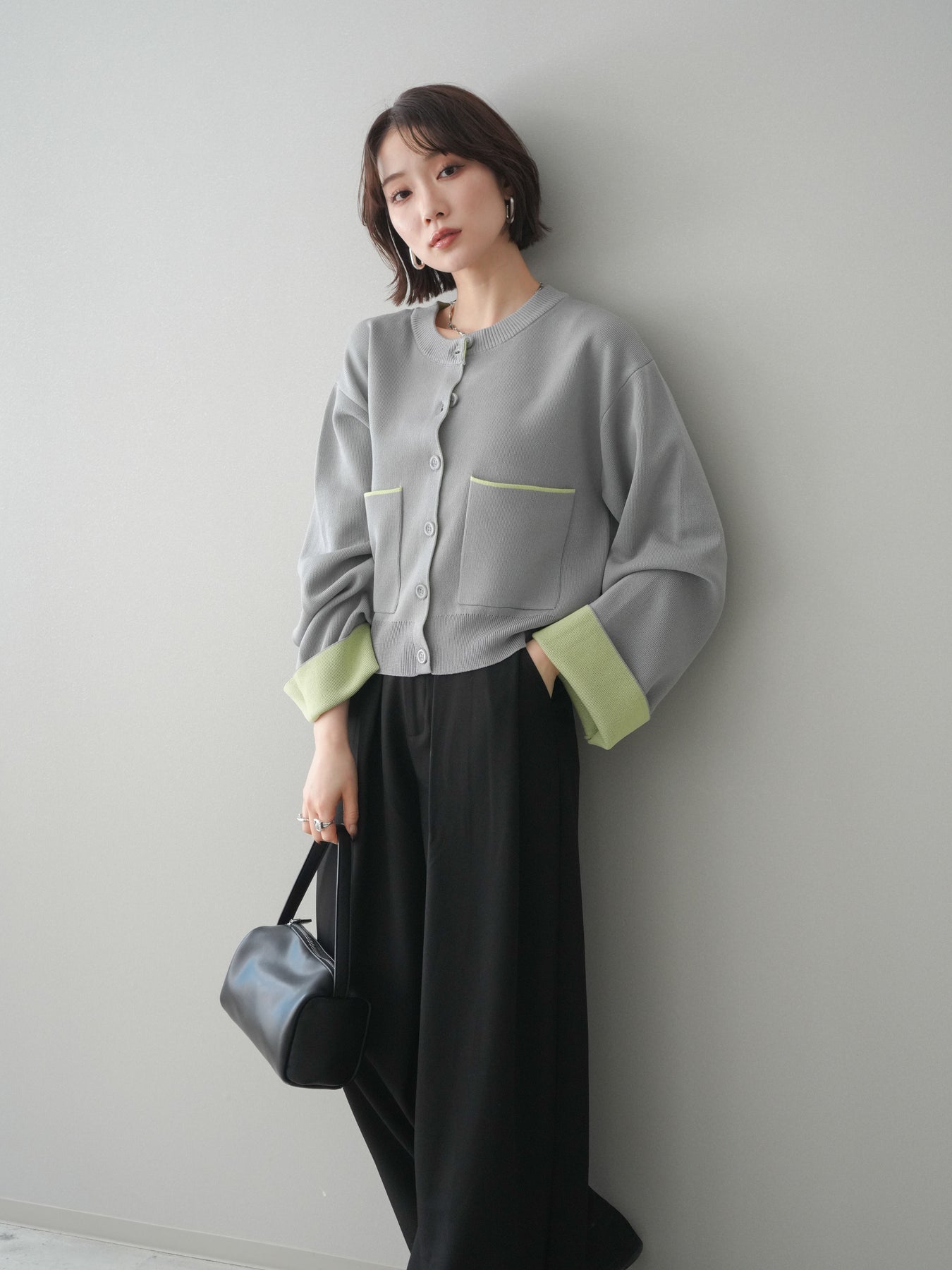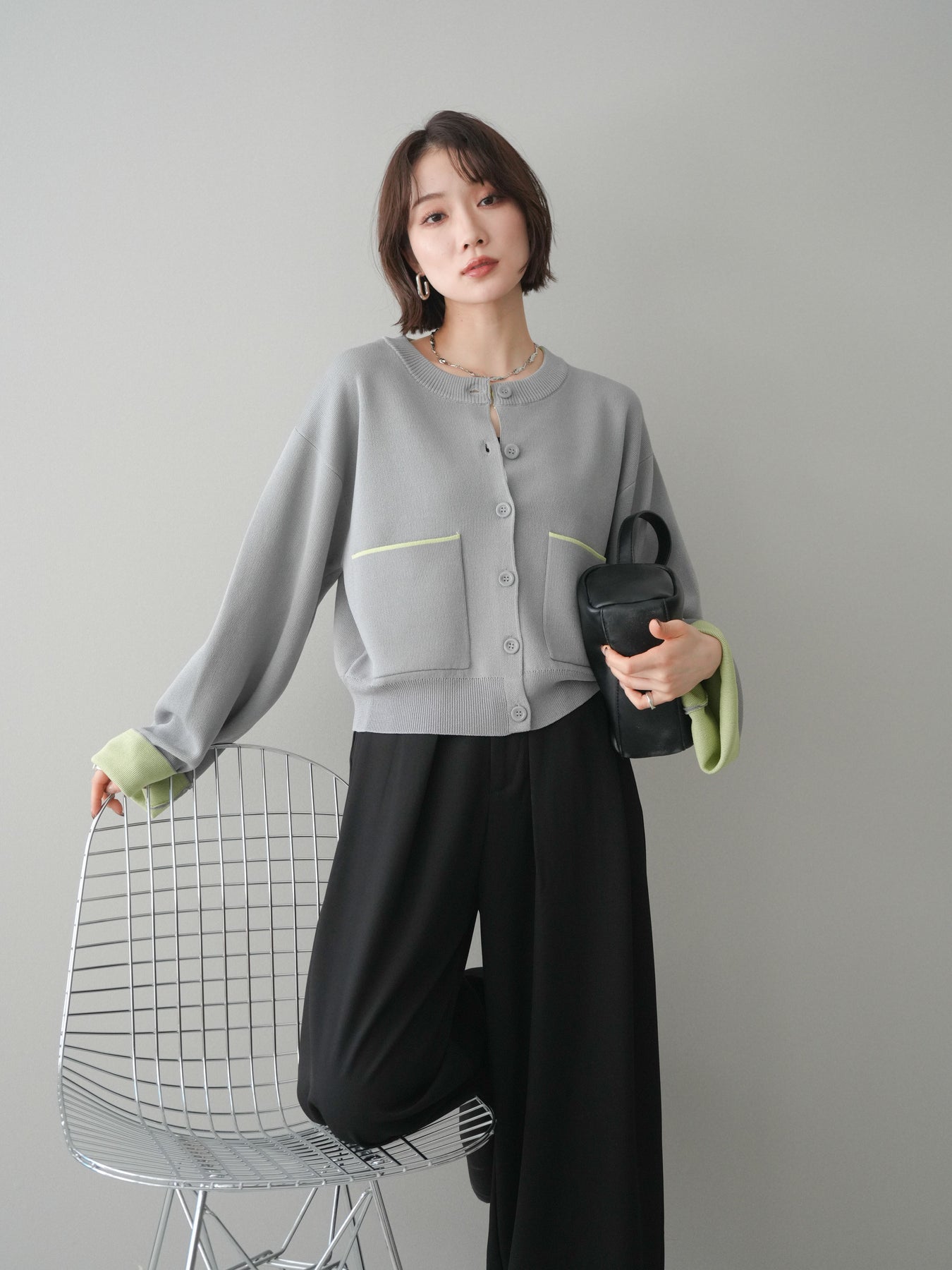 滑らかな肌触りのレーヨンポリ素材を使用した、ダブルフェイス仕様のニットカーディガン。程よく厚みのある編み地が立体的なシルエットを生み、羽織るだけでこなれた印象に仕上がります。袖口やポケットにさりげなく配した配色ディテールがアクセントとなり、シンプルながらも表情のあるデザインに。前を留めてトップスとしても、軽く羽織ってもバランス良く着用でき、デイリーからきれいめスタイルまで幅広く活躍する一着です。 ※ボトムス、キャミソール(インナー)以外の商品は一律でインナーは付属していません。
