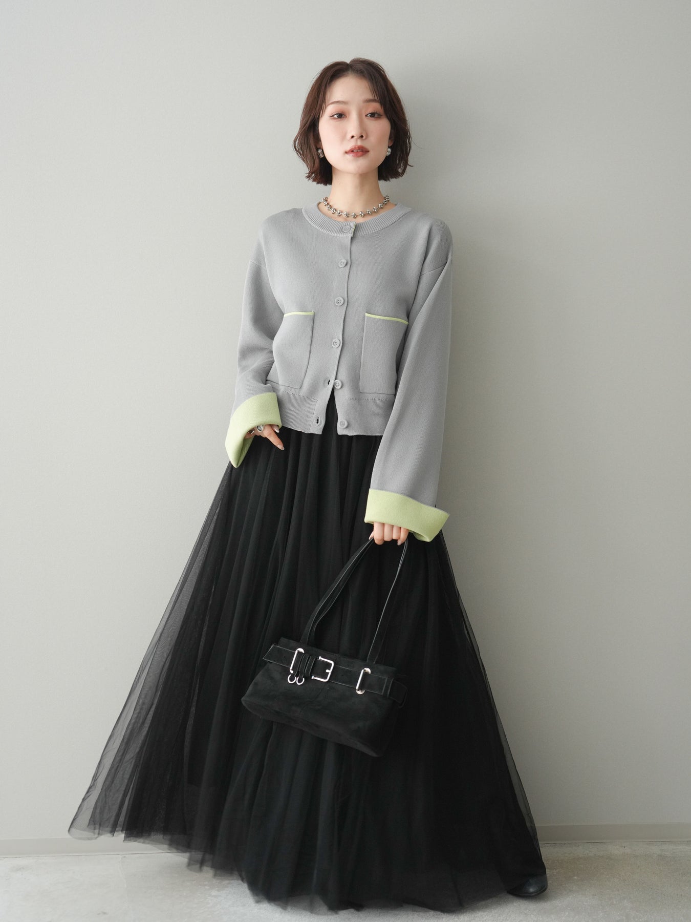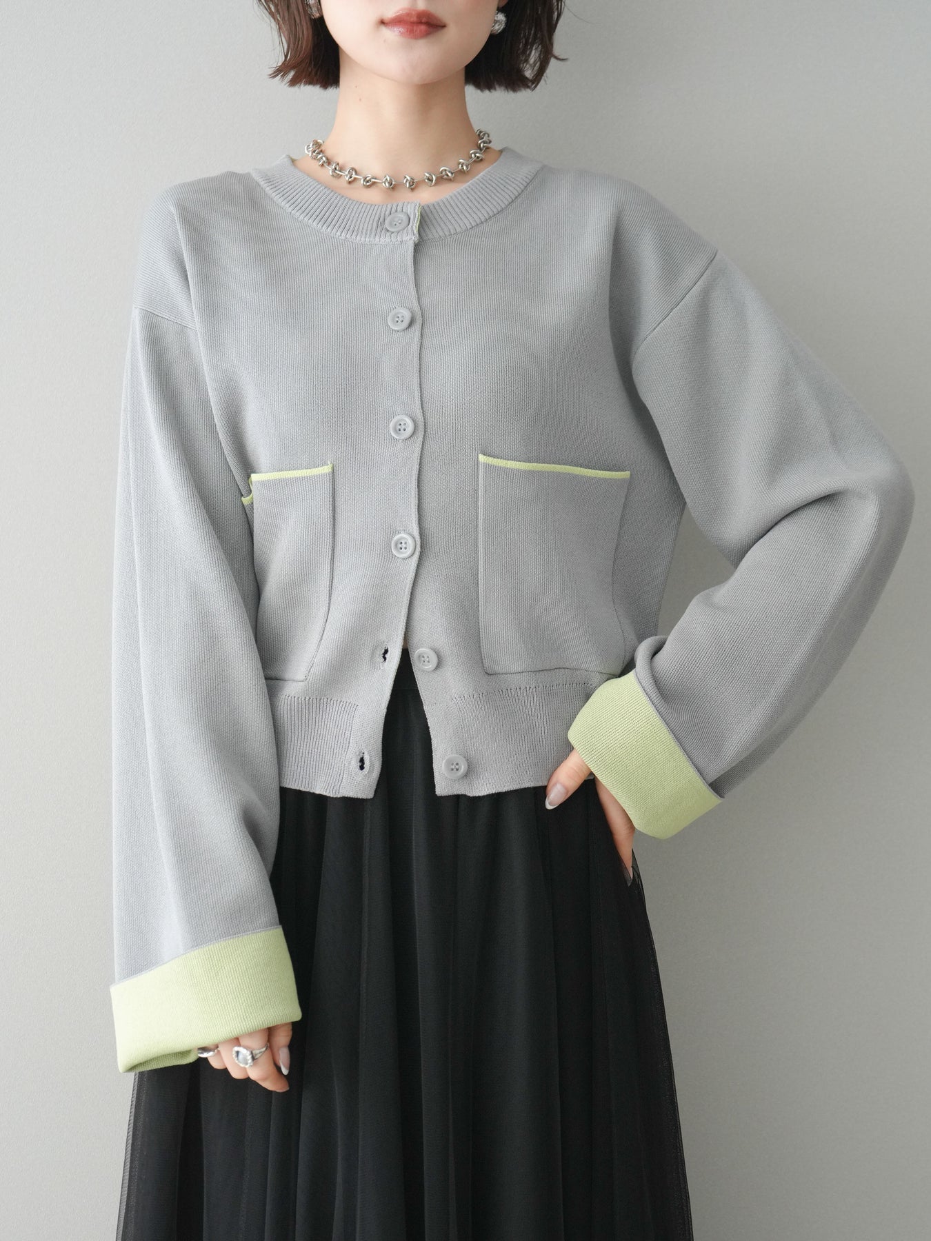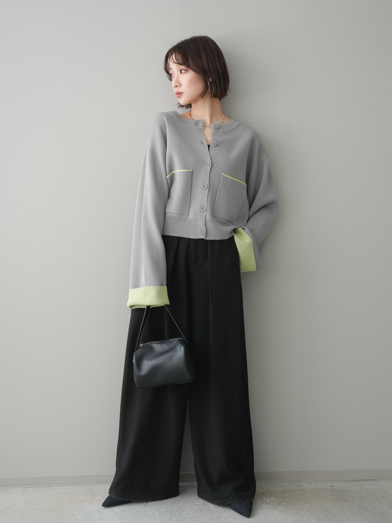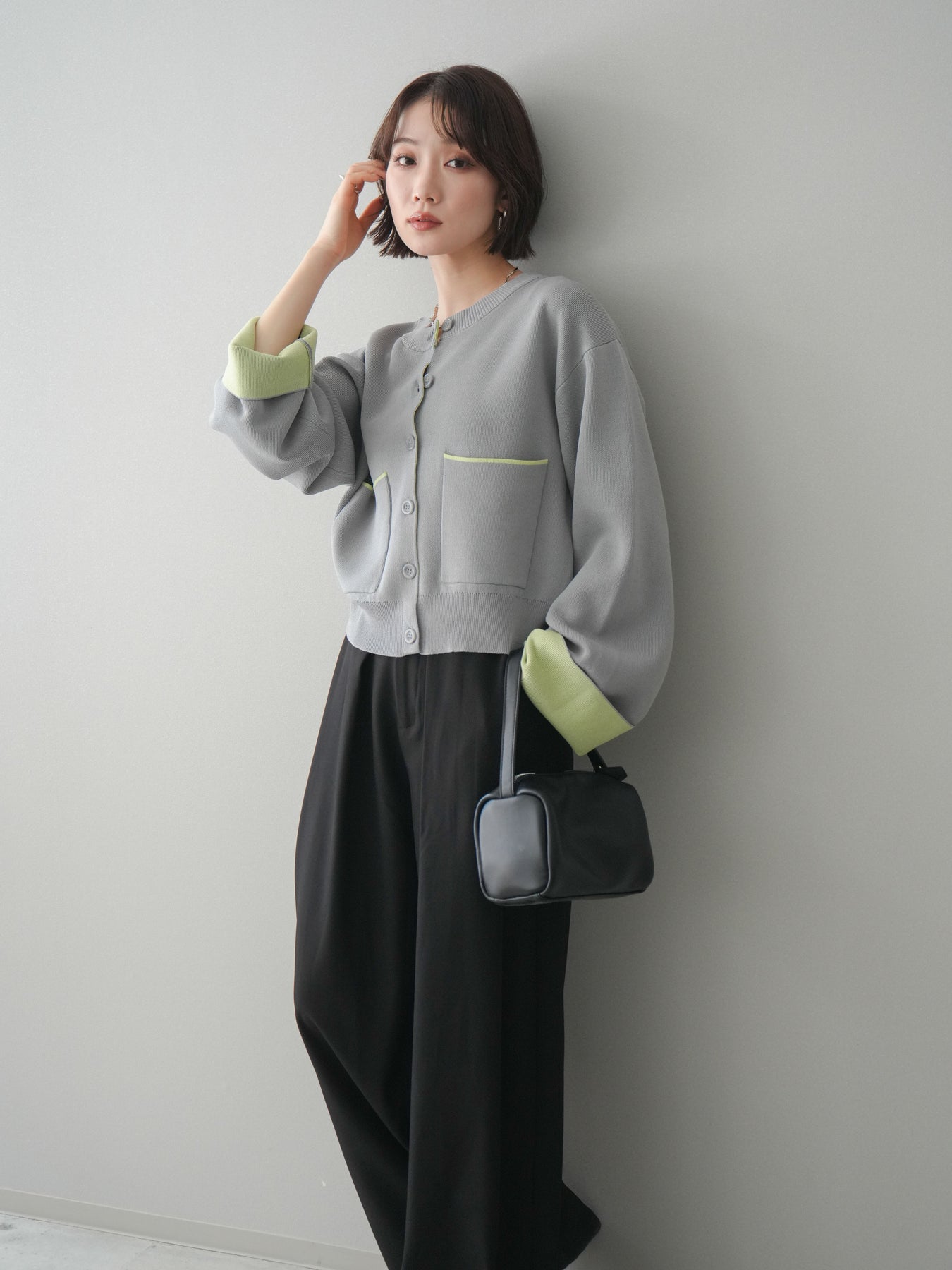滑らかな肌触りのレーヨンポリ素材を使用した、ダブルフェイス仕様のニットカーディガン。程よく厚みのある編み地が立体的なシルエットを生み、羽織るだけでこなれた印象に仕上がります。袖口やポケットにさりげなく配した配色ディテールがアクセントとなり、シンプルながらも表情のあるデザインに。前を留めてトップスとしても、軽く羽織ってもバランス良く着用でき、デイリーからきれいめスタイルまで幅広く活躍する一着です。 ※ボトムス、キャミソール(インナー)以外の商品は一律でインナーは付属していません。