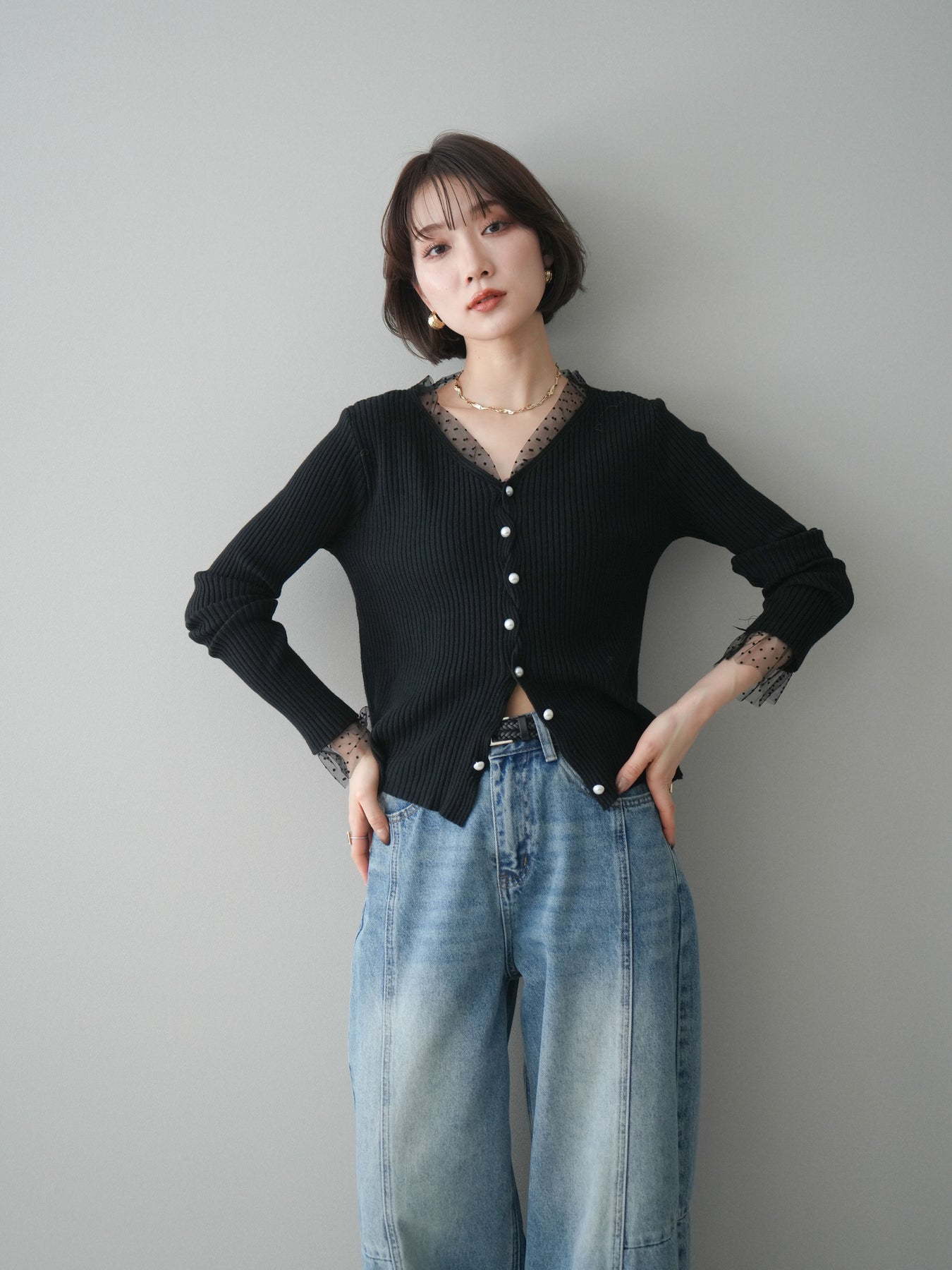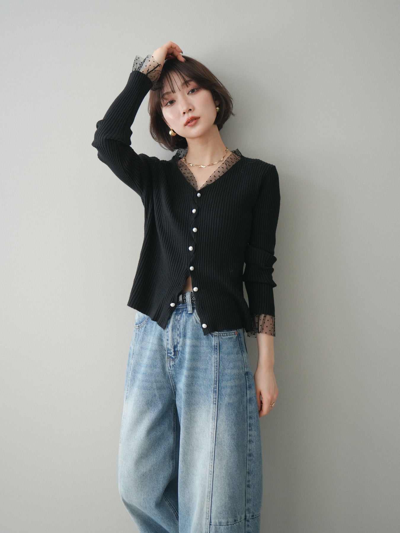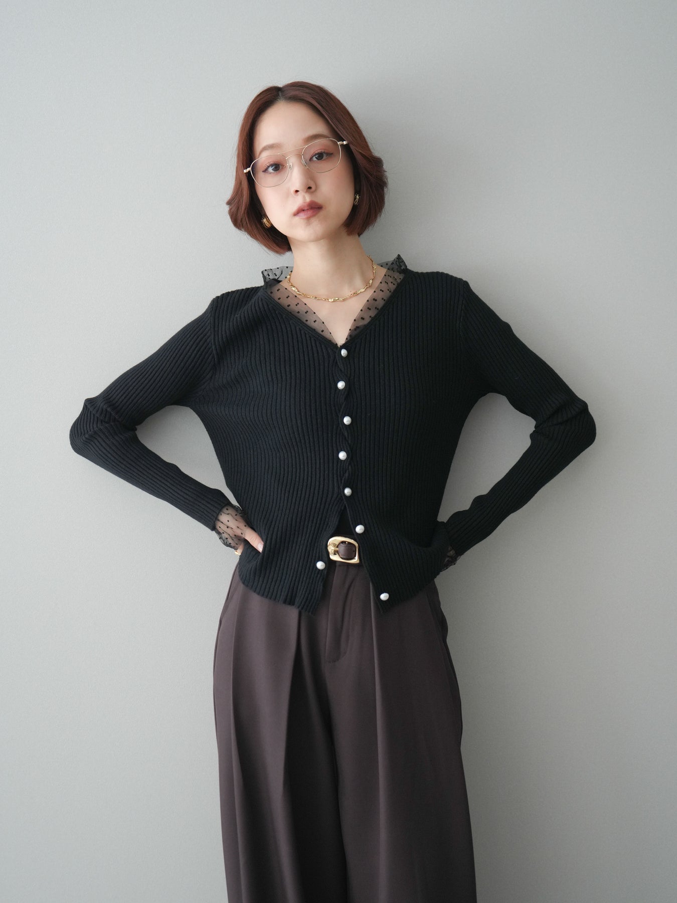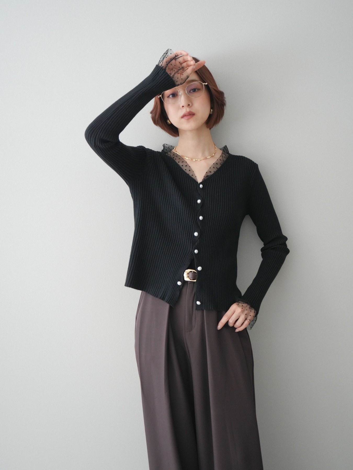 [予約]チュールドッキングパールボタンニットカーディガン/black