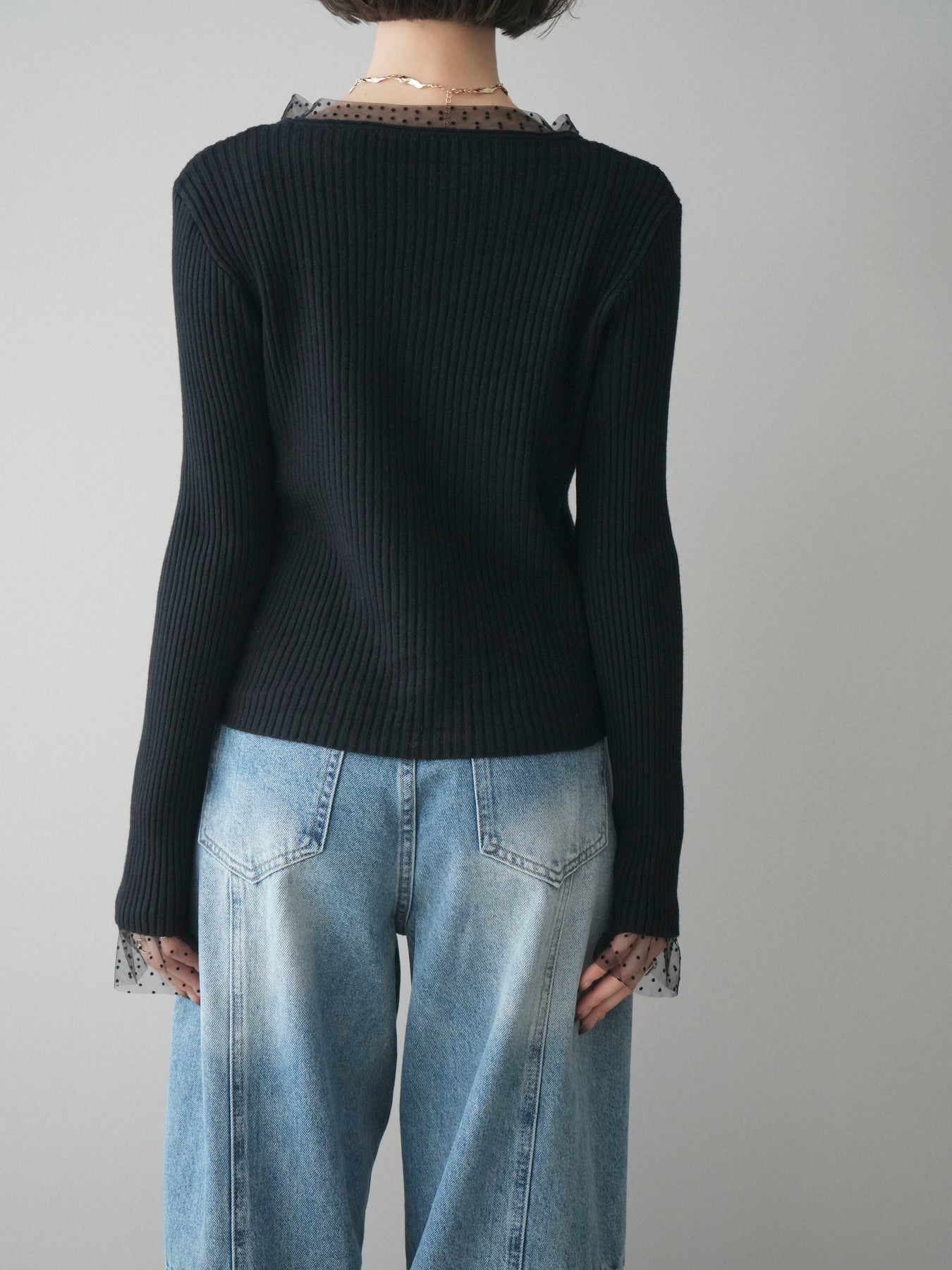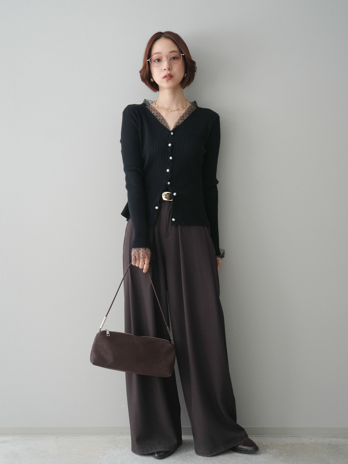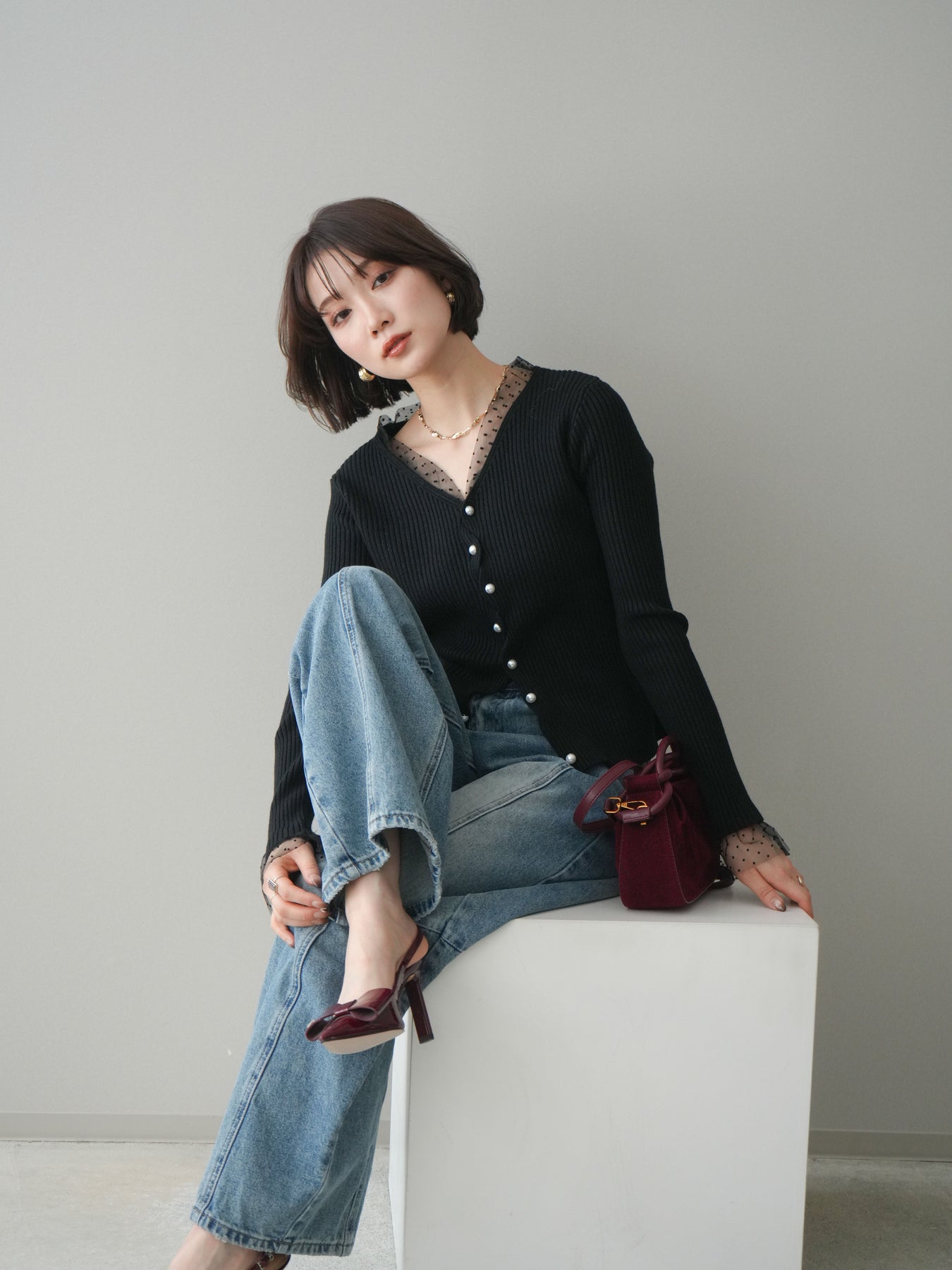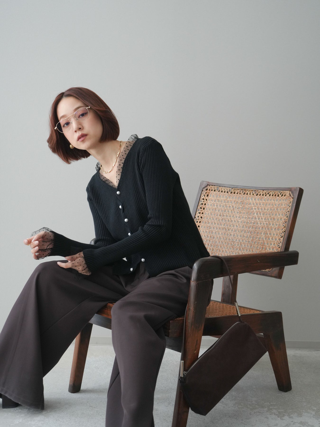 [予約]チュールドッキングパールボタンニットカーディガン/black