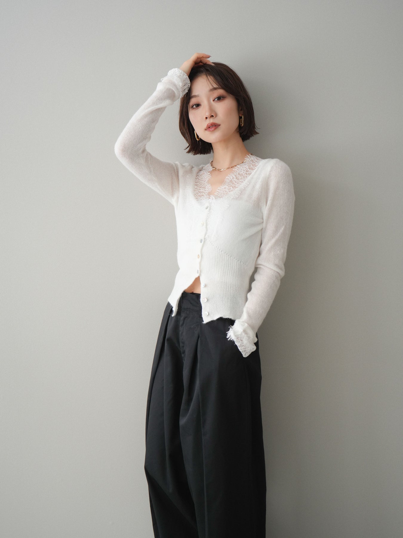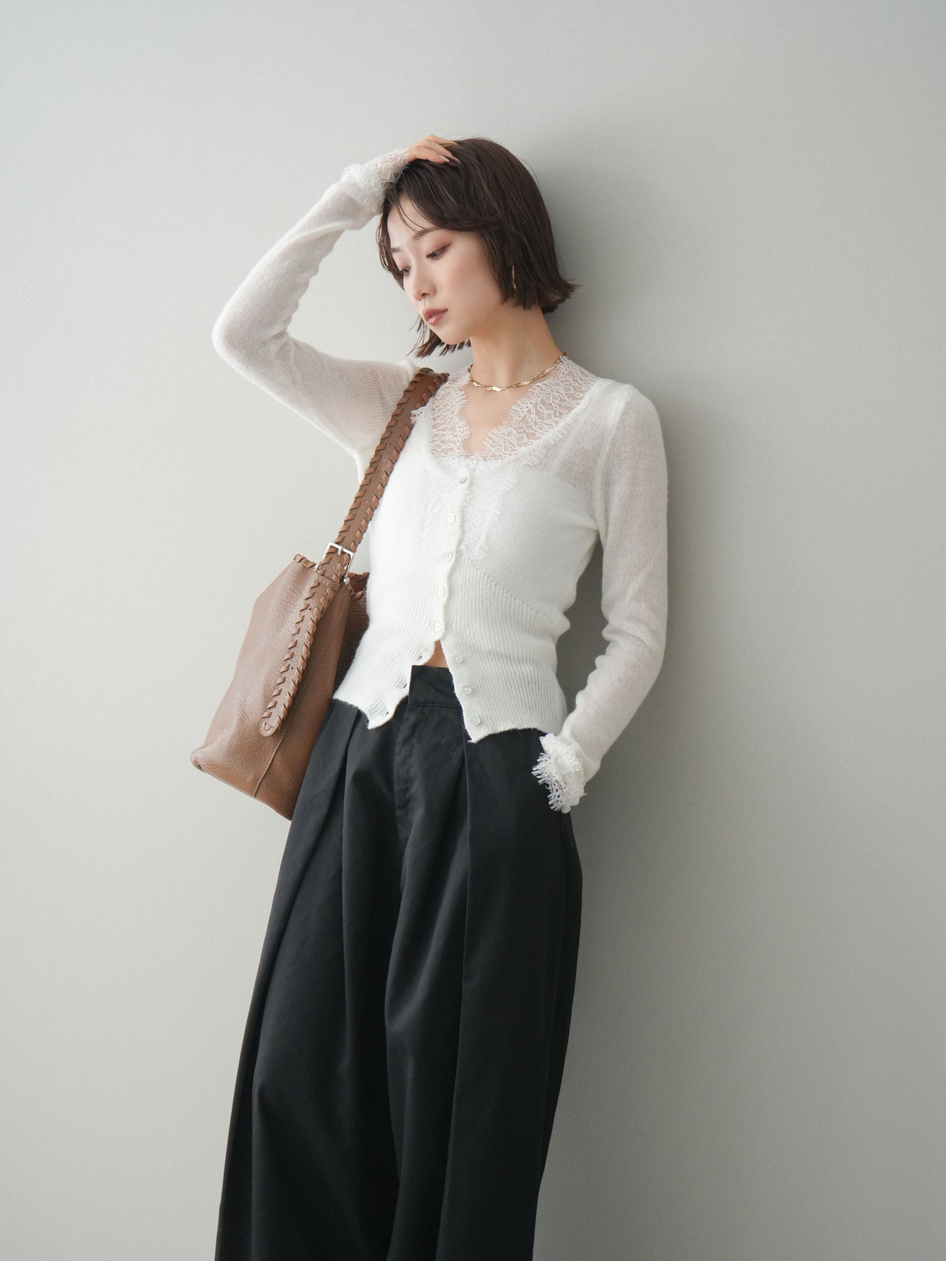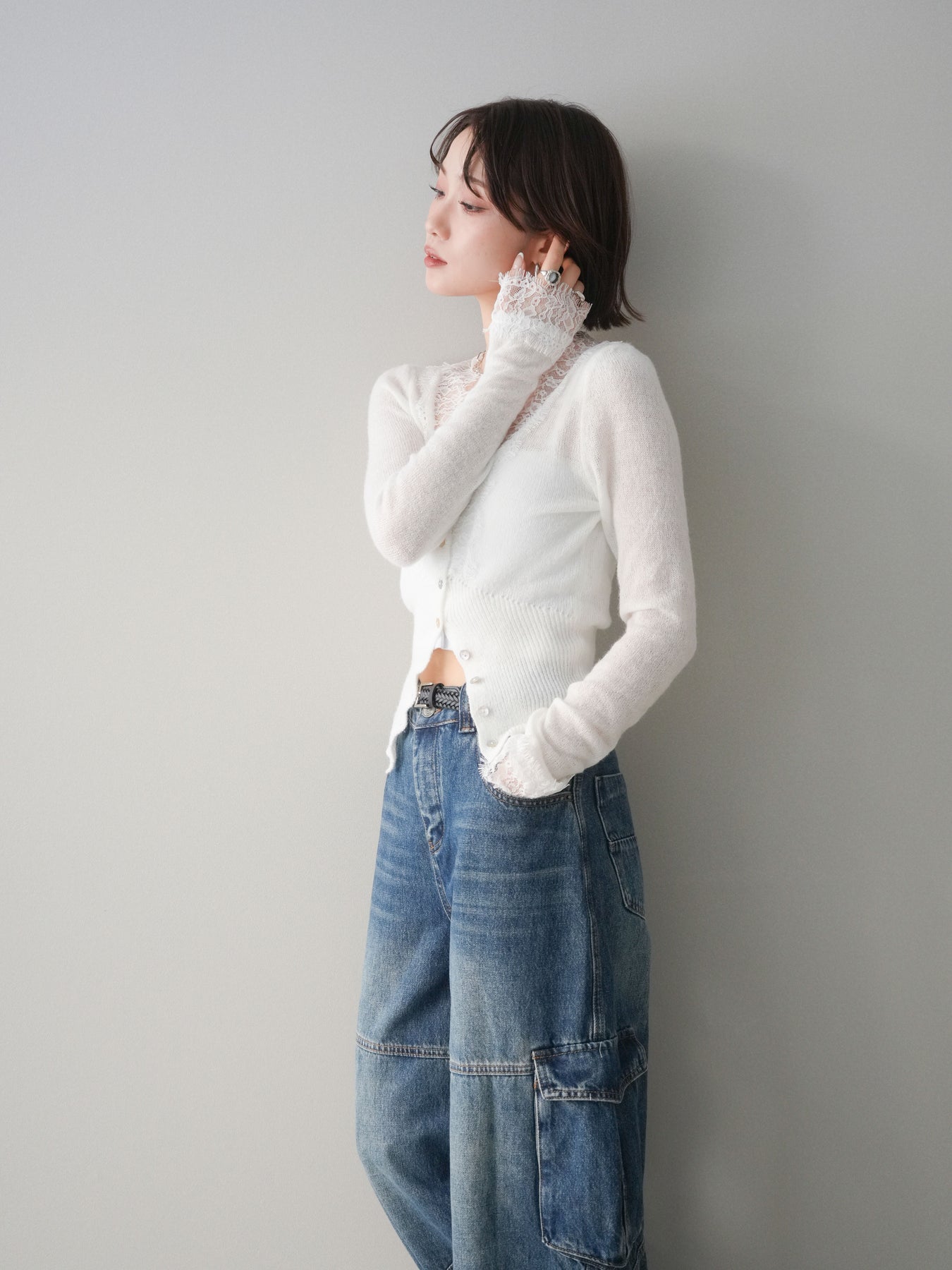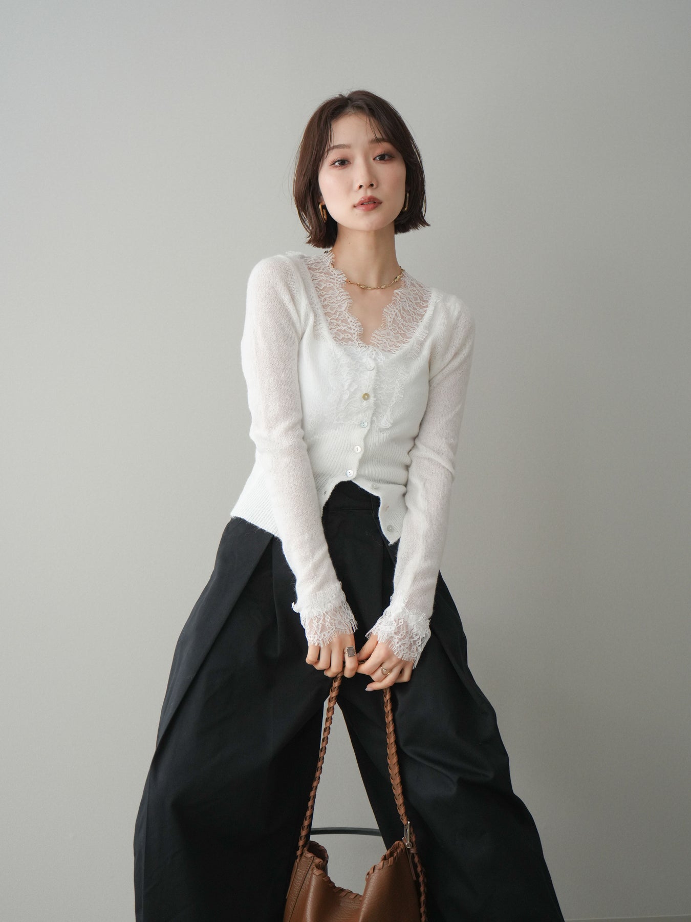 繊細なレース使いと、ふんわりとしたモヘアタッチの素材感が印象的なニットカーディガン。程よい透け感のある編地が軽やかさを演出し、レースをあしらったネックラインが顔まわりに上品な華やぎを添えます。コンパクトなシルエットながら、女性らしい立体感を感じさせる仕上がりで、ボタンを留めてトップス感覚でも、開けて羽織としても着用可能。シンプルなスタイリングに奥行きを与え、季節の変わり目にも重宝する一着です。 ※ボトムス、キャミソール(インナー)以外の商品は一律でインナーは付属していません。