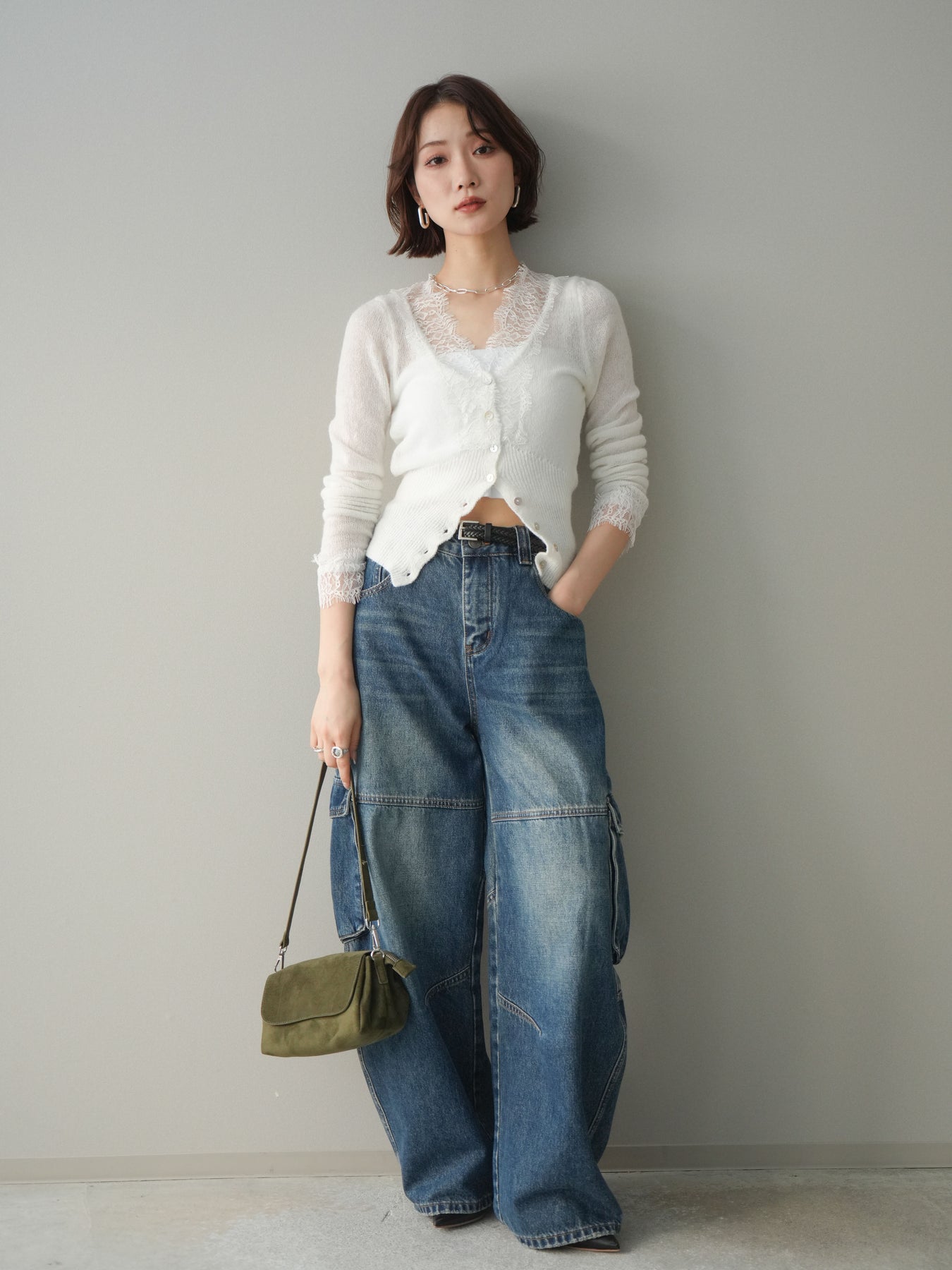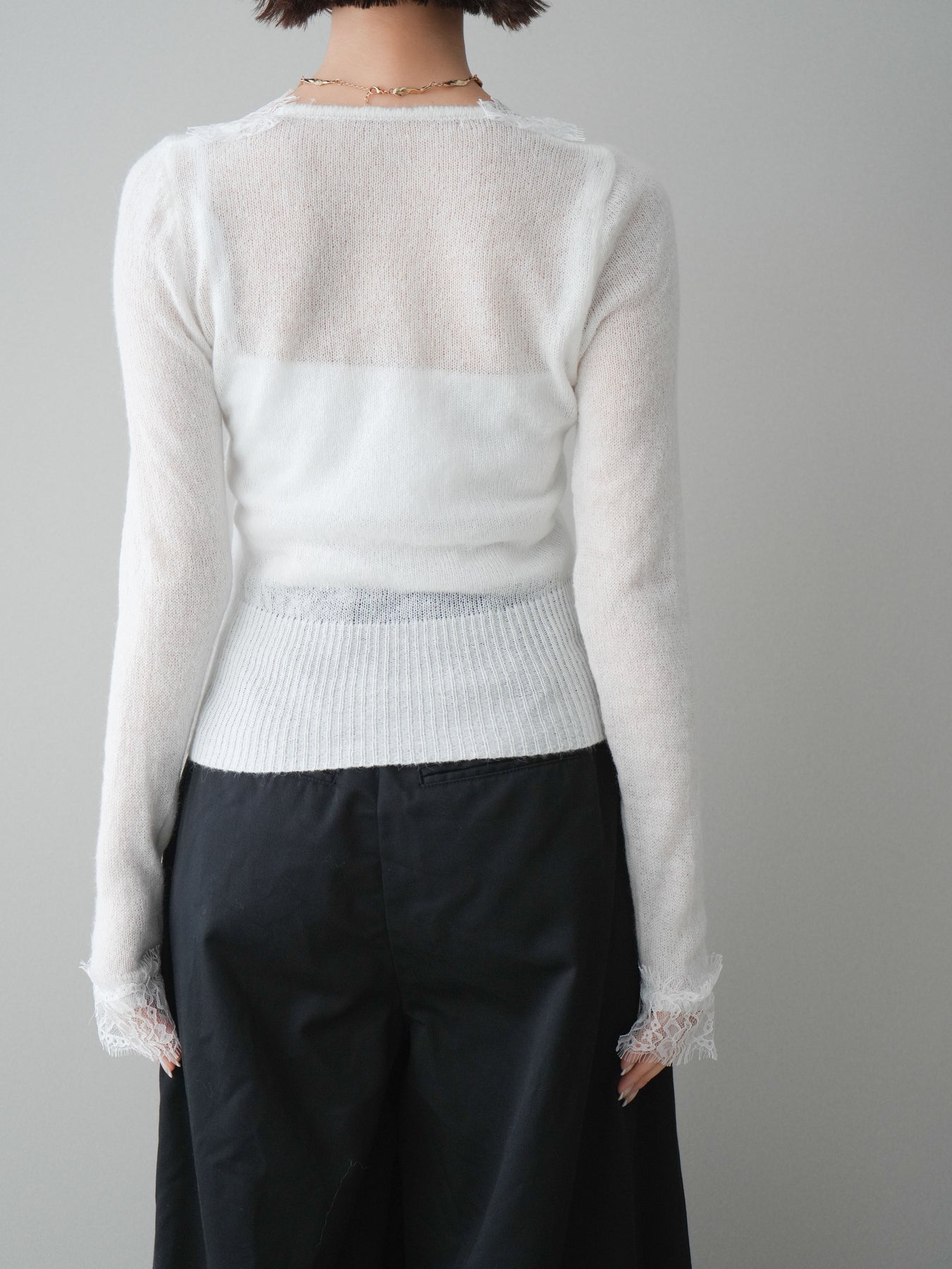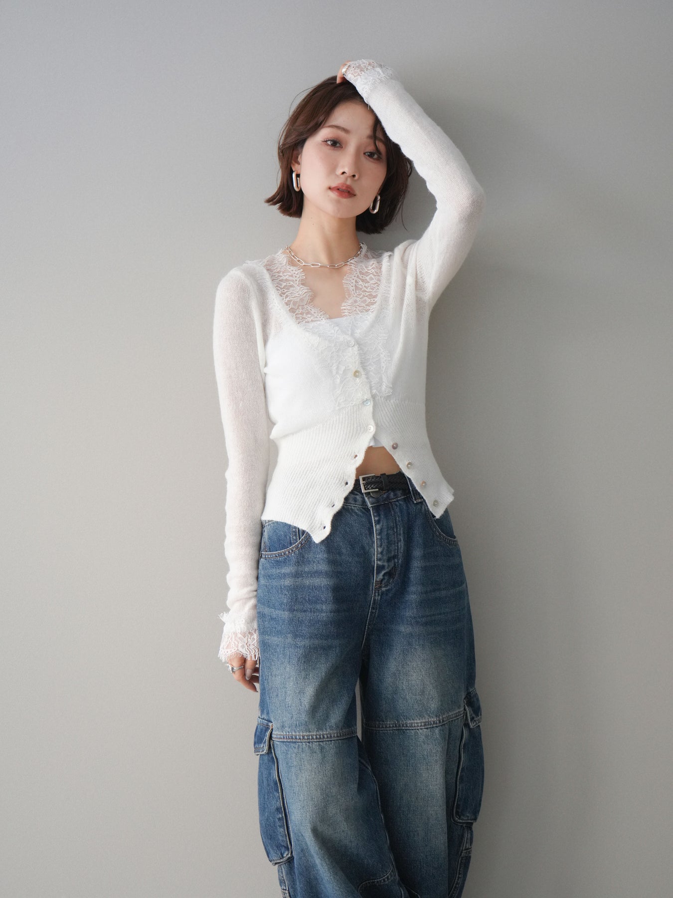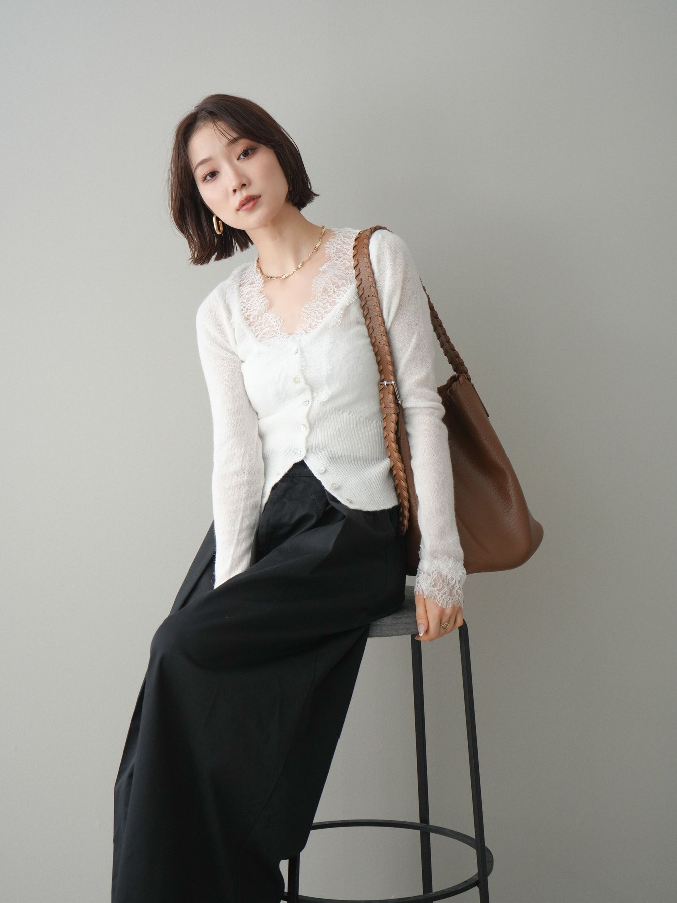 繊細なレース使いと、ふんわりとしたモヘアタッチの素材感が印象的なニットカーディガン。程よい透け感のある編地が軽やかさを演出し、レースをあしらったネックラインが顔まわりに上品な華やぎを添えます。コンパクトなシルエットながら、女性らしい立体感を感じさせる仕上がりで、ボタンを留めてトップス感覚でも、開けて羽織としても着用可能。シンプルなスタイリングに奥行きを与え、季節の変わり目にも重宝する一着です。 ※ボトムス、キャミソール(インナー)以外の商品は一律でインナーは付属していません。