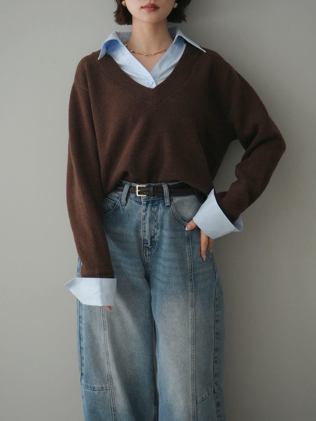 [予約]バックロゴ刺繍配色ステッチニットプルオーバー/brown
