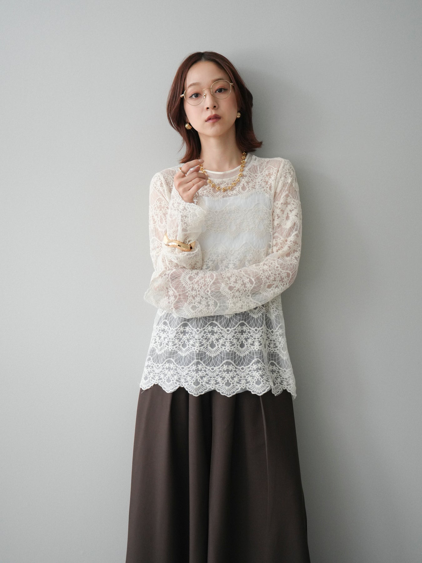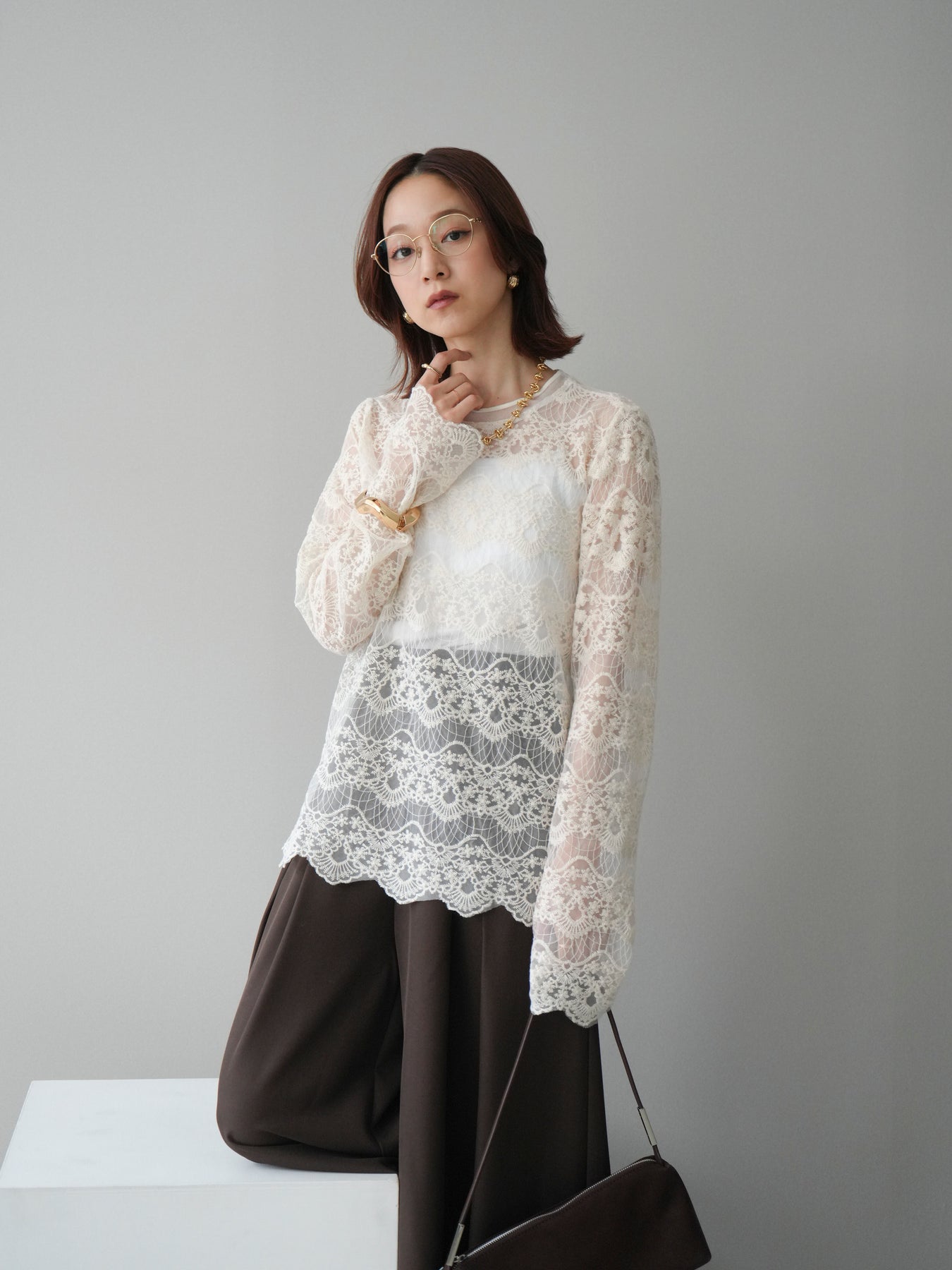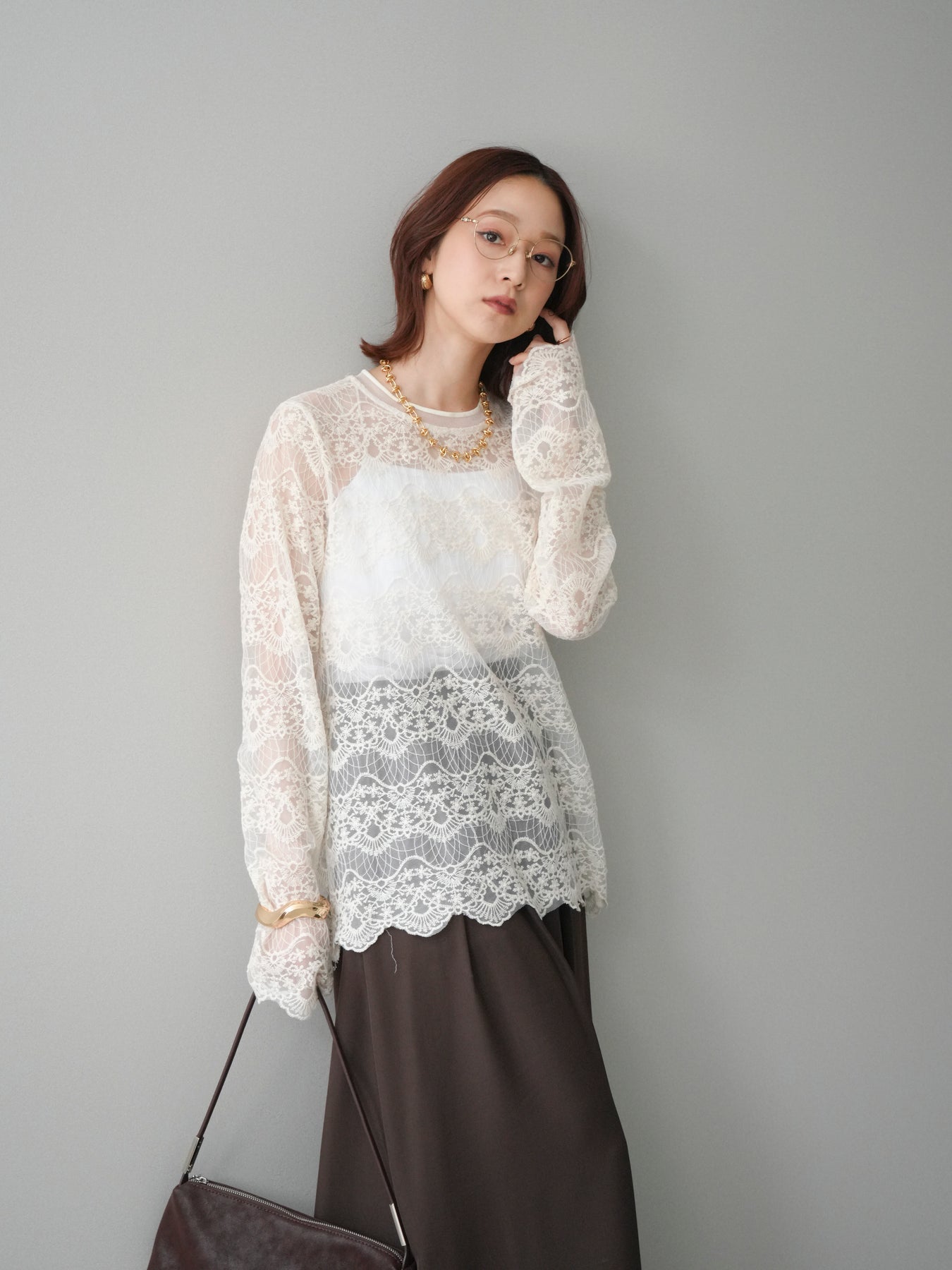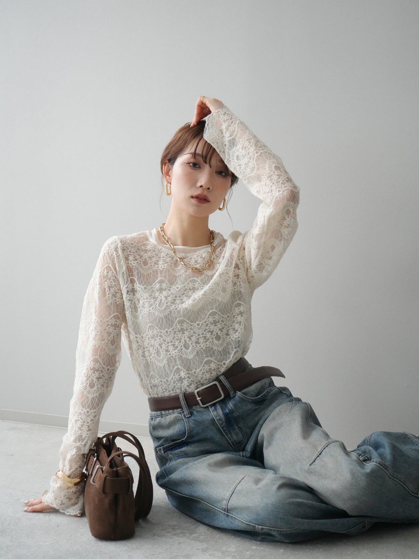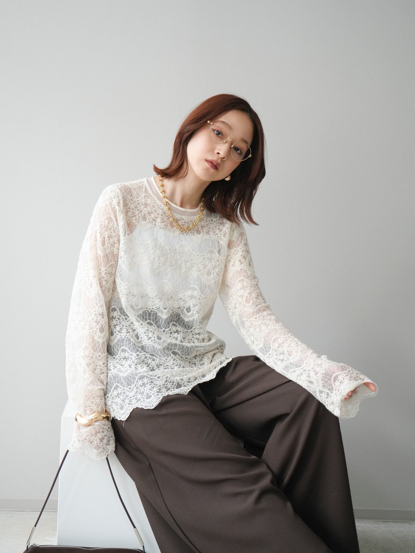 繊細なチュールレースが上品な印象を与えるレーストップス。 透け感のある素材が軽やかさと女性らしさを演出し、スタイリングに抜け感をプラスします。 華やかなレース柄が全体に施されており、シンプルなアイテムと合わせるだけで着映えする一着。 インナーとしてレイヤードしたり、1枚で主役として着用したりと、幅広い着こなしが楽しめます。 デイリーからきれいめスタイルまで活躍する、コーディネートの幅を広げてくれるアイテムです。