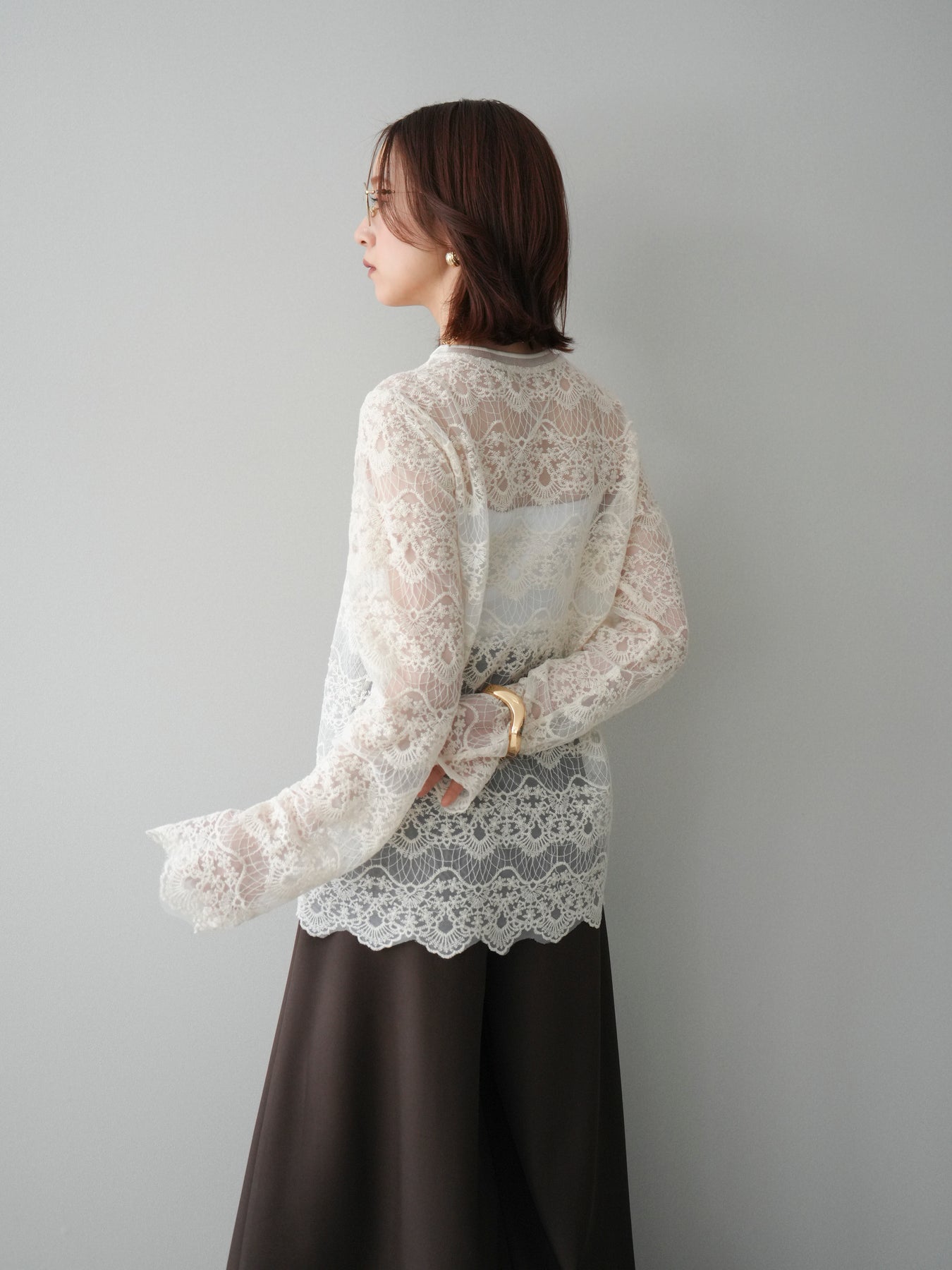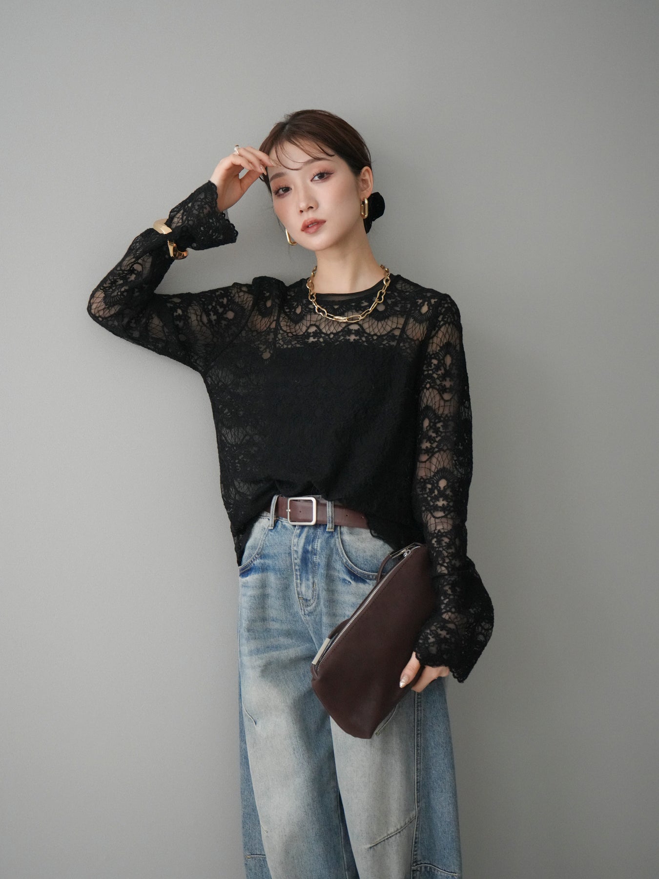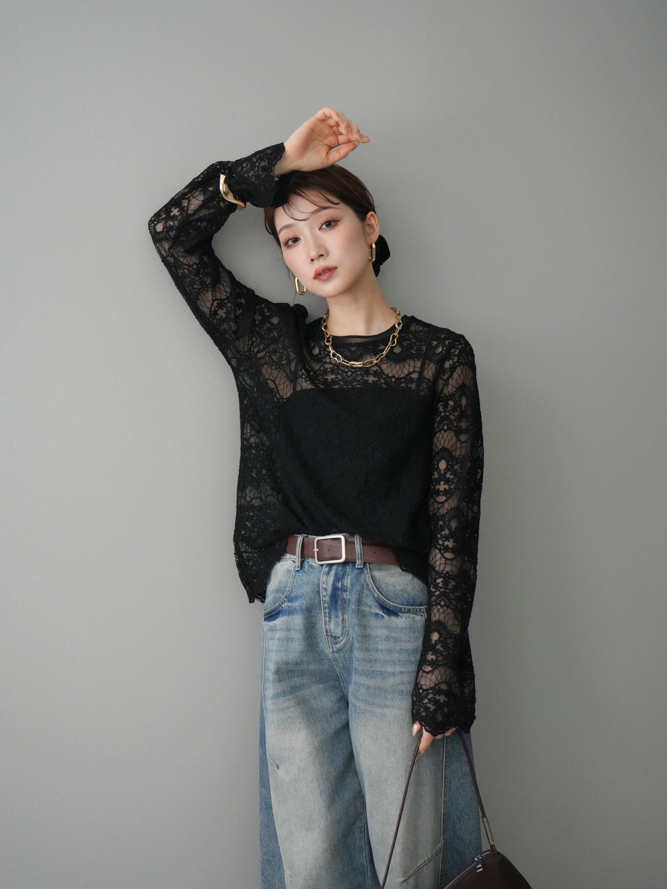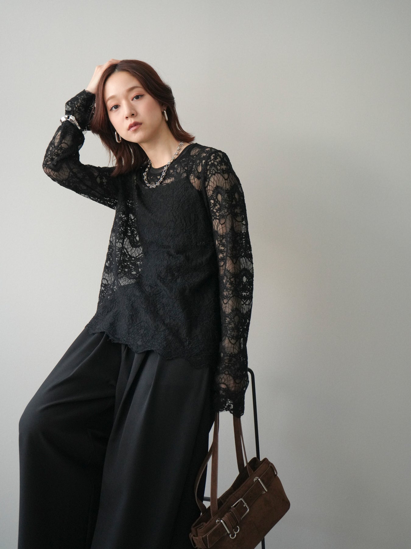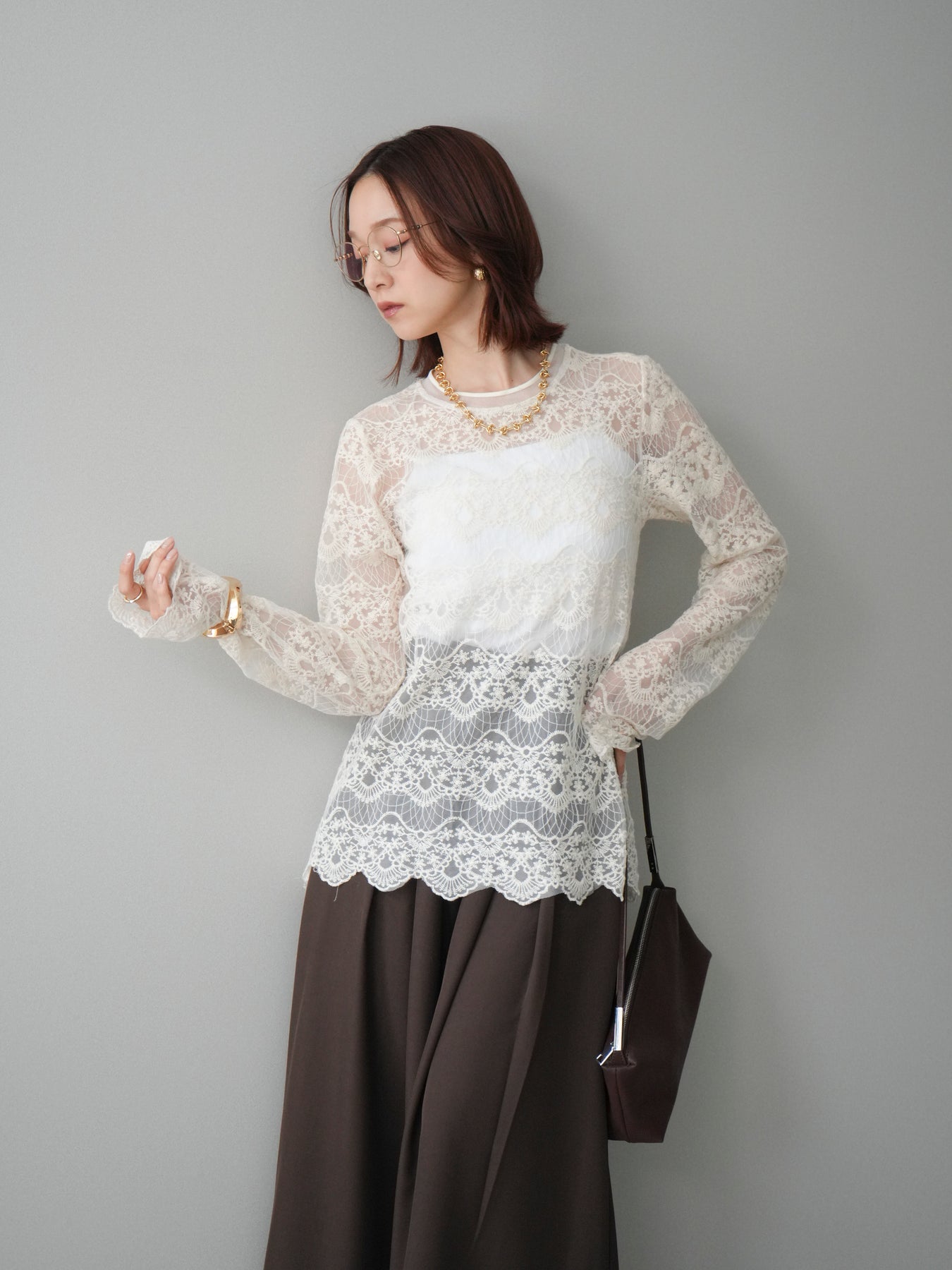 繊細なチュールレースが上品な印象を与えるレーストップス。 透け感のある素材が軽やかさと女性らしさを演出し、スタイリングに抜け感をプラスします。 華やかなレース柄が全体に施されており、シンプルなアイテムと合わせるだけで着映えする一着。 インナーとしてレイヤードしたり、1枚で主役として着用したりと、幅広い着こなしが楽しめます。 デイリーからきれいめスタイルまで活躍する、コーディネートの幅を広げてくれるアイテムです。