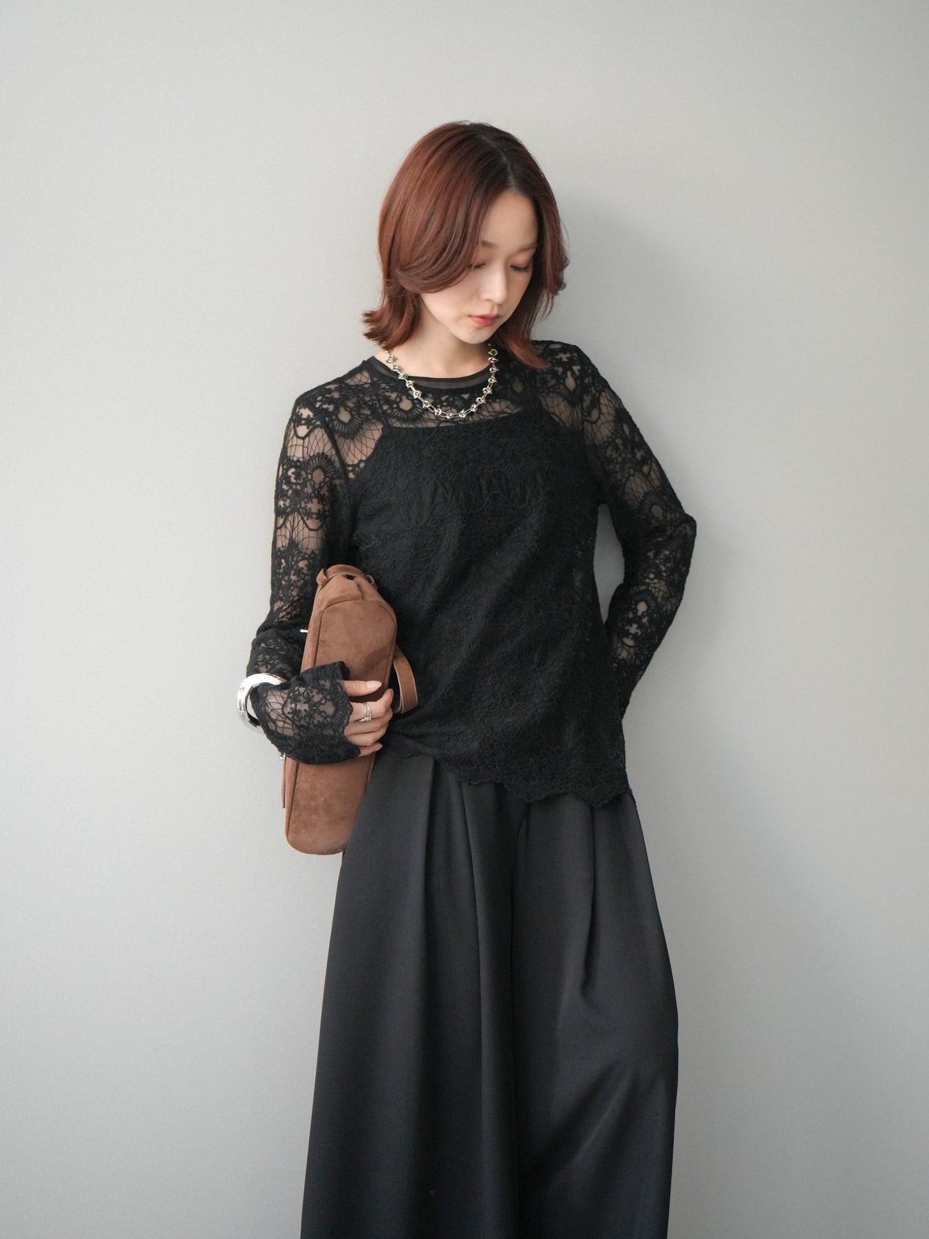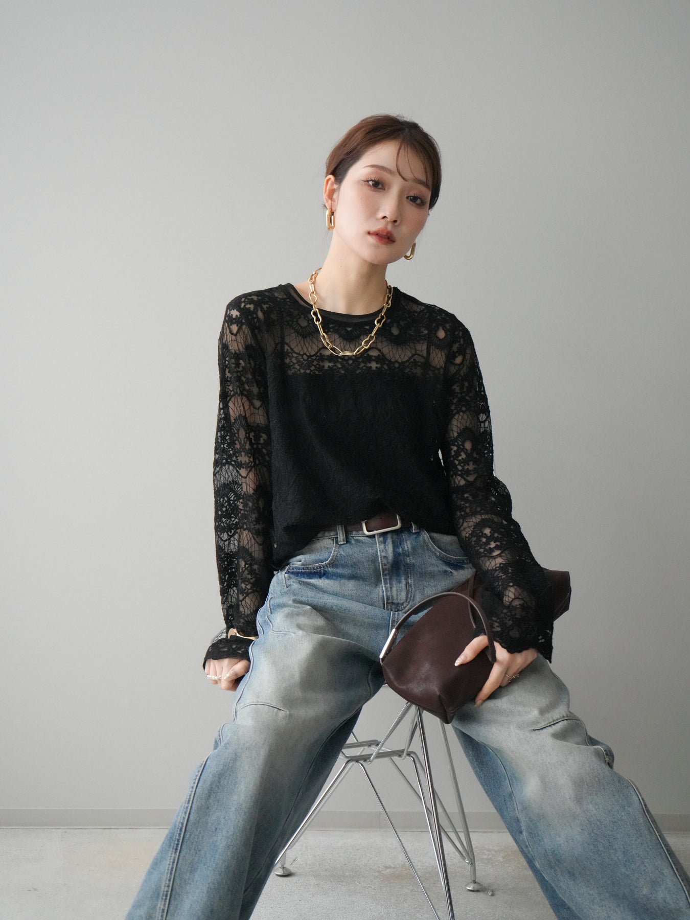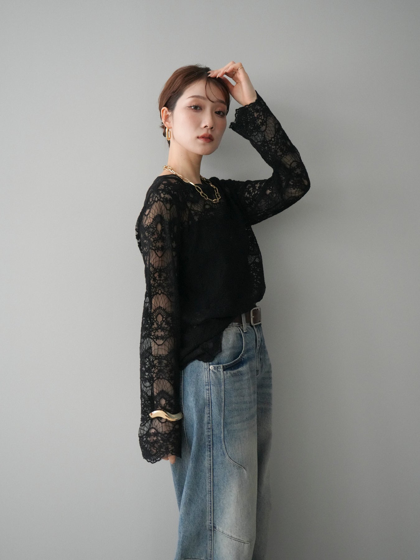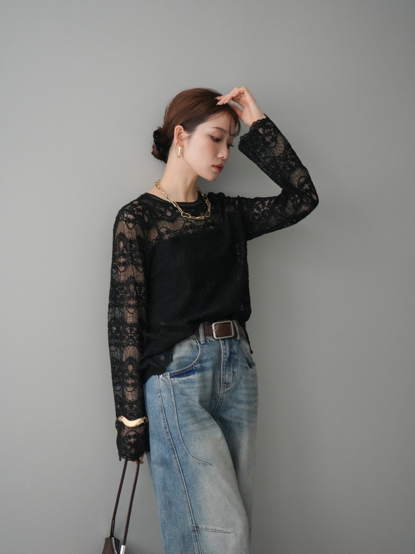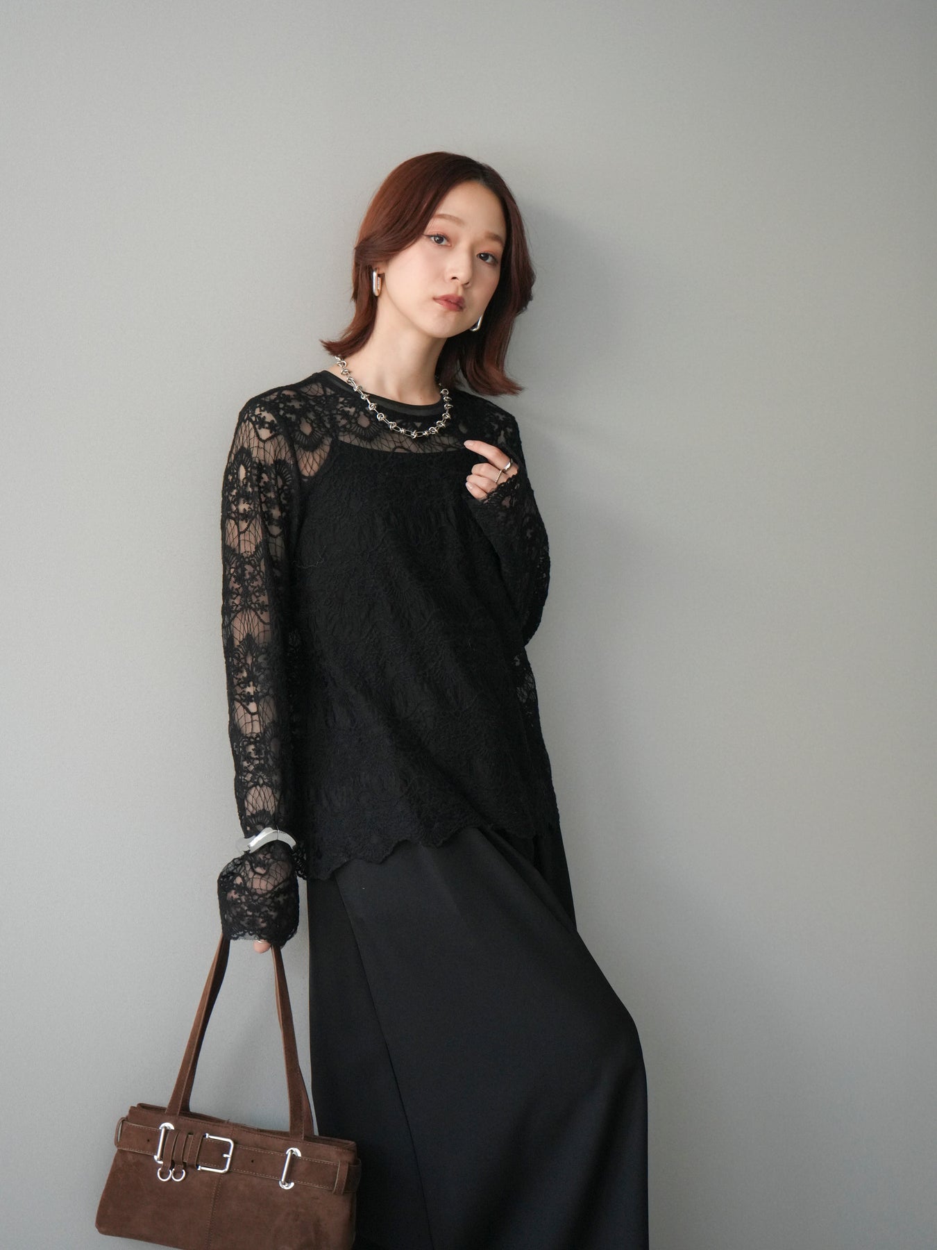 繊細なチュールレースが上品な印象を与えるレーストップス。 透け感のある素材が軽やかさと女性らしさを演出し、スタイリングに抜け感をプラスします。 華やかなレース柄が全体に施されており、シンプルなアイテムと合わせるだけで着映えする一着。 インナーとしてレイヤードしたり、1枚で主役として着用したりと、幅広い着こなしが楽しめます。 デイリーからきれいめスタイルまで活躍する、コーディネートの幅を広げてくれるアイテムです。