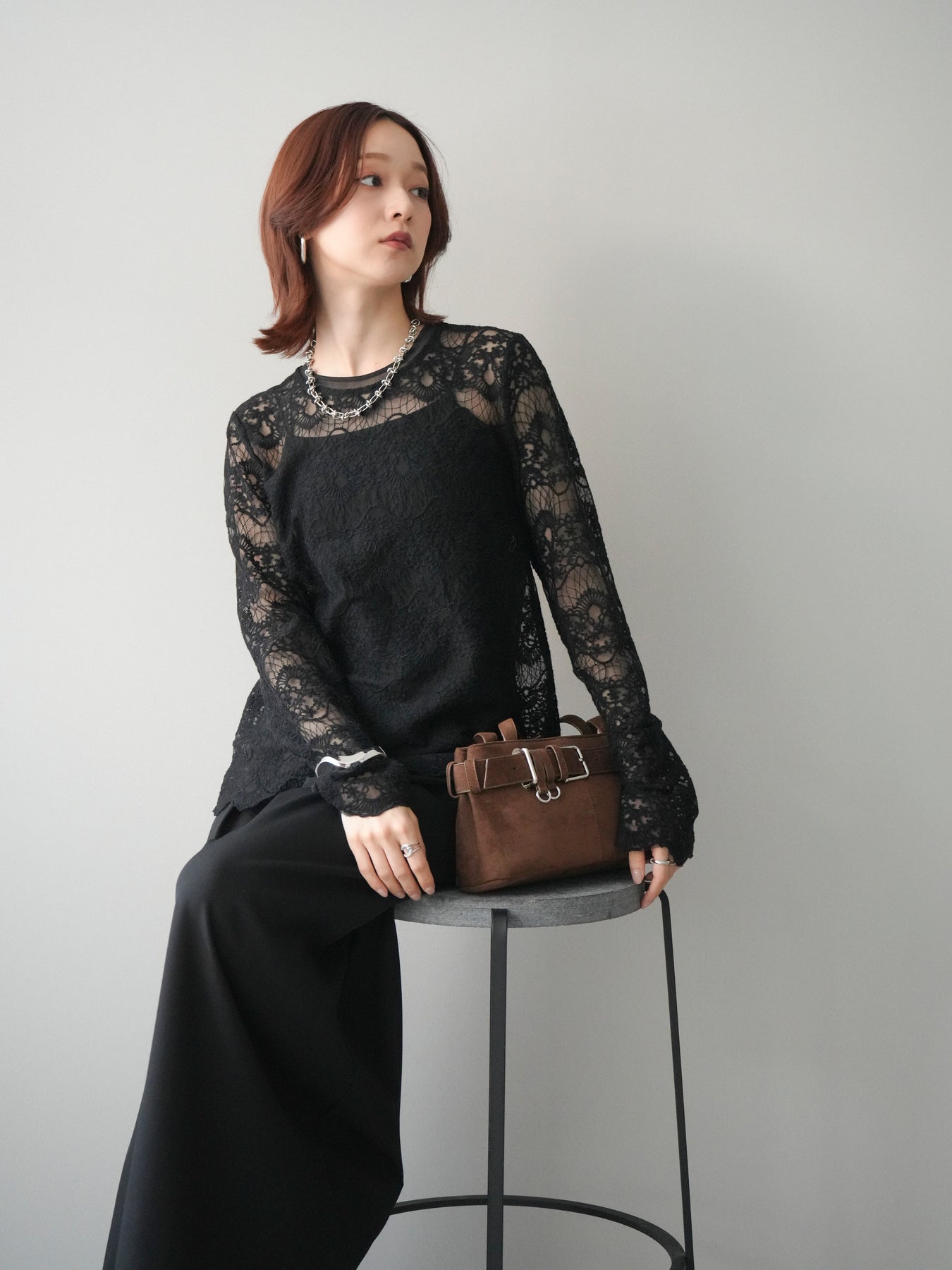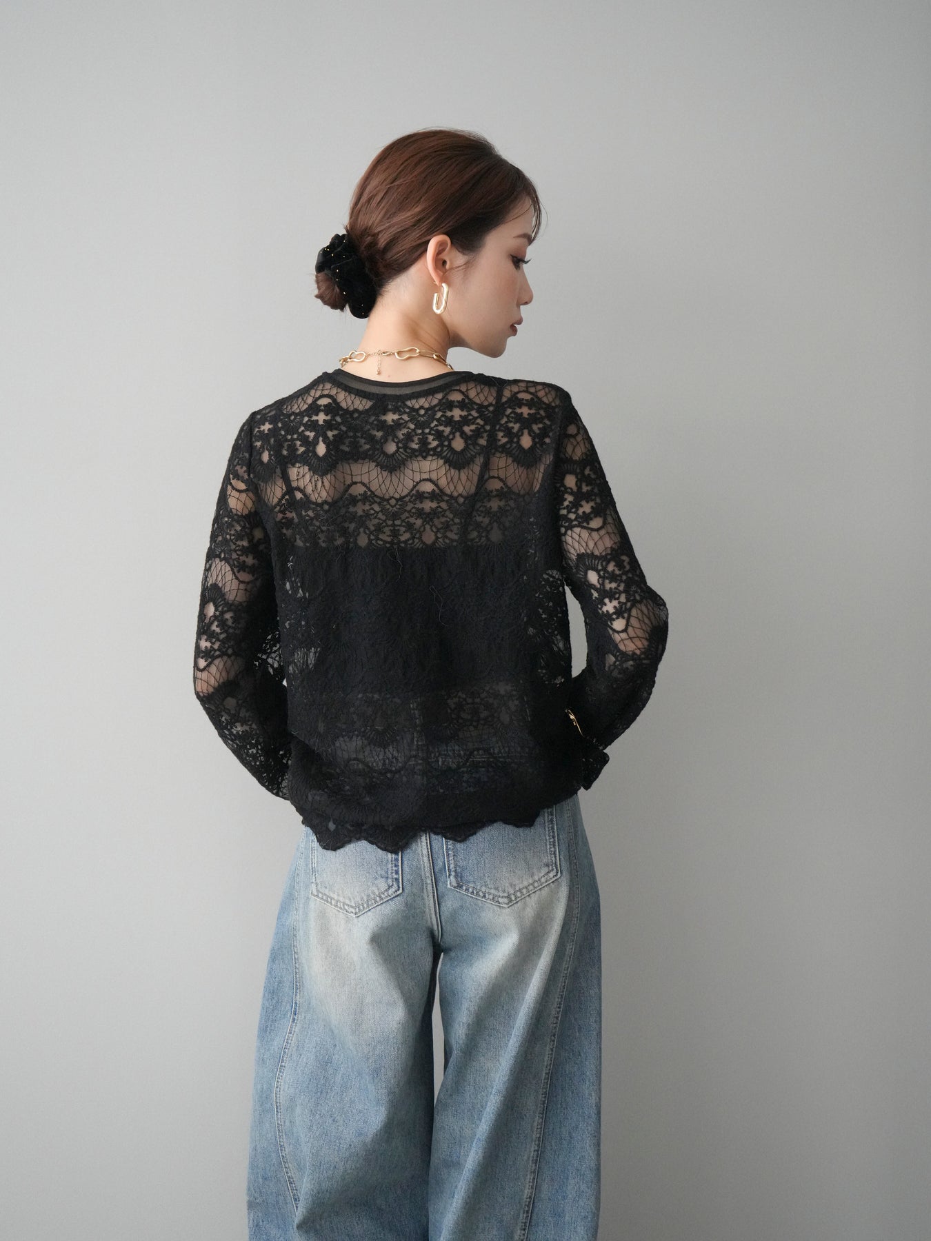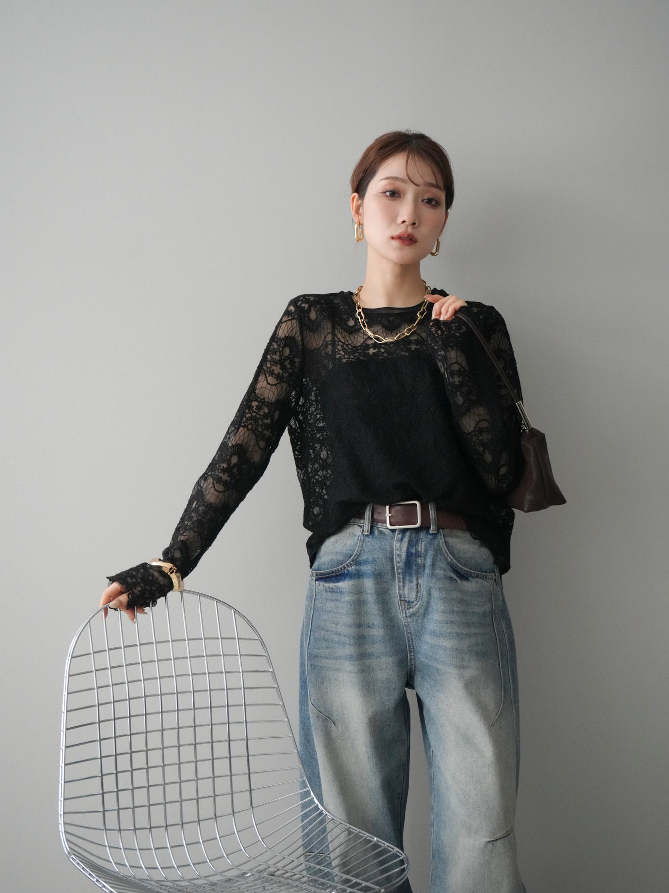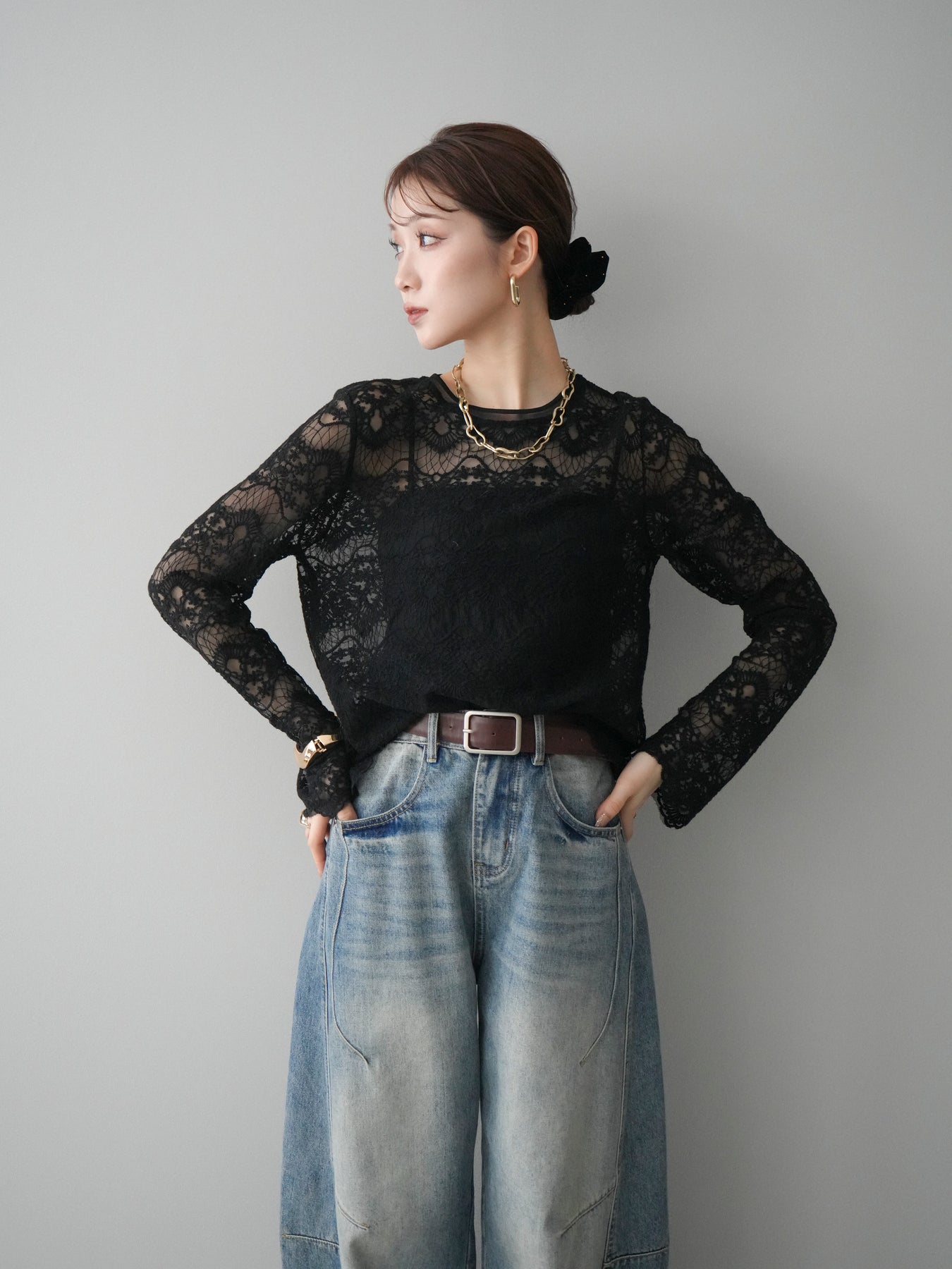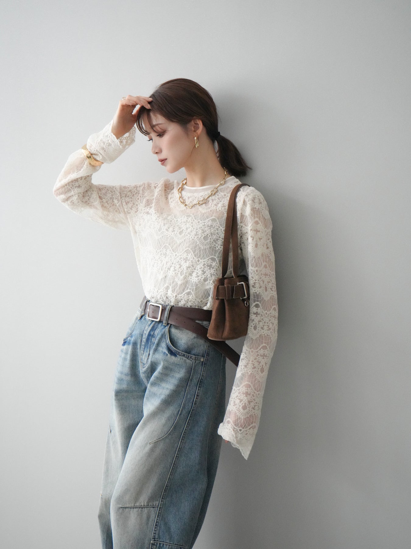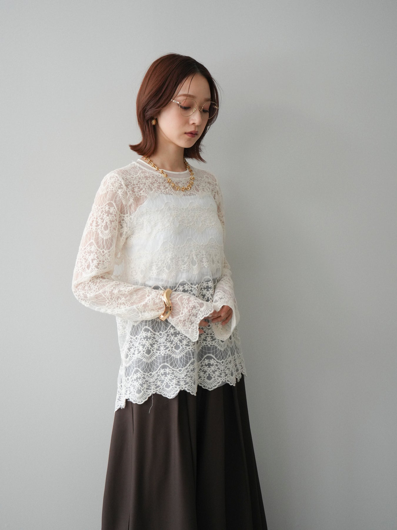 繊細なチュールレースが上品な印象を与えるレーストップス。 透け感のある素材が軽やかさと女性らしさを演出し、スタイリングに抜け感をプラスします。 華やかなレース柄が全体に施されており、シンプルなアイテムと合わせるだけで着映えする一着。 インナーとしてレイヤードしたり、1枚で主役として着用したりと、幅広い着こなしが楽しめます。 デイリーからきれいめスタイルまで活躍する、コーディネートの幅を広げてくれるアイテムです。