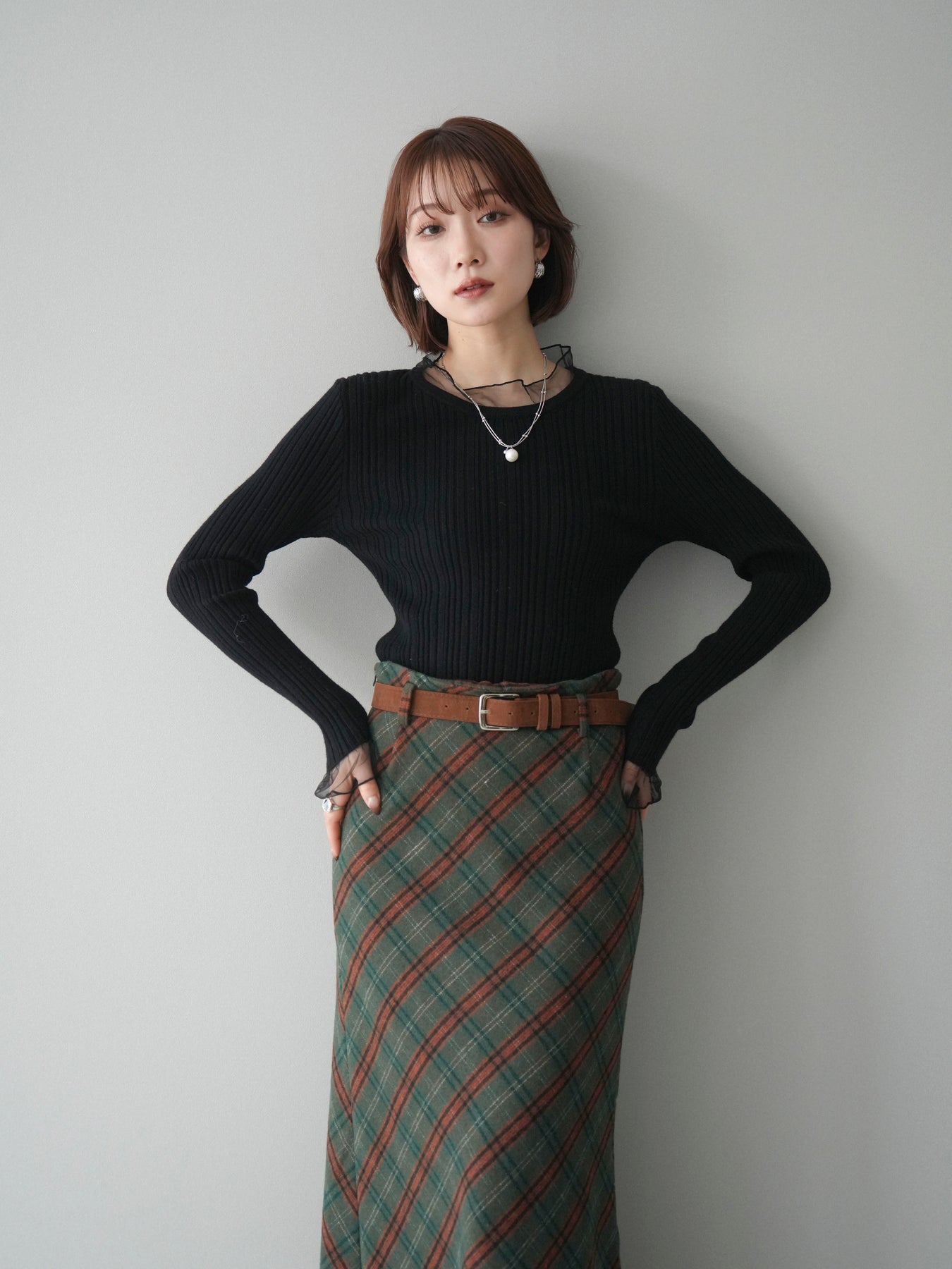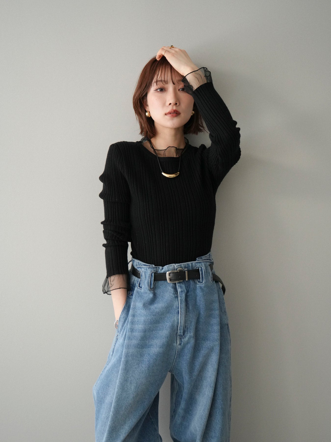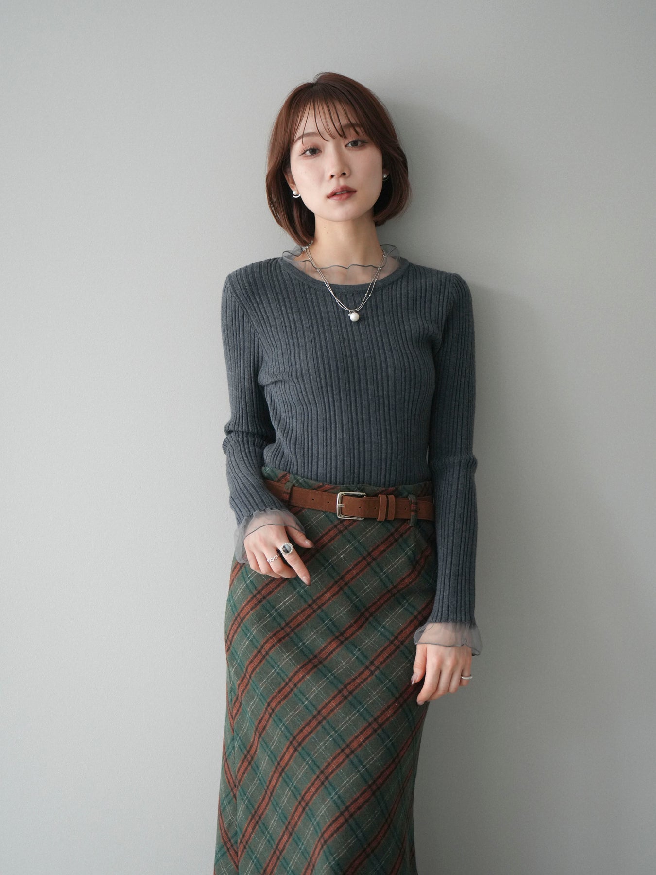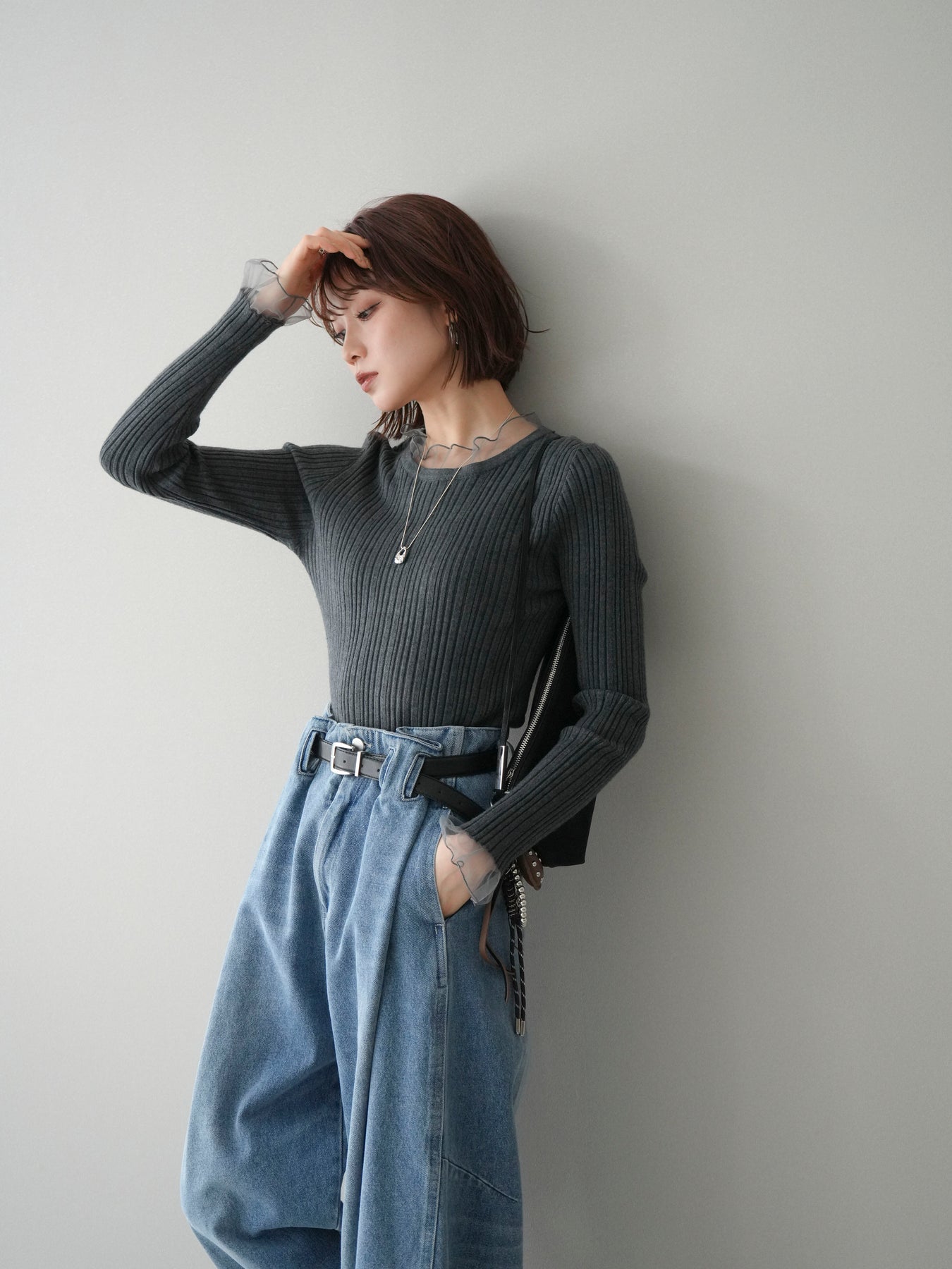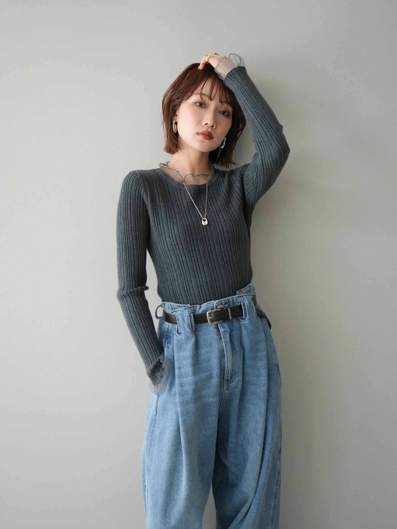 リブニットに透け感のあるチュールを組み合わせた、表情豊かなニットトップス。 首元と袖口にあしらわれたチュール素材が、シンプルなシルエットに軽やかなニュアンスを添え、程よい抜け感を生み出します。身頃は縦ラインが際立つリブ編みで、全体をすっきりとした印象にまとめつつ、さりげなくメリハリを感じさせるデザインです。 ニット部分はやわらかく、肌なじみのよい着心地。チュールとの切り替えが自然に溶け込み、一枚で着てもレイヤード風のスタイルが完成します。ボトムスを選ばず合わせやすく、スカートと合わせれば上品な雰囲気に、パンツと合わせれば程よくカジュアルな装いにも対応します。 予約商品としてのご用意となり、シーズンを通して取り入れやすい一着。シンプルながらもディテールが映えるデザインで、日常のコーディネートにさりげない変化を加えてくれます。 ※ボトムス、キャミソール(インナー)以外の商品は一律でインナーは付属していません。