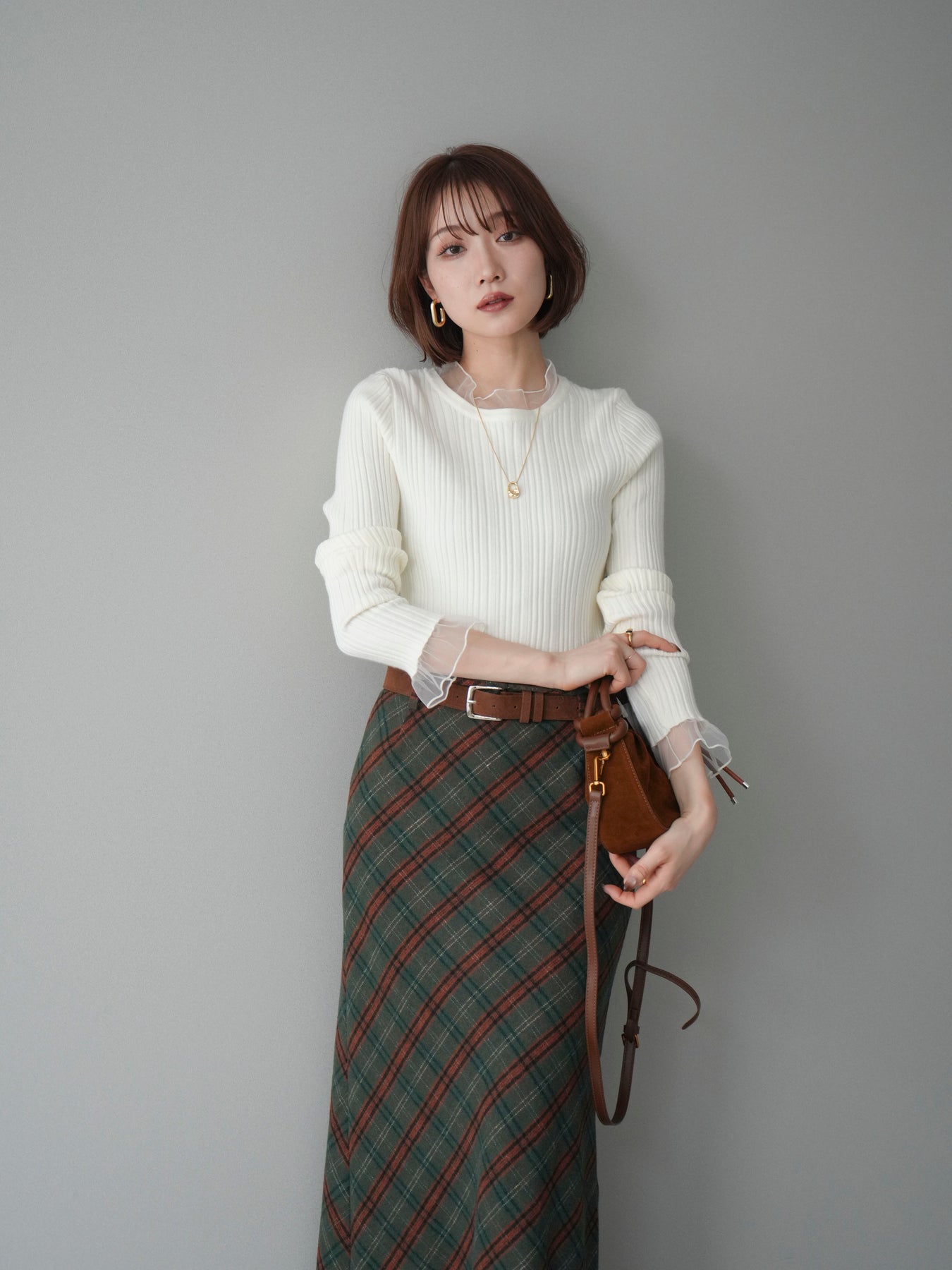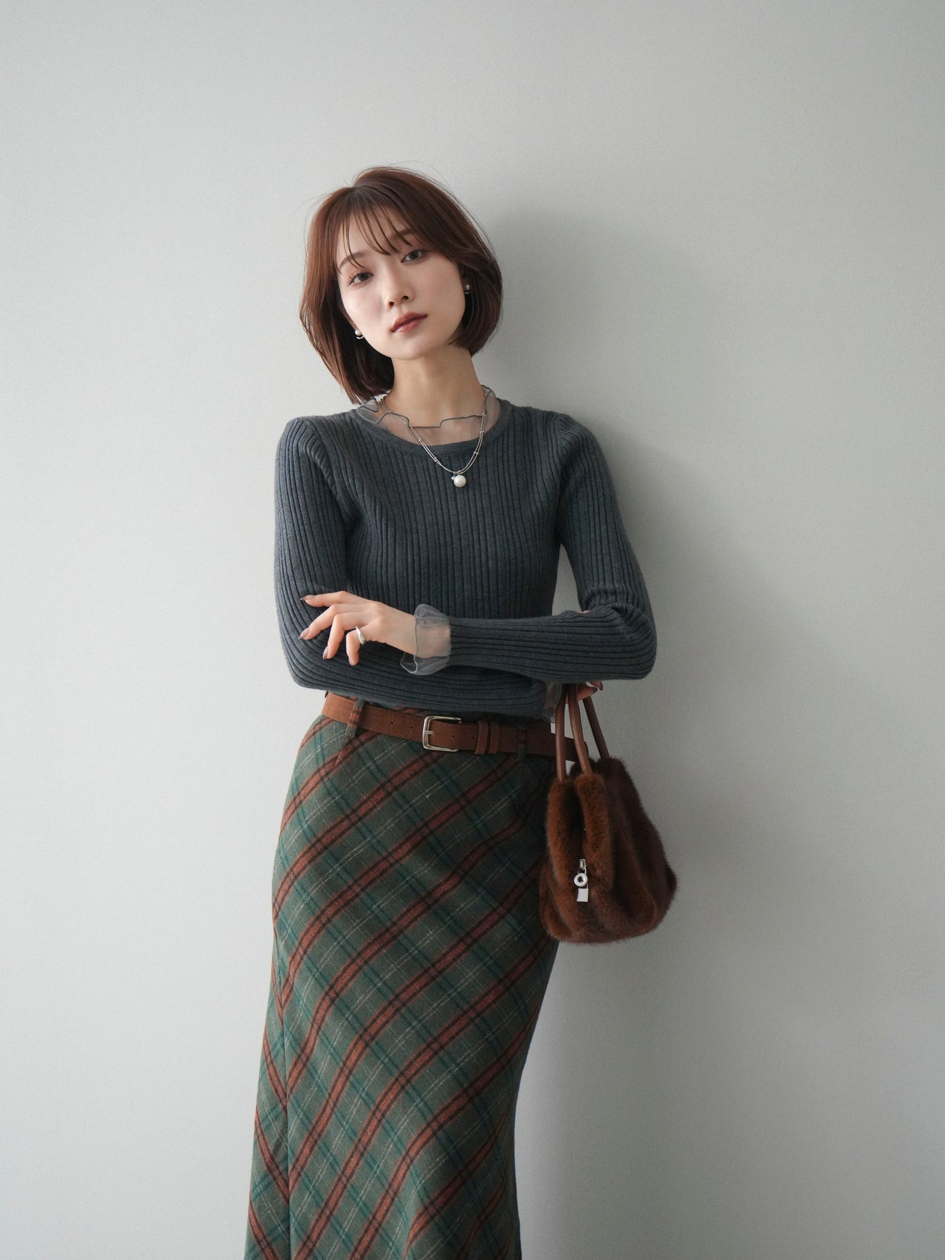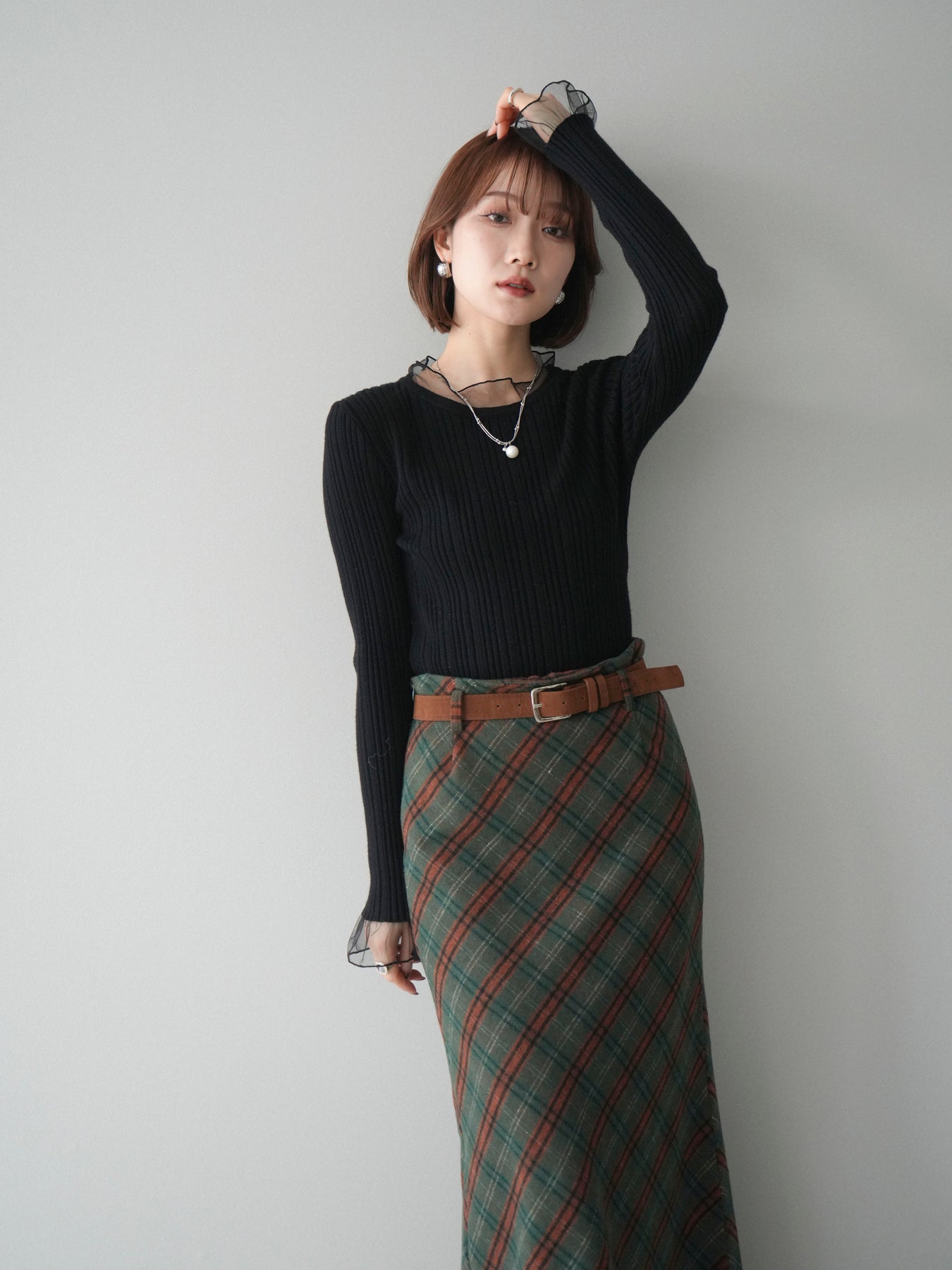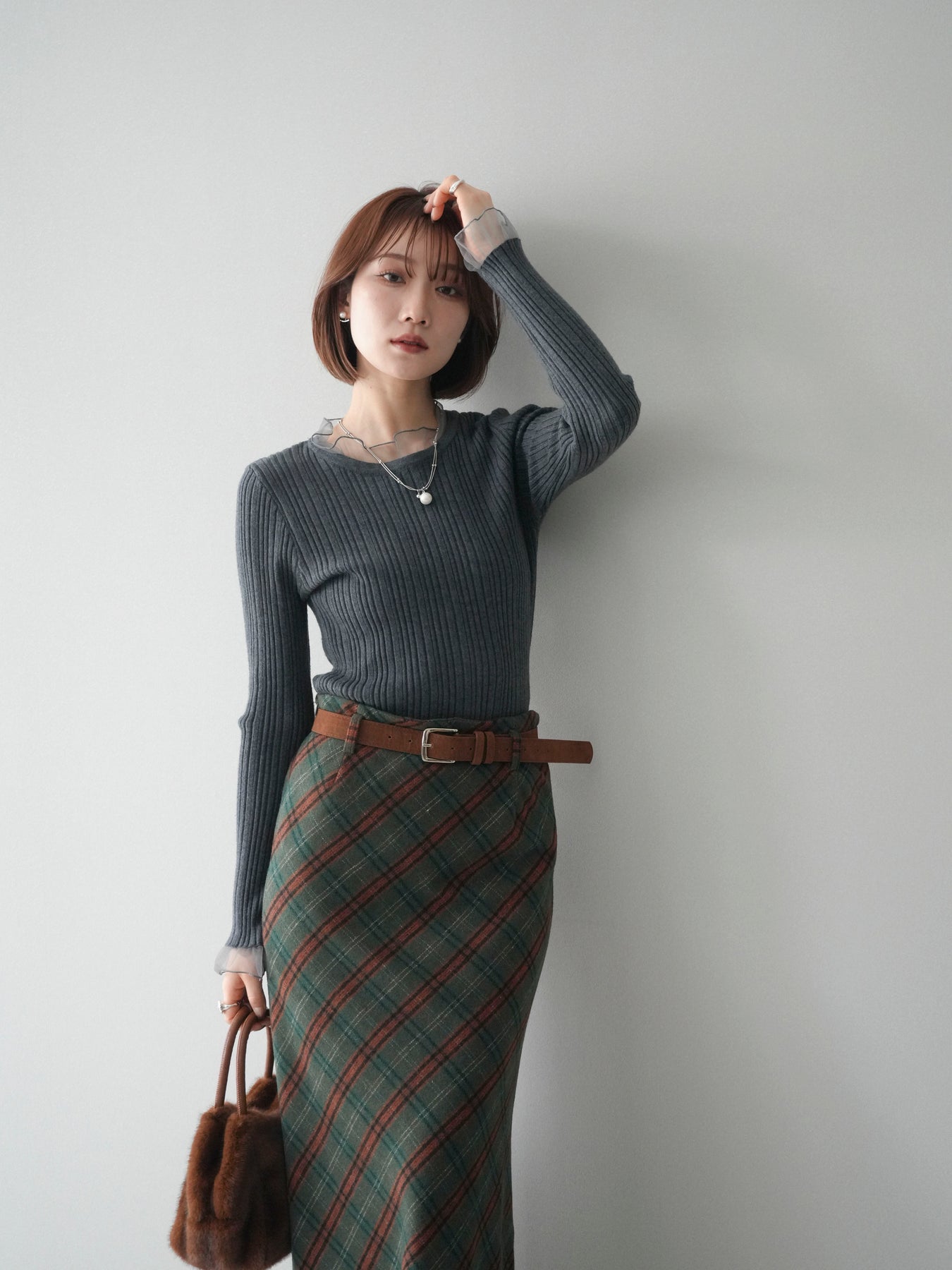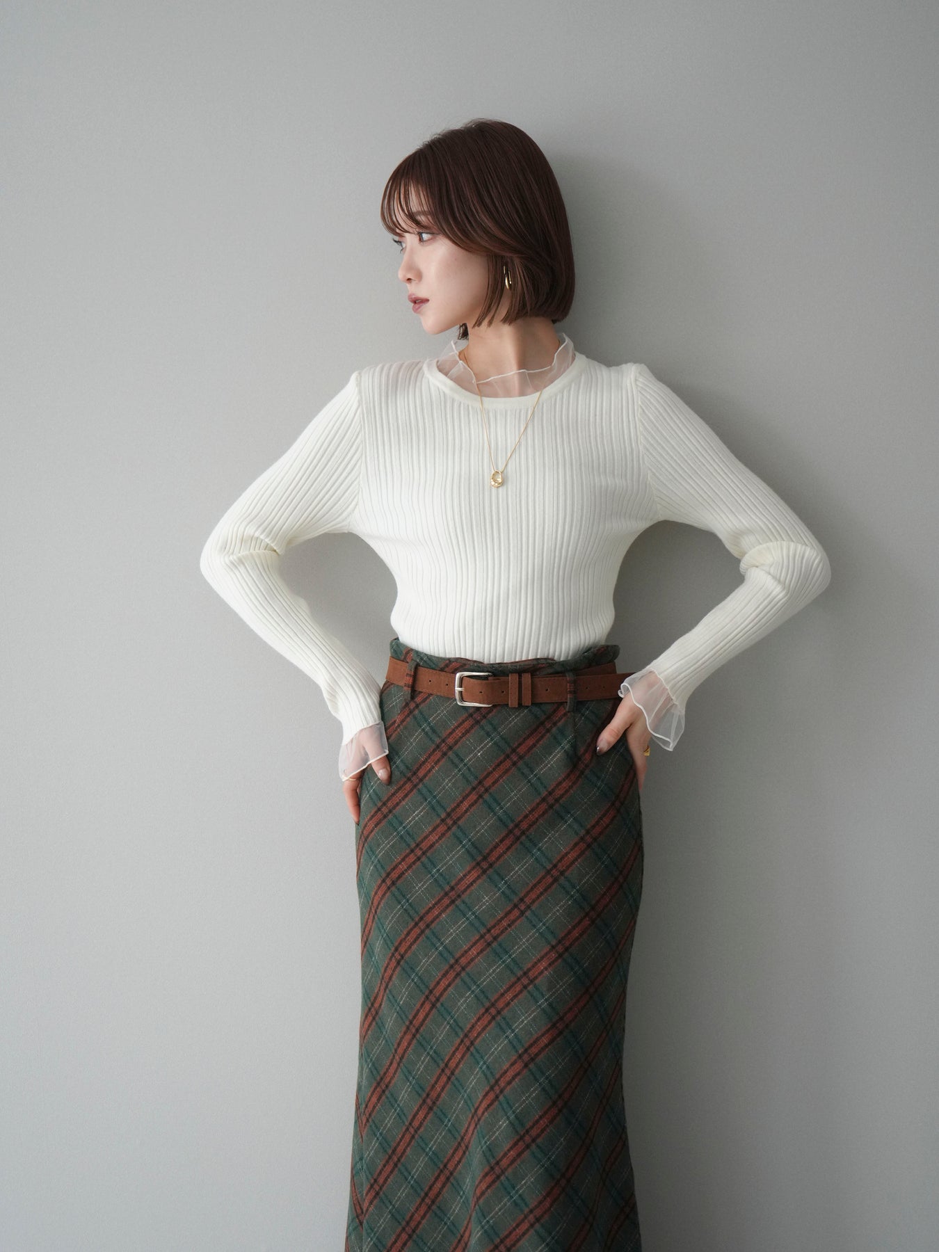 リブニットに透け感のあるチュールを組み合わせた、表情豊かなニットトップス。 首元と袖口にあしらわれたチュール素材が、シンプルなシルエットに軽やかなニュアンスを添え、程よい抜け感を生み出します。身頃は縦ラインが際立つリブ編みで、全体をすっきりとした印象にまとめつつ、さりげなくメリハリを感じさせるデザインです。 ニット部分はやわらかく、肌なじみのよい着心地。チュールとの切り替えが自然に溶け込み、一枚で着てもレイヤード風のスタイルが完成します。ボトムスを選ばず合わせやすく、スカートと合わせれば上品な雰囲気に、パンツと合わせれば程よくカジュアルな装いにも対応します。 予約商品としてのご用意となり、シーズンを通して取り入れやすい一着。シンプルながらもディテールが映えるデザインで、日常のコーディネートにさりげない変化を加えてくれます。 ※ボトムス、キャミソール(インナー)以外の商品は一律でインナーは付属していません。